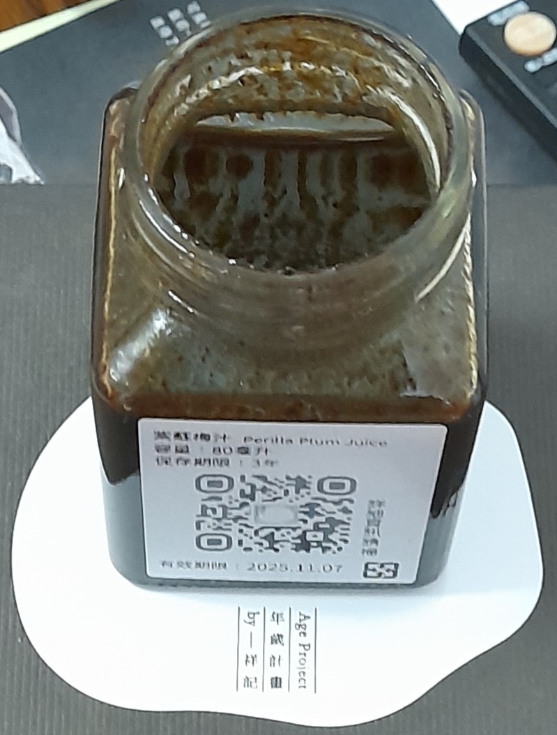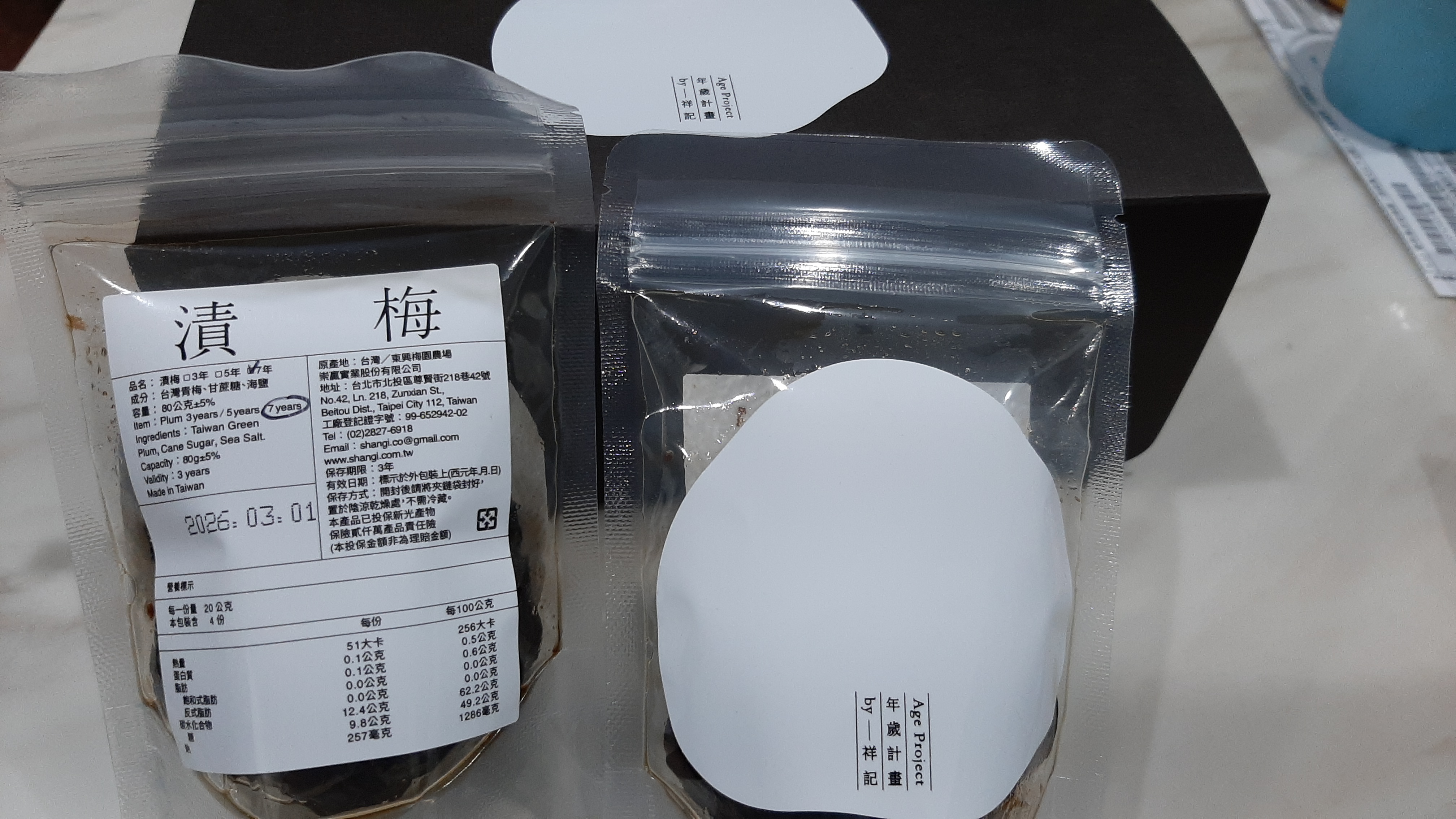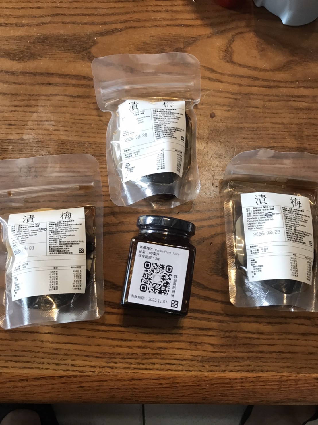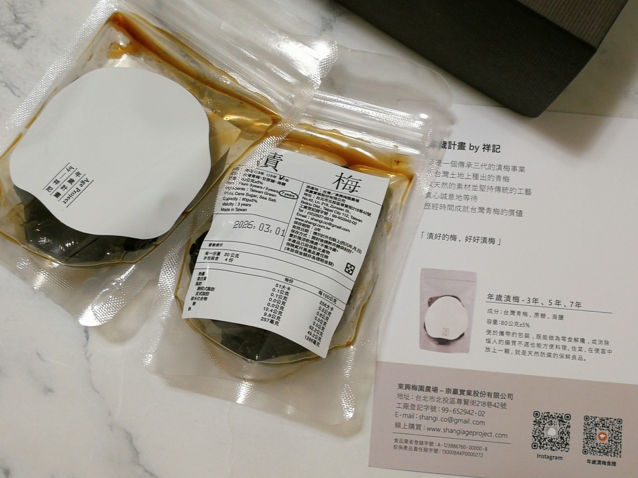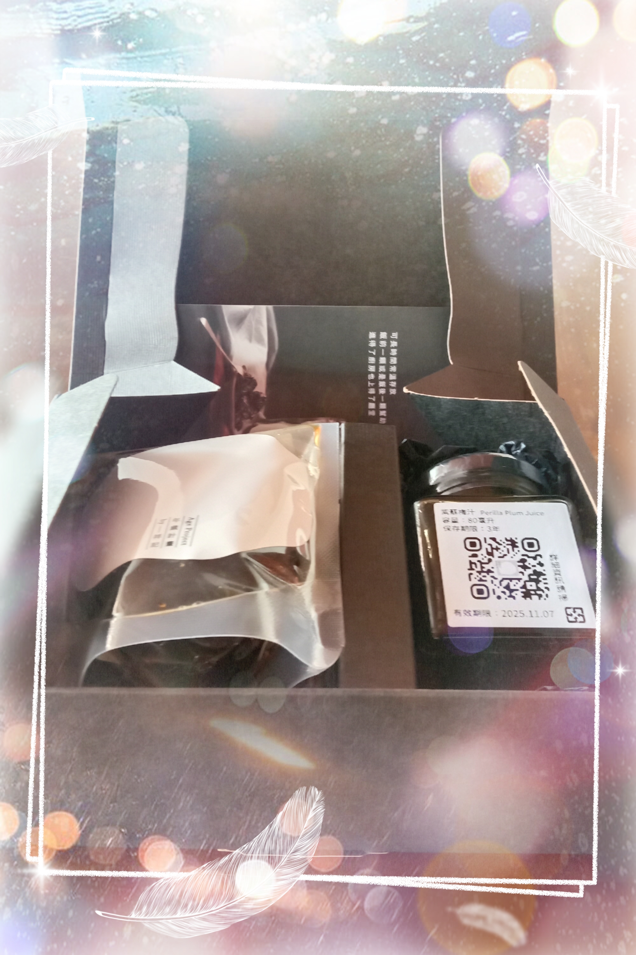 -一開始的包裝就很不一般,是用有厚度的紙容器,打開後有3年5年7年漬梅(各1小包)、紫蘇梅梅汁80ml(一小罐),小巧靈瓏,很適合隨身攜帶,吃不完的漬梅也可以再放入紫蘇梅汁罐中,很貼心的設計。最令人在意的口感來了。因為,成份只添加蔗糖和海鹽,所以七年漬梅對我來說最鹹,也最適合肚子吃太撐時的解膩;私心喜歡5年梅,不會太鹹但變酸了些,很剛好;而,三年梅,就微酸,鹹味明顯,但,不死鹹。剛吃完一顆7年梅,才不過10分鐘,肚子就沒那麼脹的感覺了,真是好物。