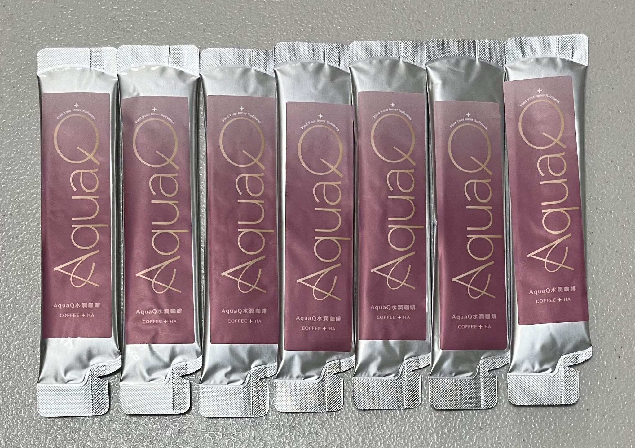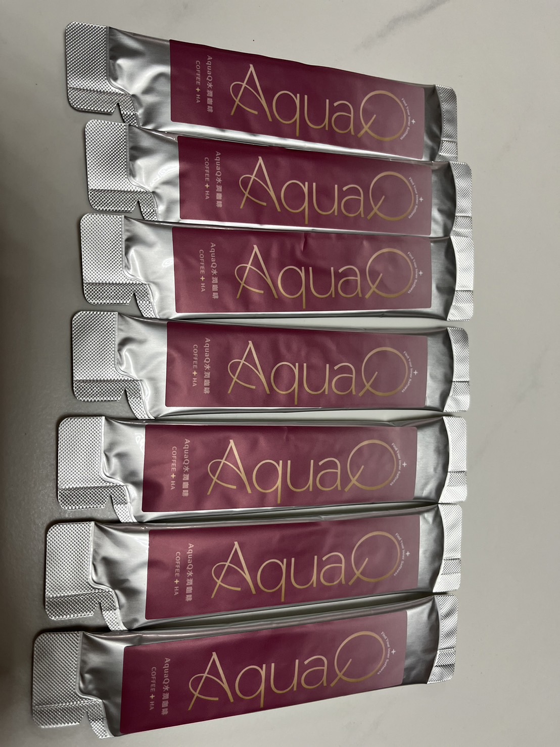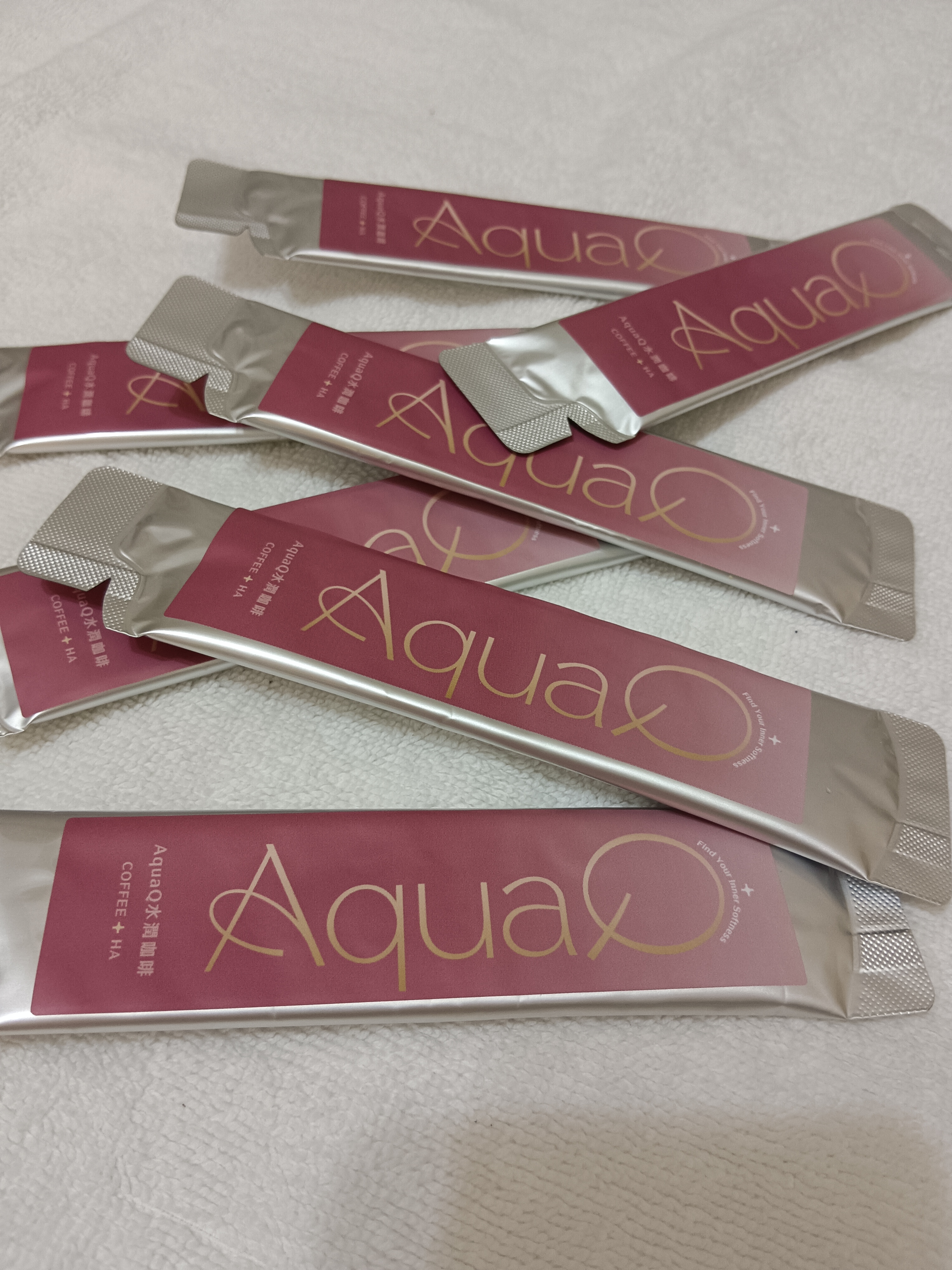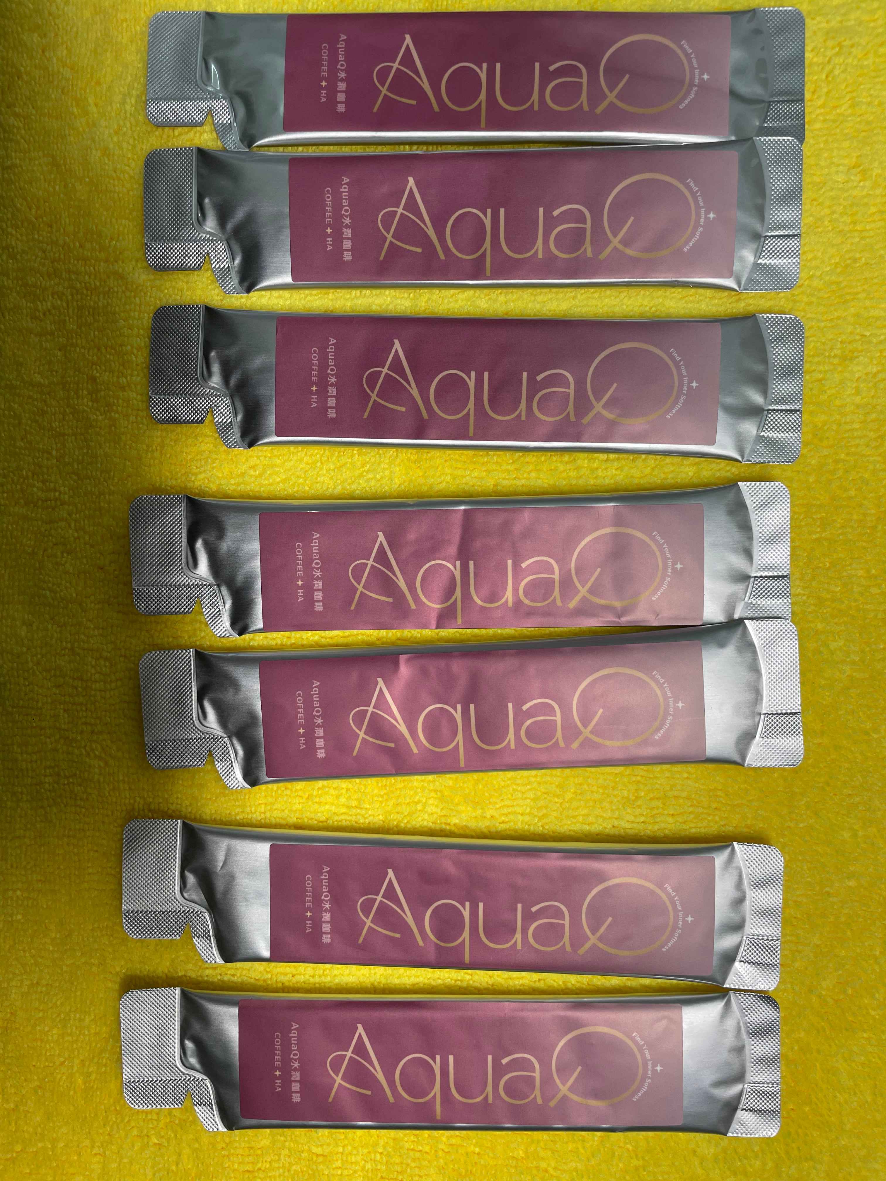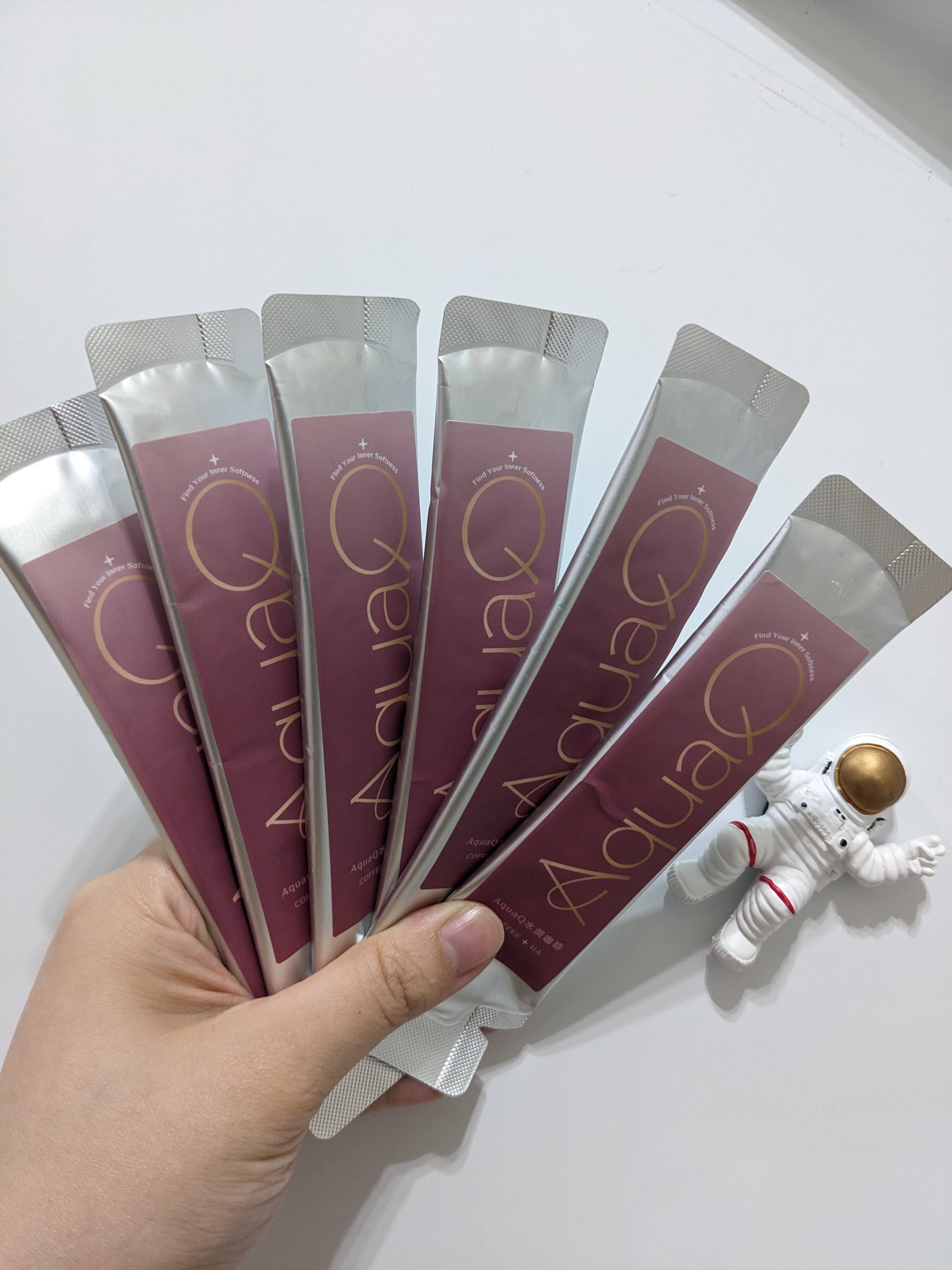 AquaQ 水潤咖啡,強調七日水潤有感、Q彈。體驗包有7入,因體驗品尚在開發測試階段,收到是裸裝,蠻可惜看不到完整的產品包裝設計。