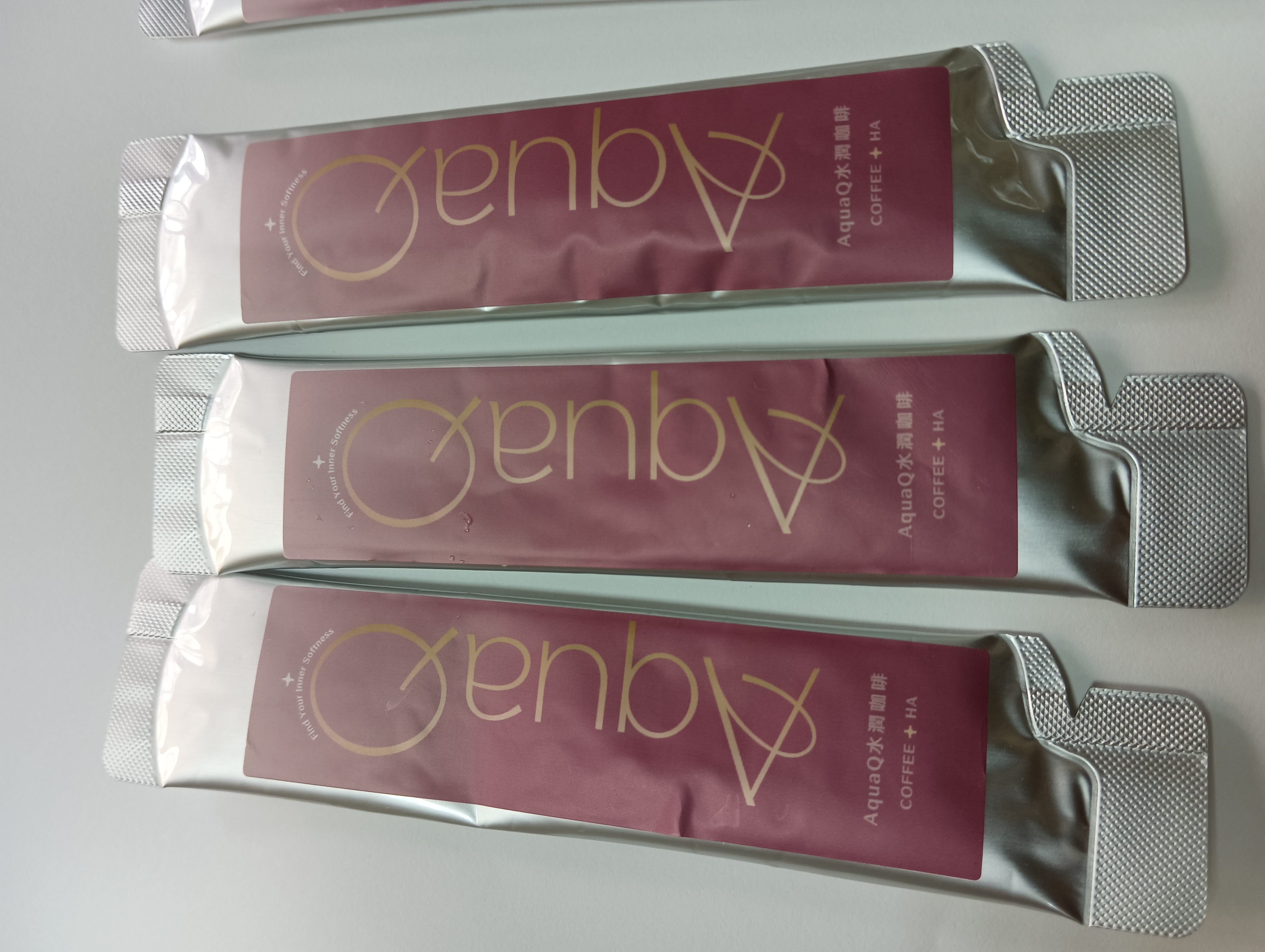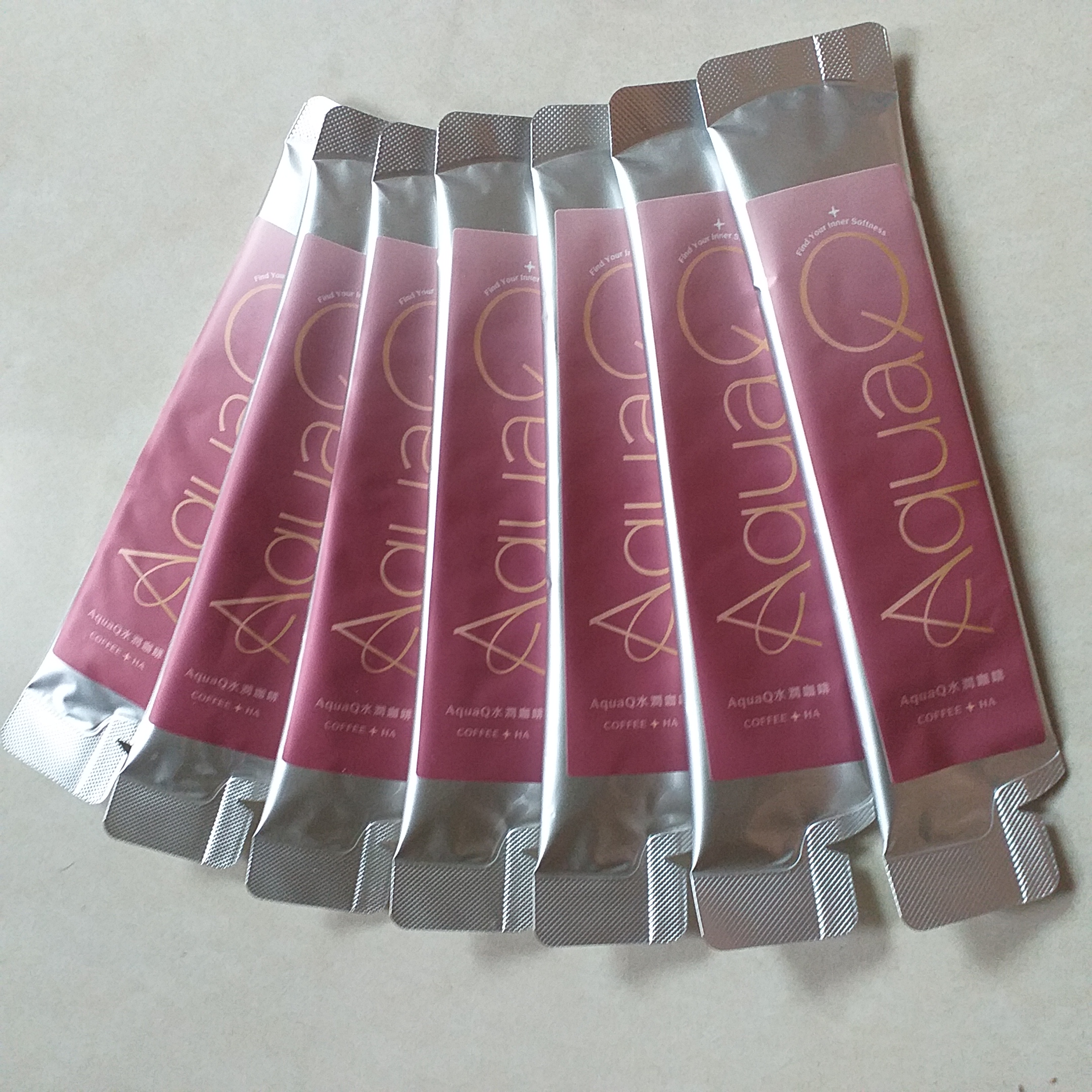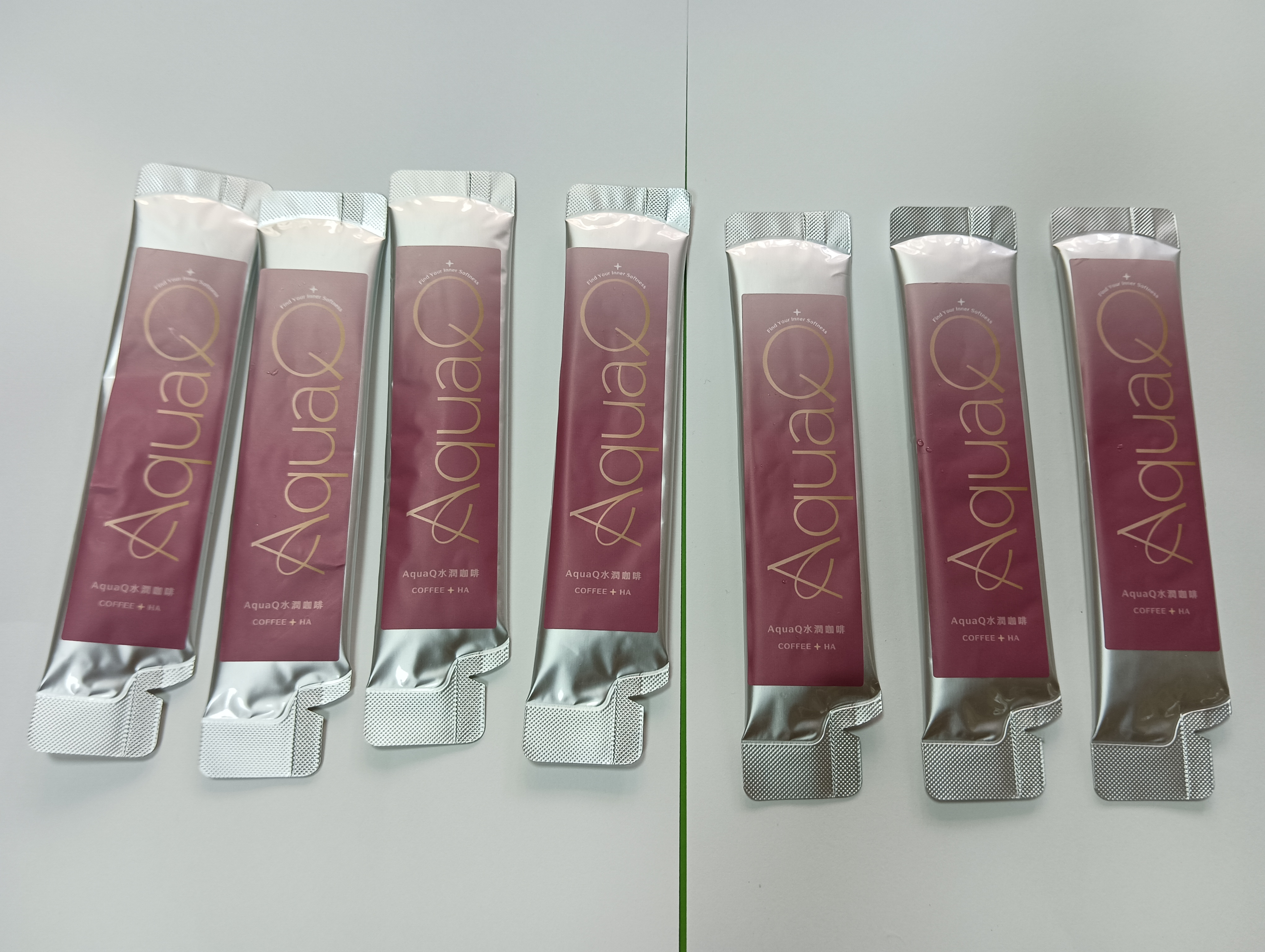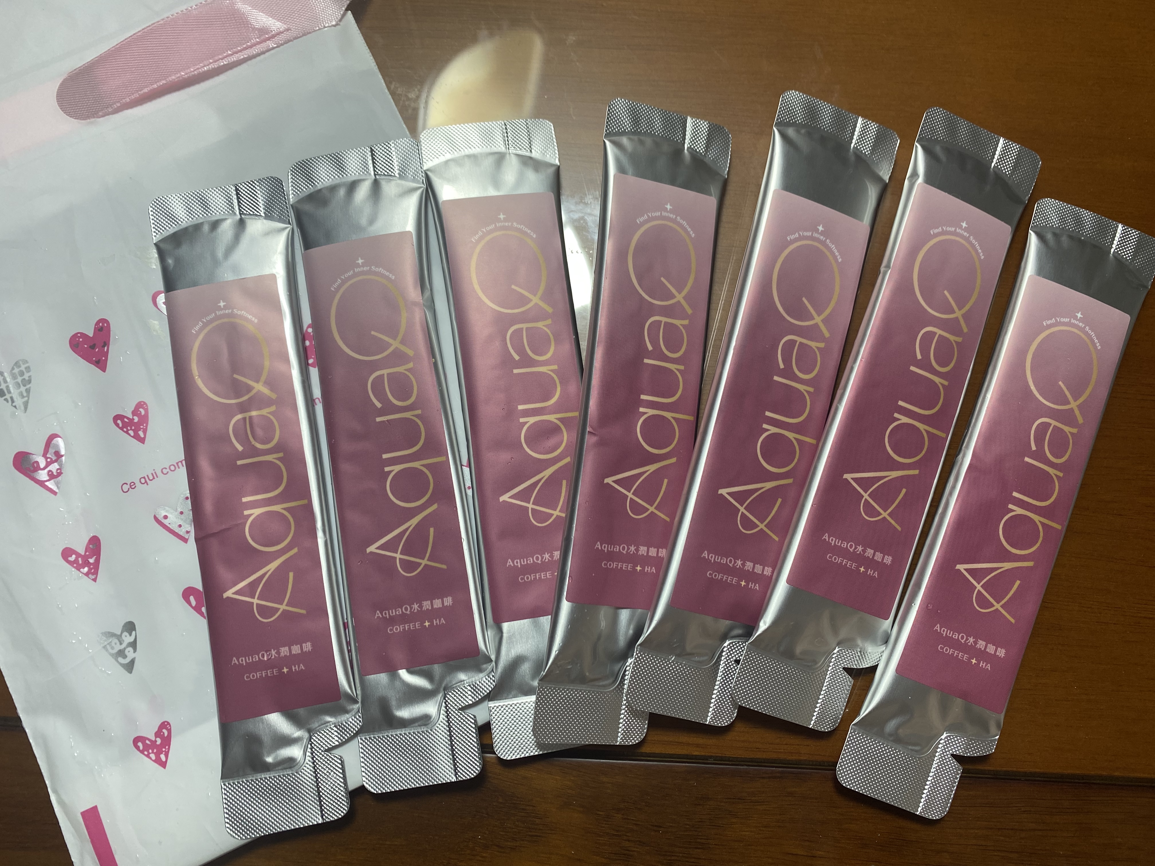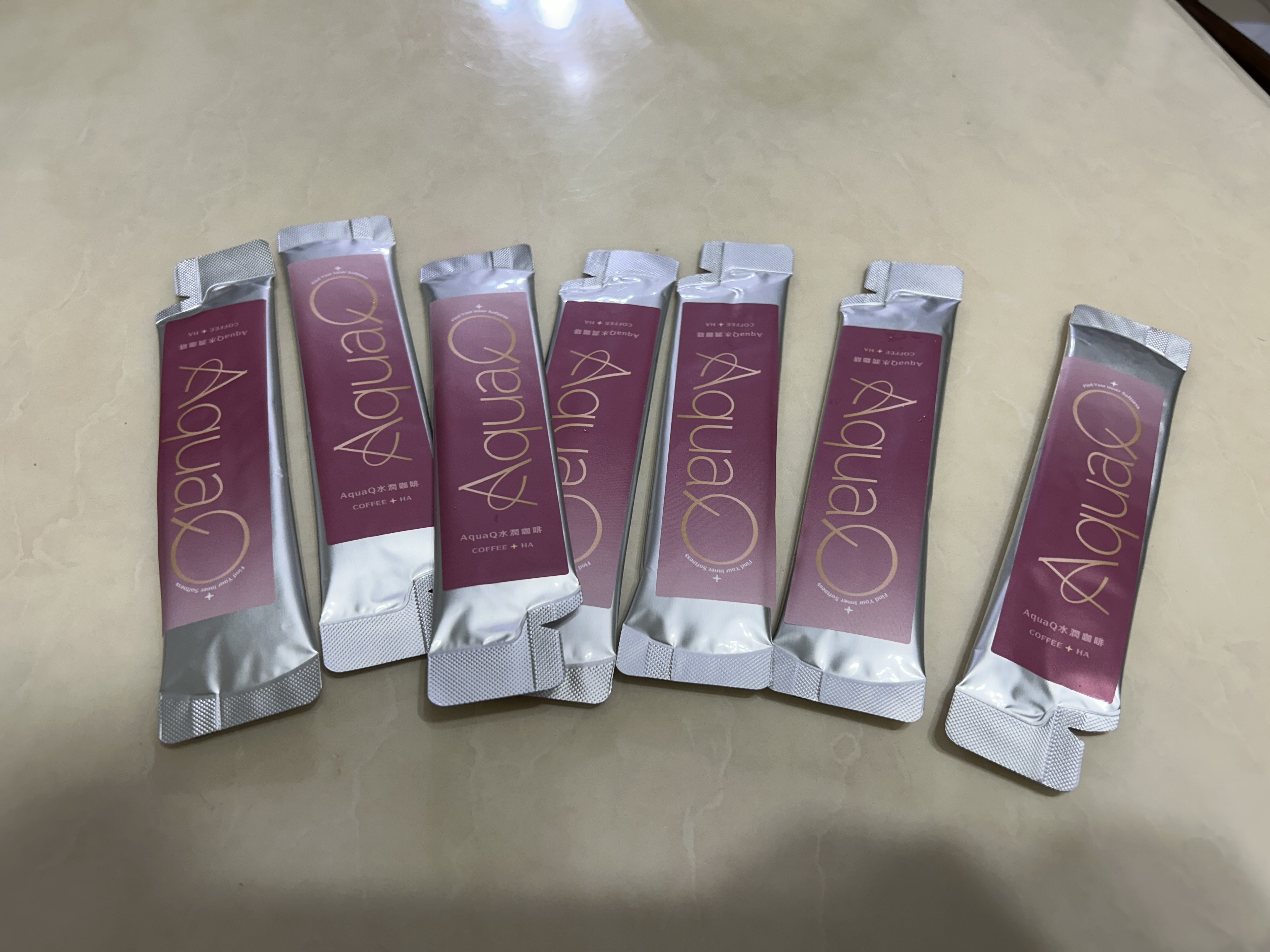 AquaQ 水潤咖啡,強調七日水潤有感、Q彈。體驗包有7入,因體驗品尚在開發測試階段,收到是裸裝,蠻可惜看不到完整的產品包裝設計。
