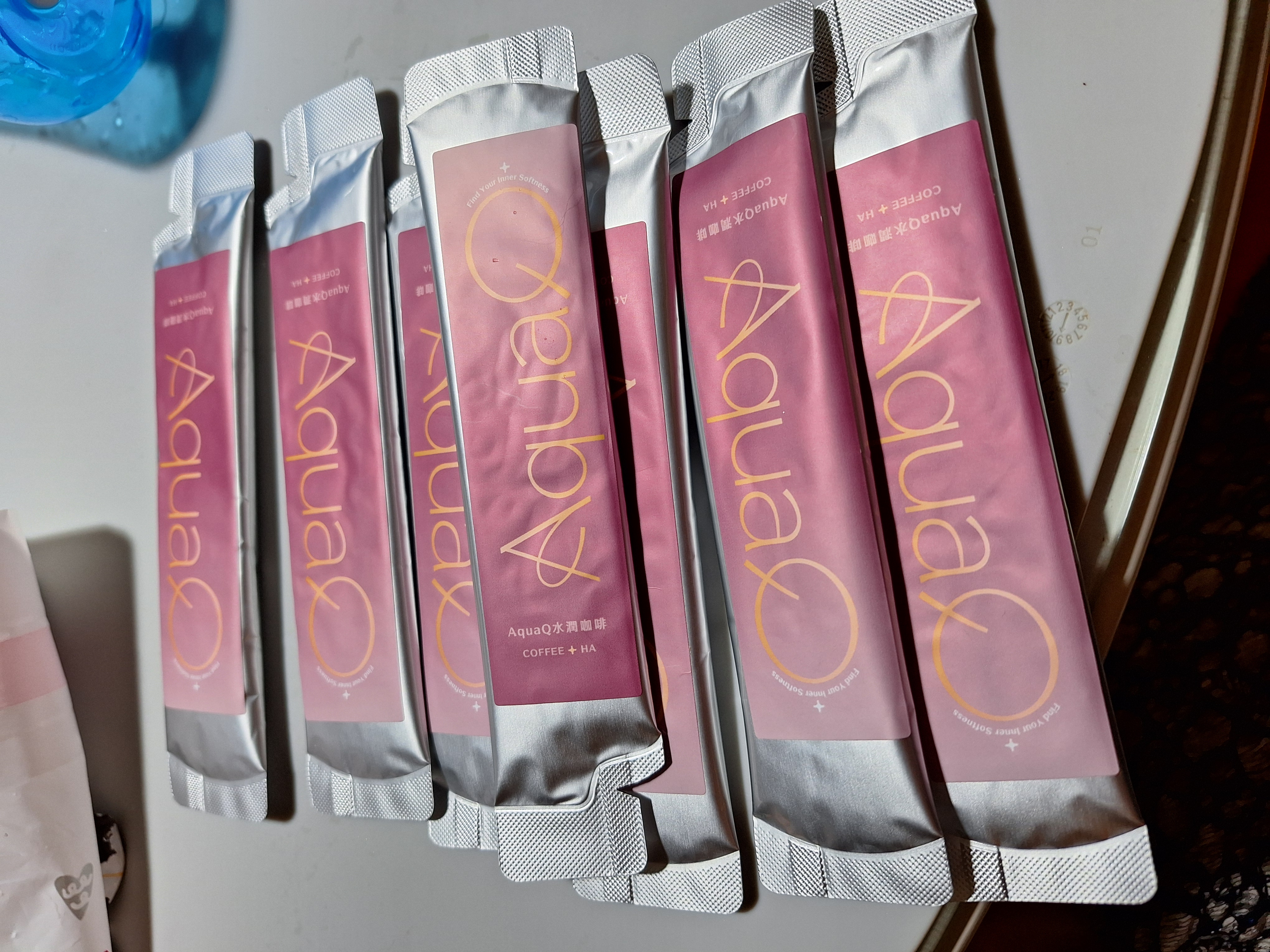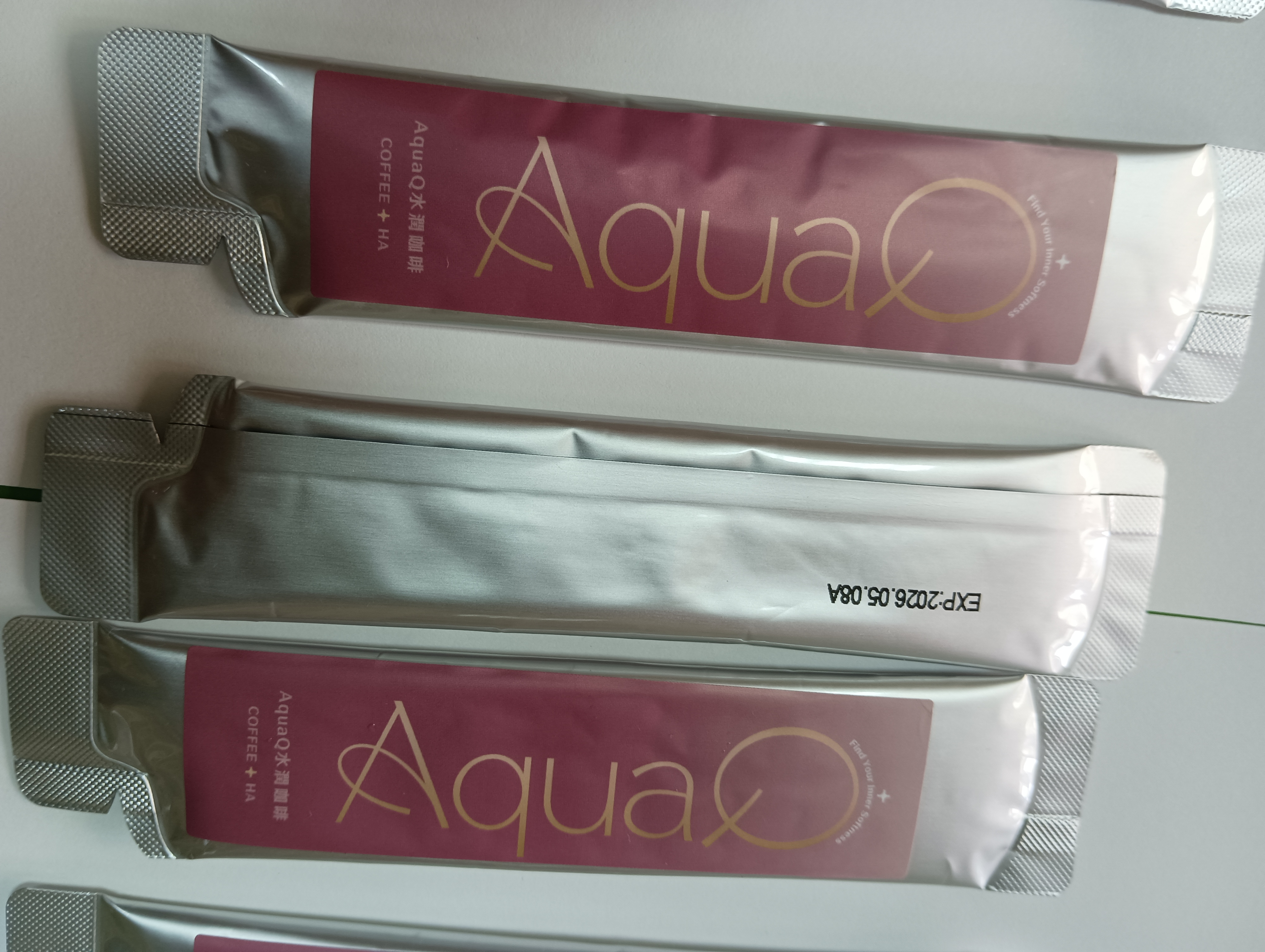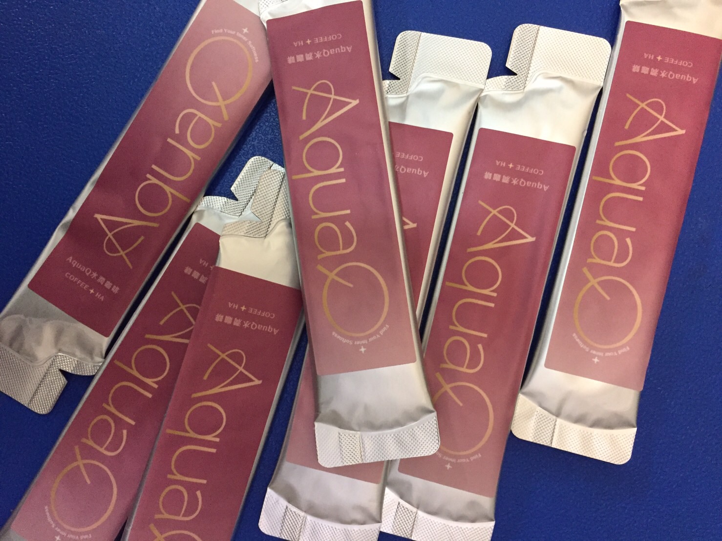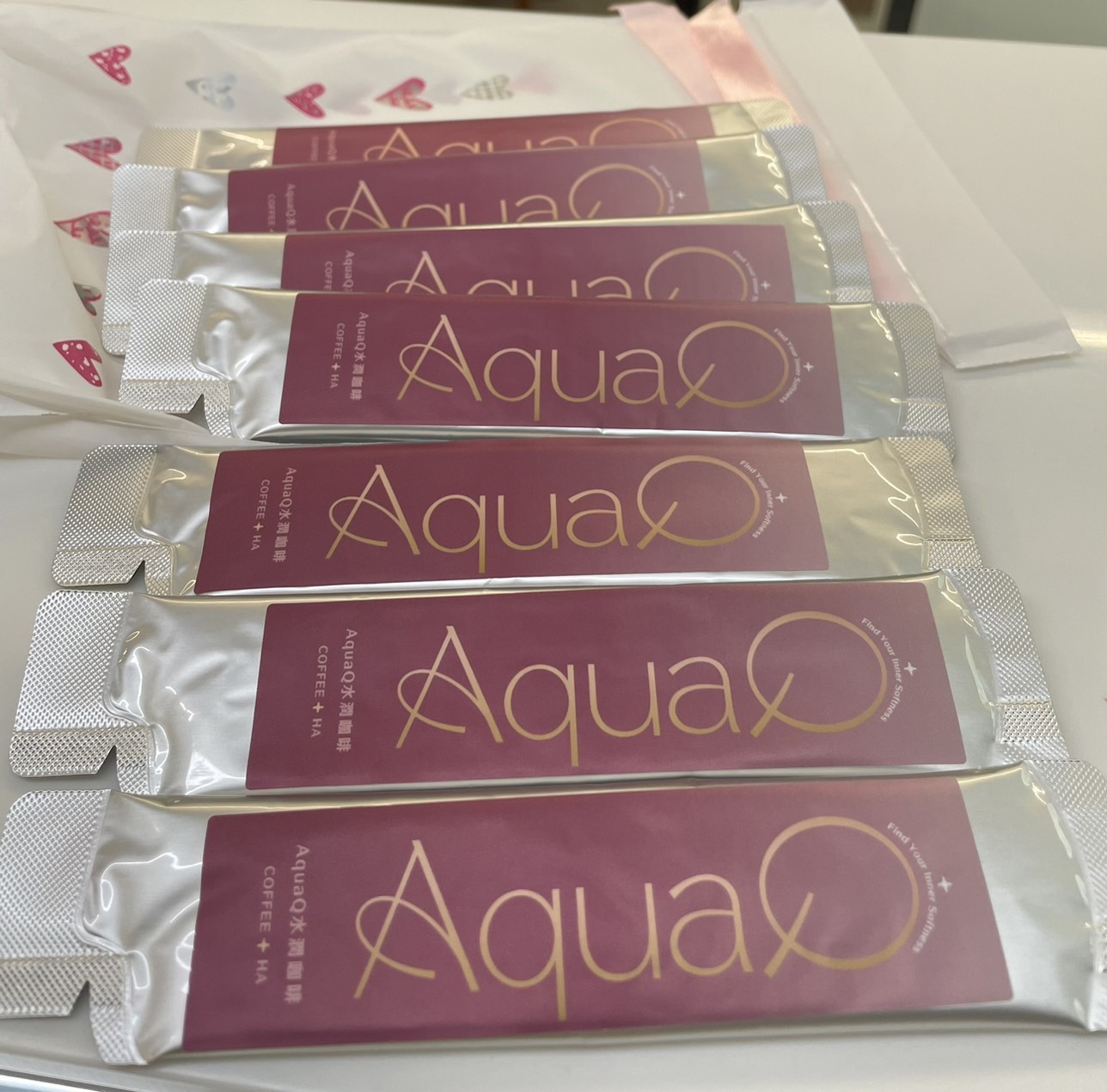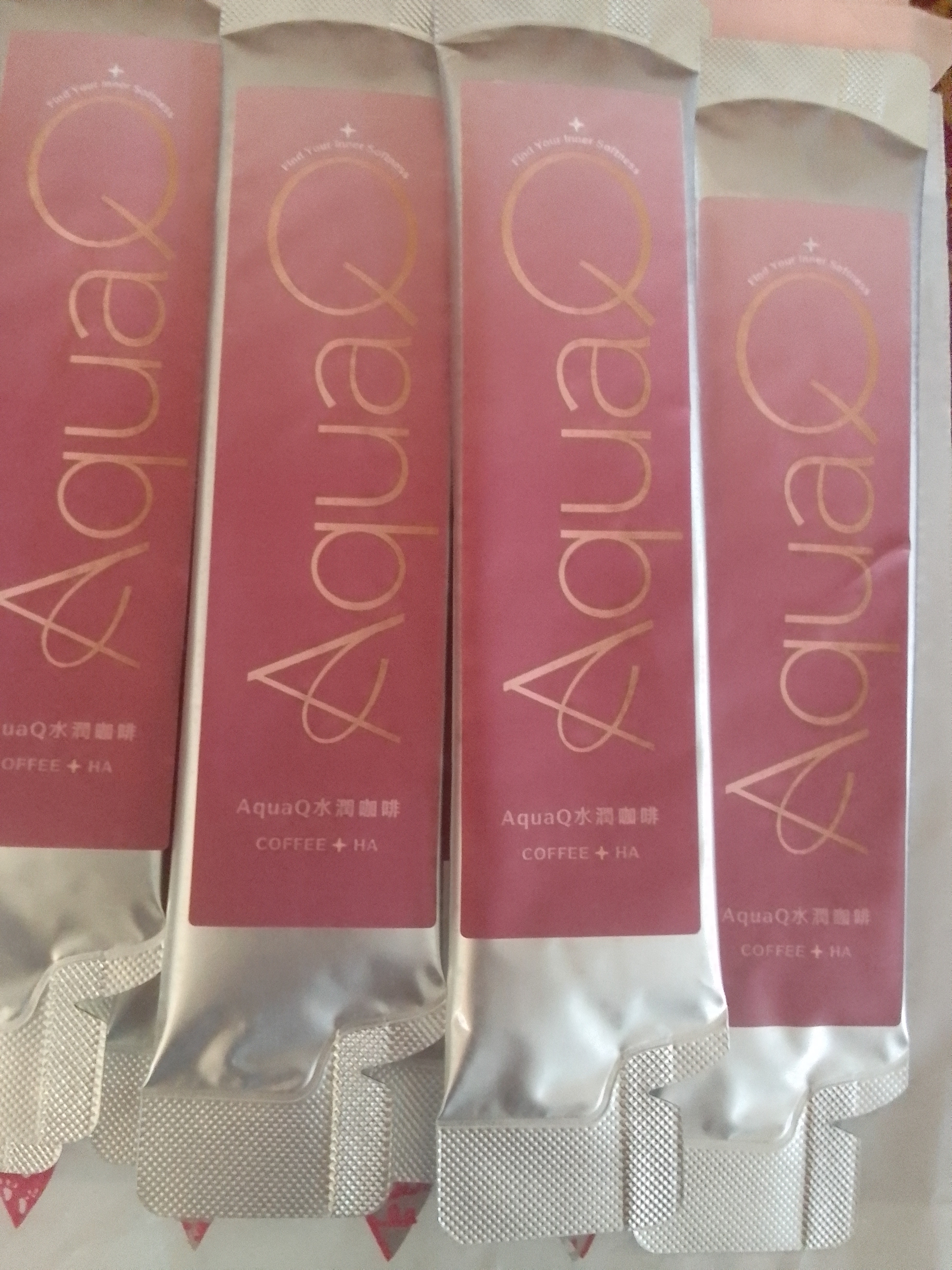AquaQ 水潤咖啡,強調七日水潤有感、Q彈。體驗包有7入,因體驗品尚在開發測試階段,收到是裸裝,蠻可惜看不到完整的產品包裝設計。