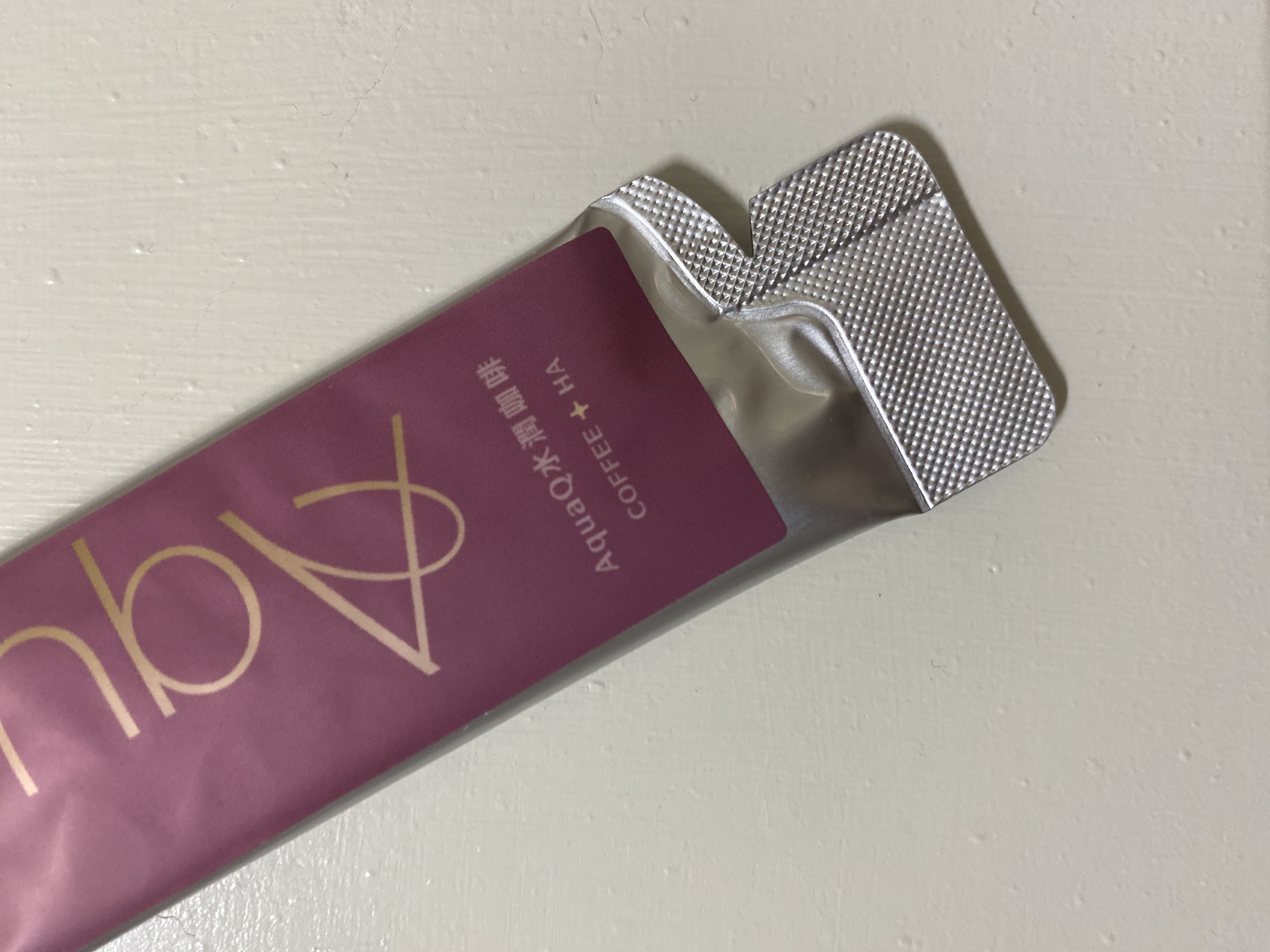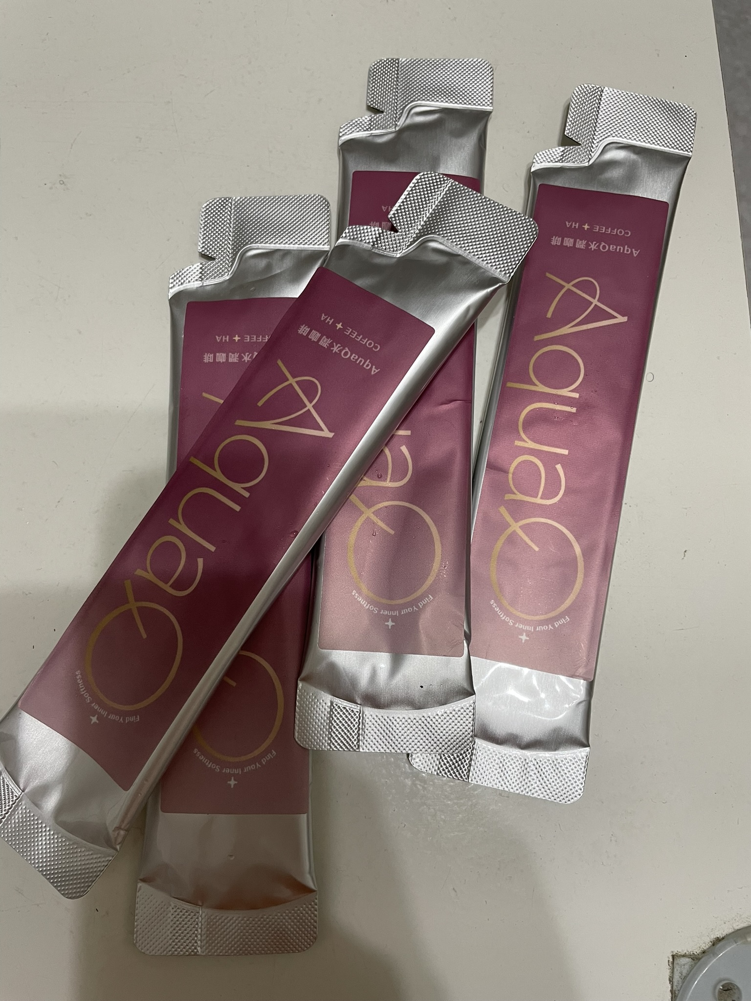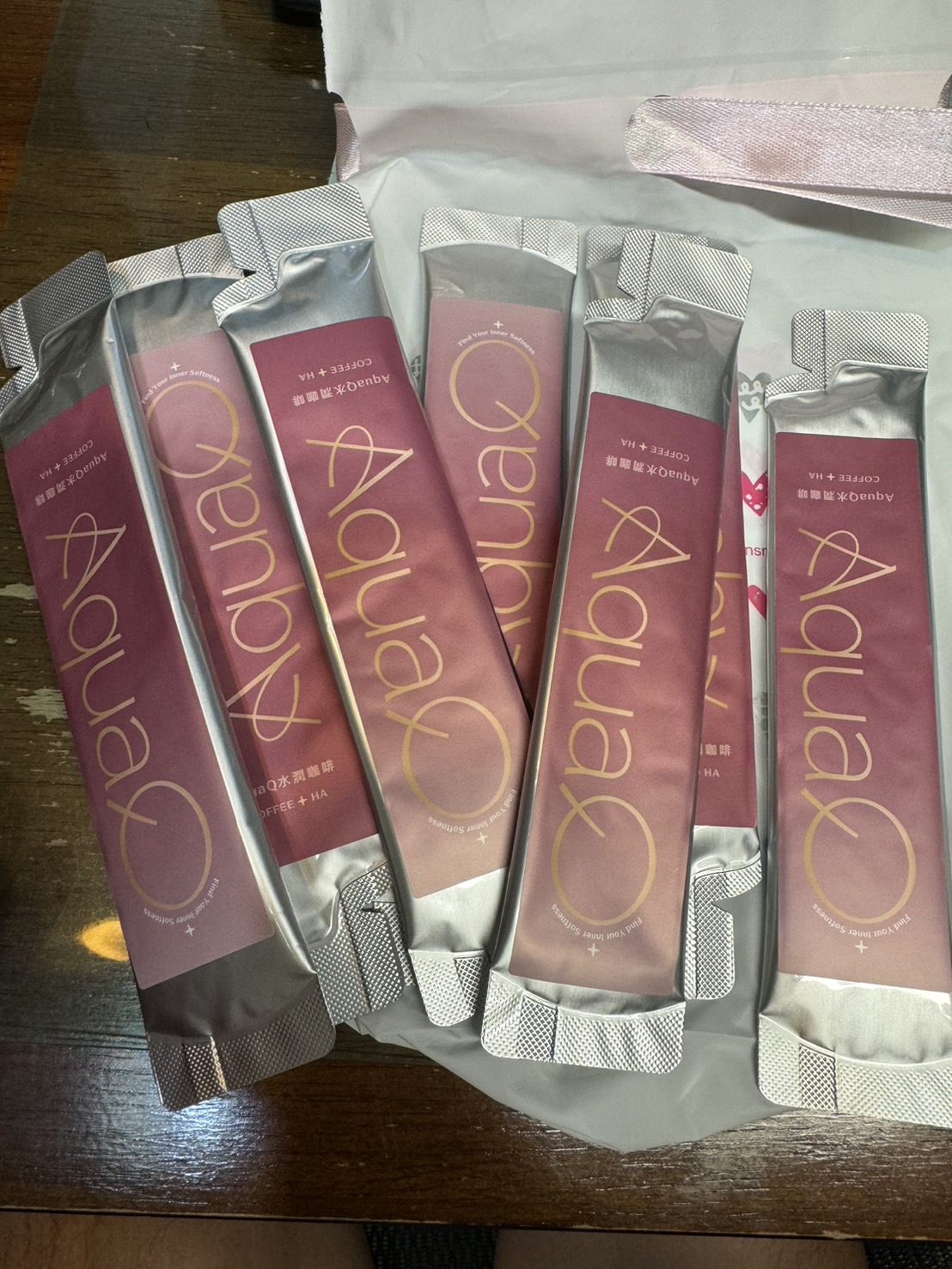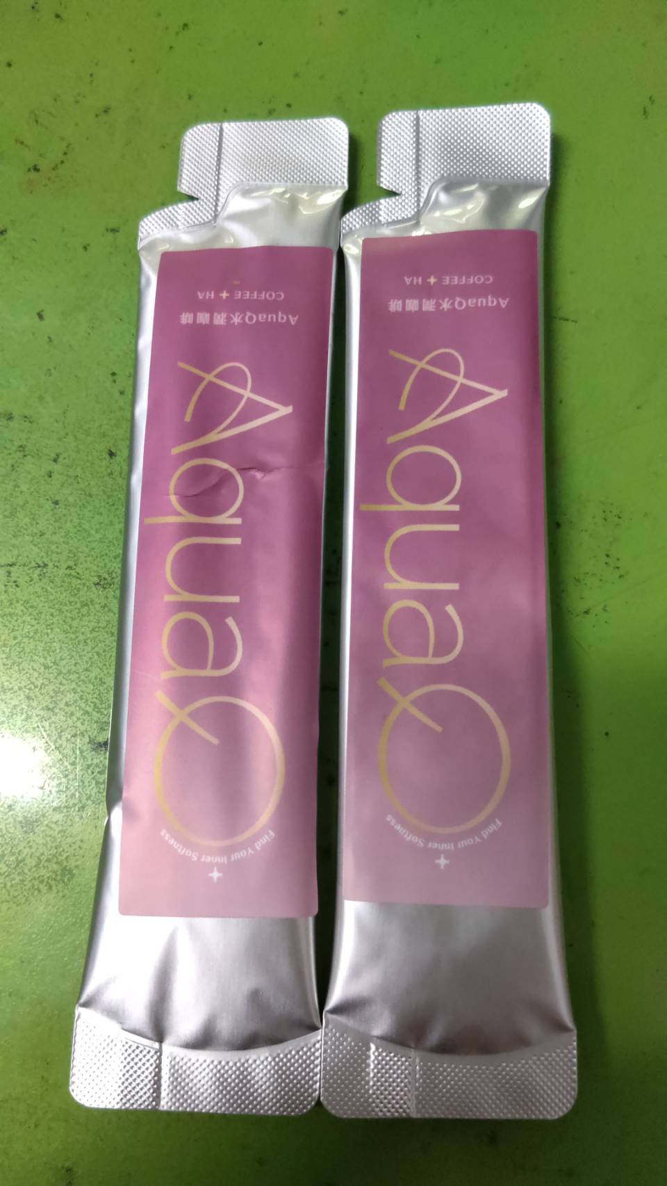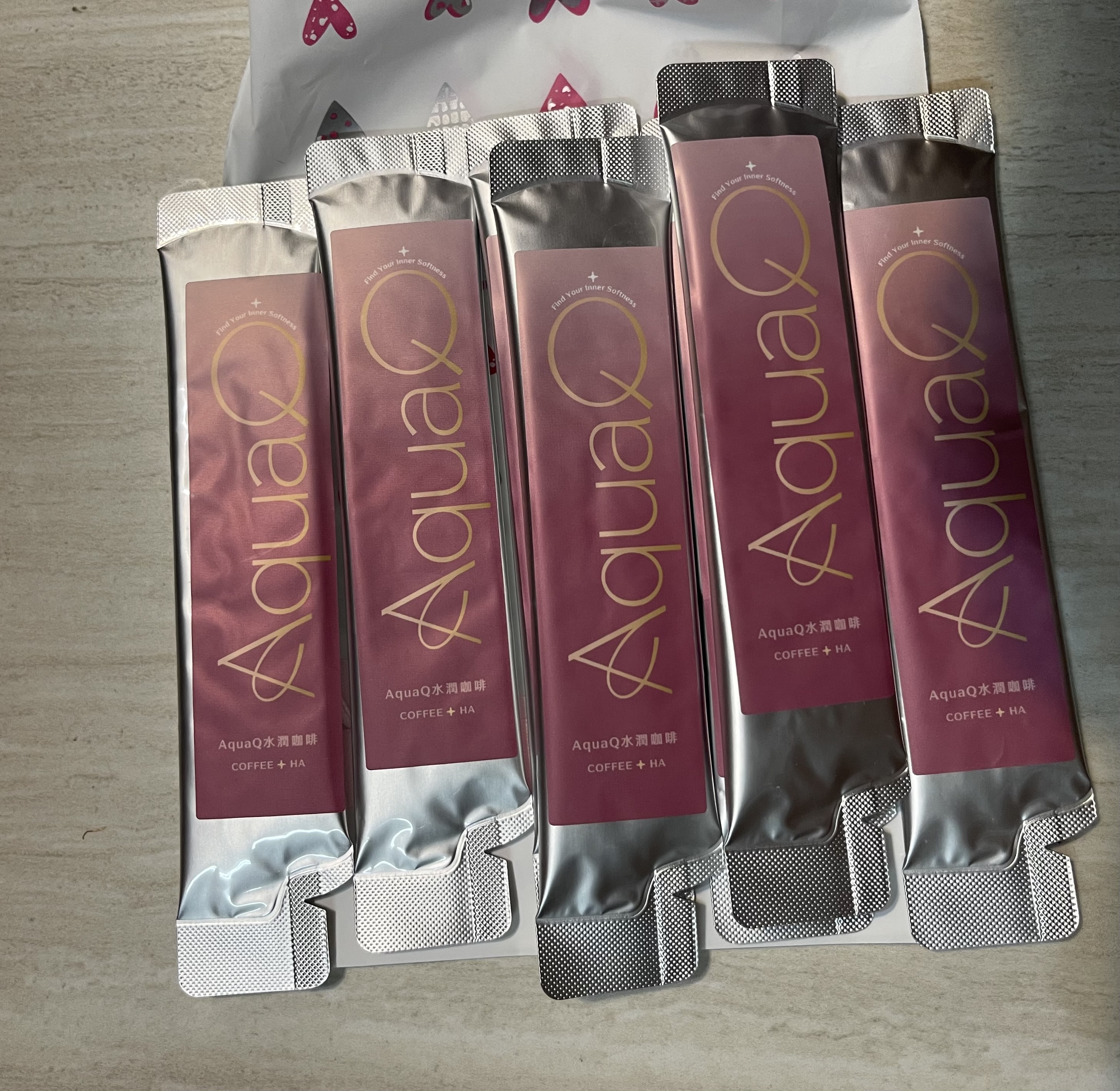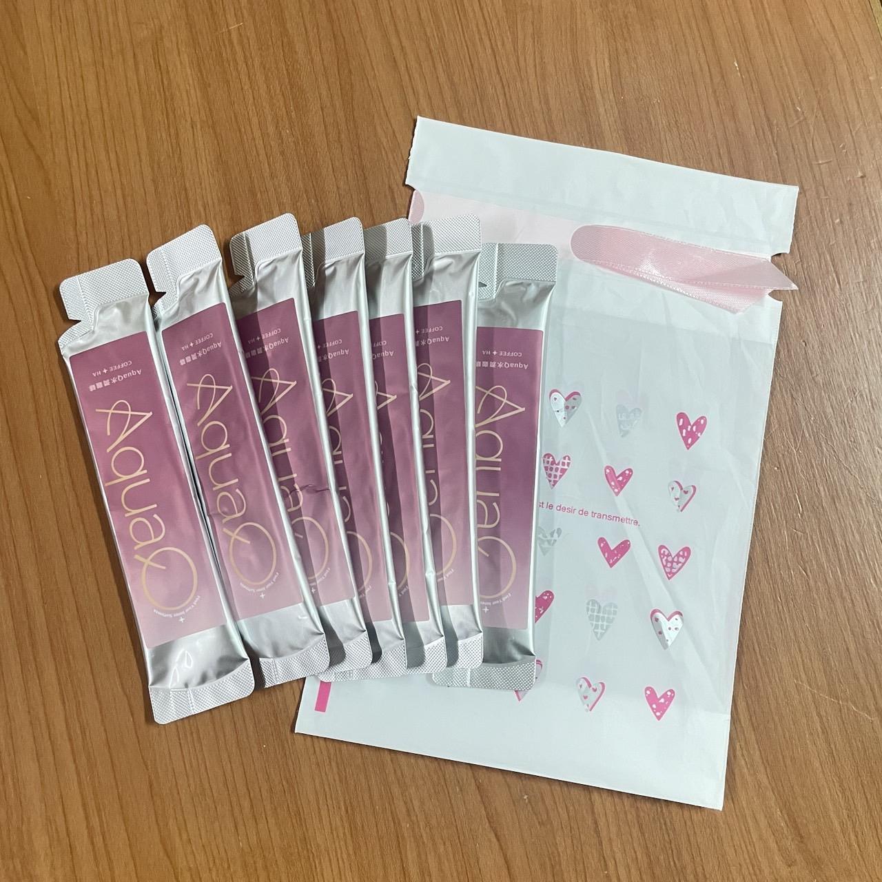 AquaQ 水潤咖啡,強調七日水潤有感、Q彈。體驗包有7入,因體驗品尚在開發測試階段,收到是裸裝,蠻可惜看不到完整的產品包裝設計。