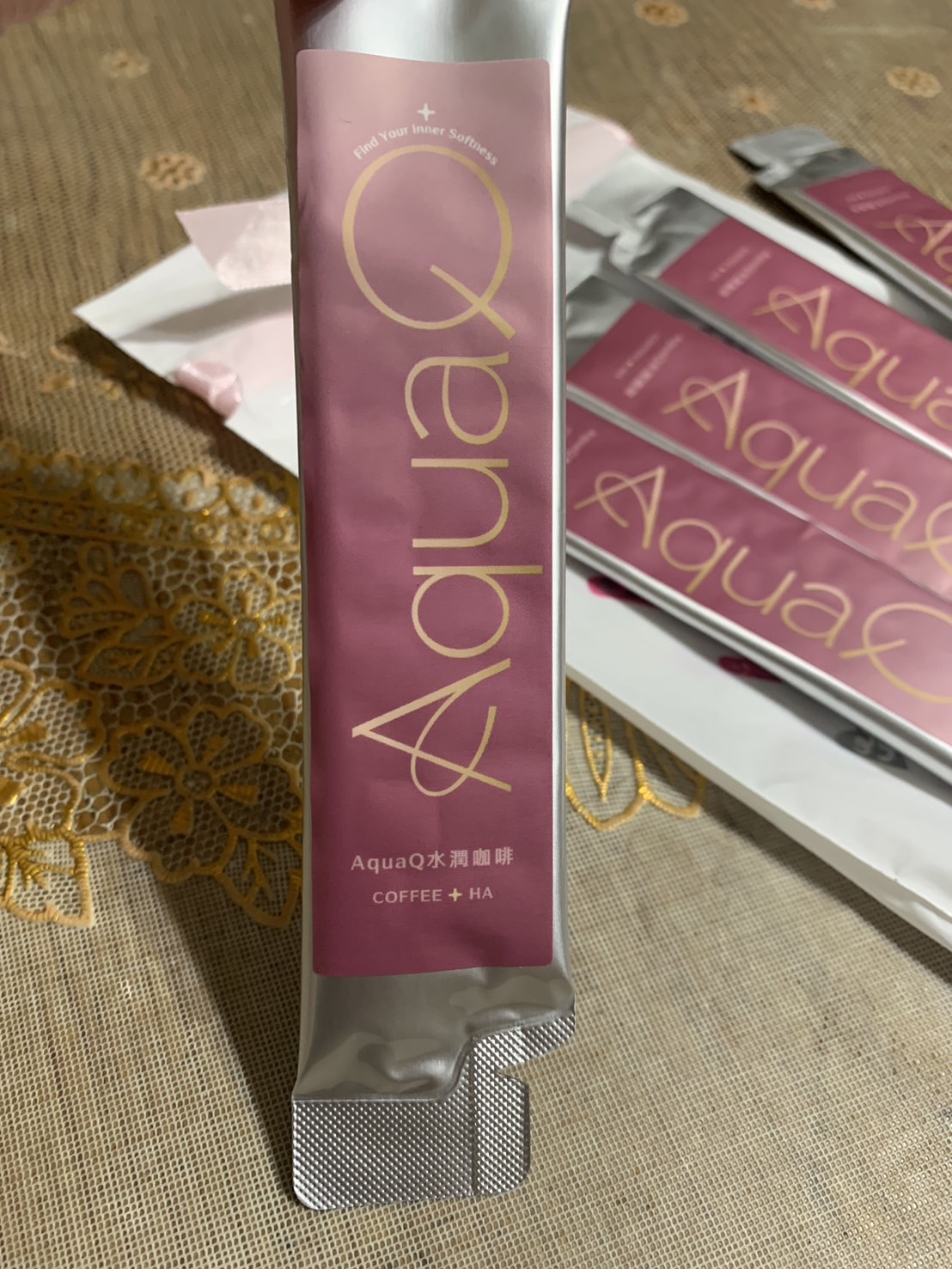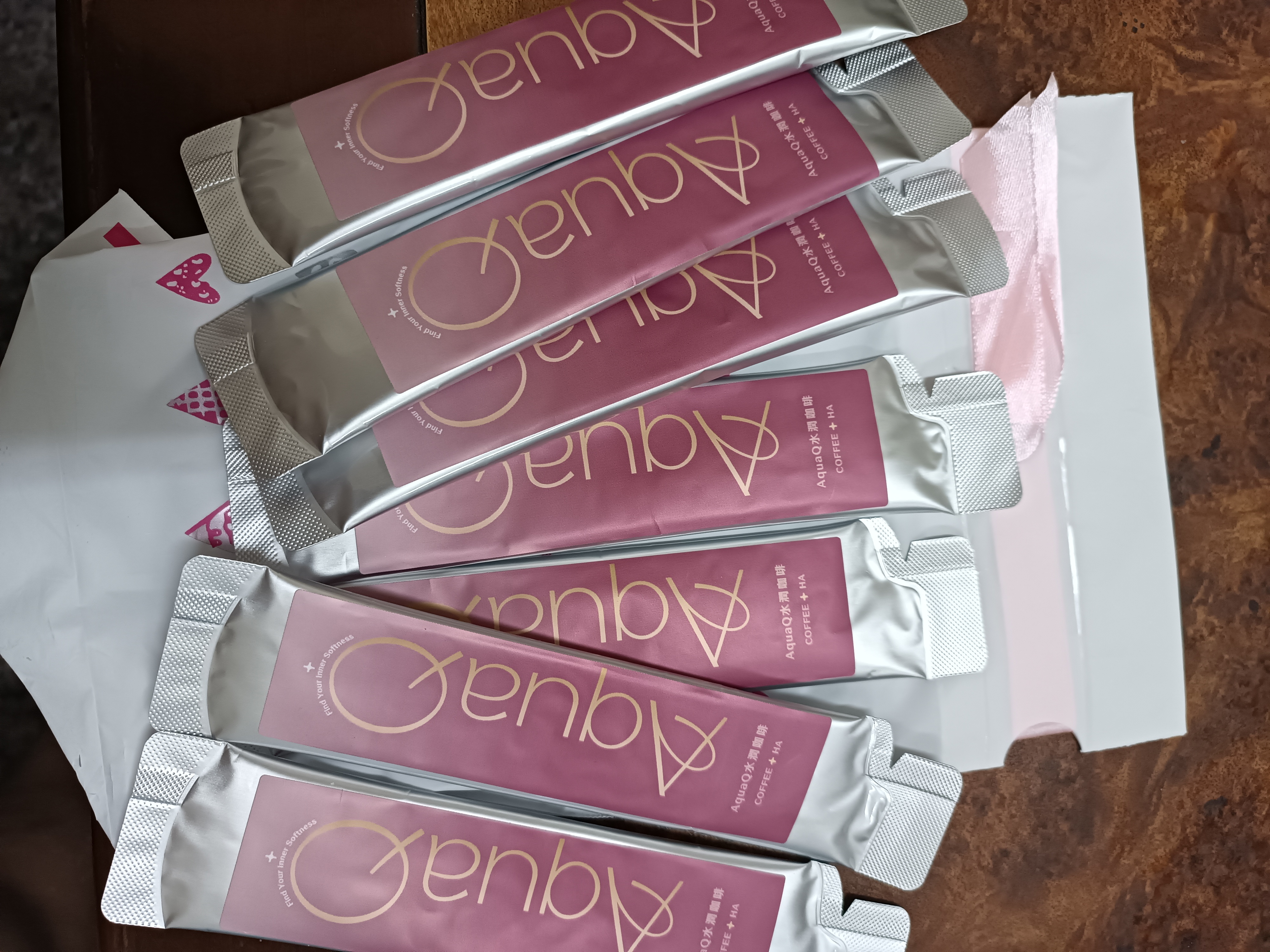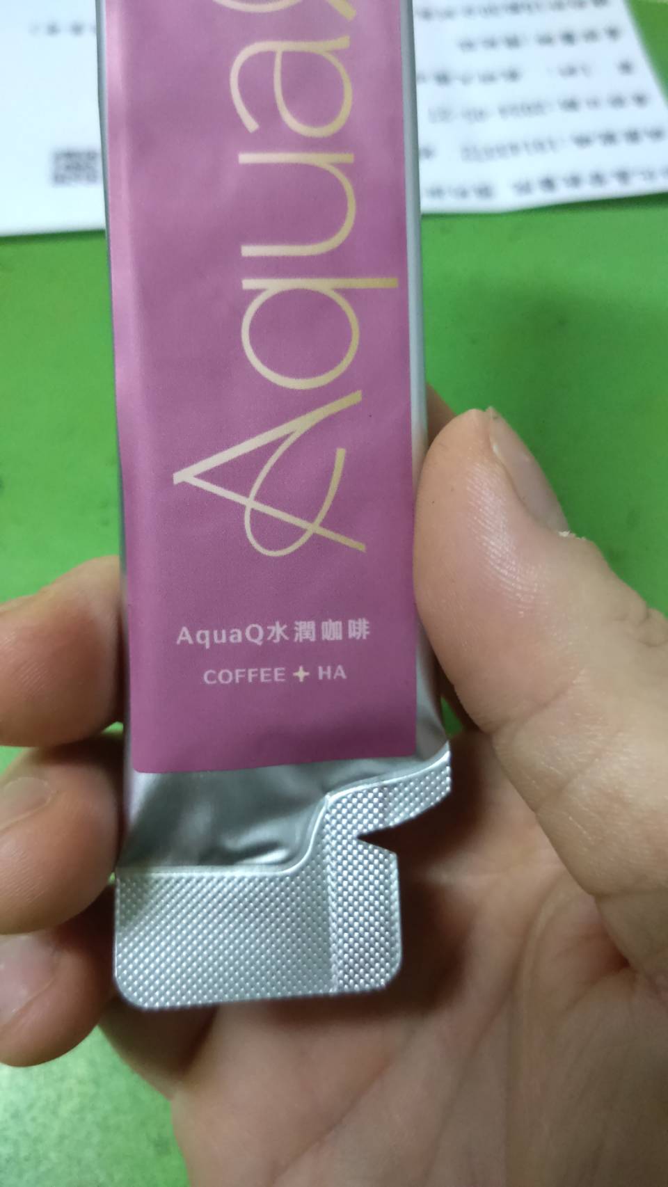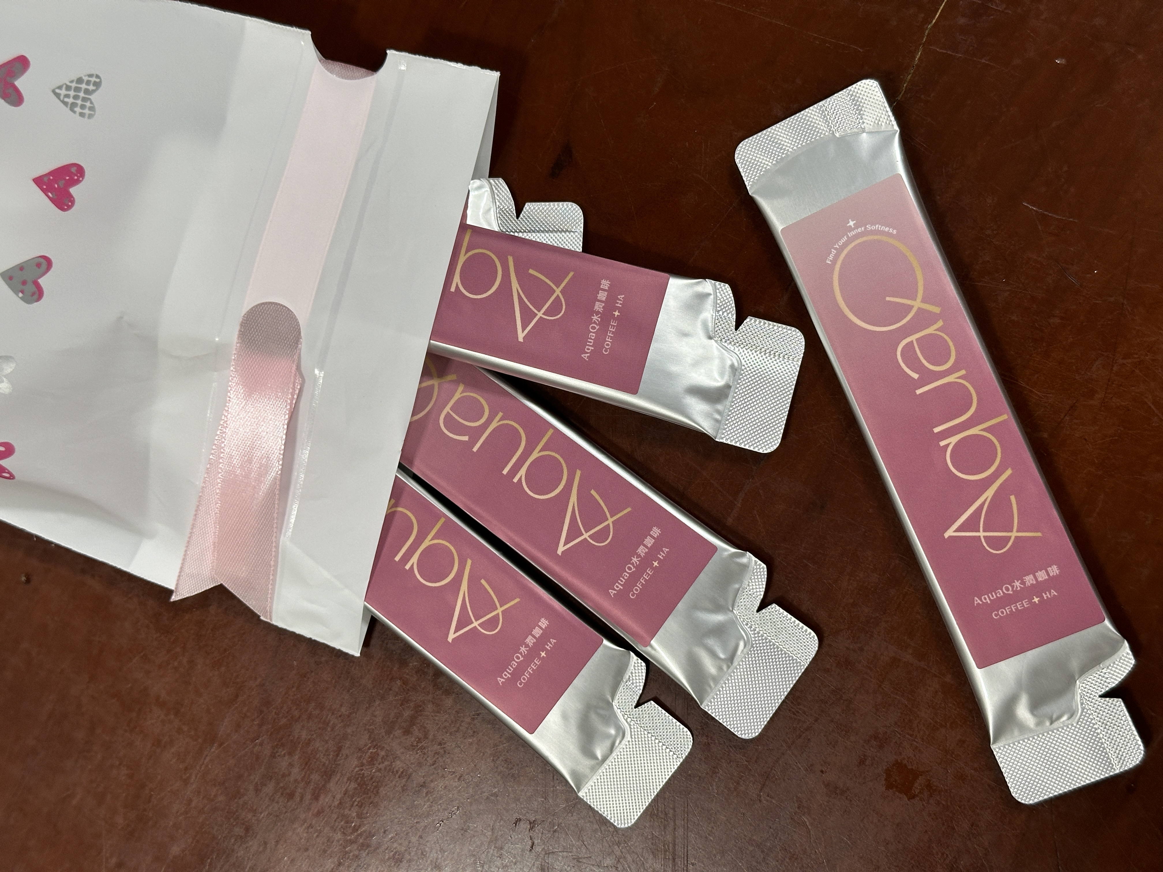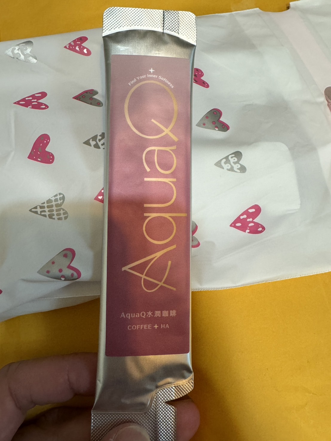AquaQ 水潤咖啡,強調七日水潤有感、Q彈。體驗包有7入,因體驗品尚在開發測試階段,收到是裸裝,蠻可惜看不到完整的產品包裝設計。