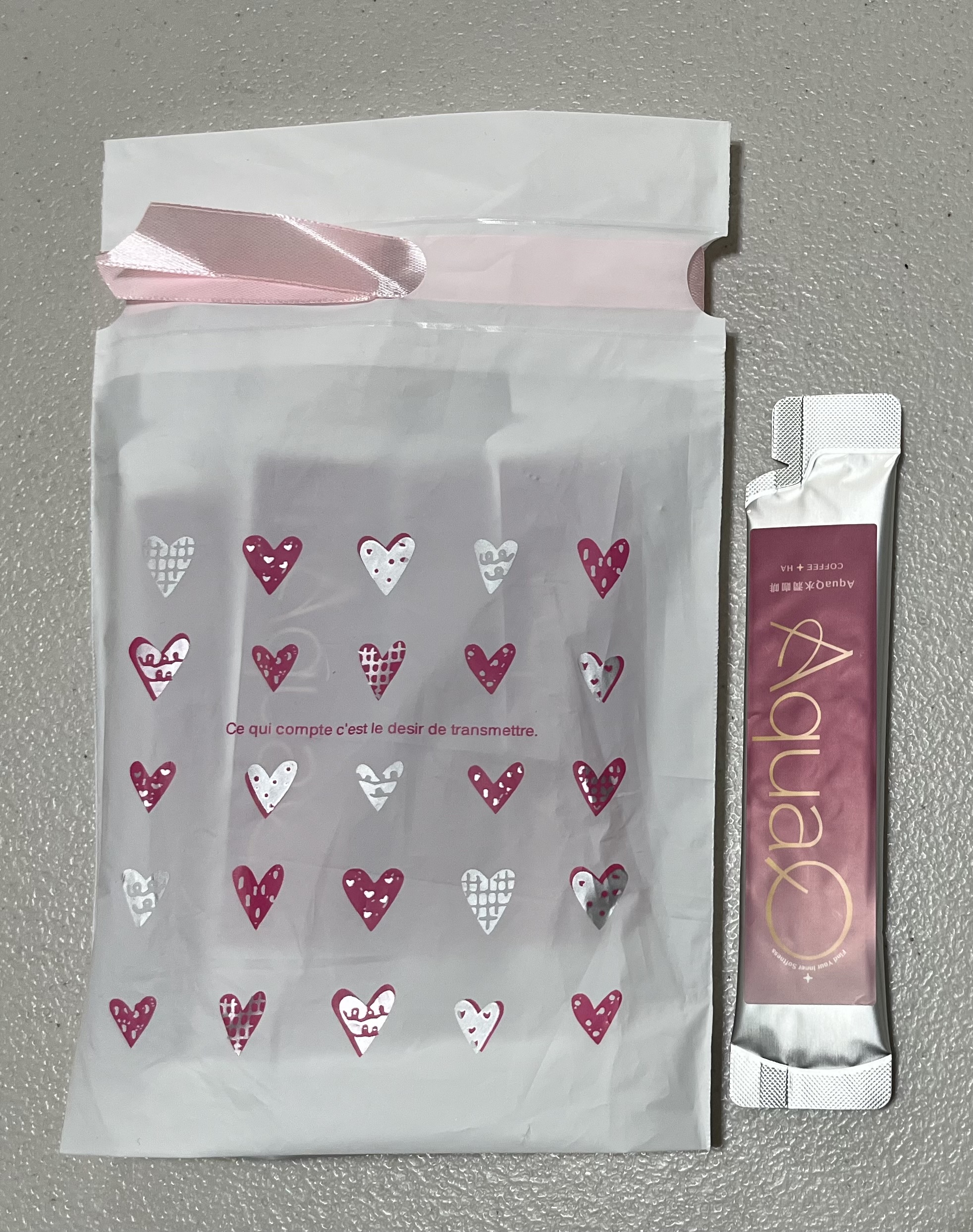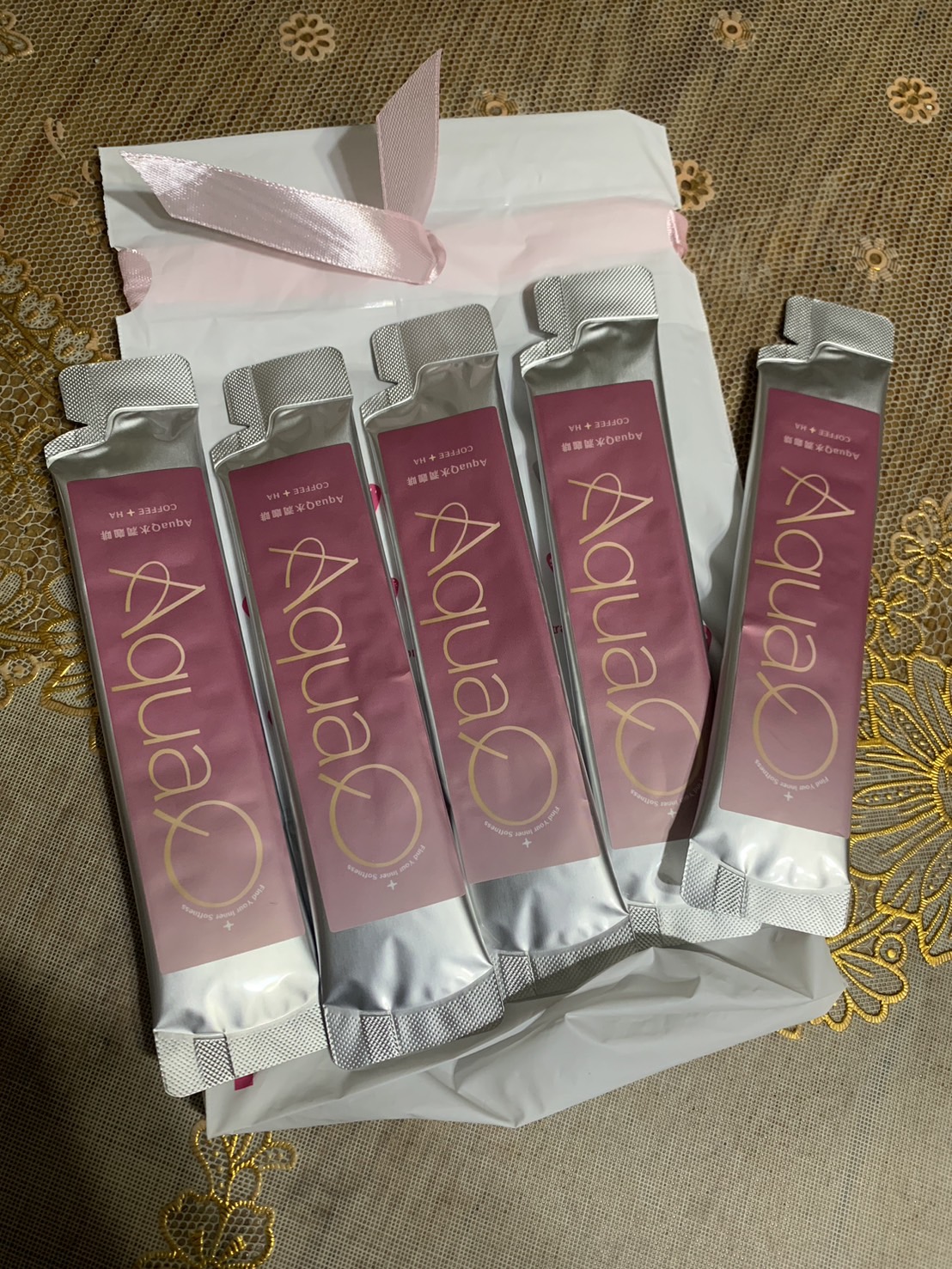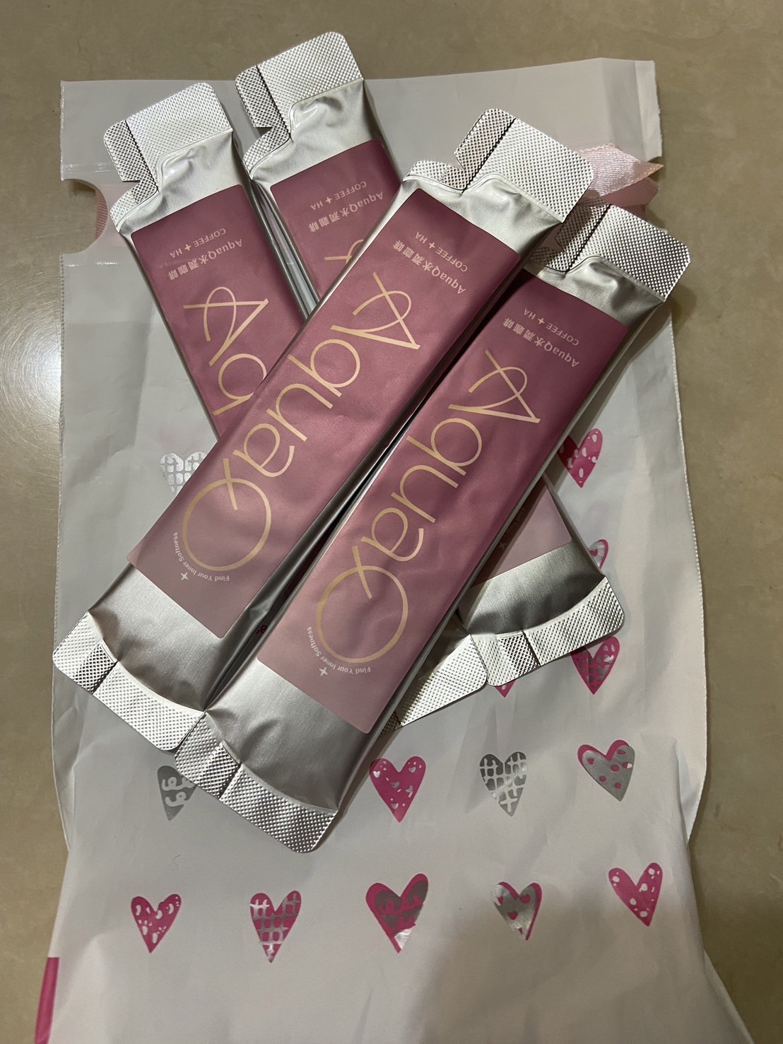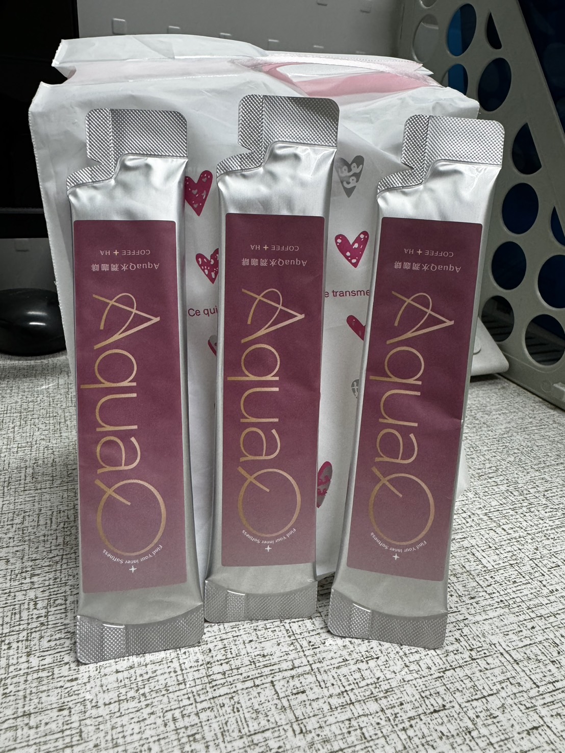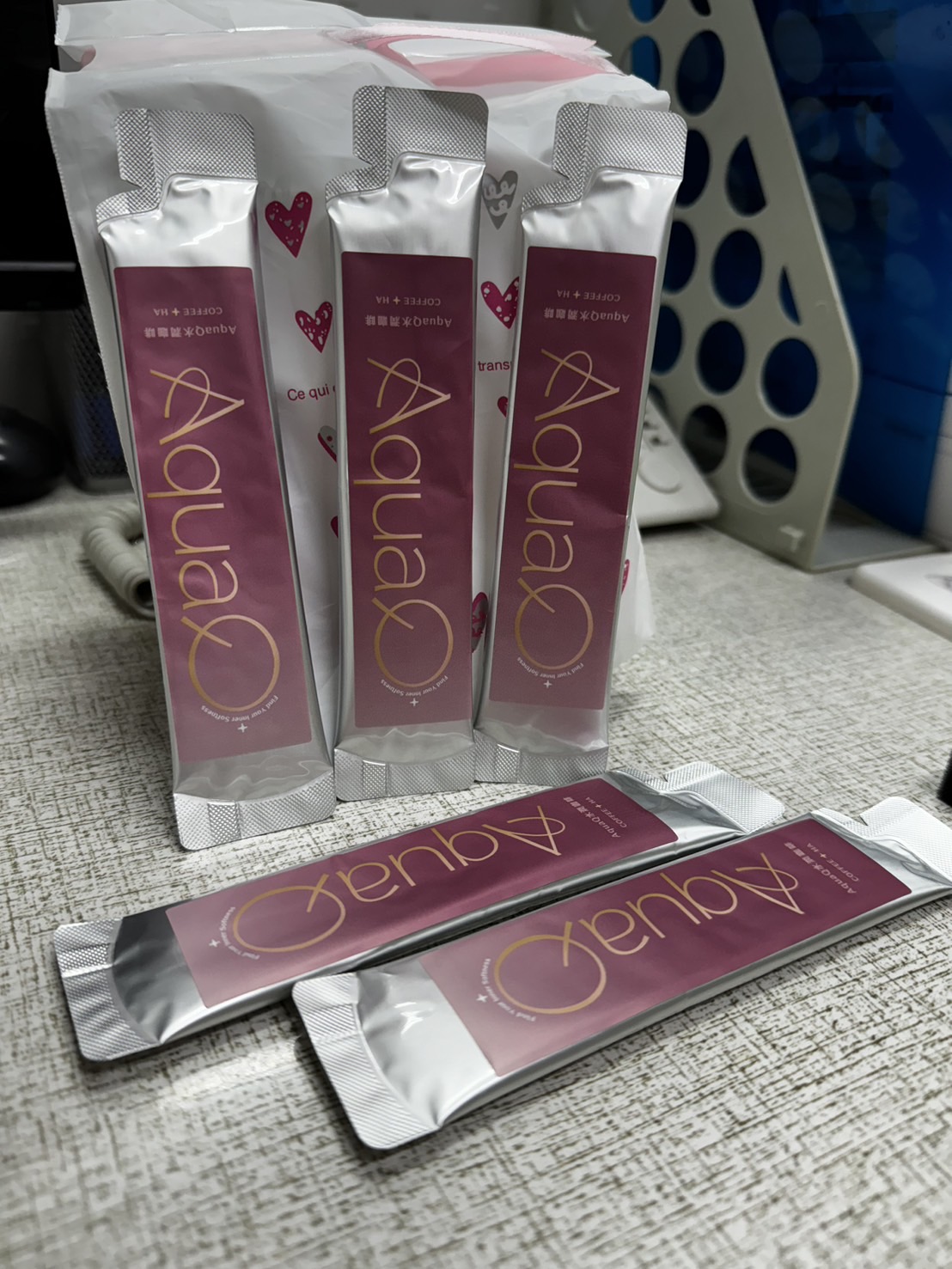 AquaQ 水潤咖啡,強調七日水潤有感、Q彈。體驗包有7入,因體驗品尚在開發測試階段,收到是裸裝,蠻可惜看不到完整的產品包裝設計。