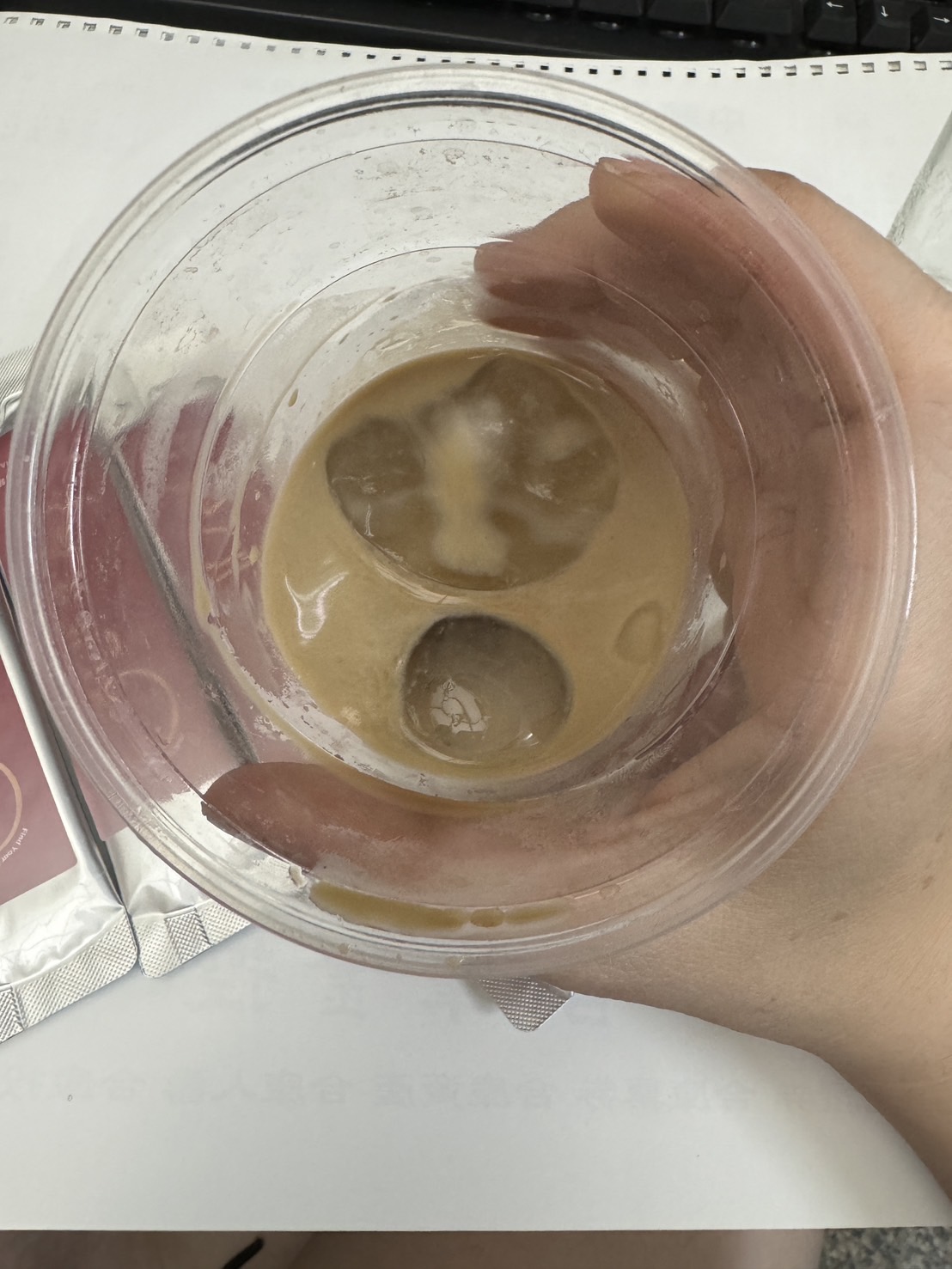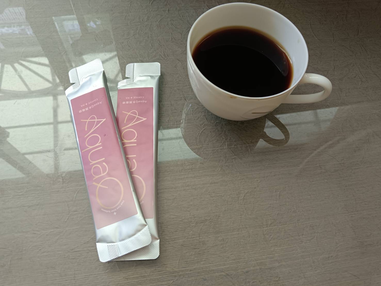 拿到實體後總覺得跟網站的有些許不同,對比後發現是包裝的差異,試用品是鋁色外包裝貼產品名稱貼紙,跟網站顯示一體成形的有差。倒出來的液體色黑到發亮,咖啡味也很濃郁,有種沽溜沽溜的滑感,可能就是所謂的玻尿酸吧,跟牛奶混合成拿鐵,喝起來依舊有滑順感,但咖啡的味道稍嫌淡薄,兌水的量要斟酌。一天一包,雖然皮膚不到非常有感,但最近用眼過度的乾澀眼睛有比較水潤的感覺,聽說玻尿酸會補到身體覺得應該要補的地方,好神奇。