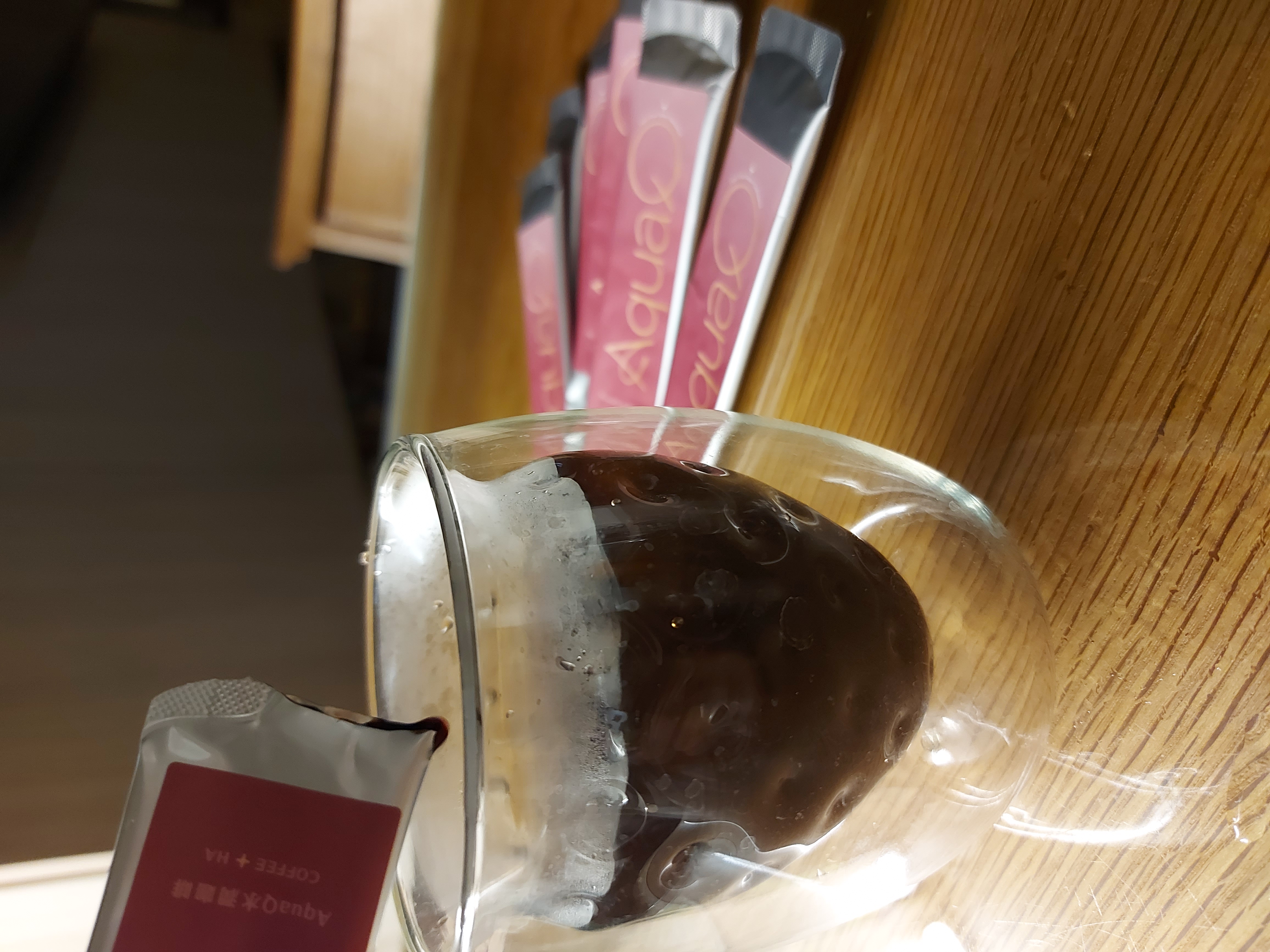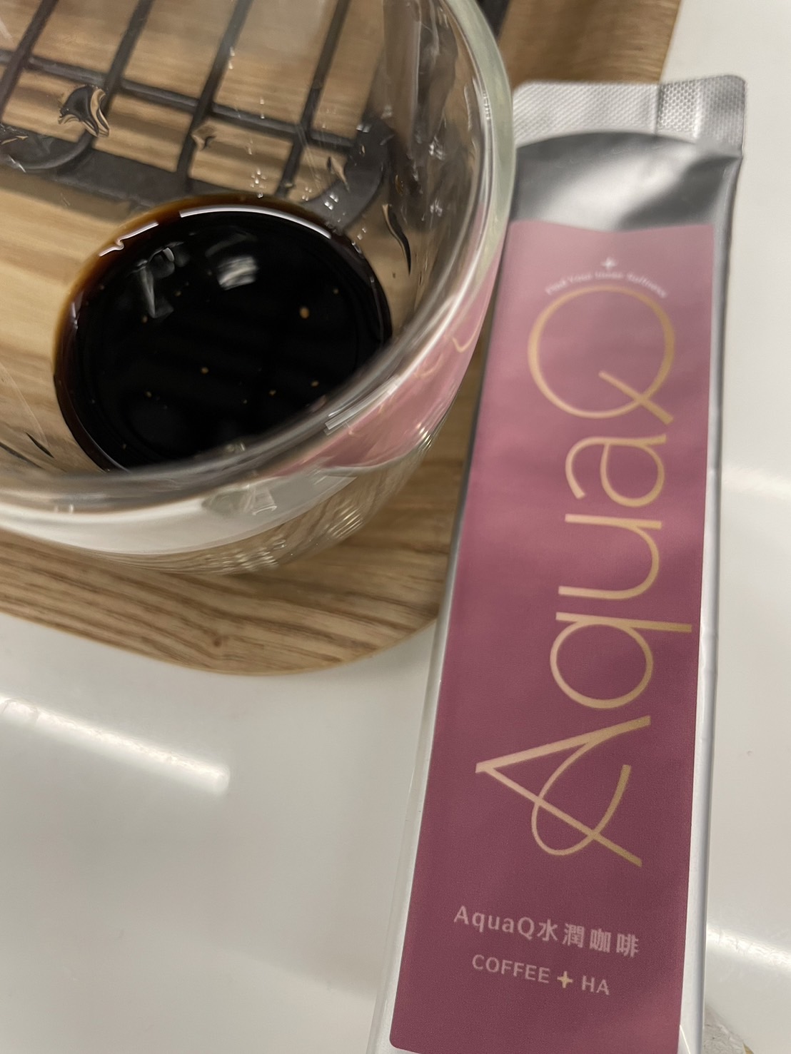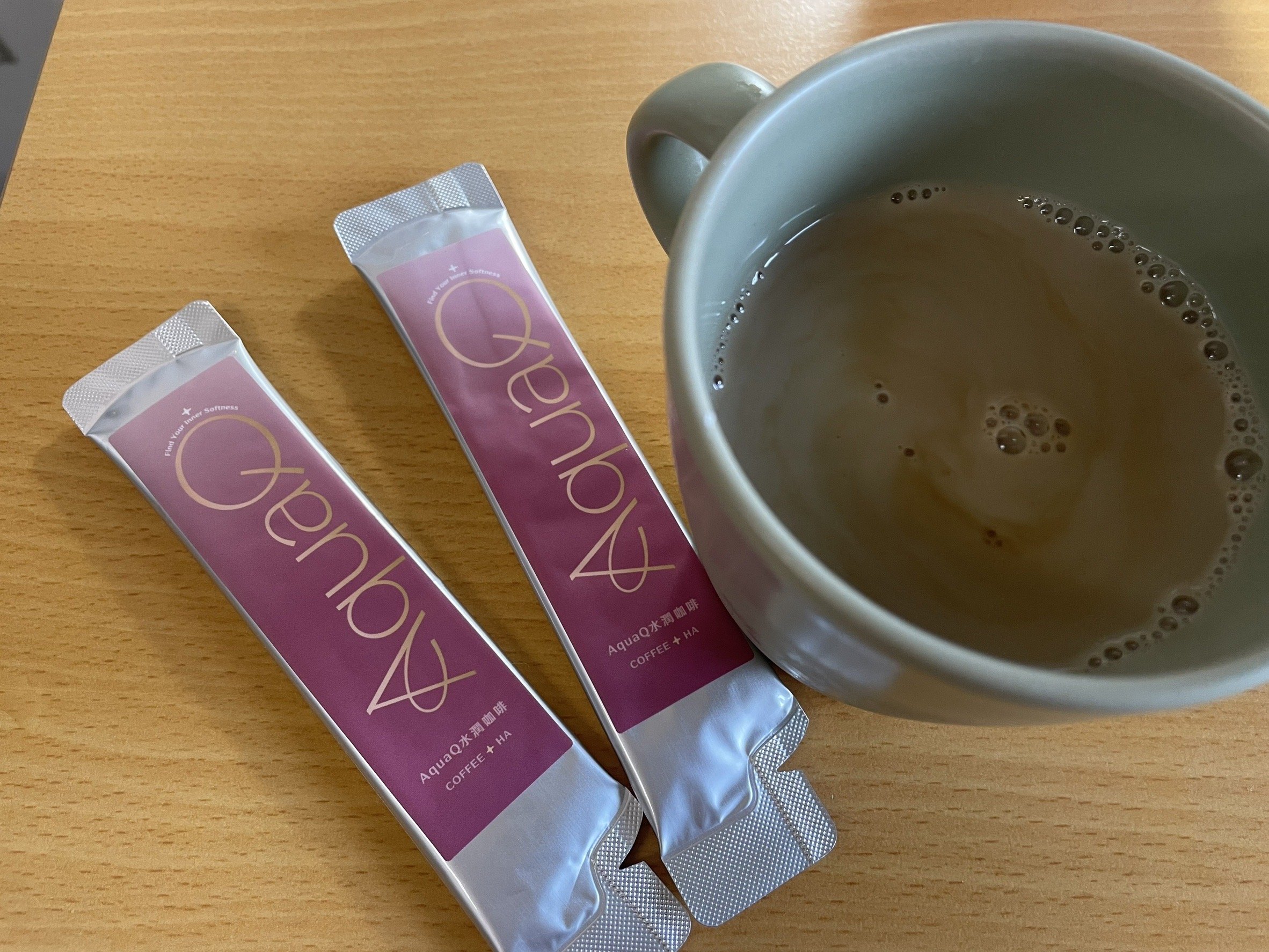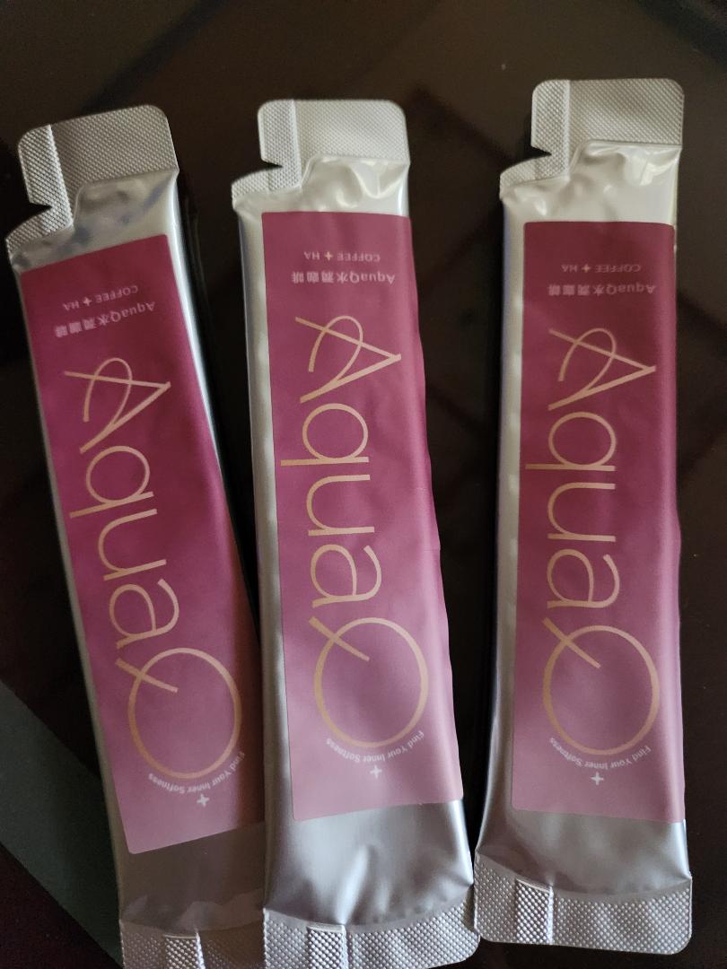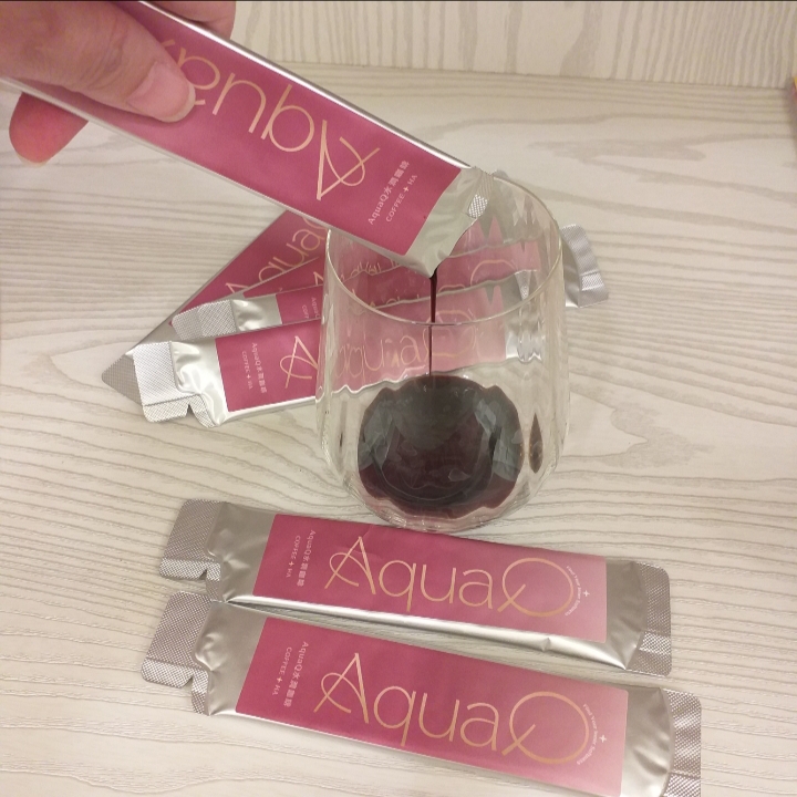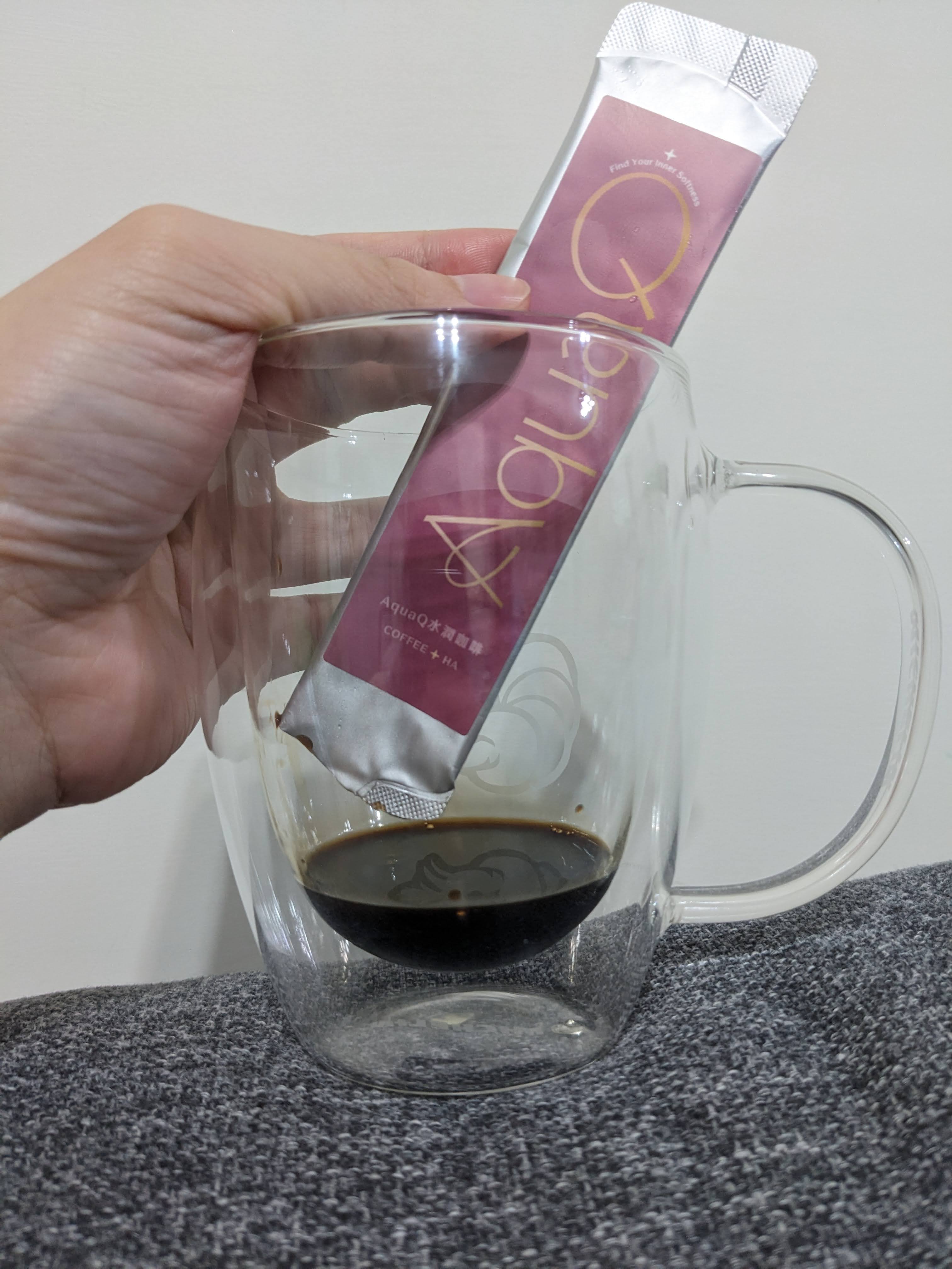 本次體驗AquaQ 水潤咖啡,號稱有添加口服玻尿酸的咖啡,濃度達95%以上。一包約20ml,應該是濃縮的咖啡,因為手邊沒有熱水,我是加冰水做成冰美式,喝起來還滿順口的。目前還沒感覺到玻尿酸的功效,可能要再多喝一陣子吧。