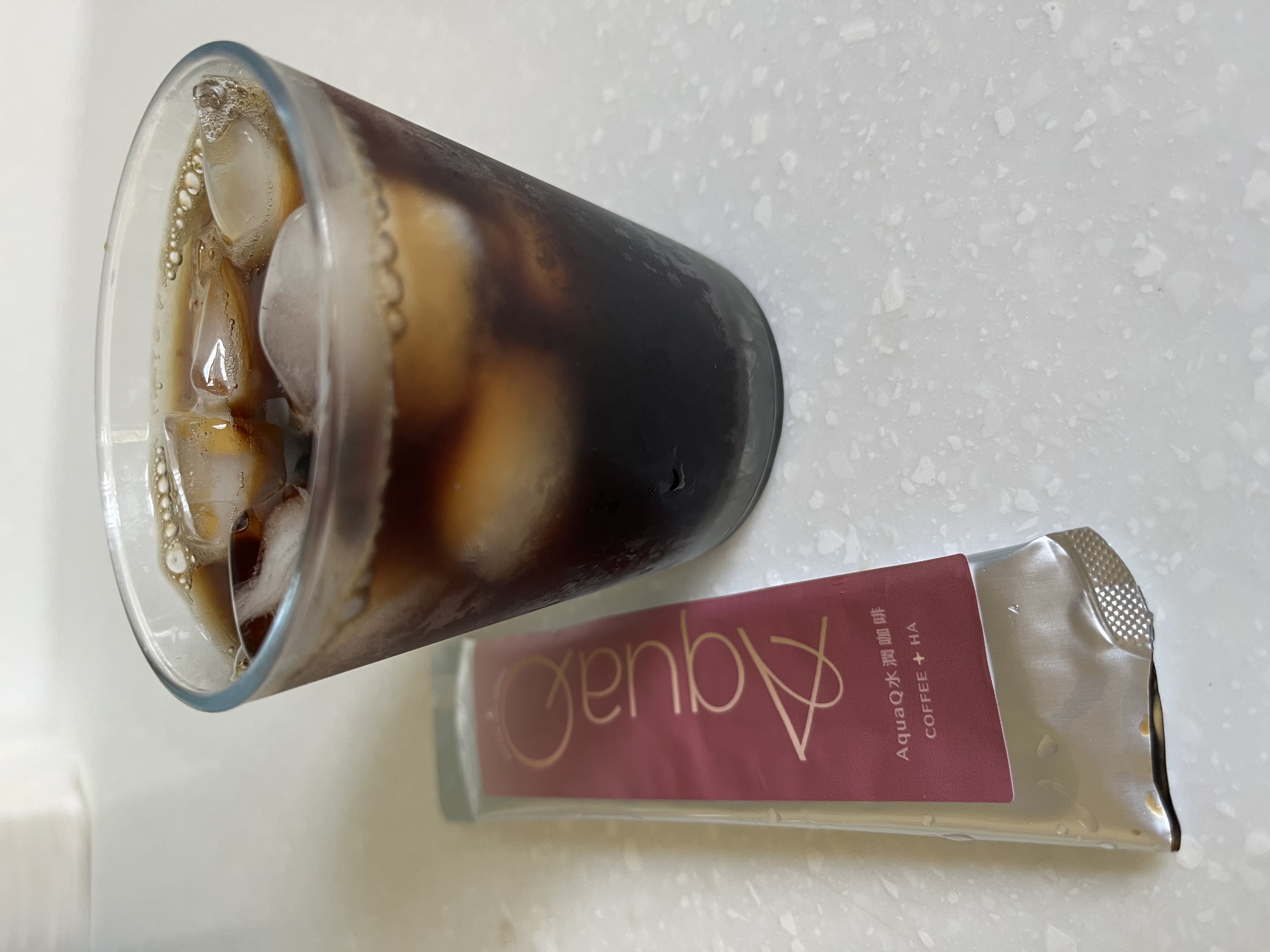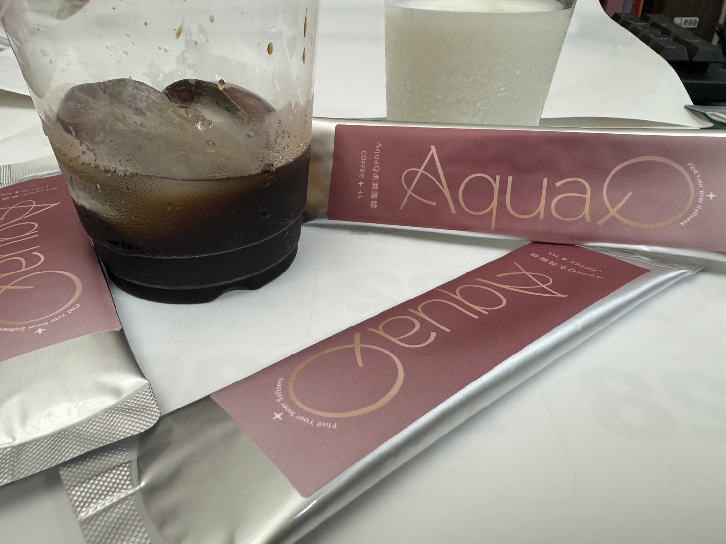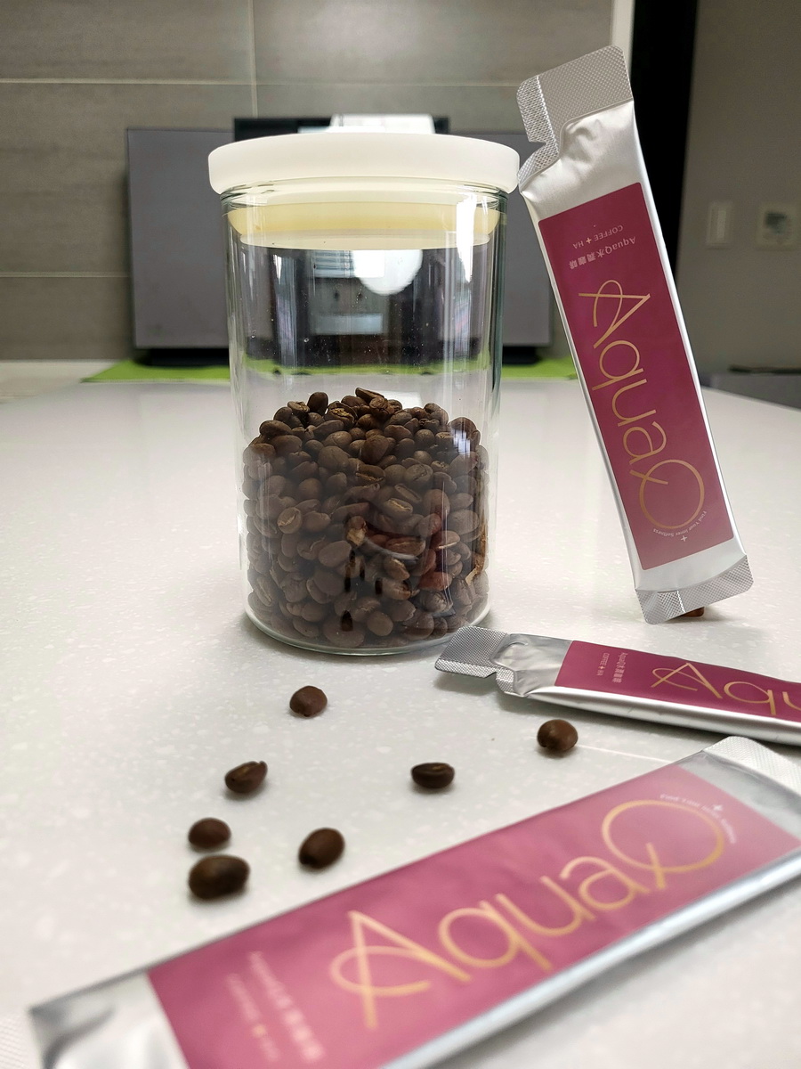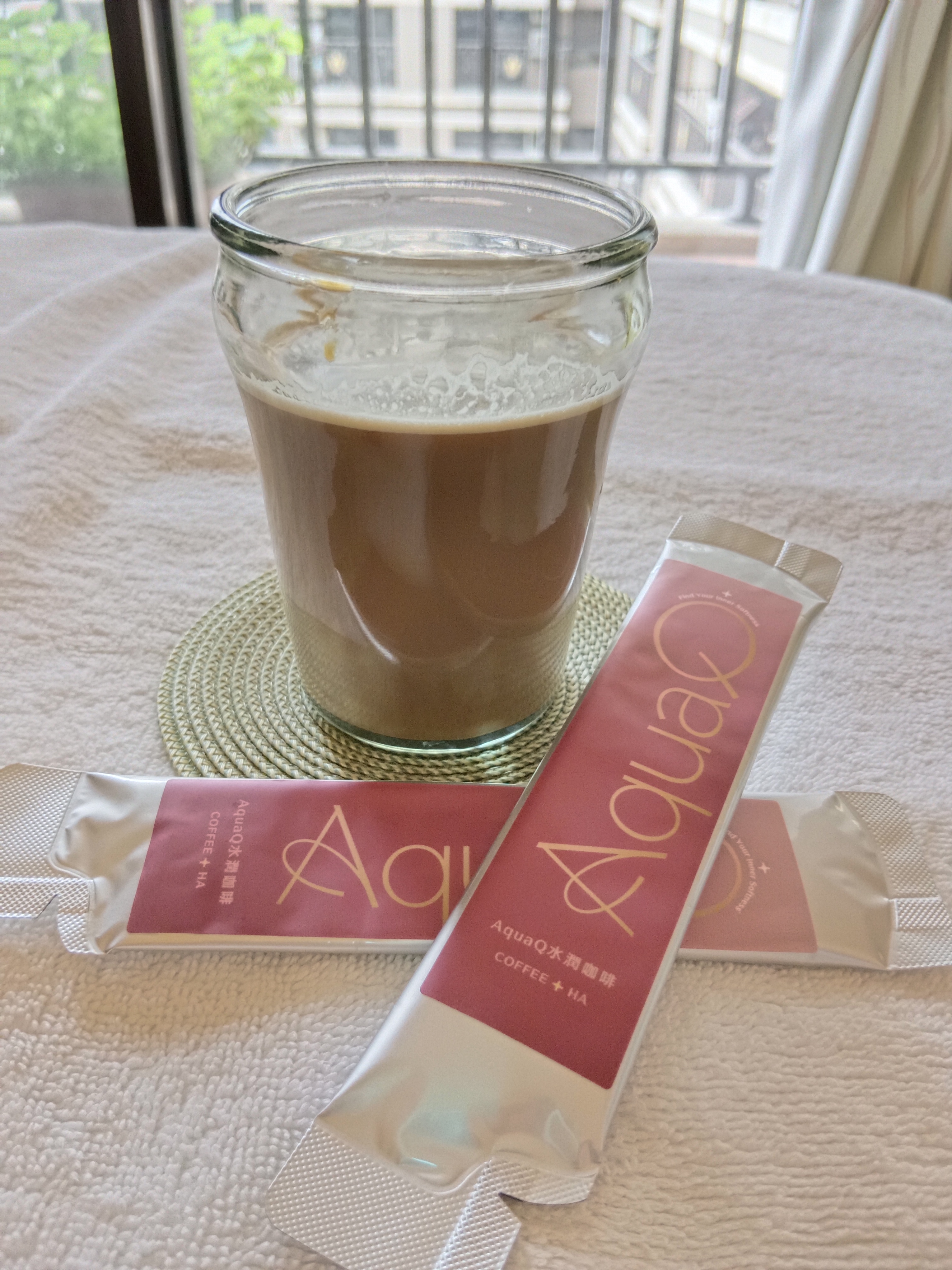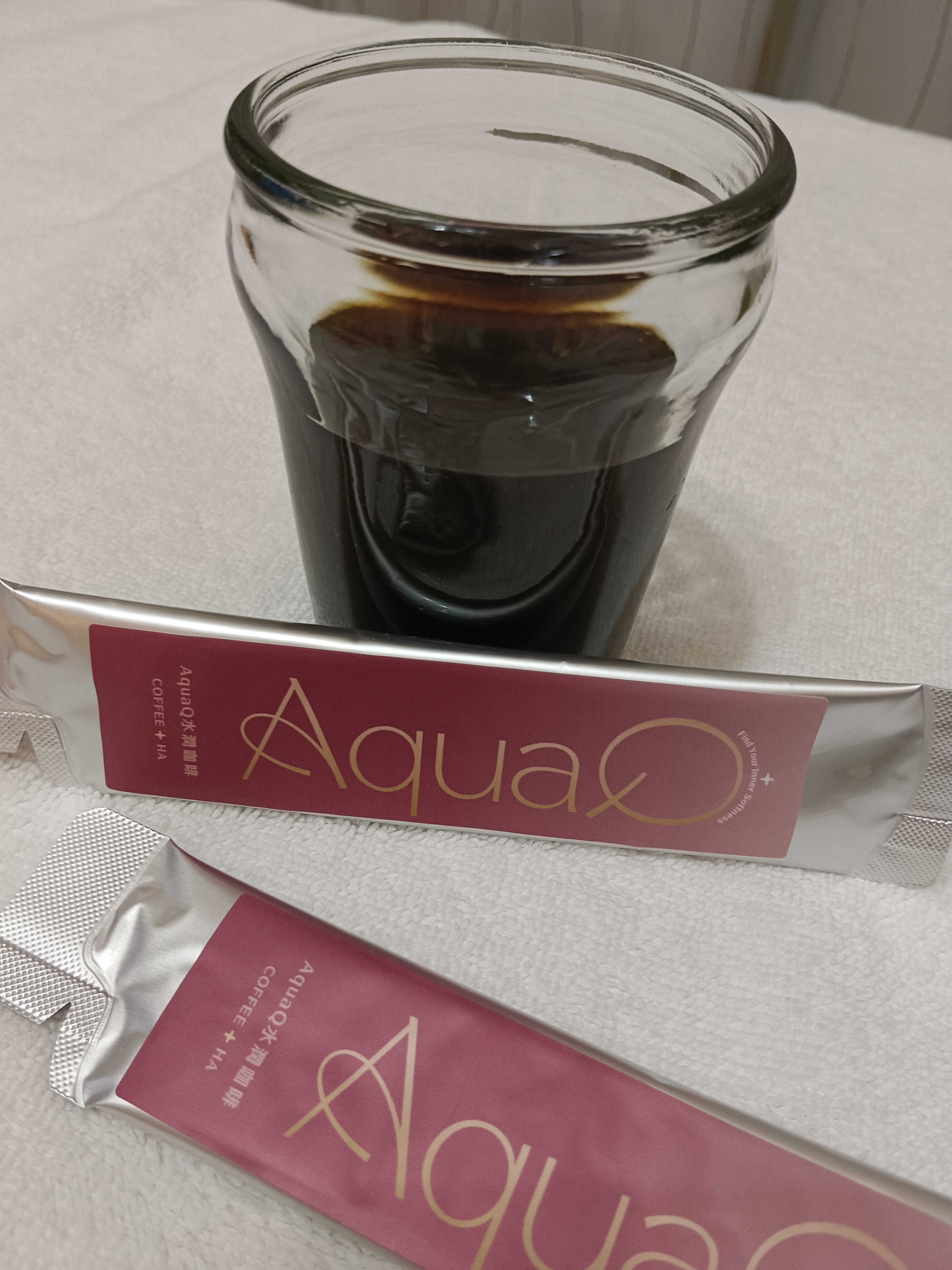 本次體驗AquaQ 水潤咖啡,號稱有添加口服玻尿酸的咖啡,濃度達95%以上。一包約20ml,應該是濃縮的咖啡,因為手邊沒有熱水,我是加冰水做成冰美式,喝起來還滿順口的。目前還沒感覺到玻尿酸的功效,可能要再多喝一陣子吧。