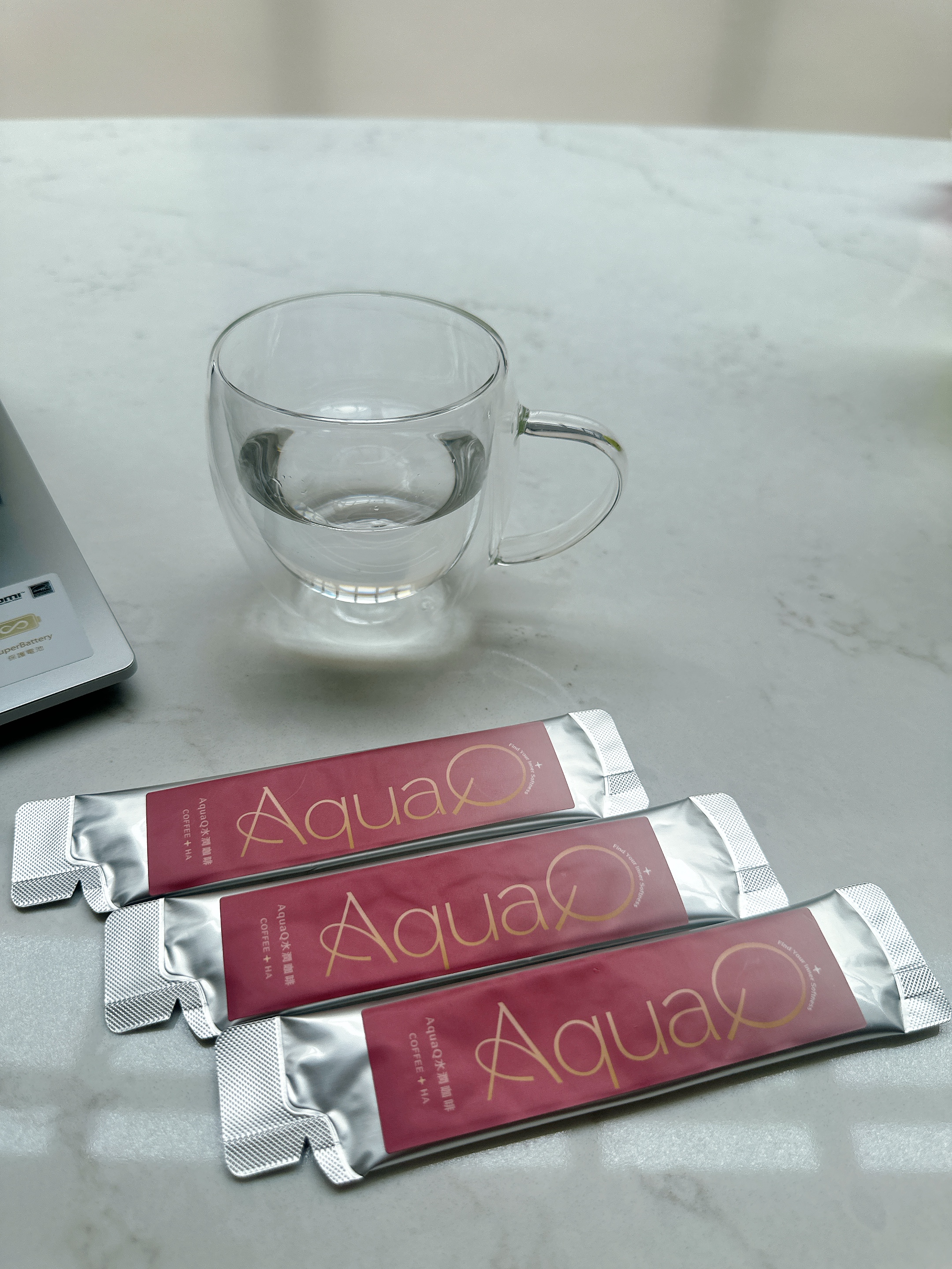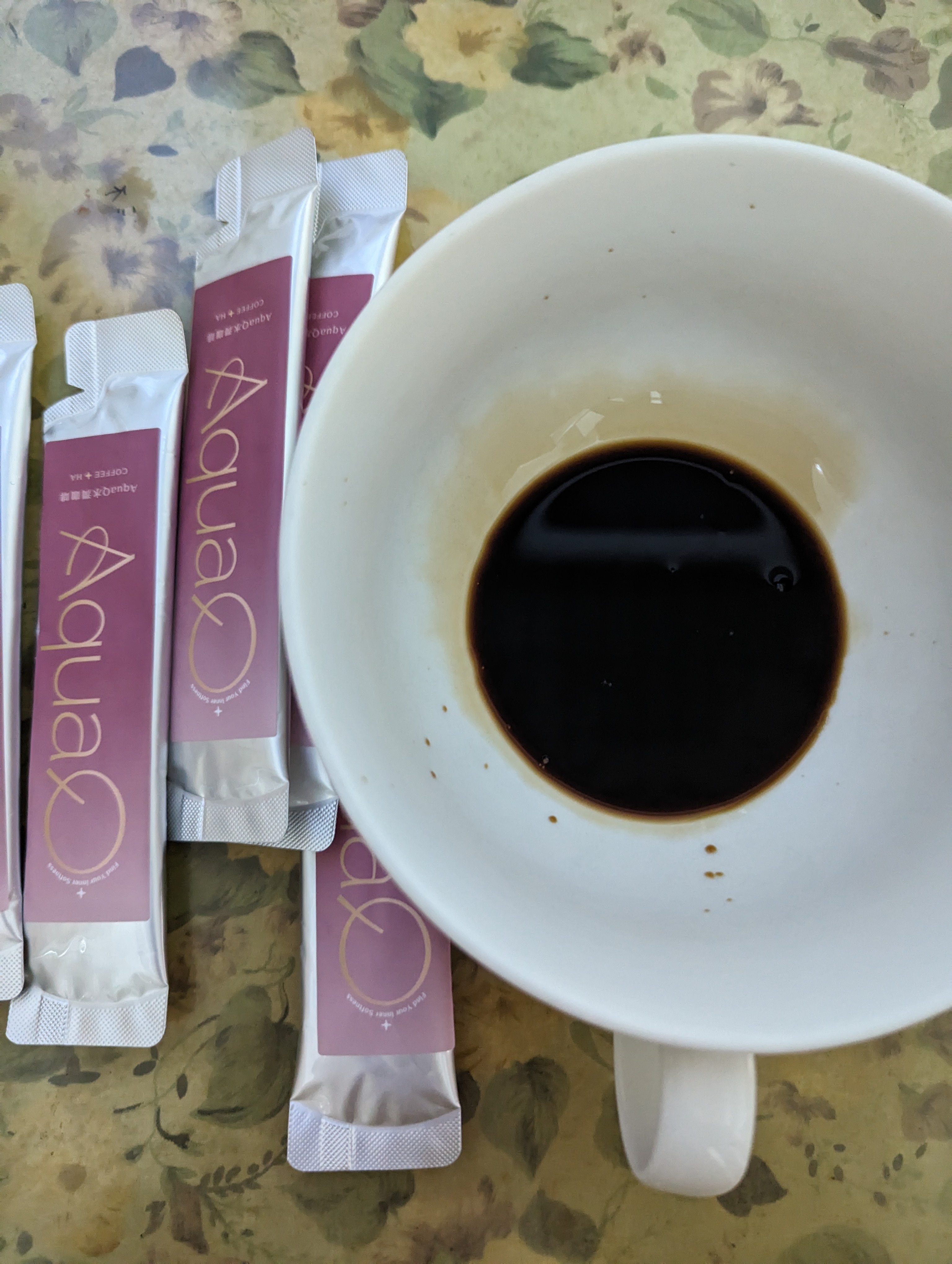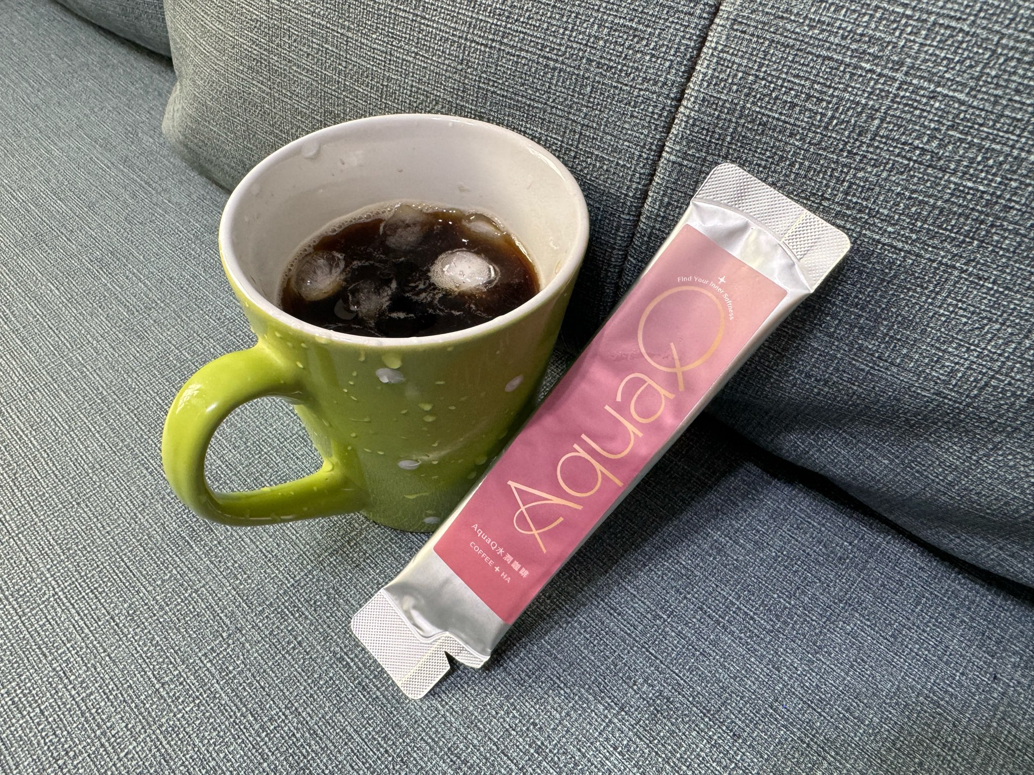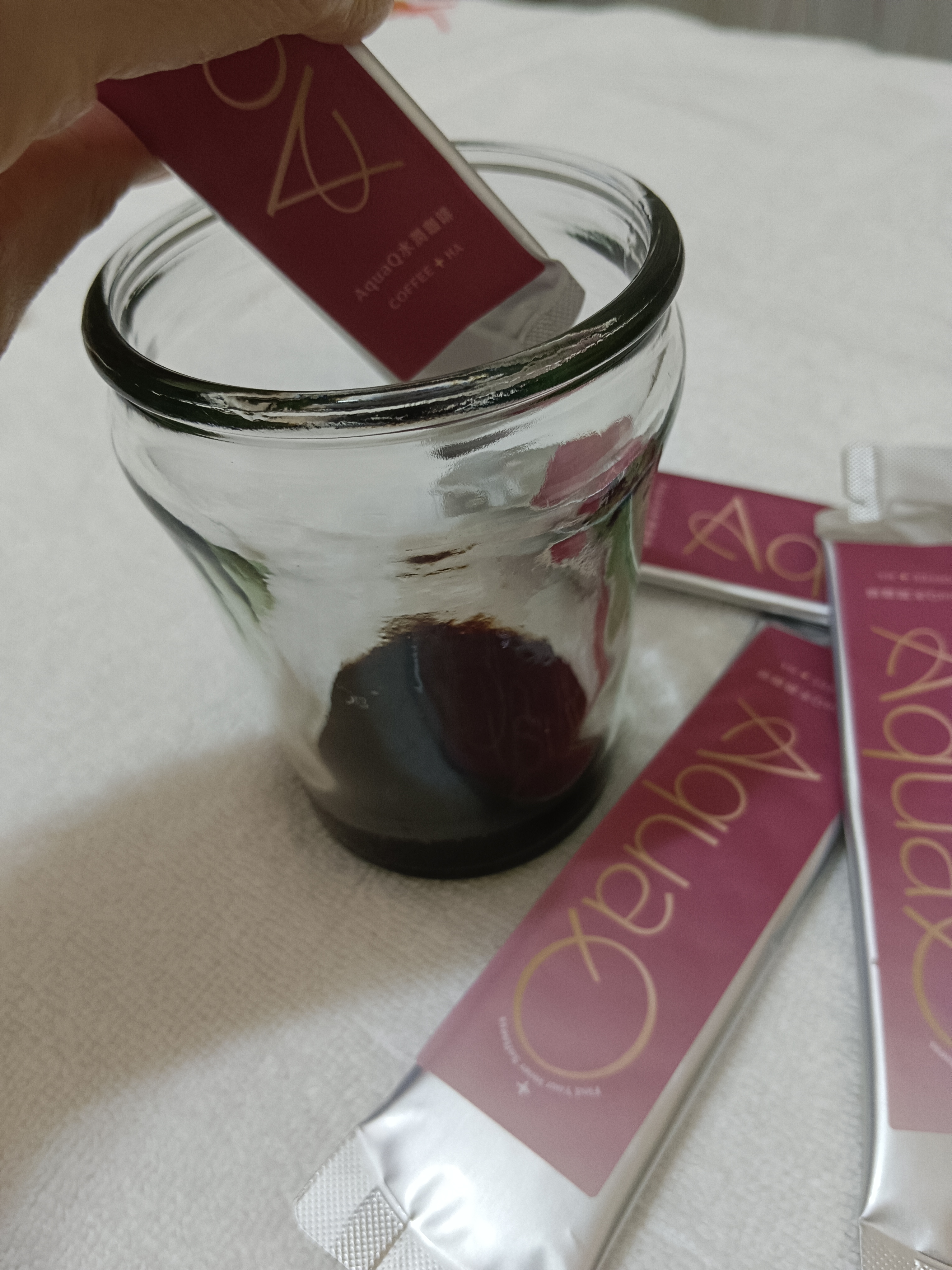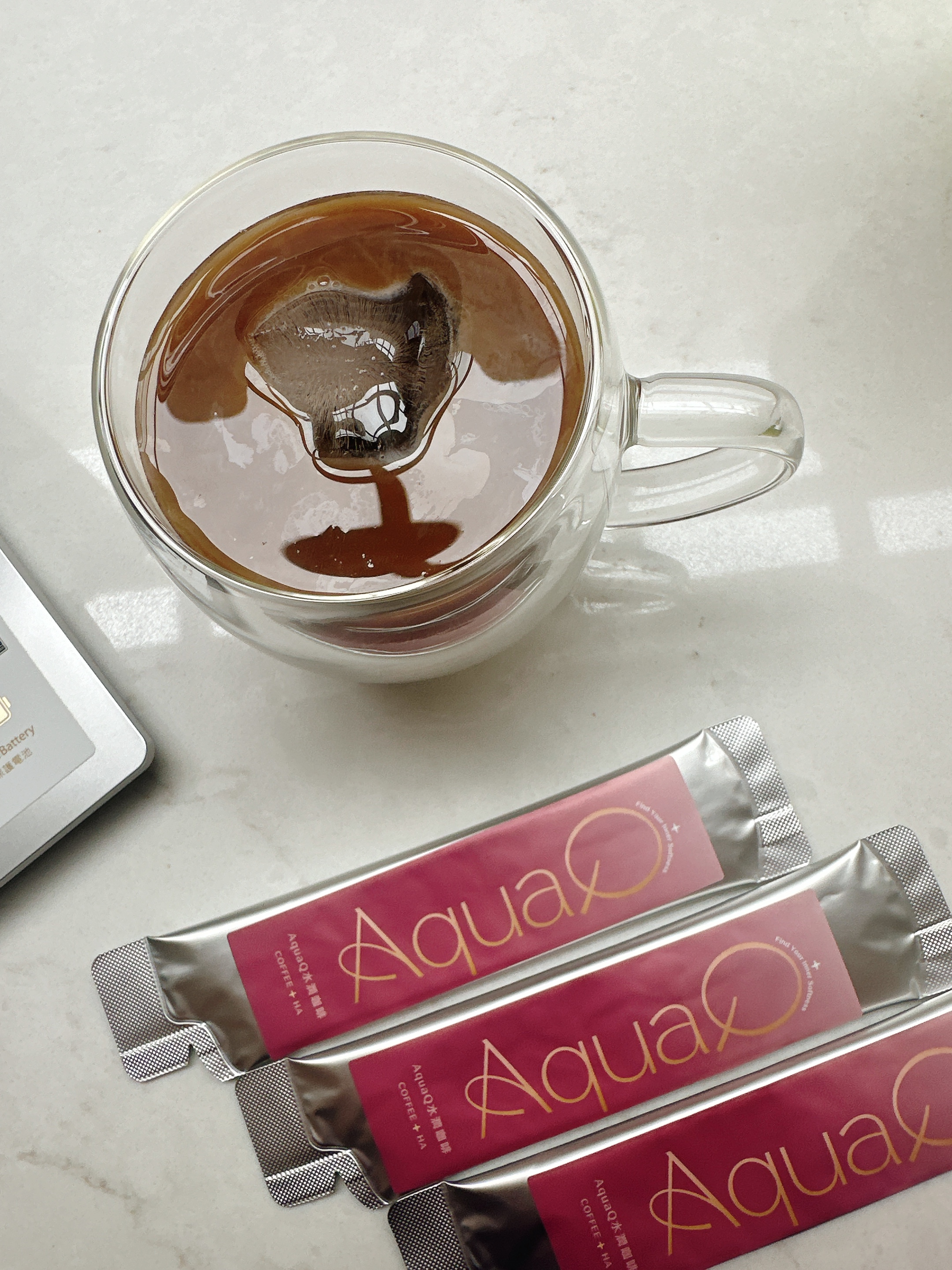 本次體驗AquaQ 水潤咖啡,號稱有添加口服玻尿酸的咖啡,濃度達95%以上。一包約20ml,應該是濃縮的咖啡,因為手邊沒有熱水,我是加冰水做成冰美式,喝起來還滿順口的。目前還沒感覺到玻尿酸的功效,可能要再多喝一陣子吧。