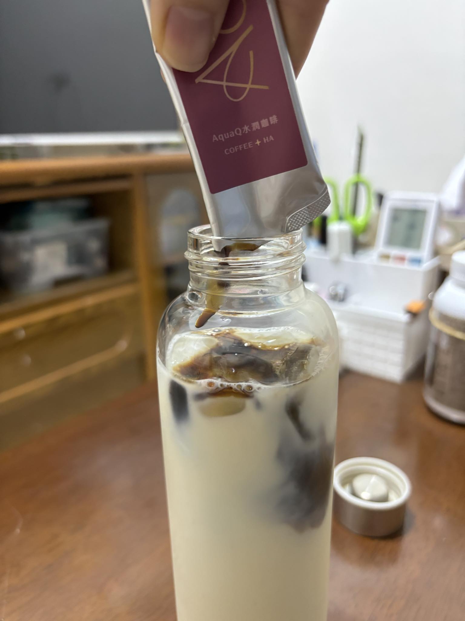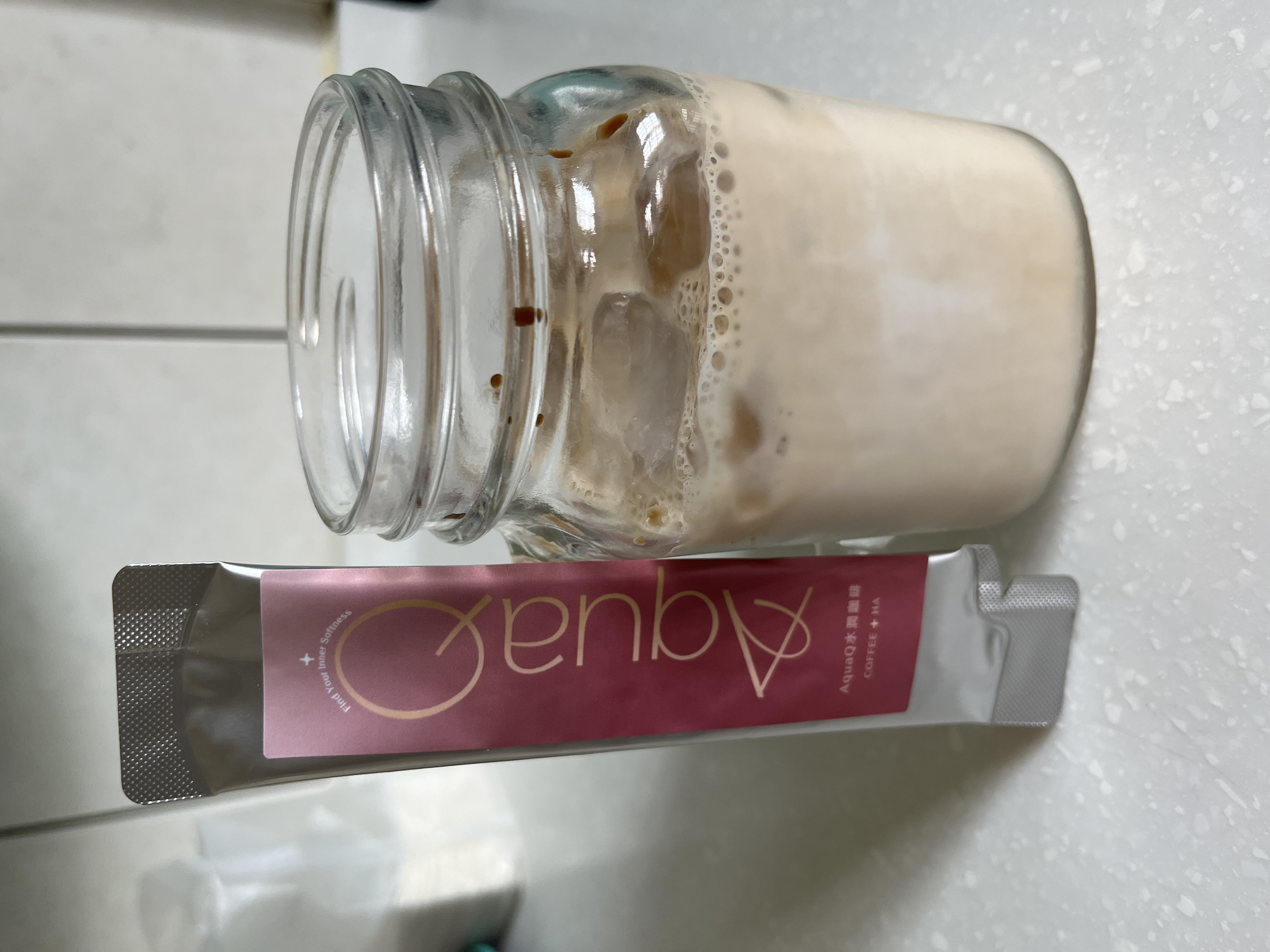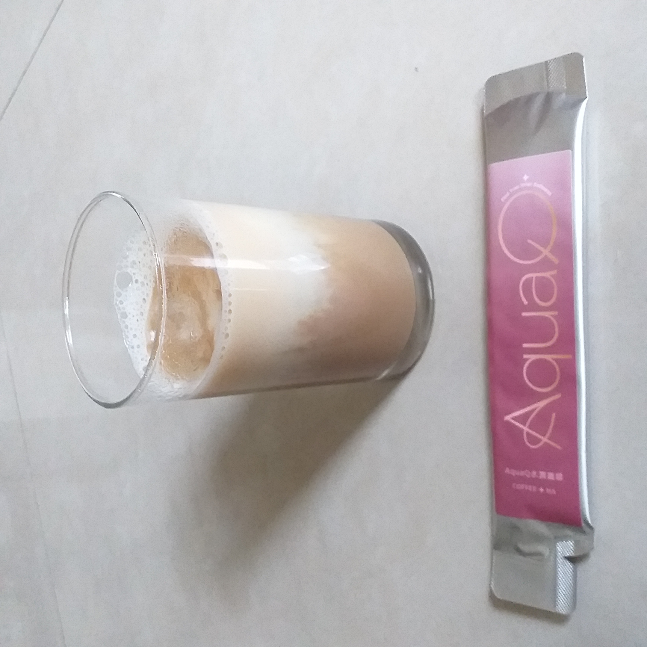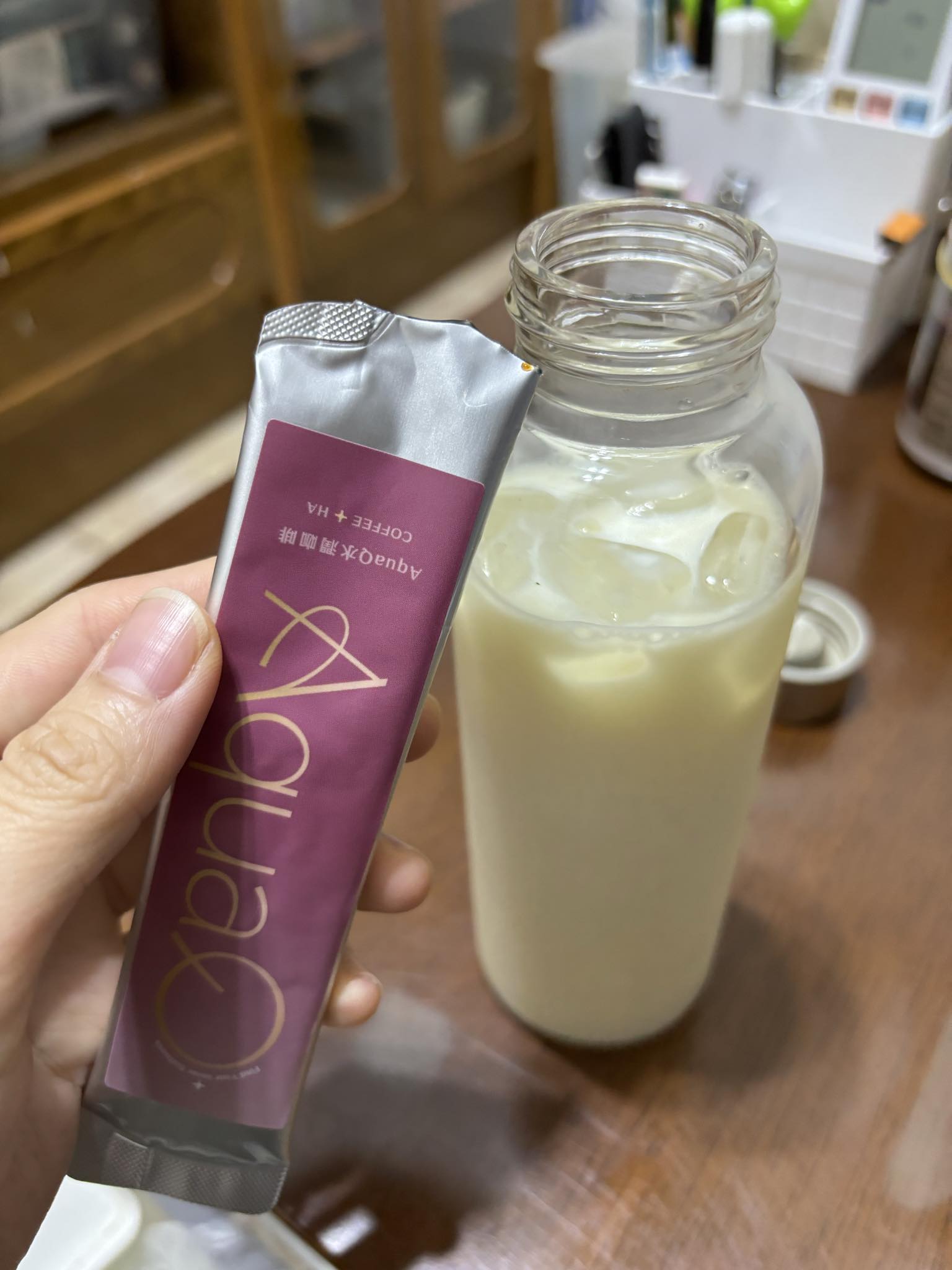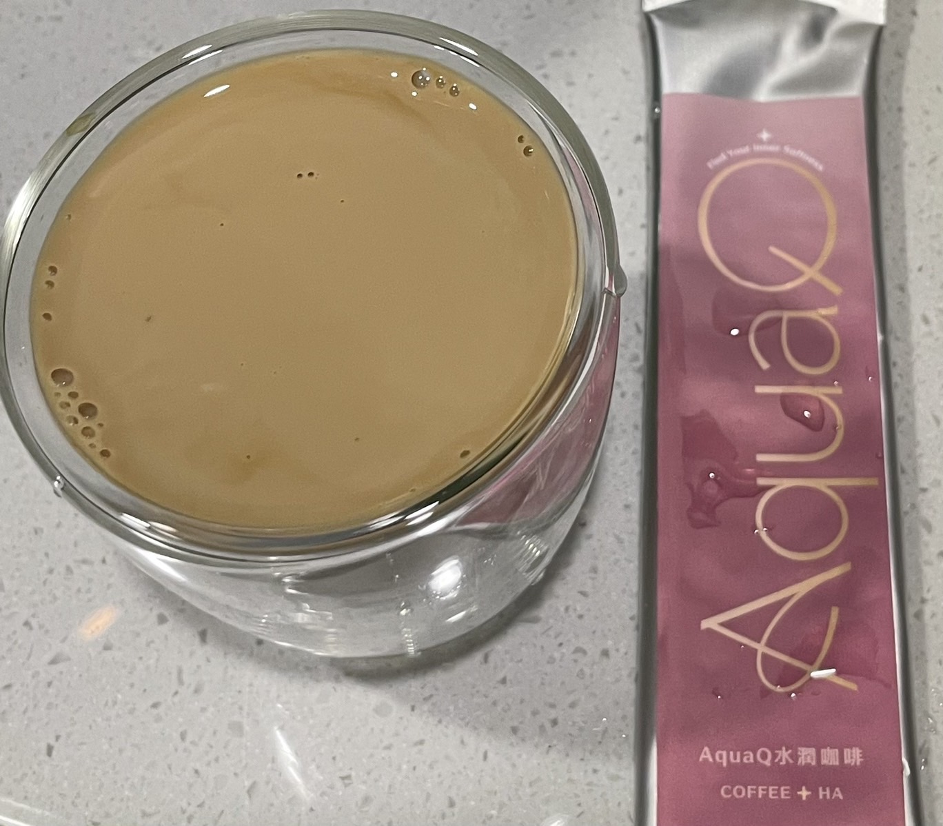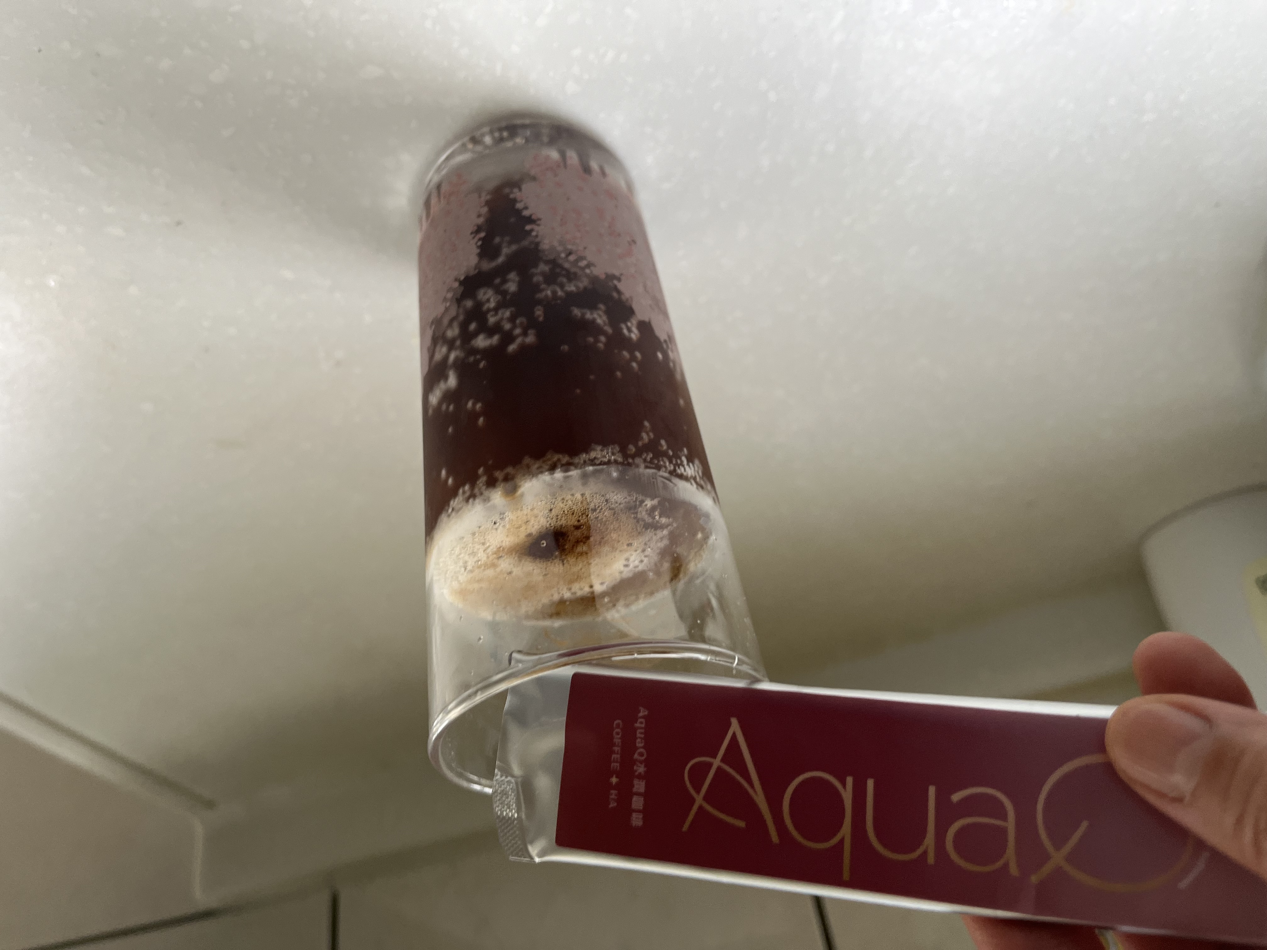 本次體驗AquaQ 水潤咖啡,號稱有添加口服玻尿酸的咖啡,濃度達95%以上。一包約20ml,應該是濃縮的咖啡,因為手邊沒有熱水,我是加冰水做成冰美式,喝起來還滿順口的。目前還沒感覺到玻尿酸的功效,可能要再多喝一陣子吧。