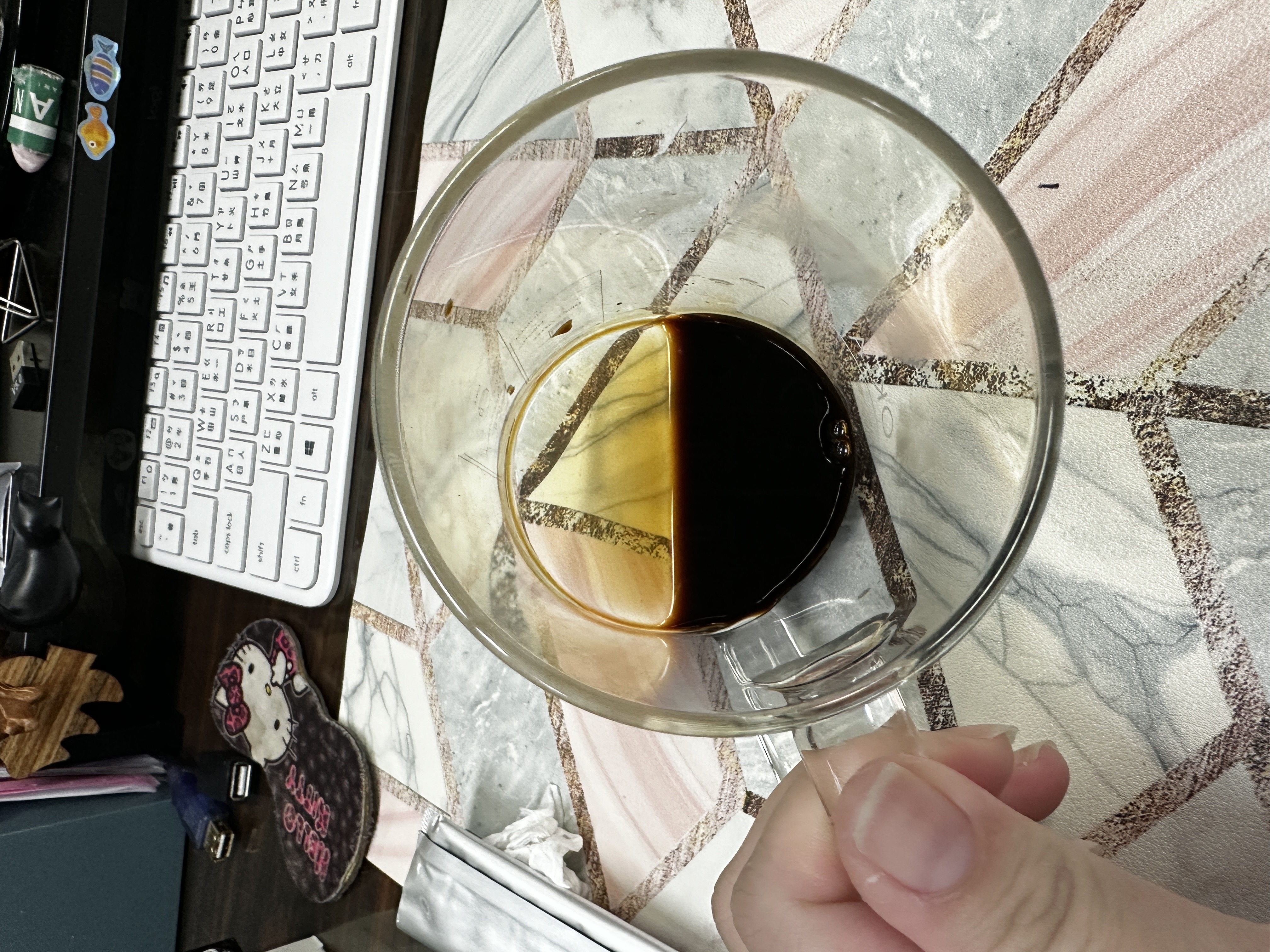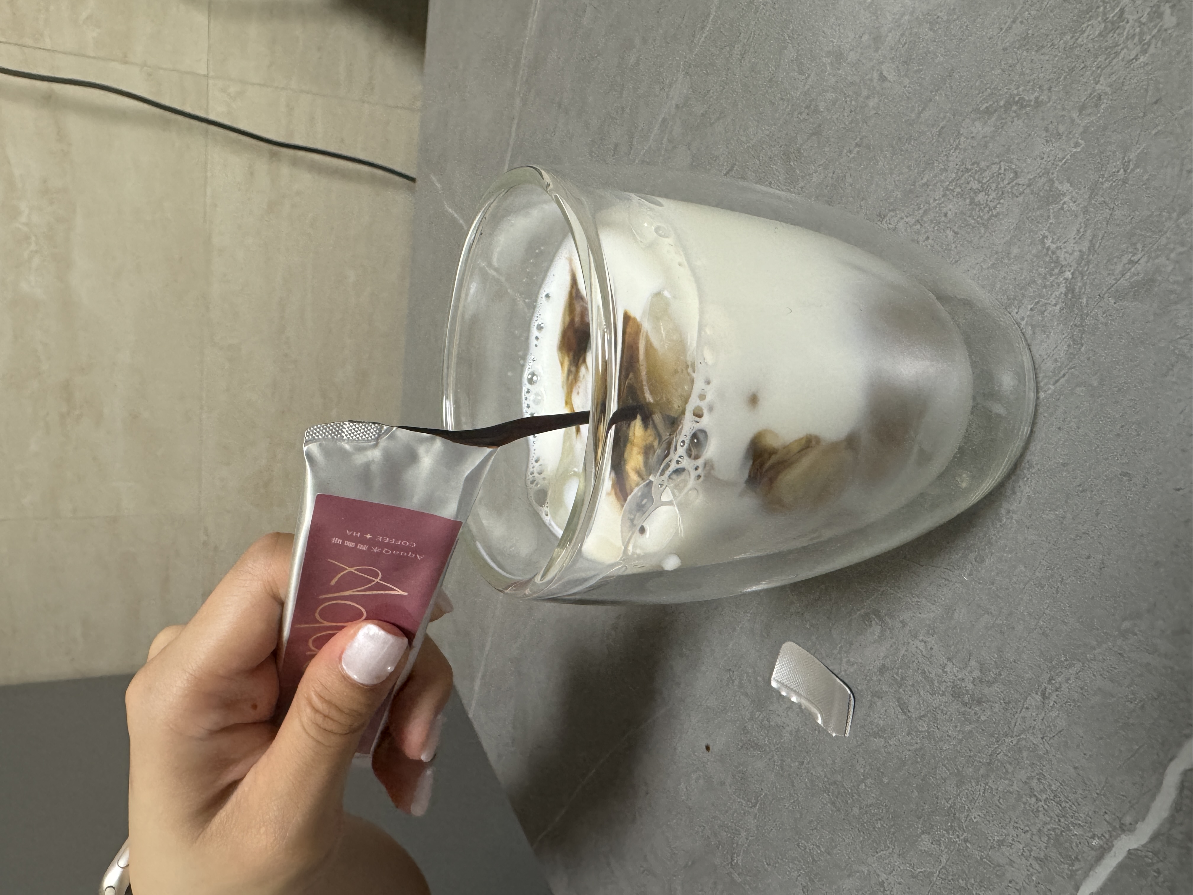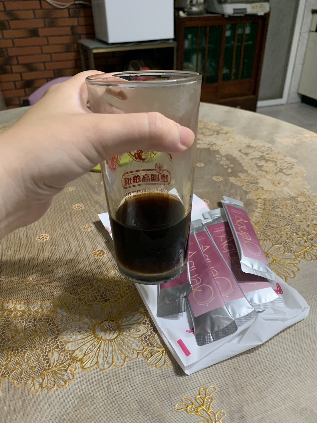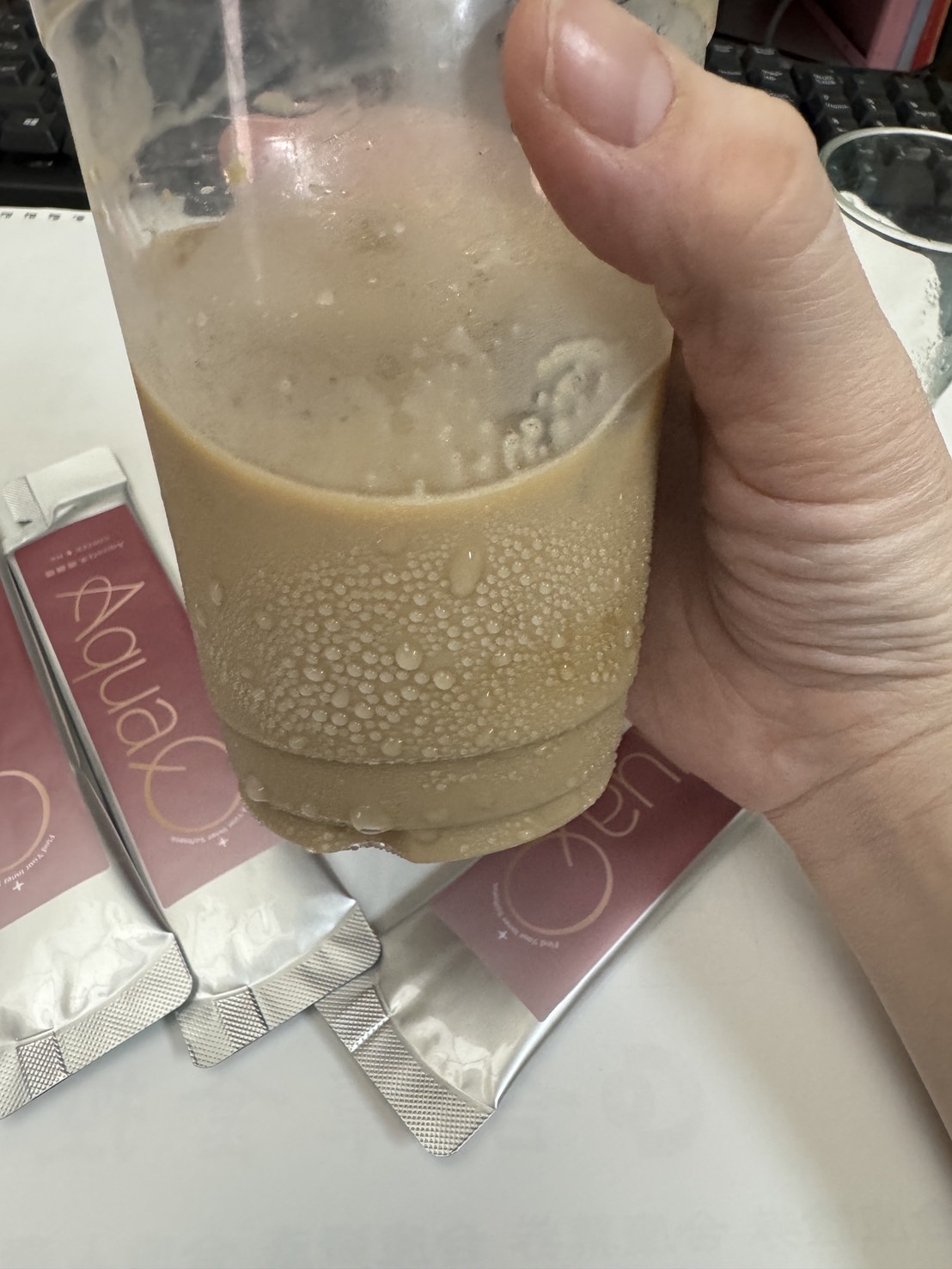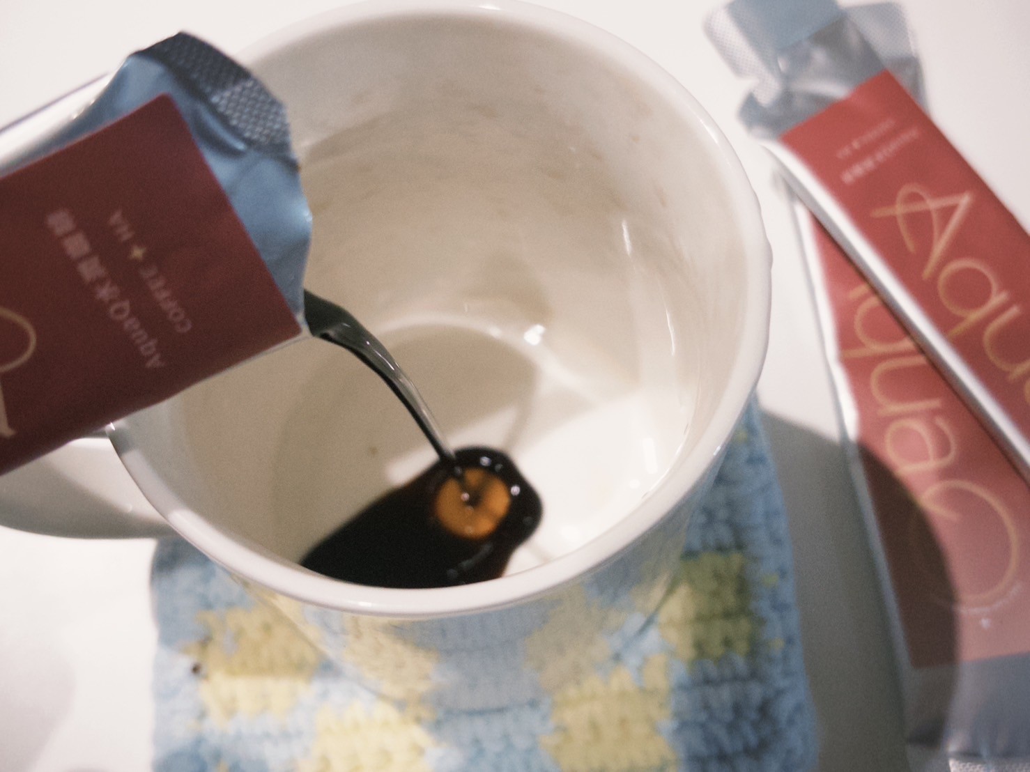 本次體驗AquaQ 水潤咖啡,號稱有添加口服玻尿酸的咖啡,濃度達95%以上。一包約20ml,應該是濃縮的咖啡,因為手邊沒有熱水,我是加冰水做成冰美式,喝起來還滿順口的。目前還沒感覺到玻尿酸的功效,可能要再多喝一陣子吧。