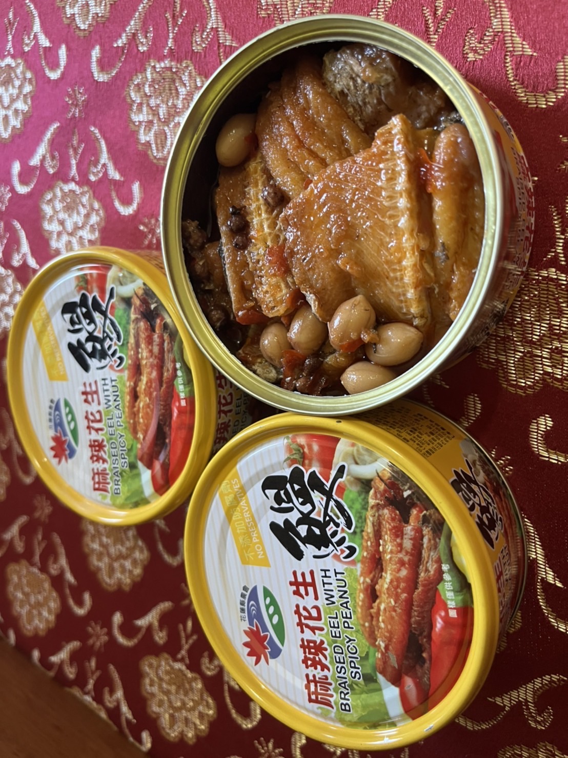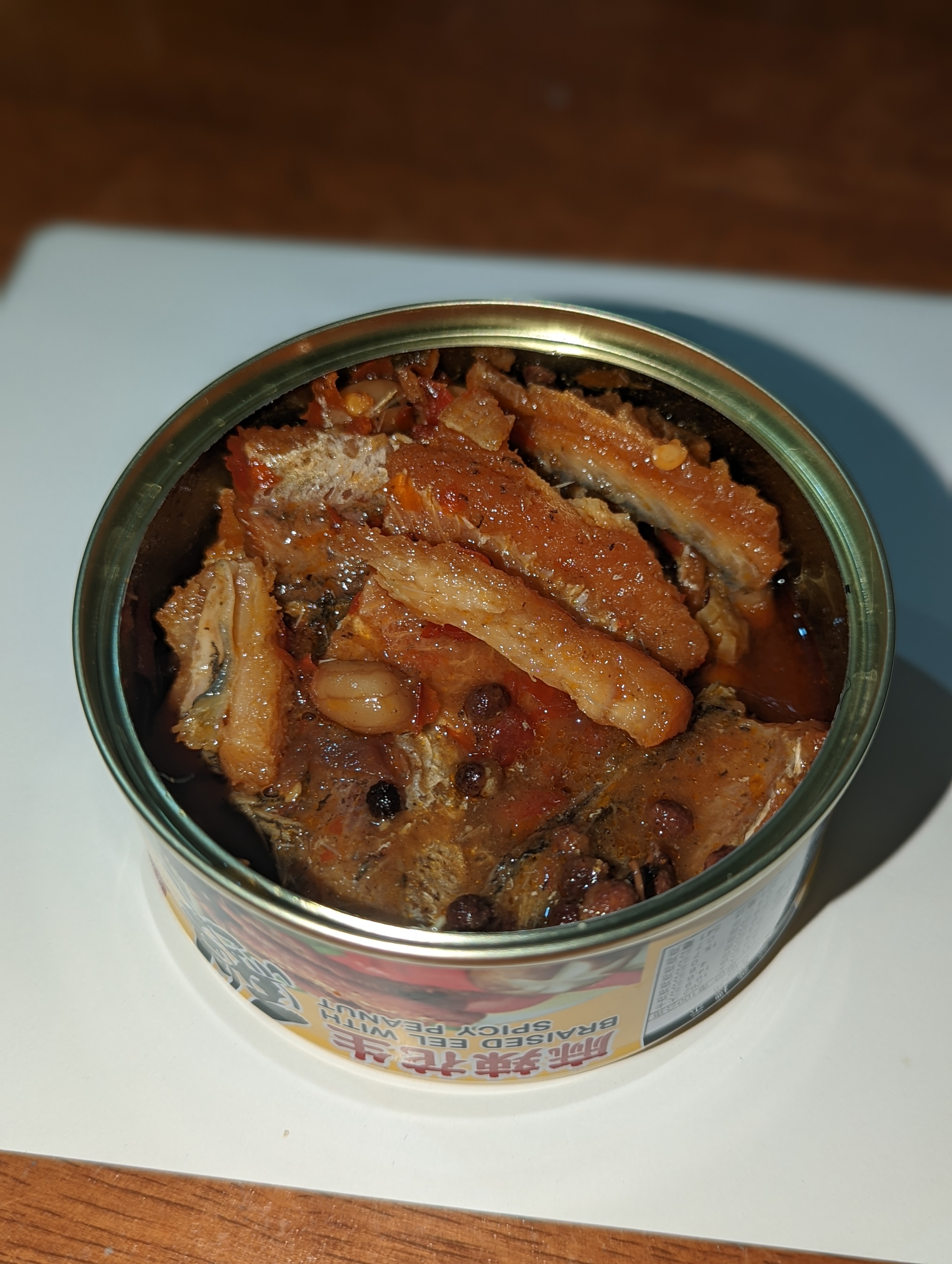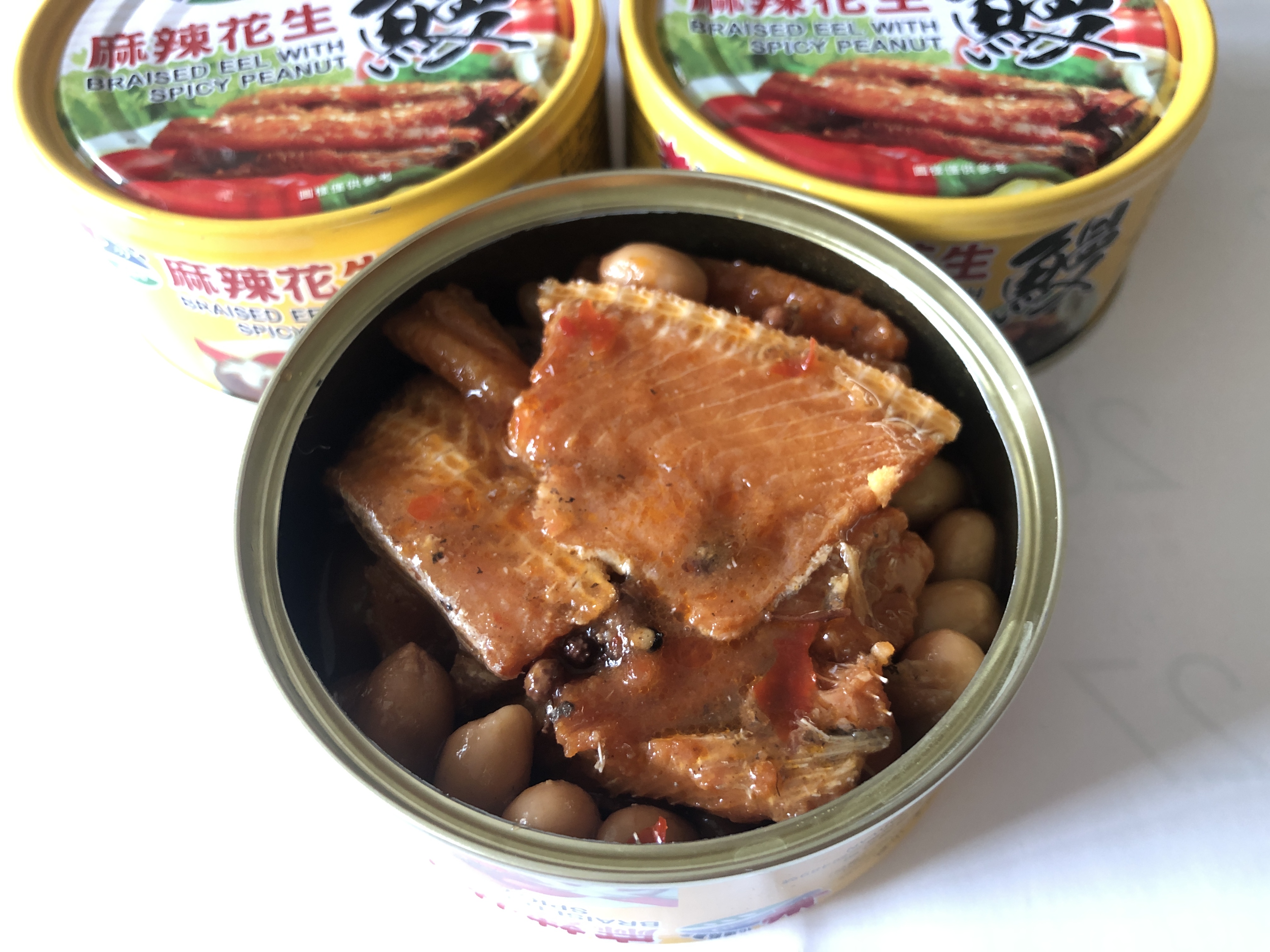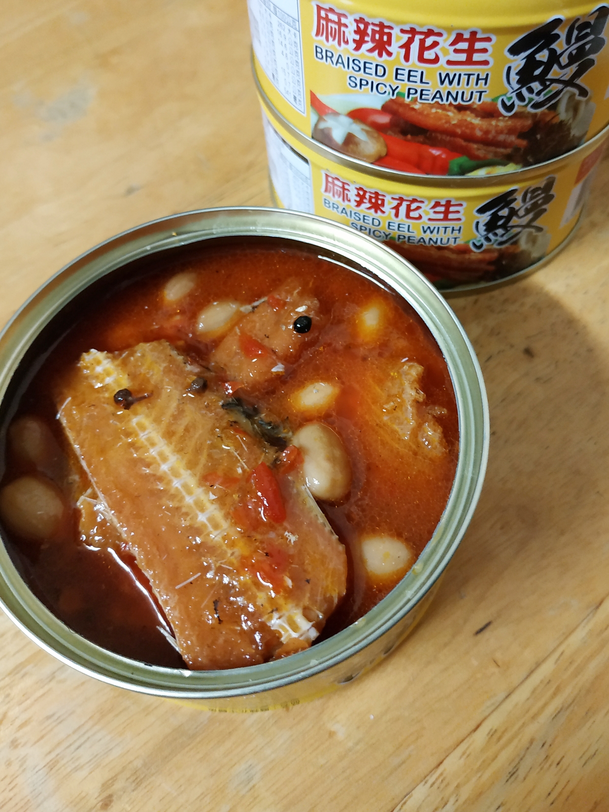 一開罐頭就看到滿滿的鰻魚跟花生,也可以看到花椒粒、辣椒、辣椒籽,很真材實料,鰻魚也都挺完整的