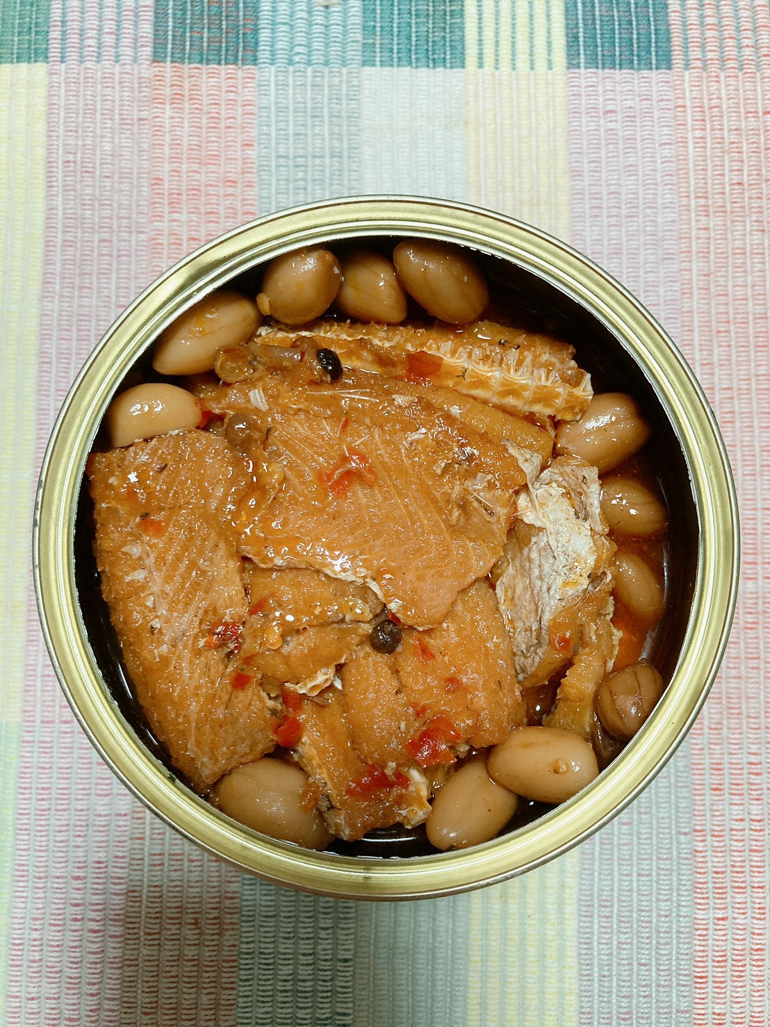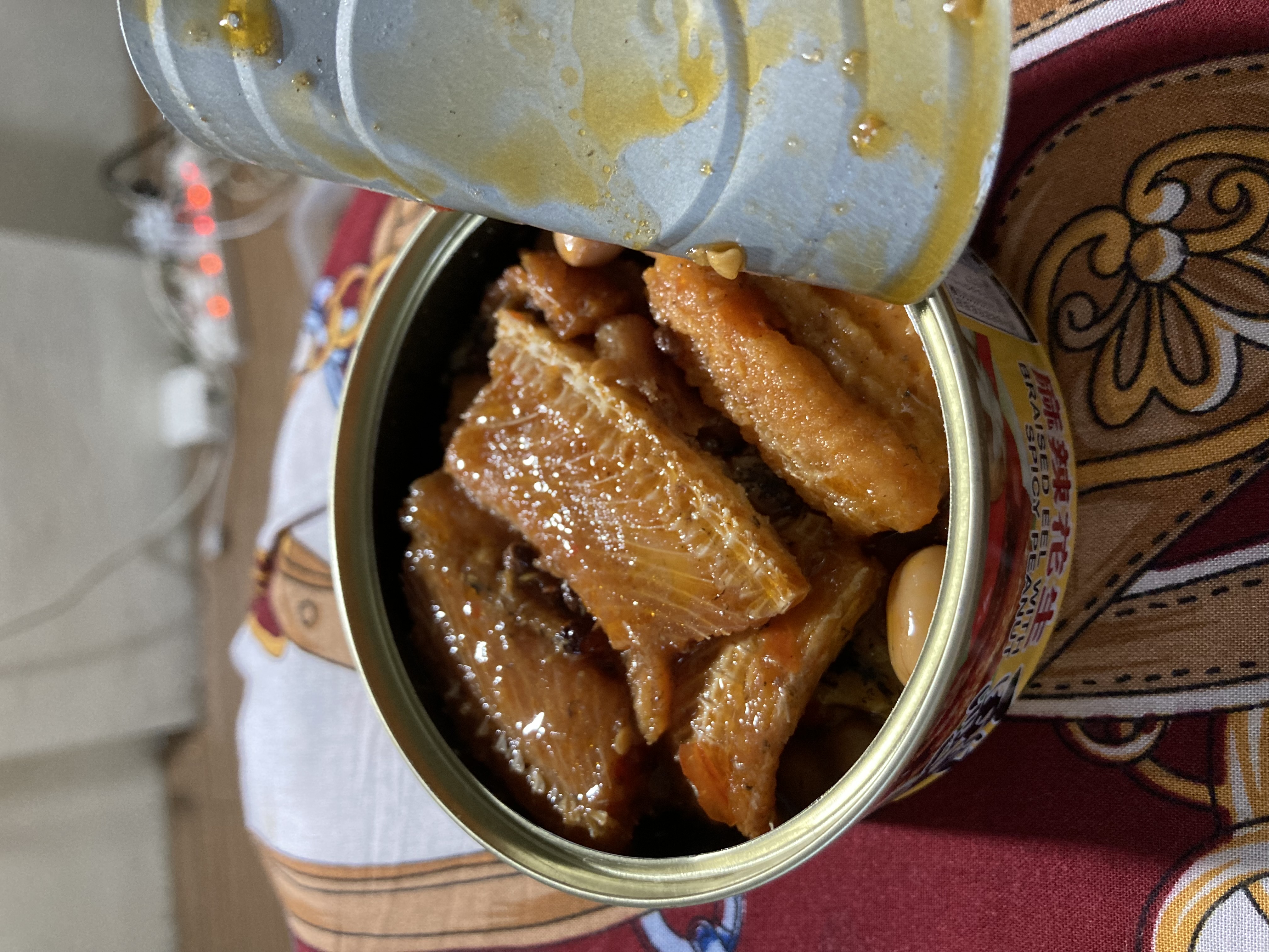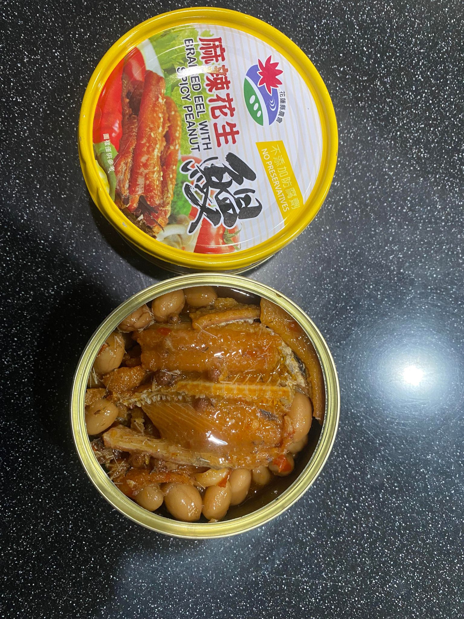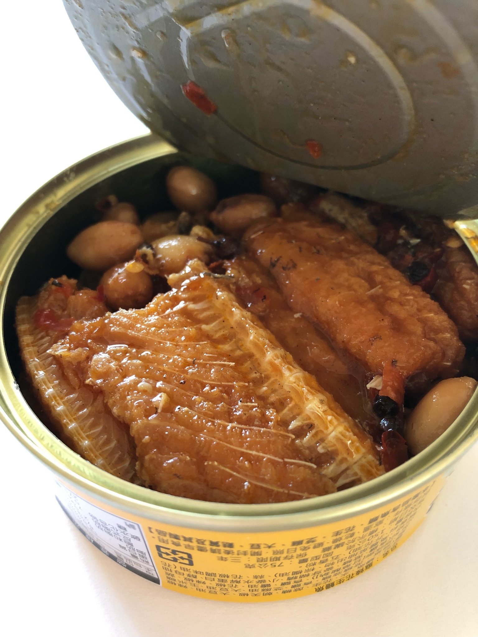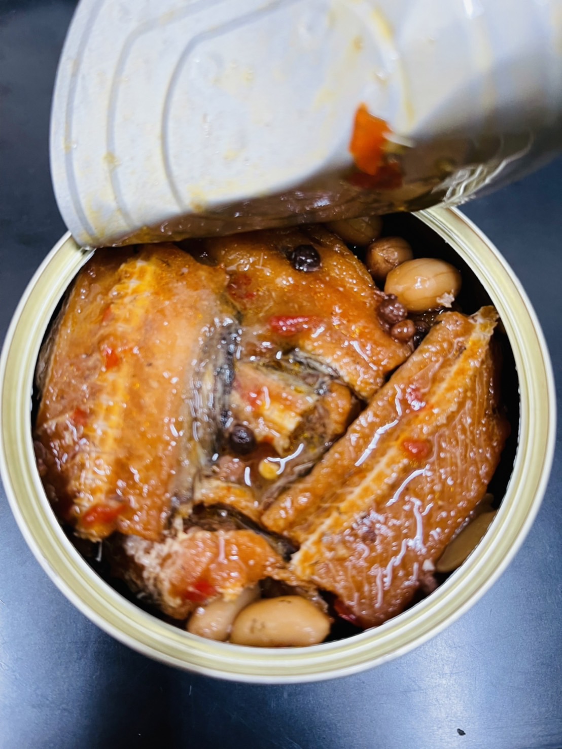 一開罐頭就看到滿滿的鰻魚跟花生,也可以看到花椒粒、辣椒、辣椒籽,很真材實料,鰻魚也都挺完整的