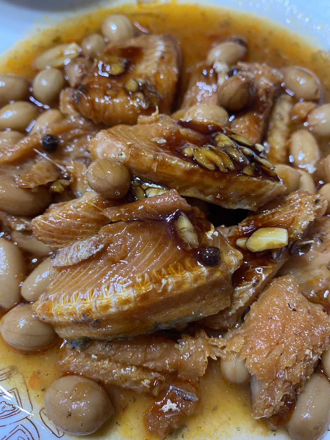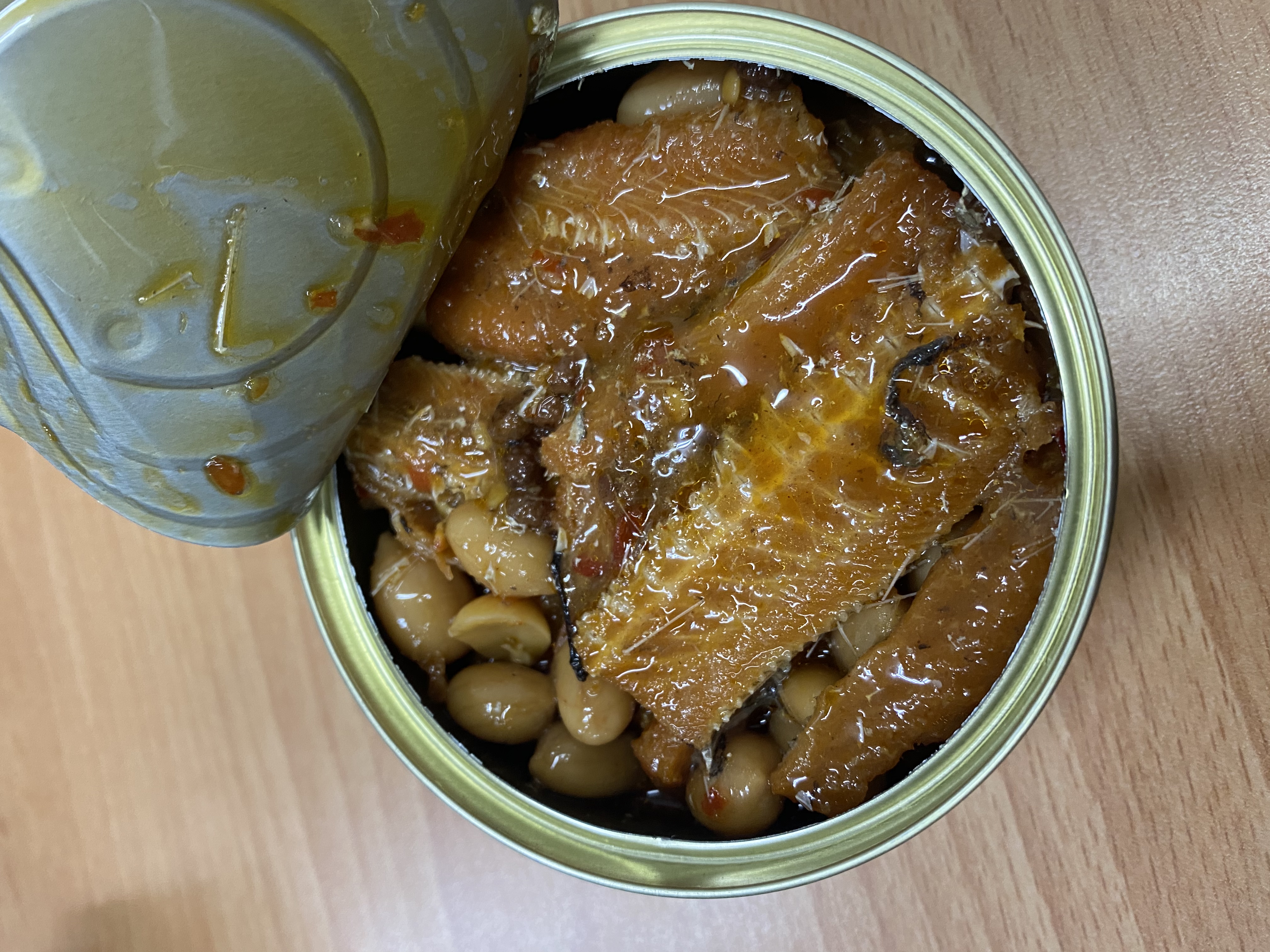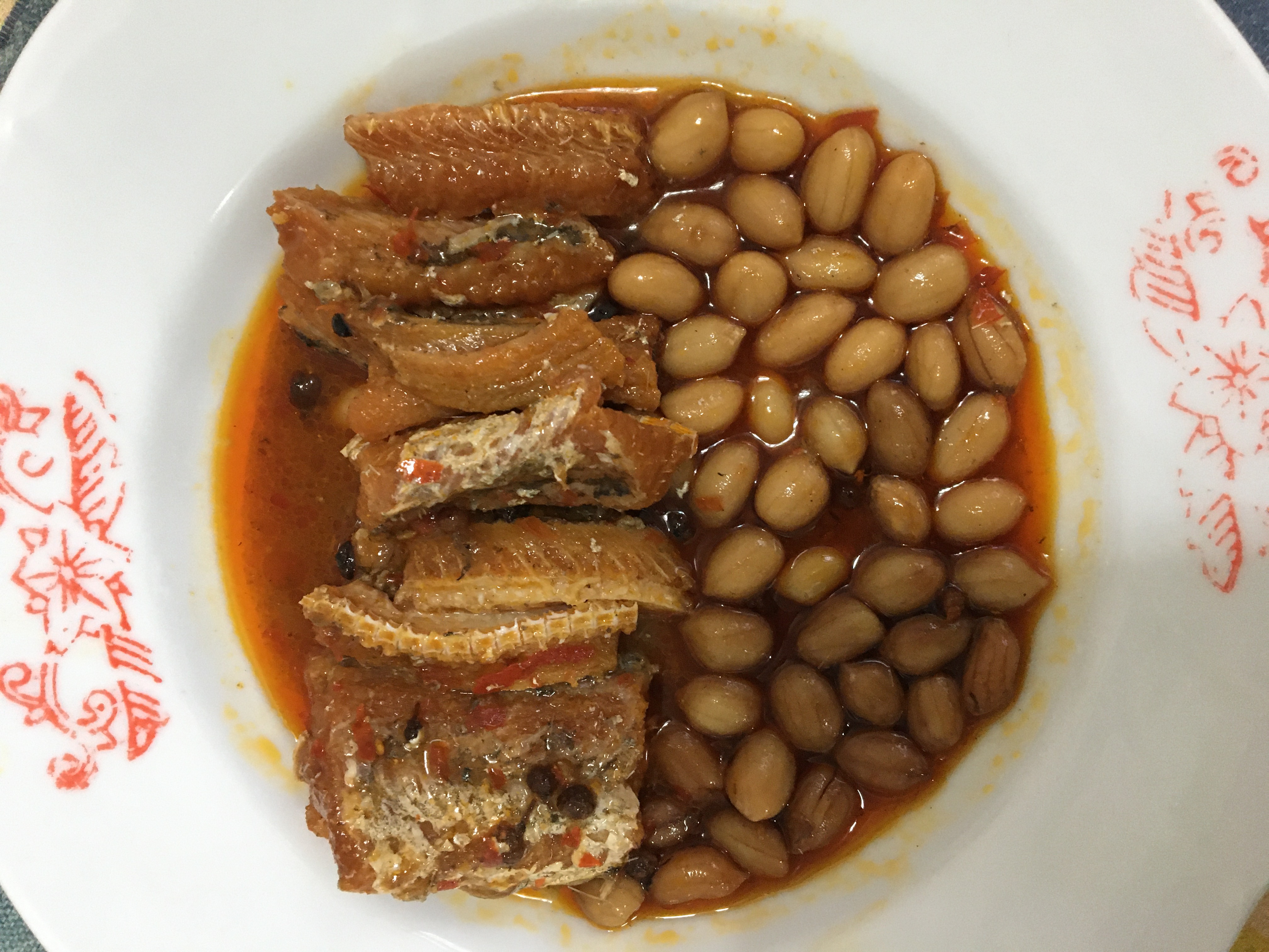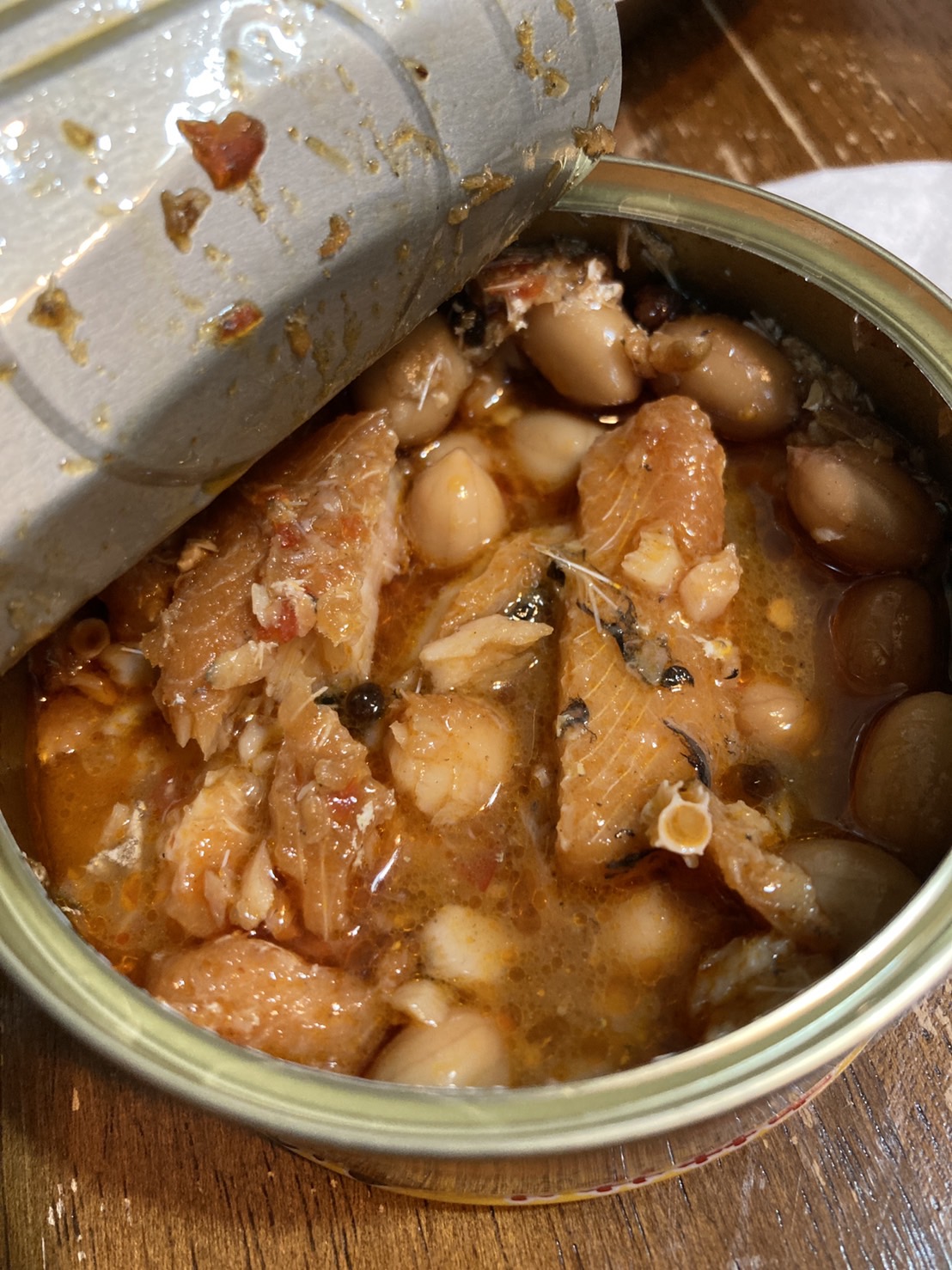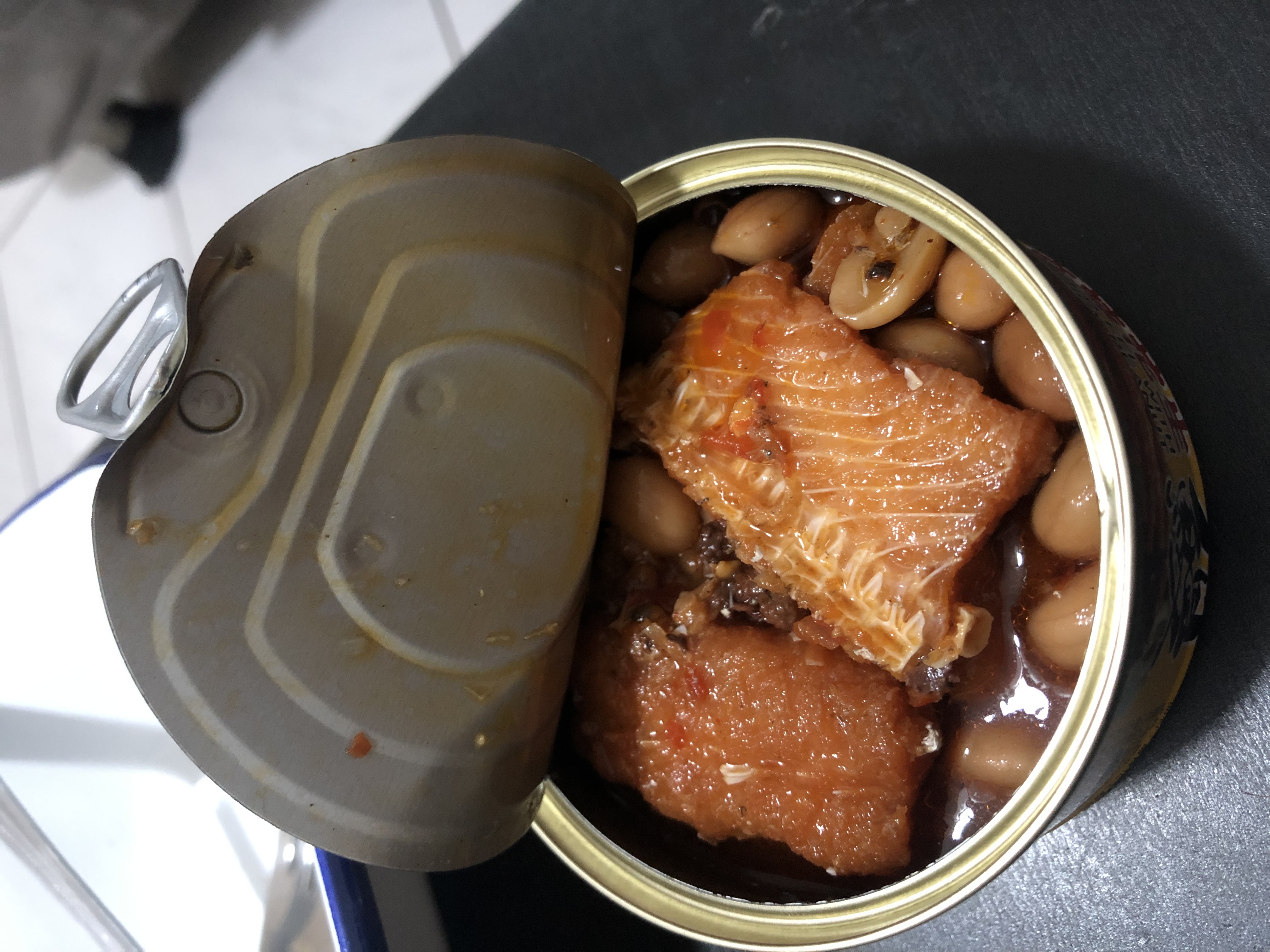 一開罐頭就看到滿滿的鰻魚跟花生,也可以看到花椒粒、辣椒、辣椒籽,很真材實料,鰻魚也都挺完整的