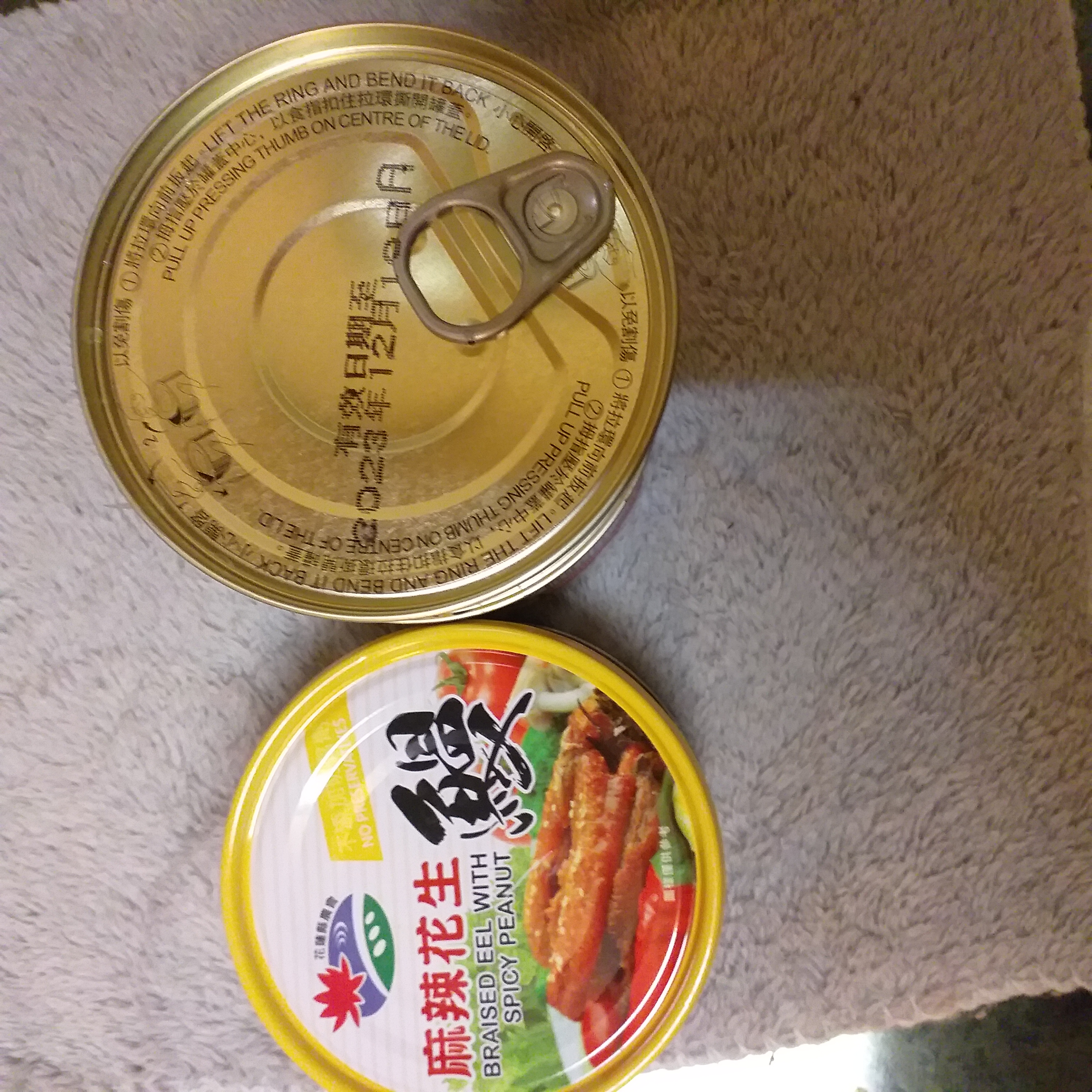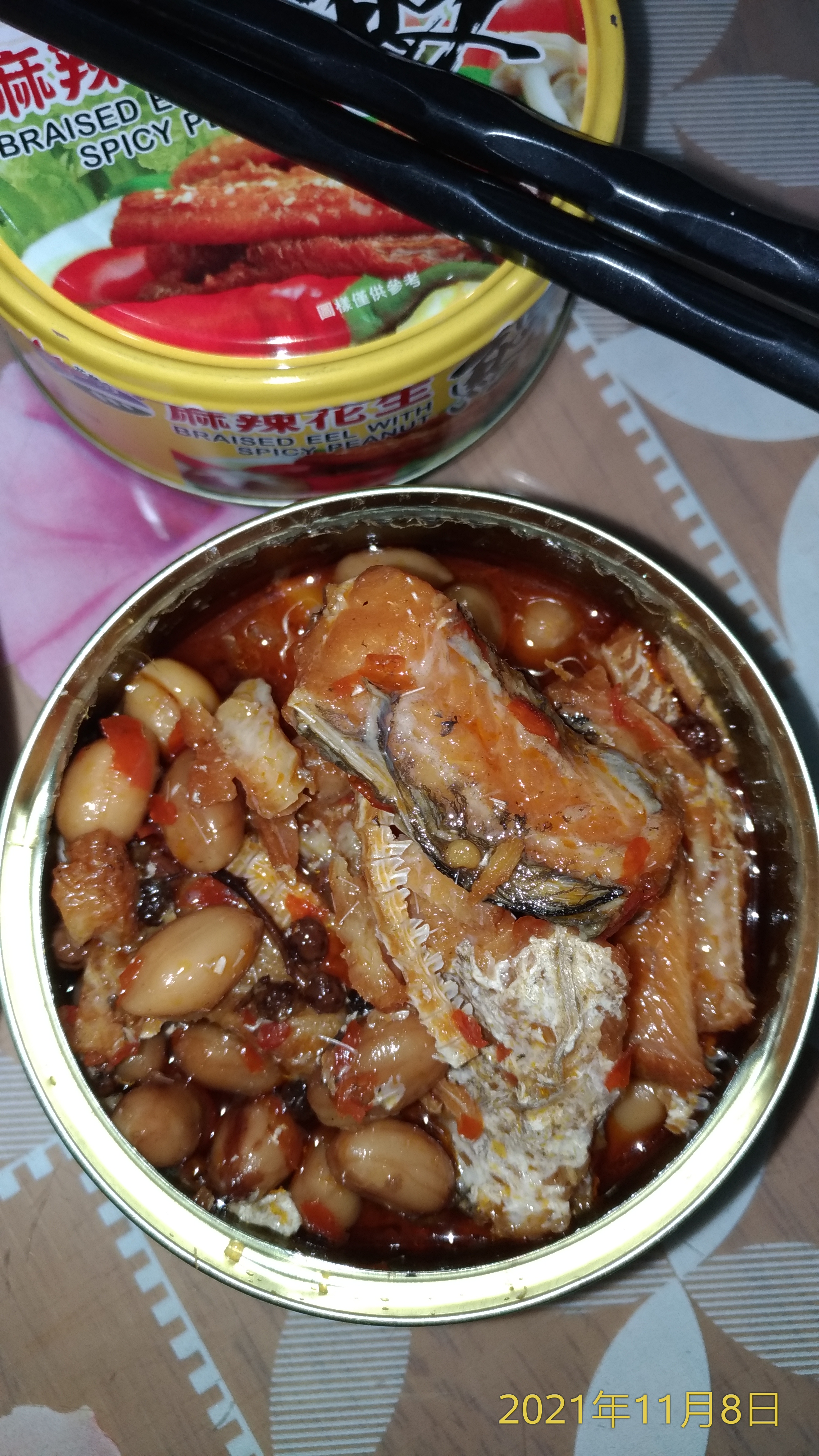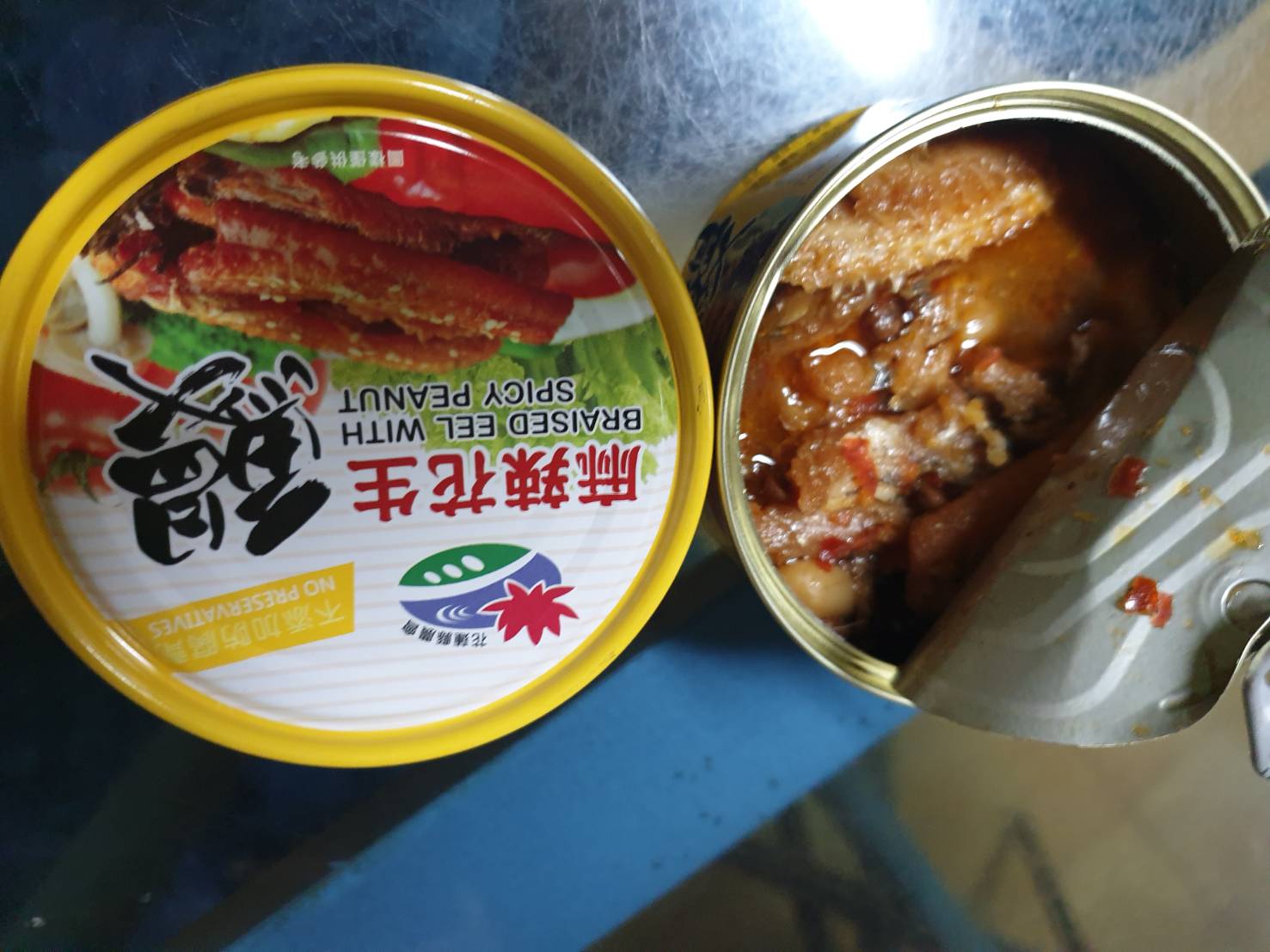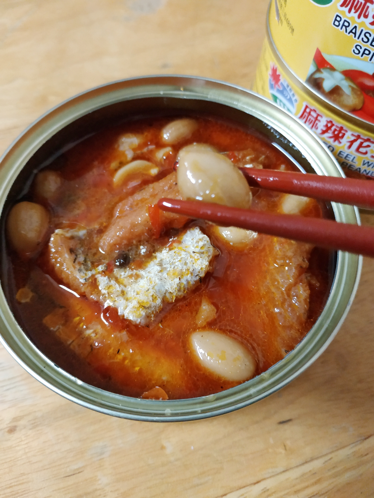 今天下午一收到麻辣花生鰻魚罐頭,馬上耒試吃,一打開鐵蓋就聞到一股麻辣香味。