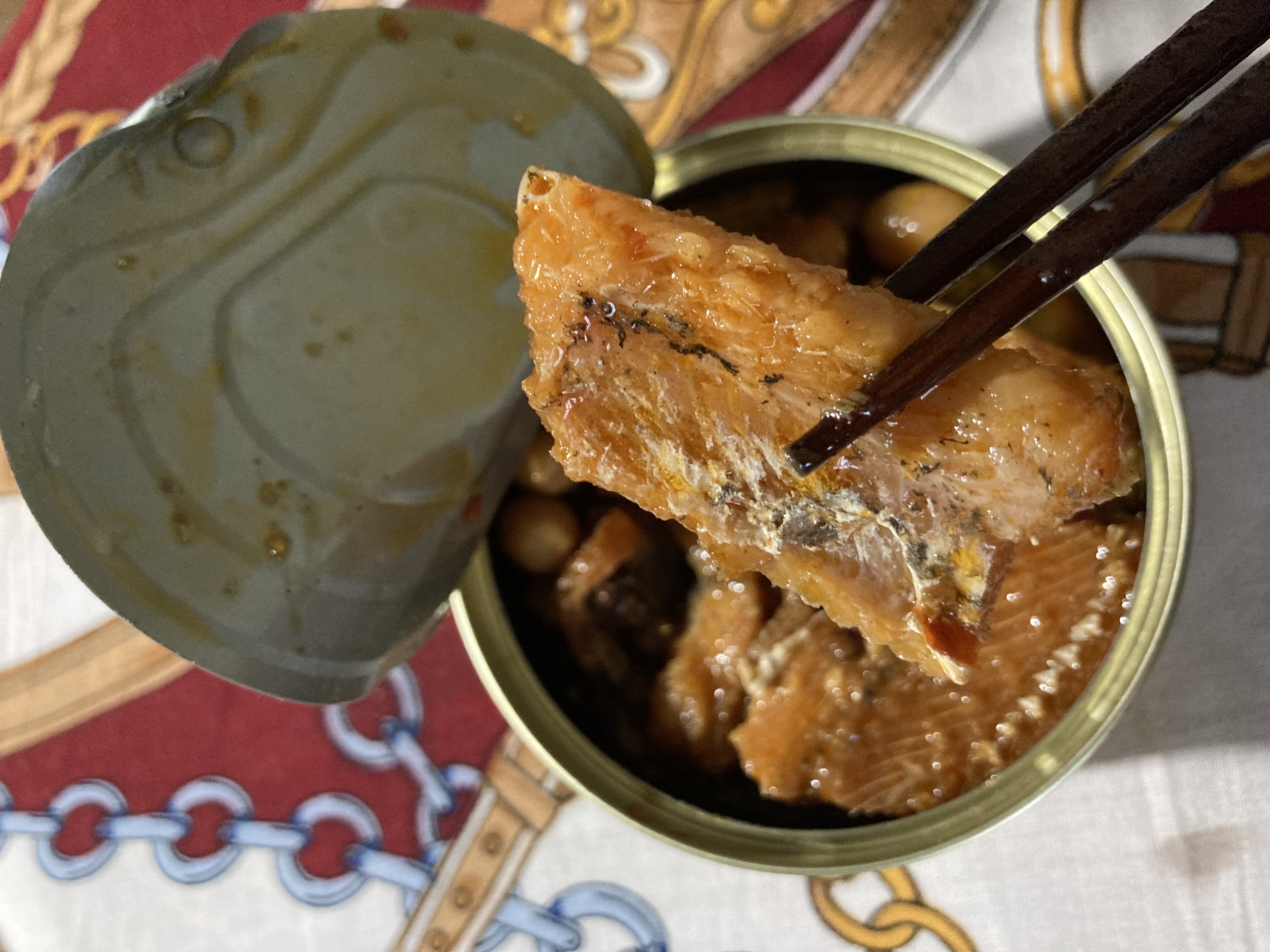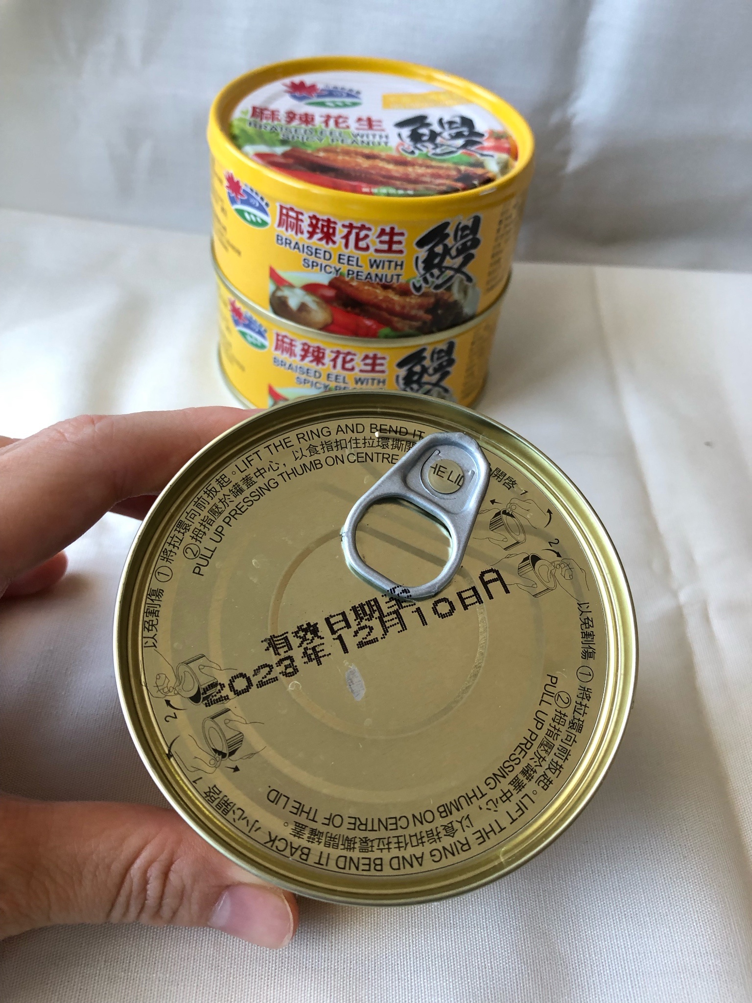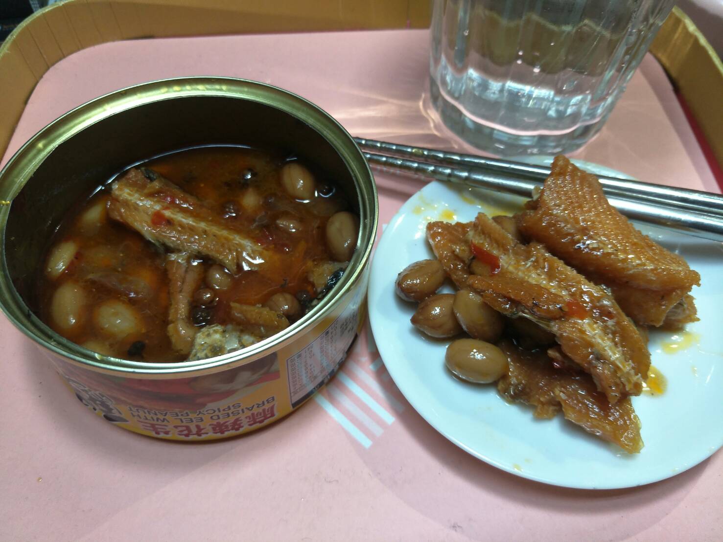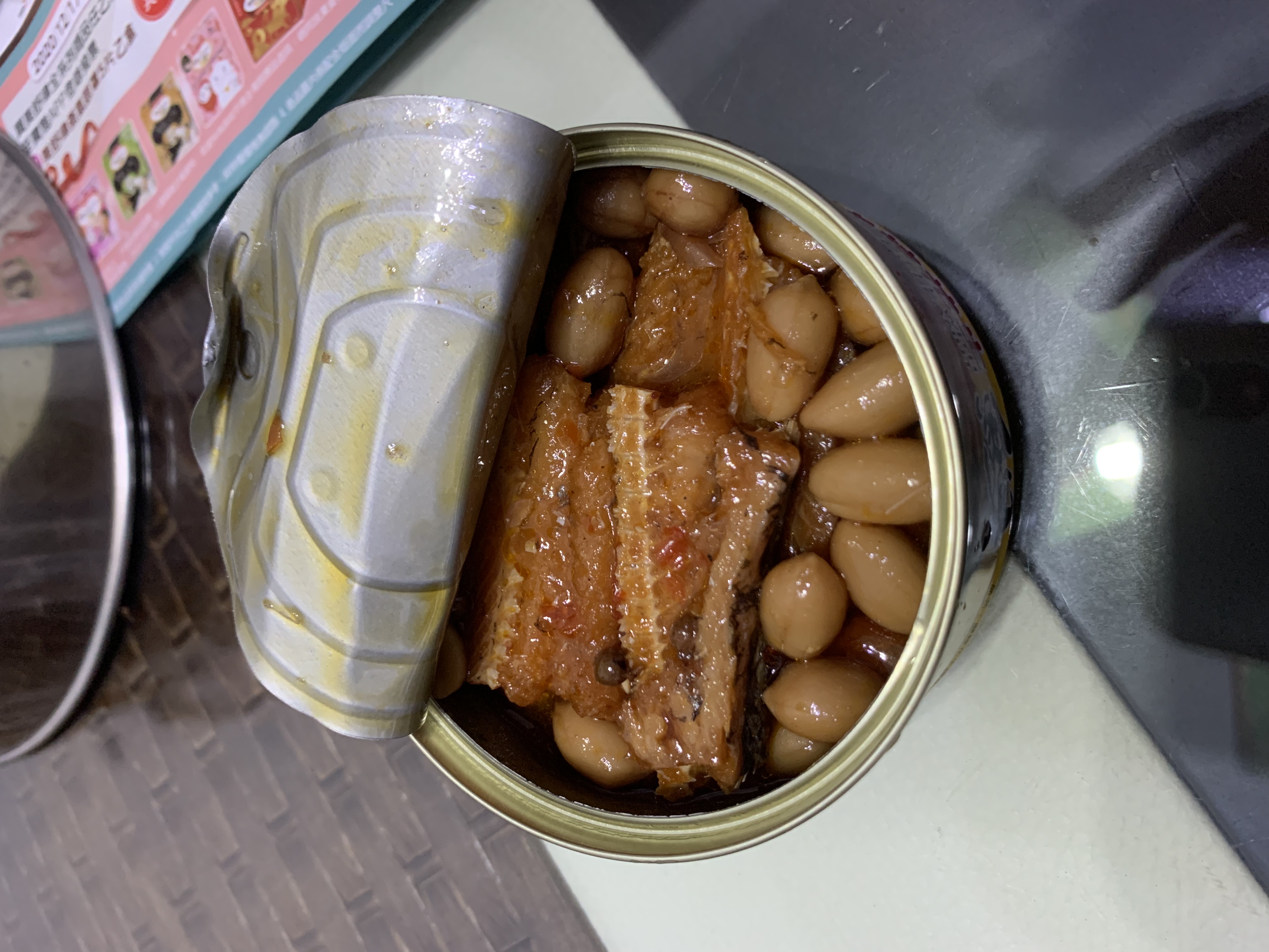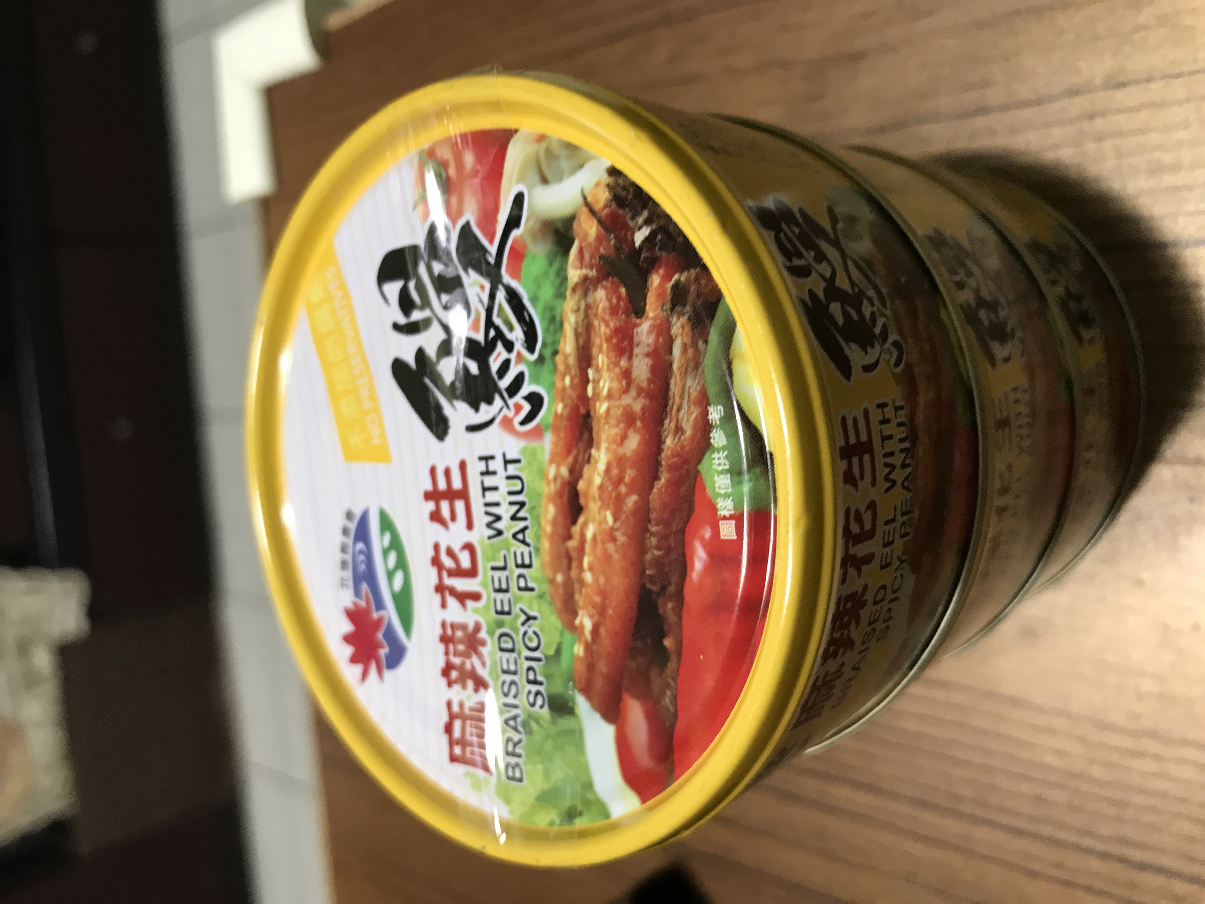 今天下午一收到麻辣花生鰻魚罐頭,馬上耒試吃,一打開鐵蓋就聞到一股麻辣香味。