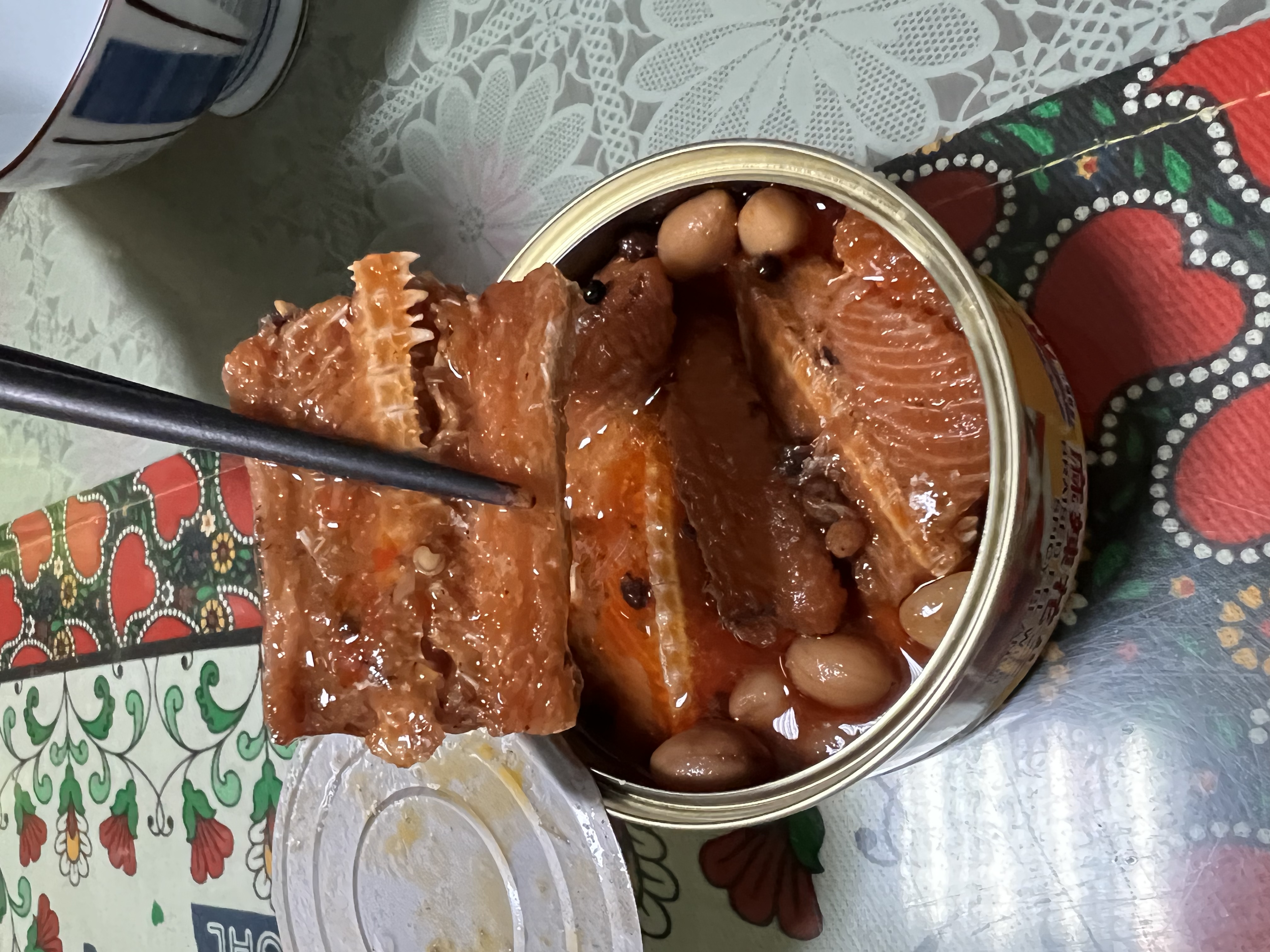 原本以為打開罐頭花生的數量會比鰻魚多,沒想到內容物滿滿的鰻魚,鰻魚本身甜甜的加上類似四川的麻辣,滿涮嘴的,裡面甚至看的到真實的花椒粒,真材實料,另外花生口感也不錯,鬆軟但不爛,而且顆粒也算滿大顆的。一次打開兩罐可以當作一樣主菜來請客沒有問題。雖然說是麻辣但其實算是甜甜辣辣的,辣度普通人大概都可以接受。