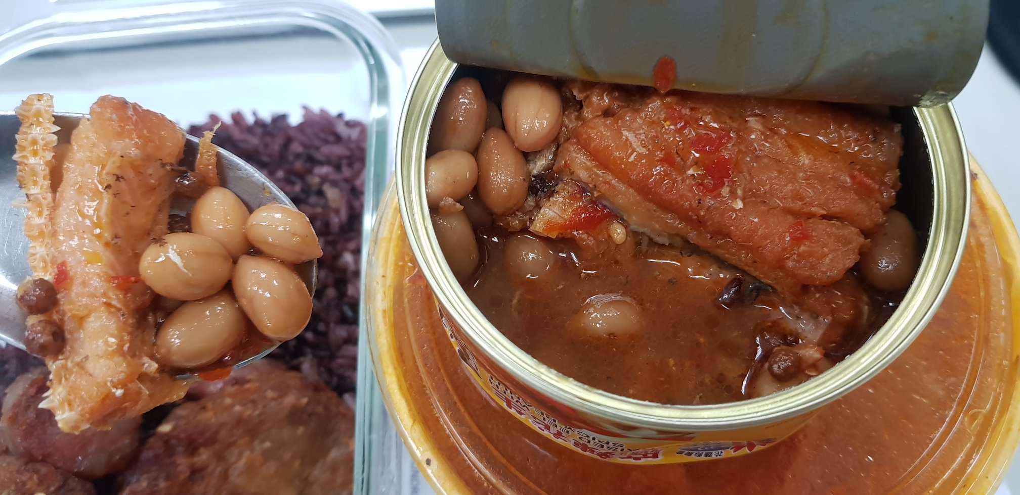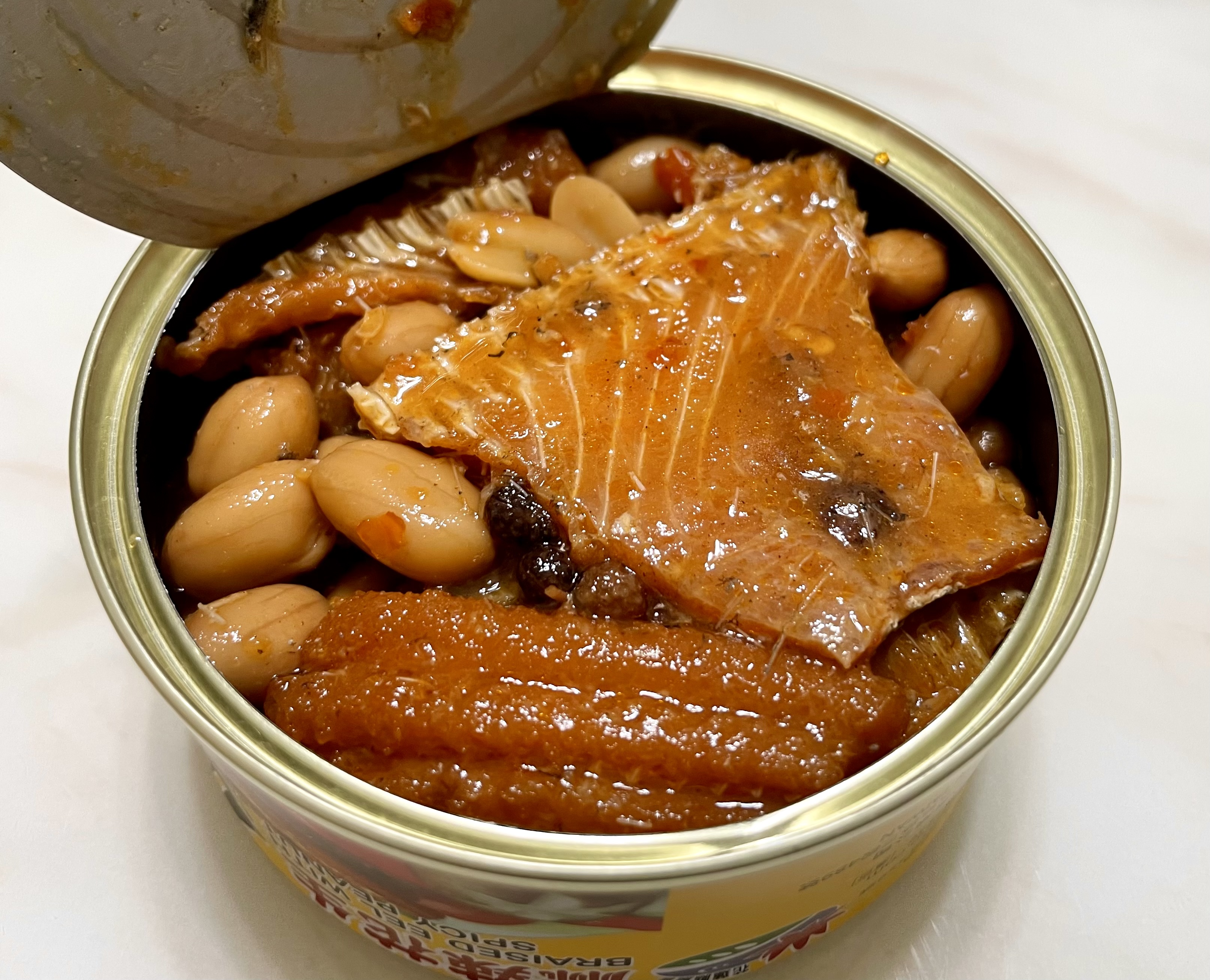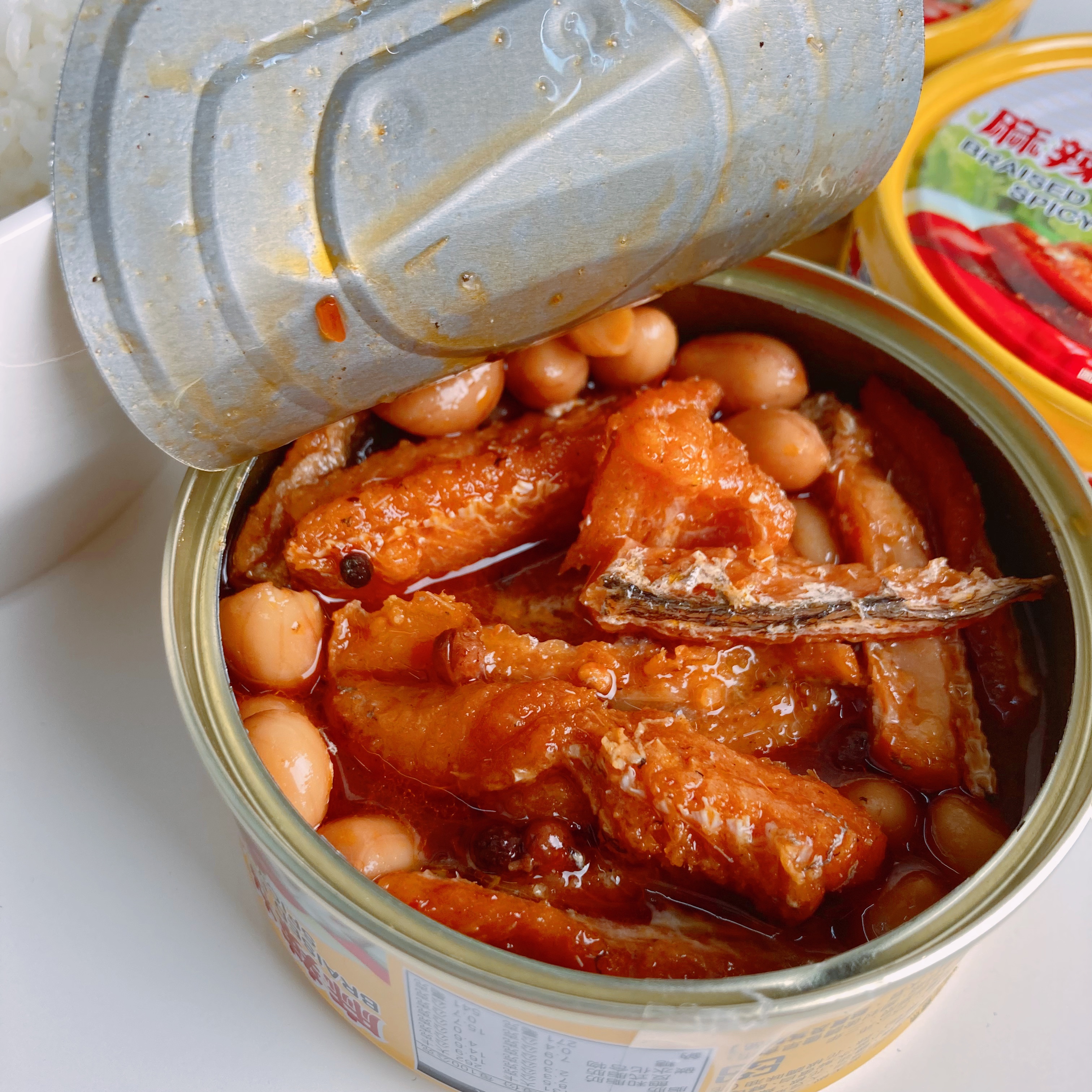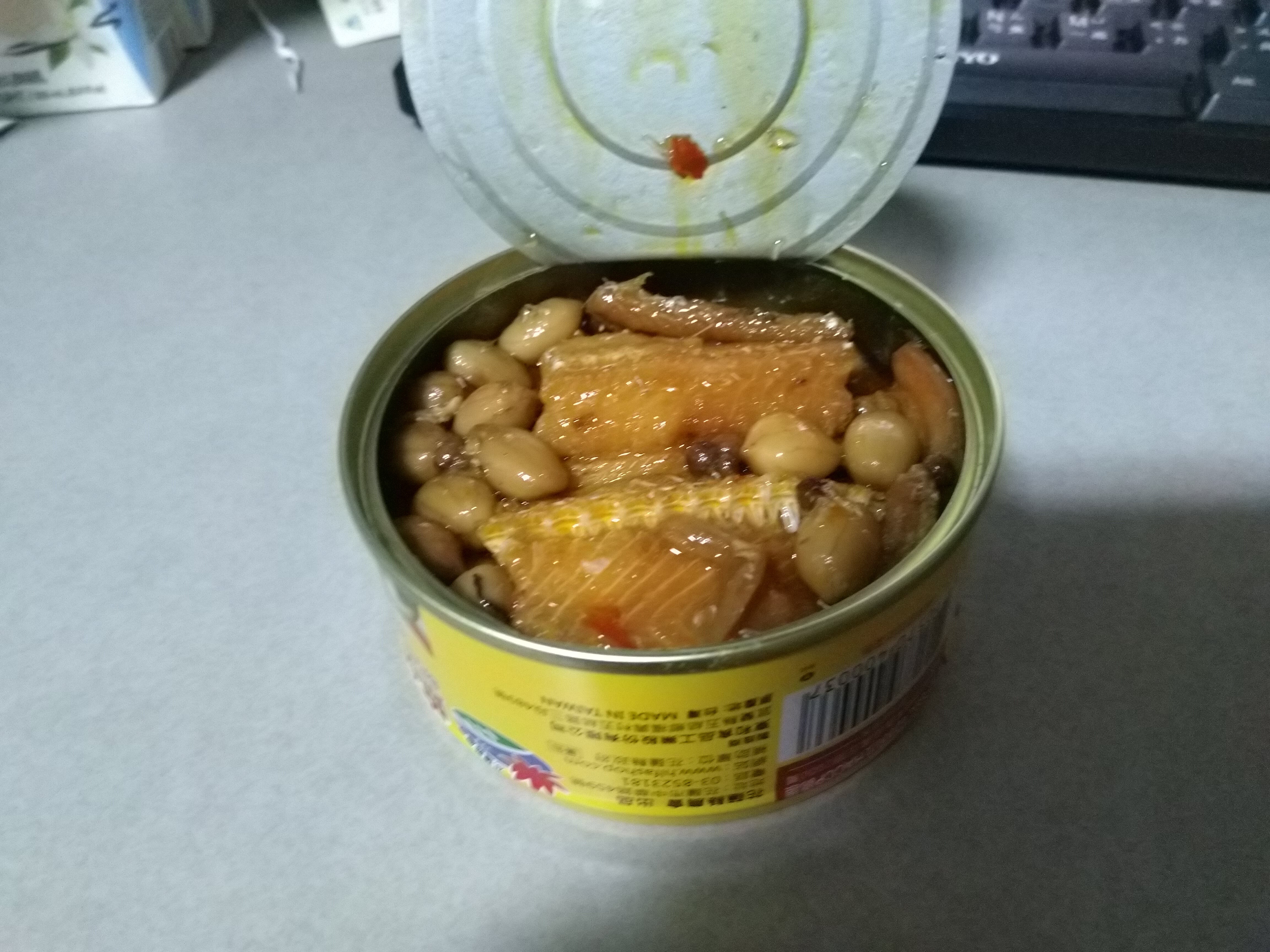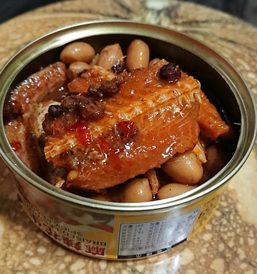 罐頭的調味跟一般市面上賣的罐頭一樣是甜鹹紅燒味,但增添了花椒的香氣和花生粒。
