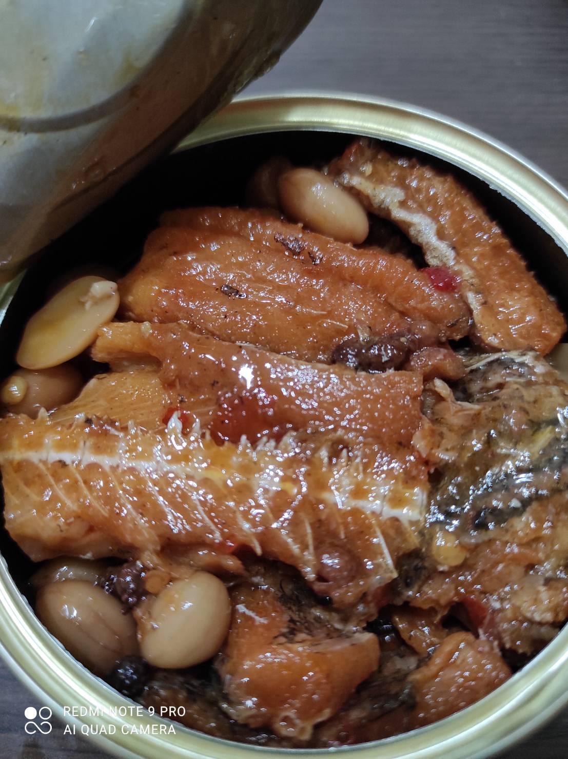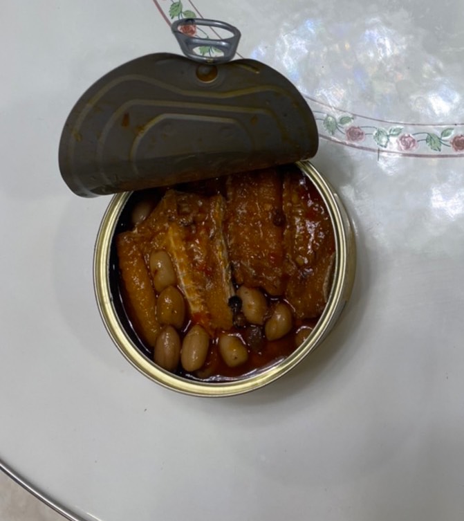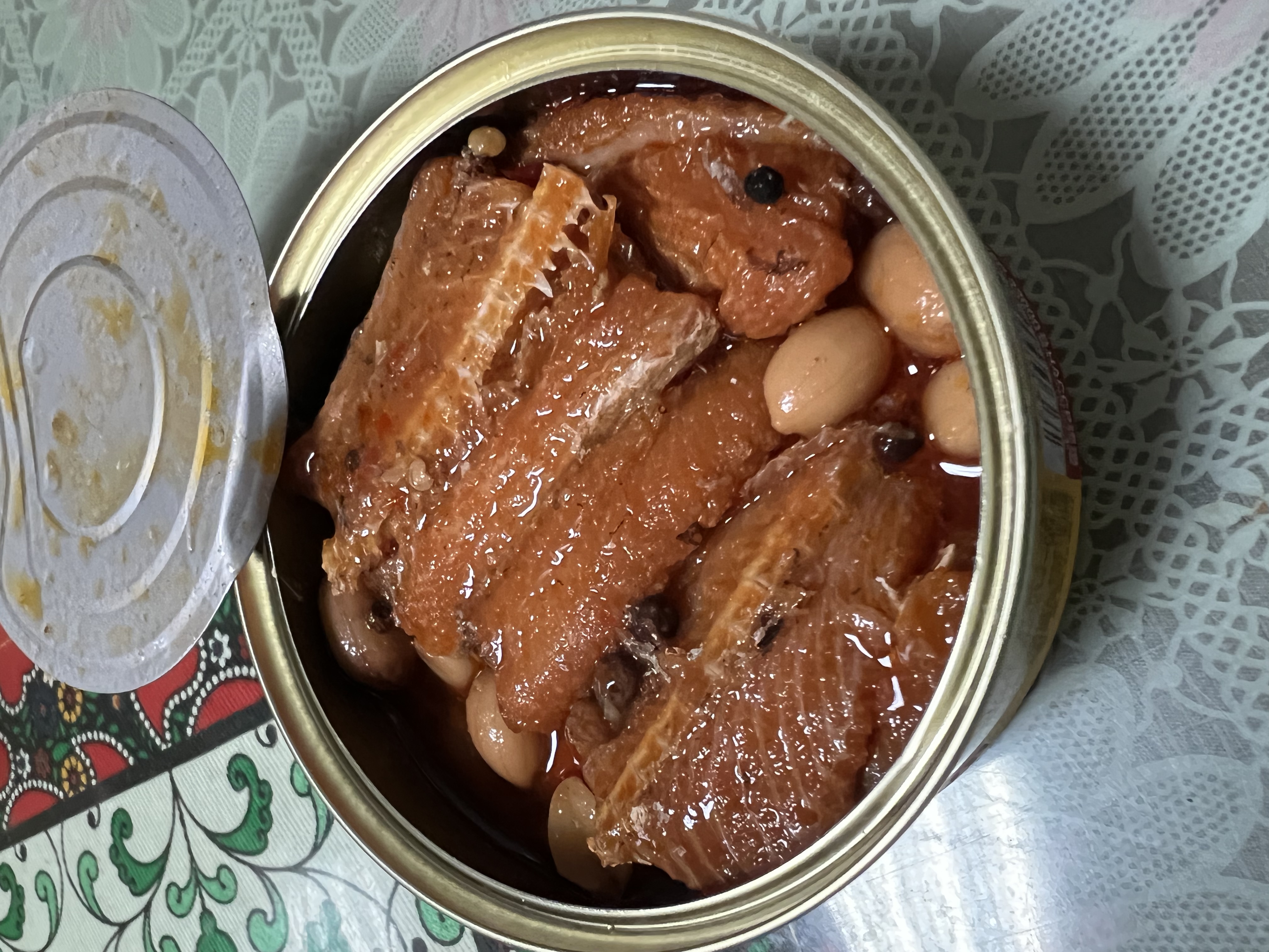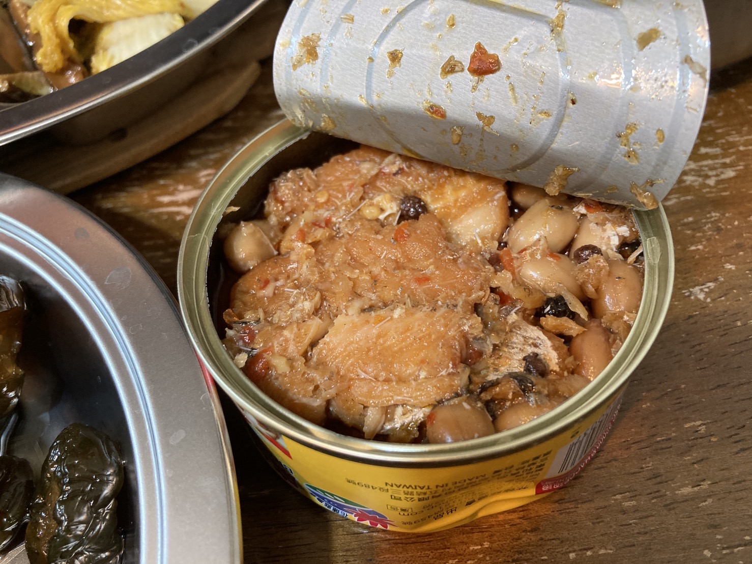 罐頭的調味跟一般市面上賣的罐頭一樣是甜鹹紅燒味,但增添了花椒的香氣和花生粒。
