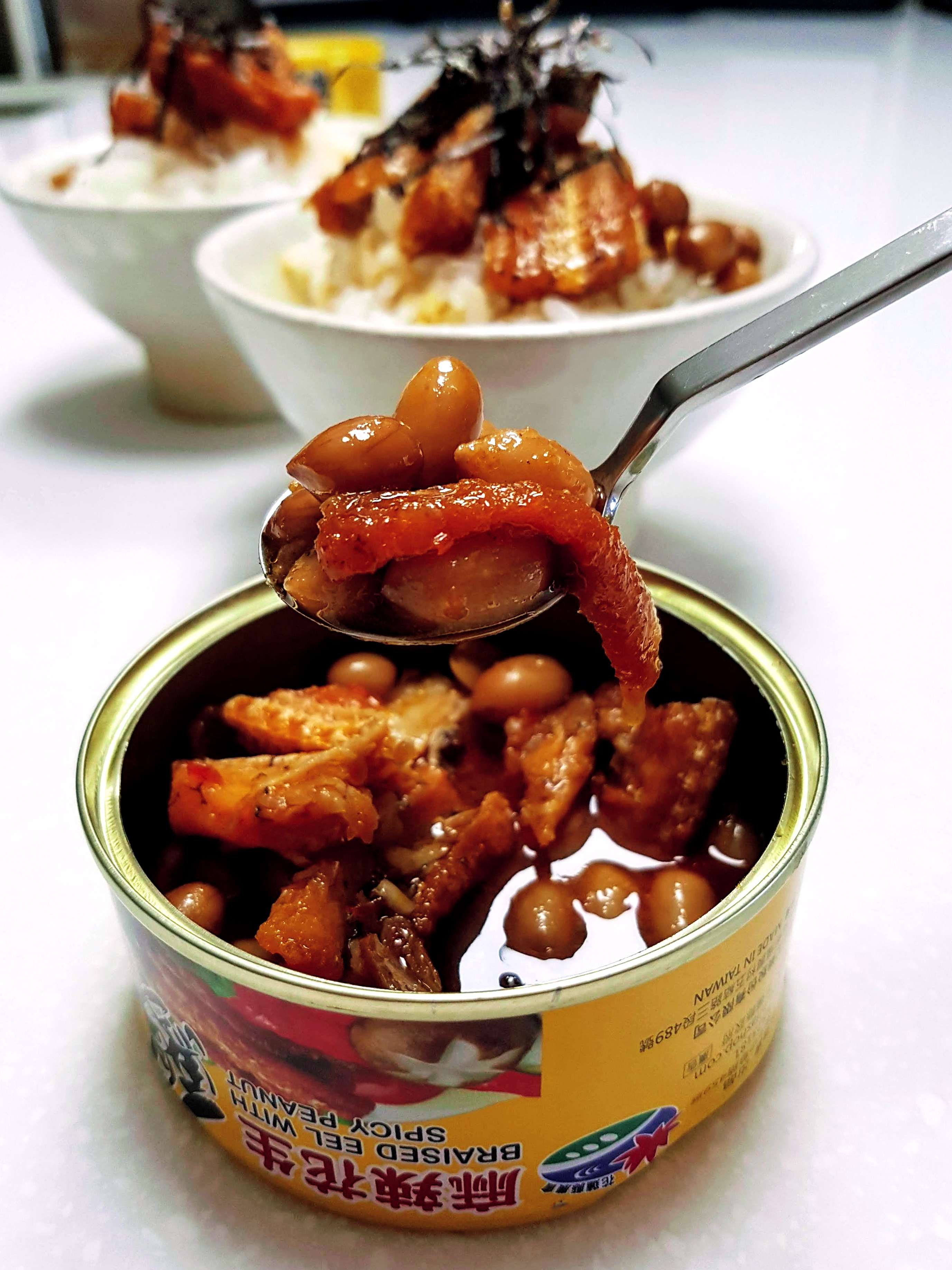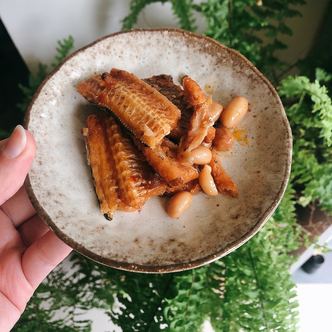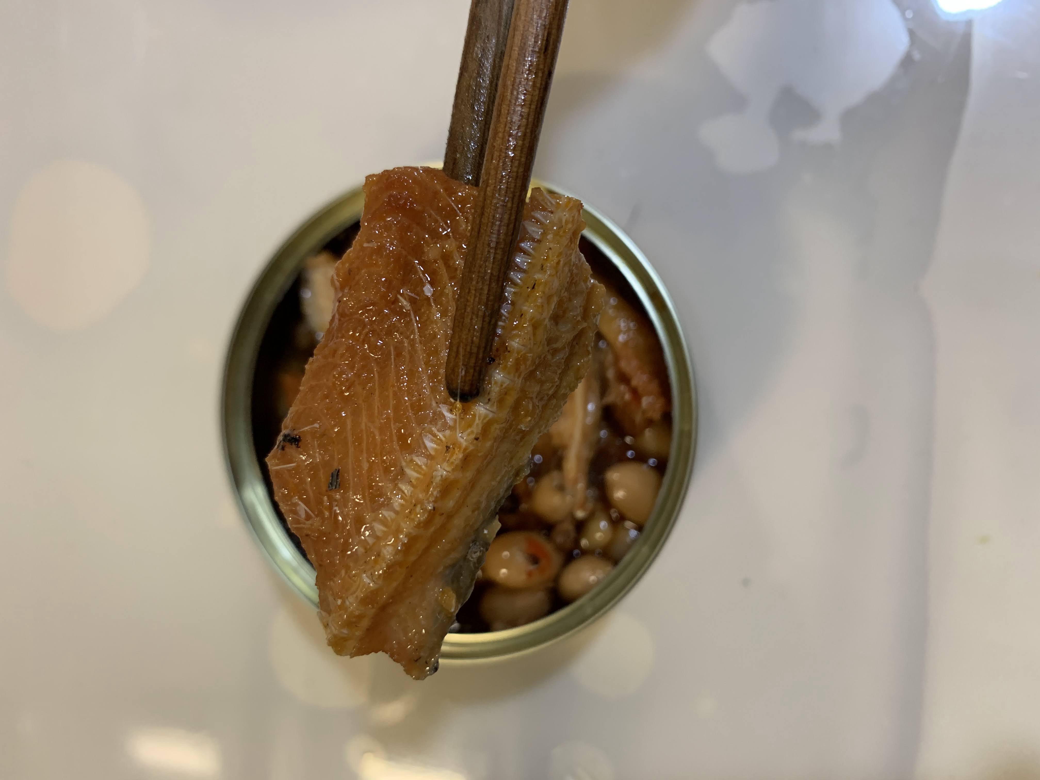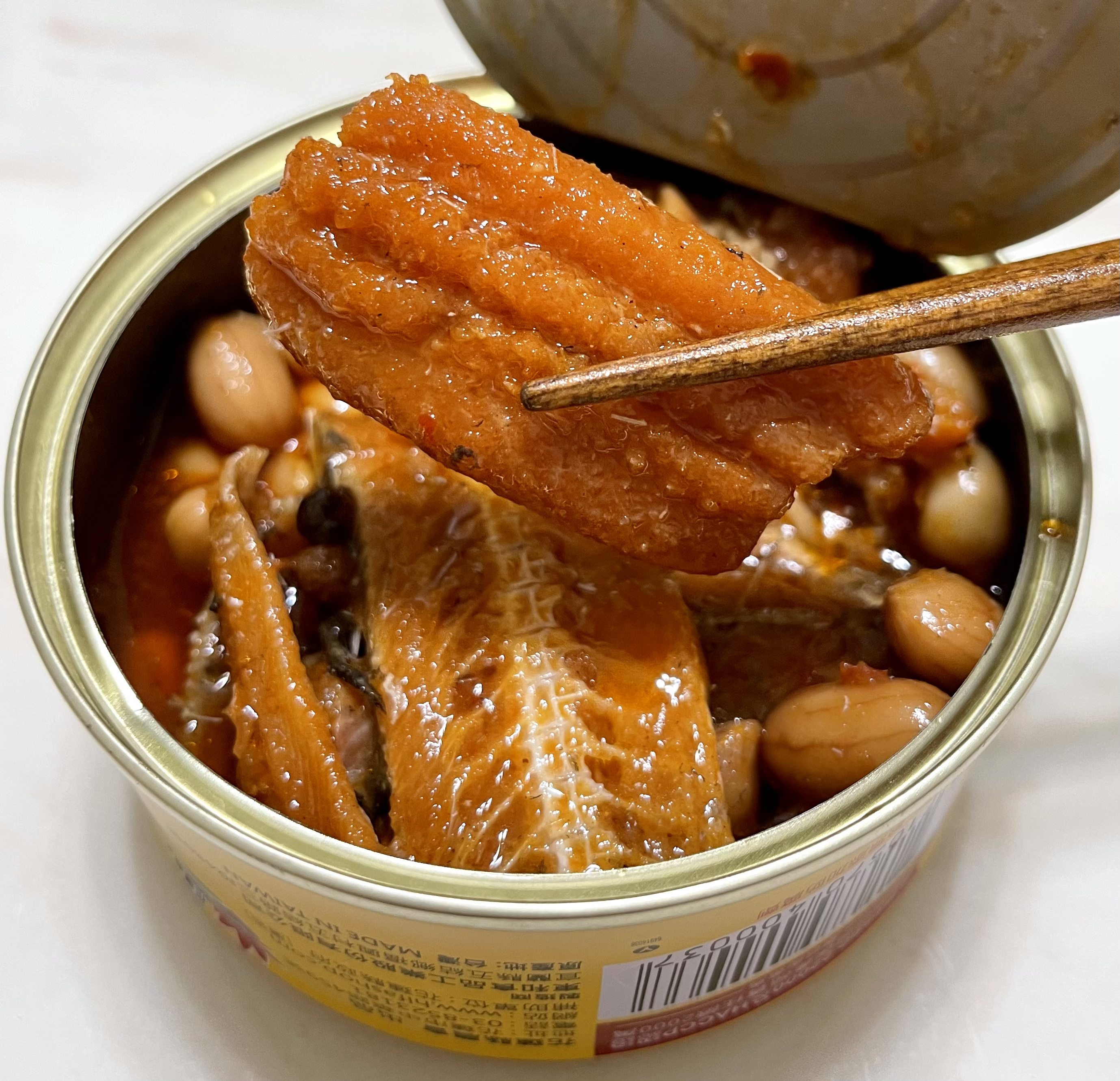 罐頭裡滿是鰻魚塊與花生粒,分量十足。帶骨的魚肉綿密入味,夾起時卻不會分離四散;鬆軟的魚骨入口即化,不需要擔心細刺問題;入味的花生香氣十足但不軟爛,仍保有硬脆的口感。