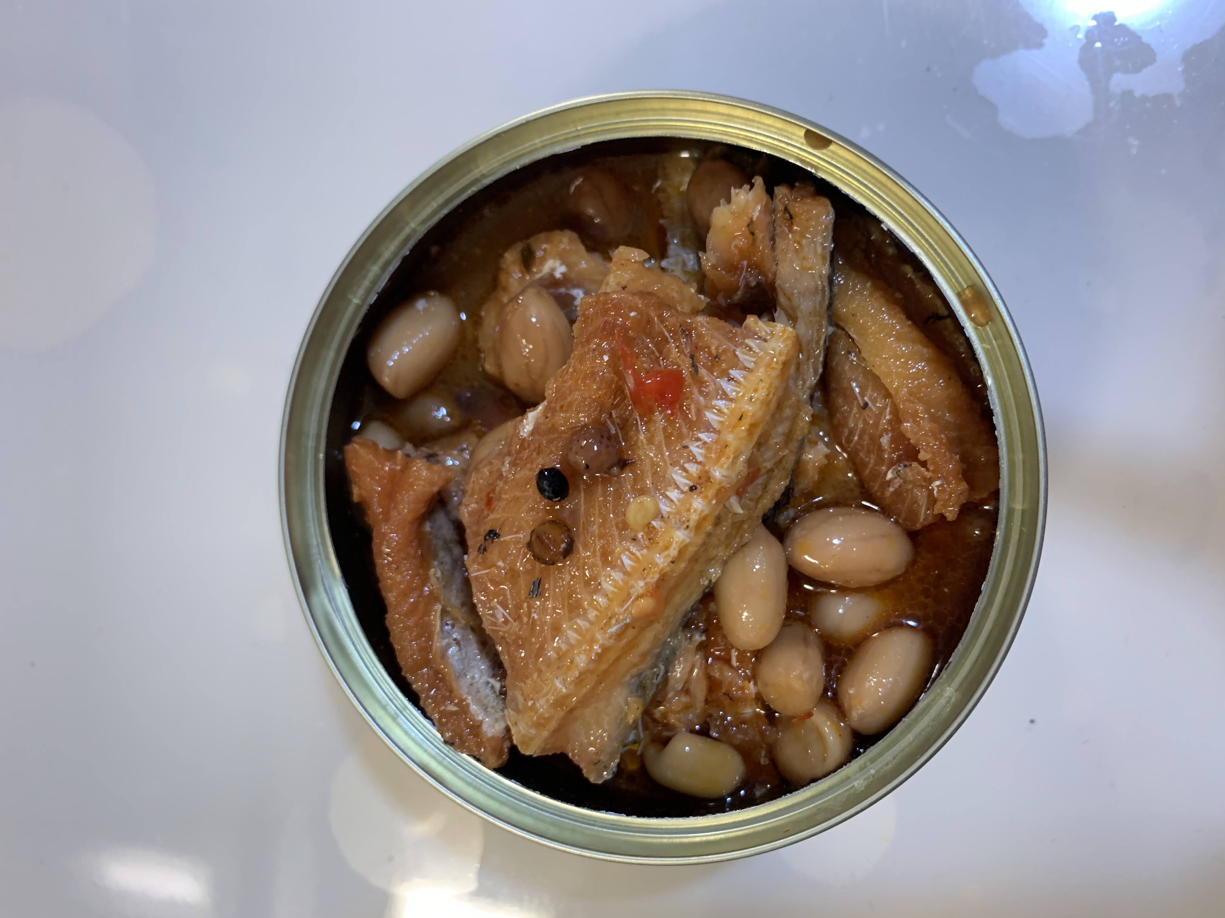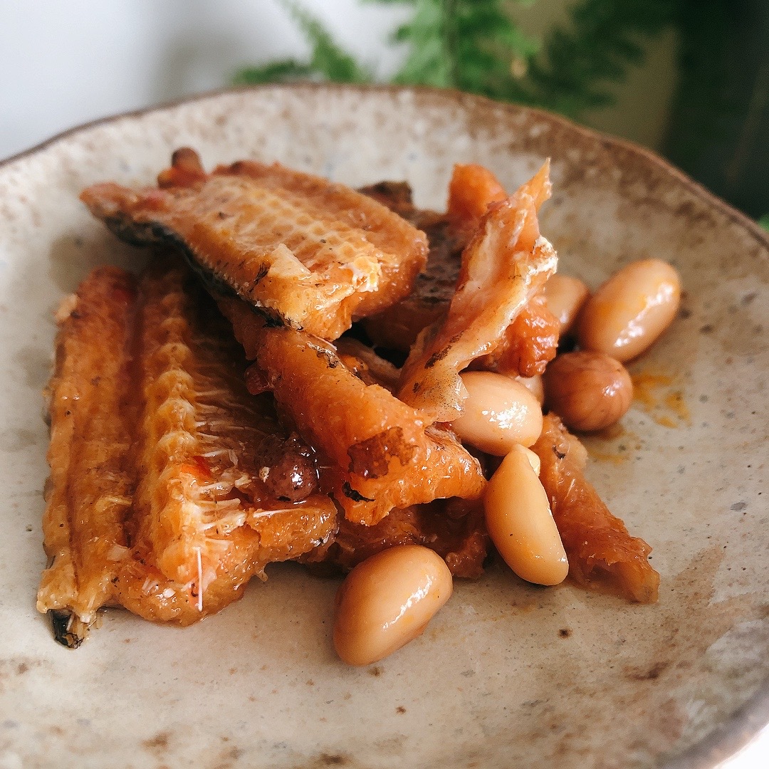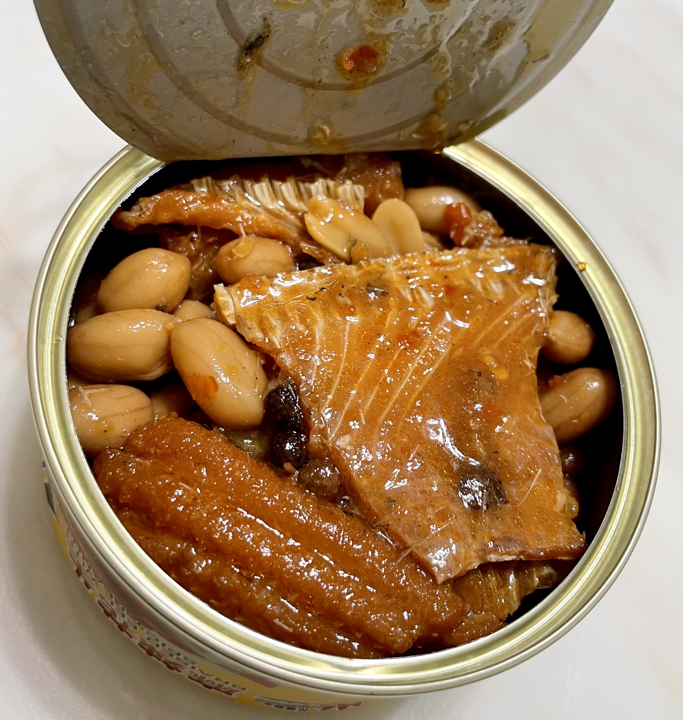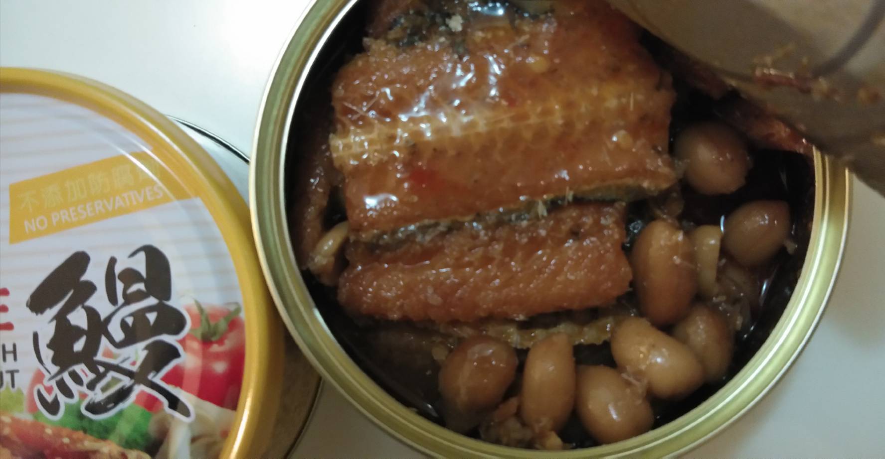 罐頭裡滿是鰻魚塊與花生粒,分量十足。帶骨的魚肉綿密入味,夾起時卻不會分離四散;鬆軟的魚骨入口即化,不需要擔心細刺問題;入味的花生香氣十足但不軟爛,仍保有硬脆的口感。