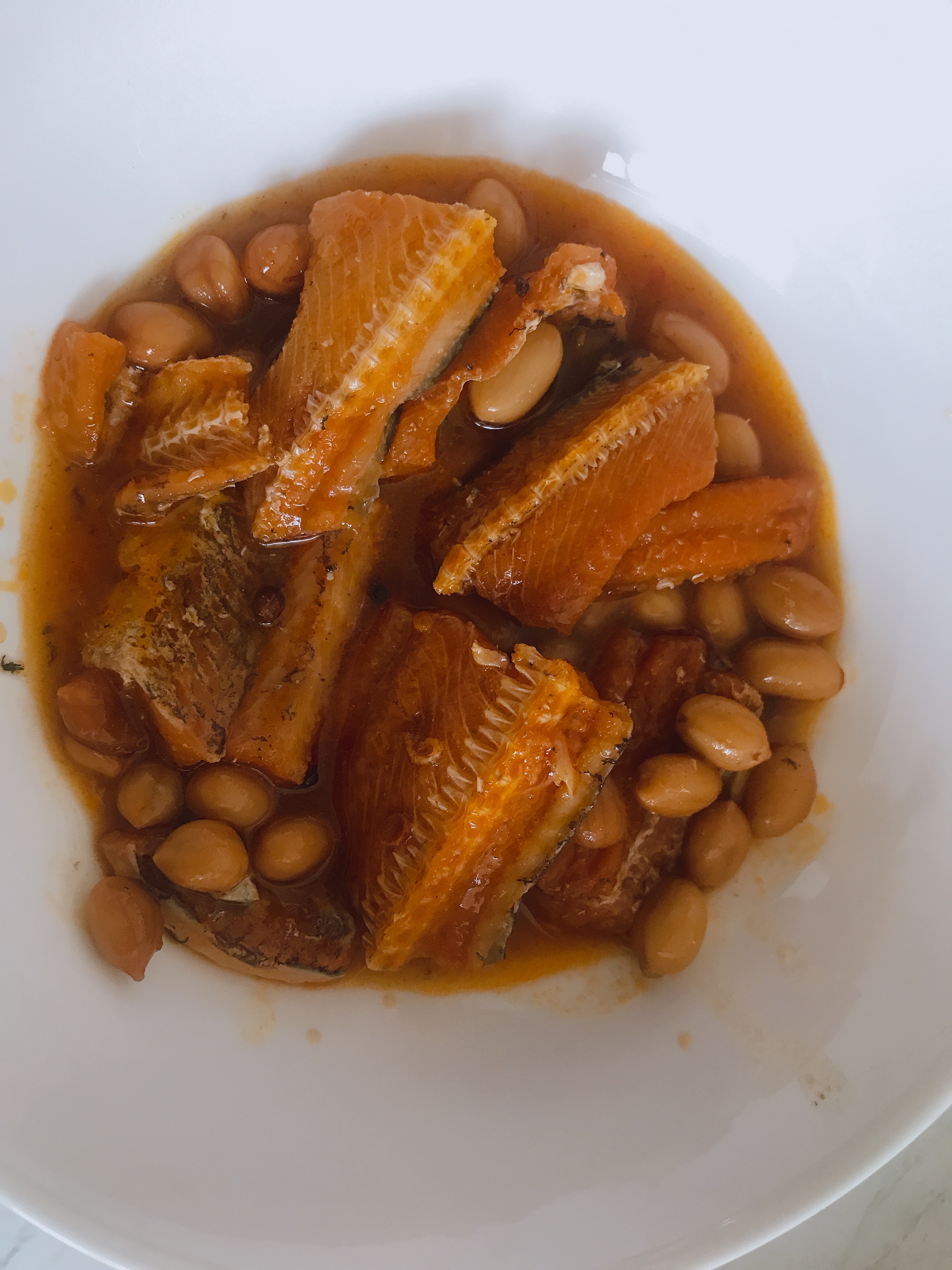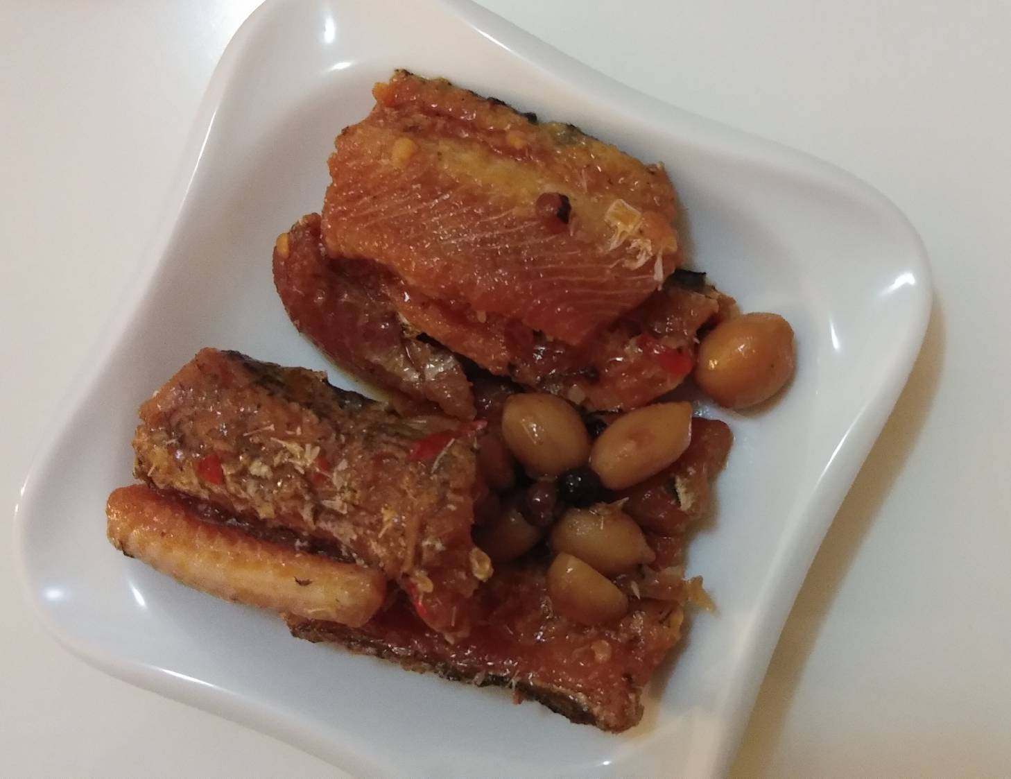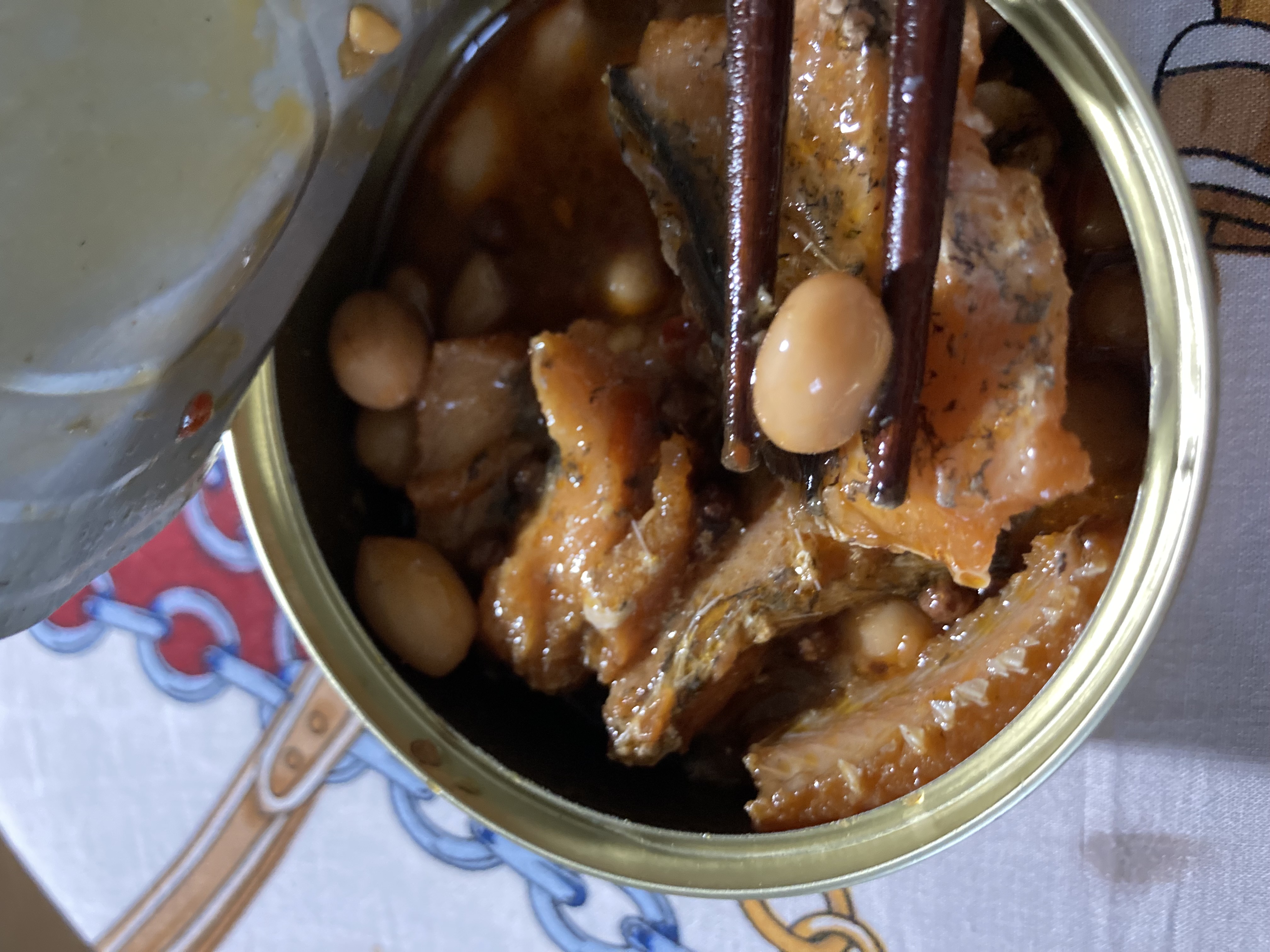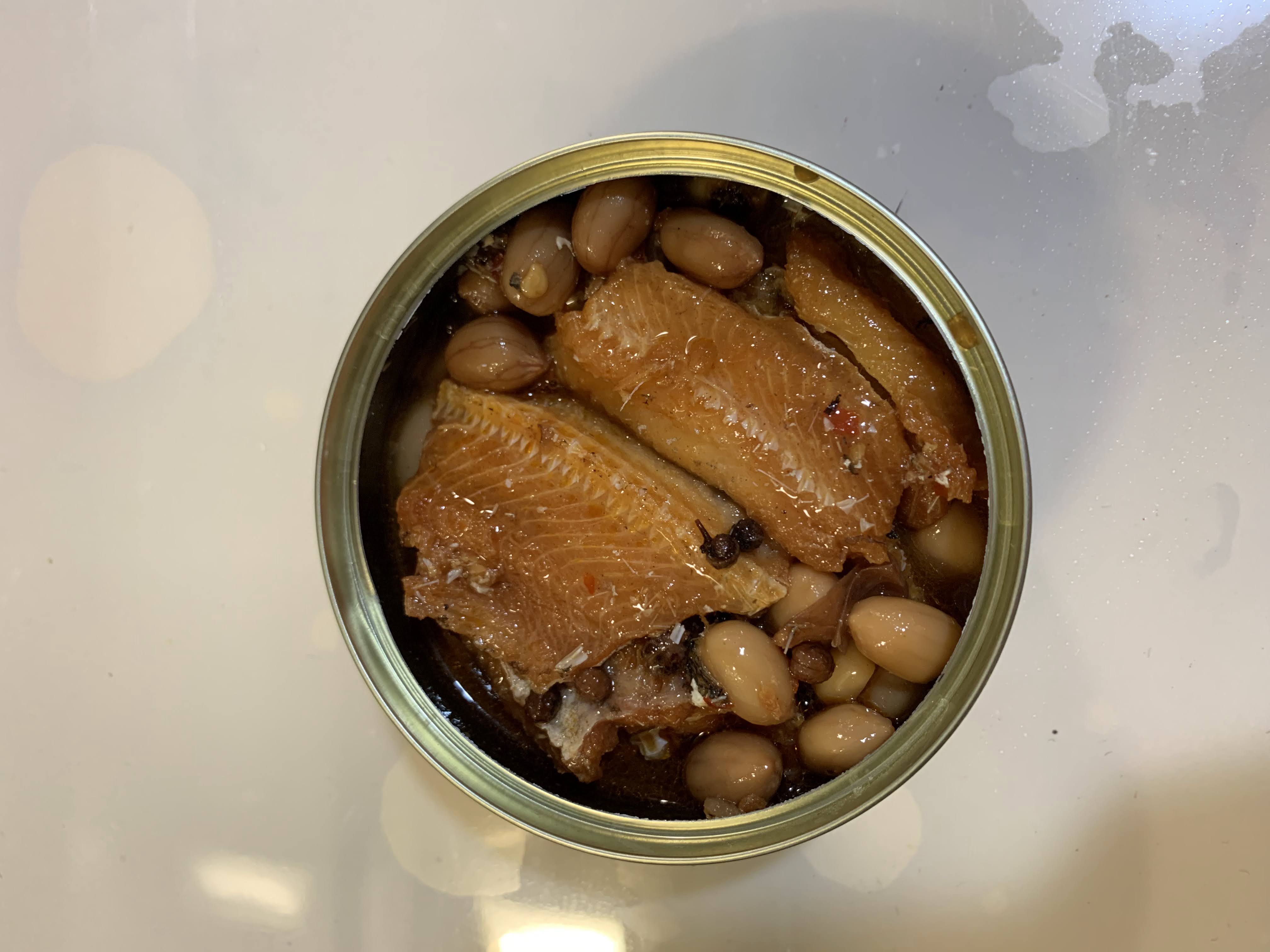 罐頭裡滿是鰻魚塊與花生粒,分量十足。帶骨的魚肉綿密入味,夾起時卻不會分離四散;鬆軟的魚骨入口即化,不需要擔心細刺問題;入味的花生香氣十足但不軟爛,仍保有硬脆的口感。