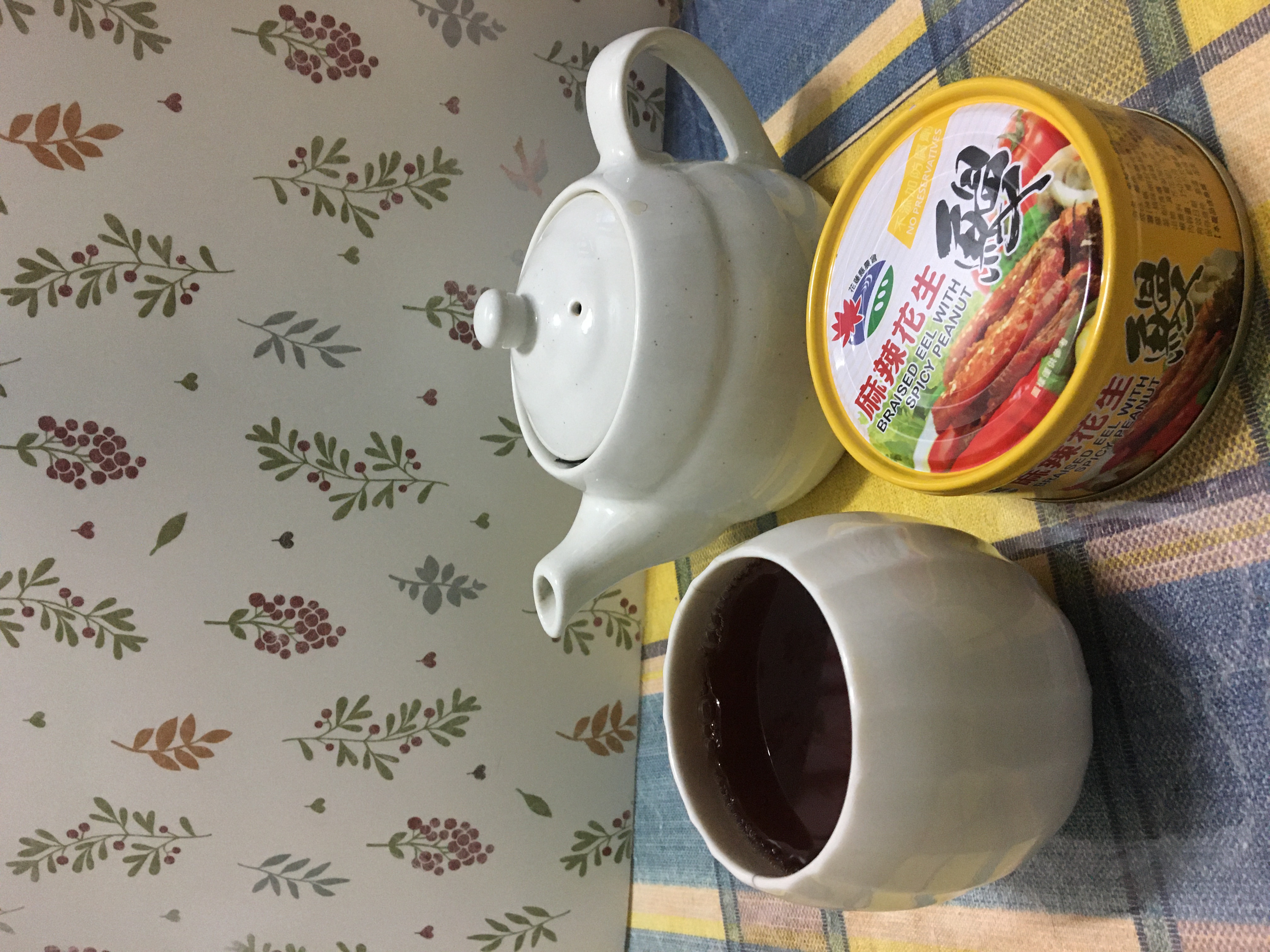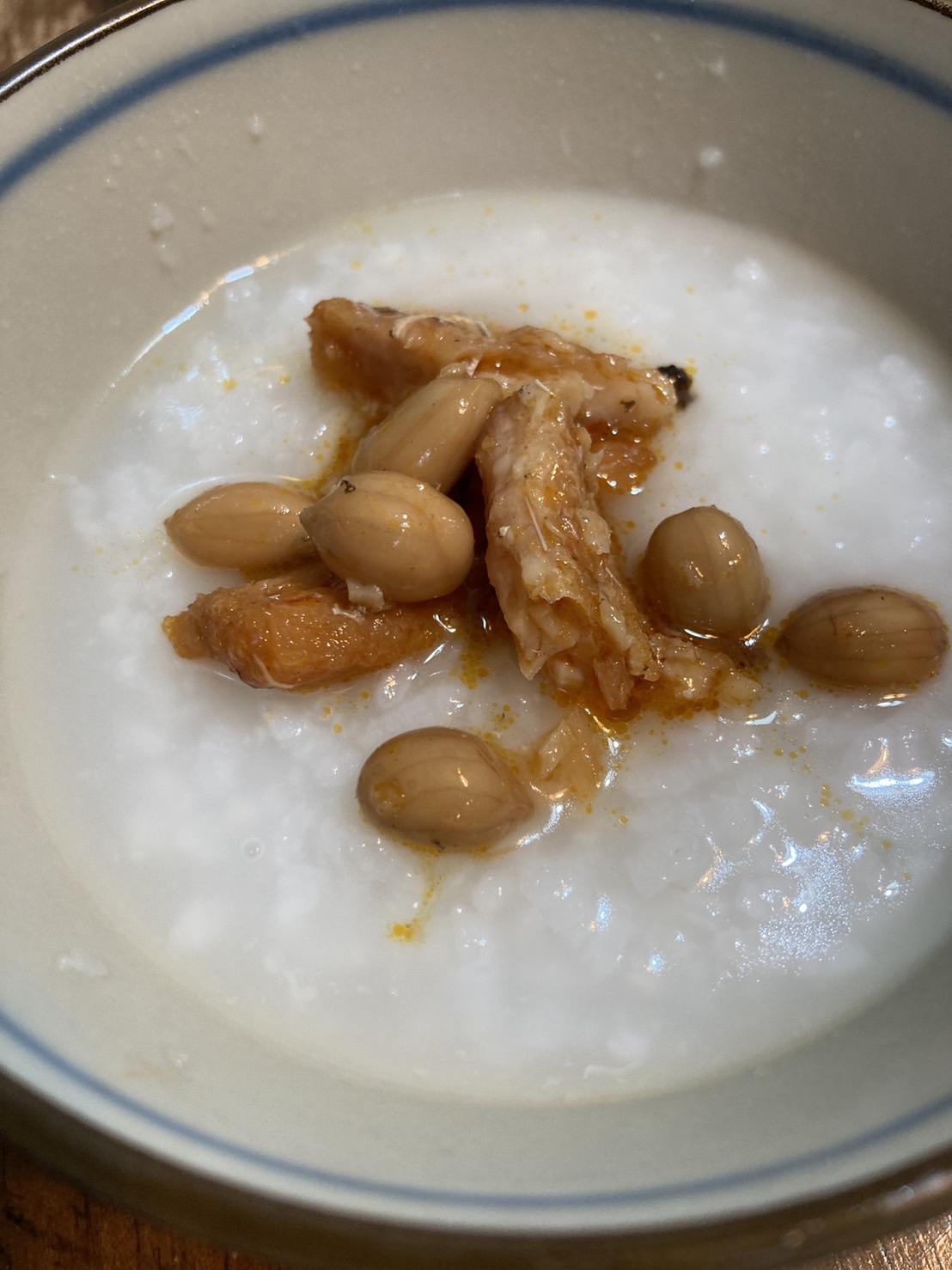 收到花蓮縣農會的麻辣花生鰻魚罐頭,晚餐就馬上準備了一大鍋白粥,打算搭配著來吃。罐頭一打開可以聞到一股不刺鼻的花椒麻辣香味,選擇稍清淡的白粥配著重口味的麻辣花生鰻魚罐頭,剛!剛!好!