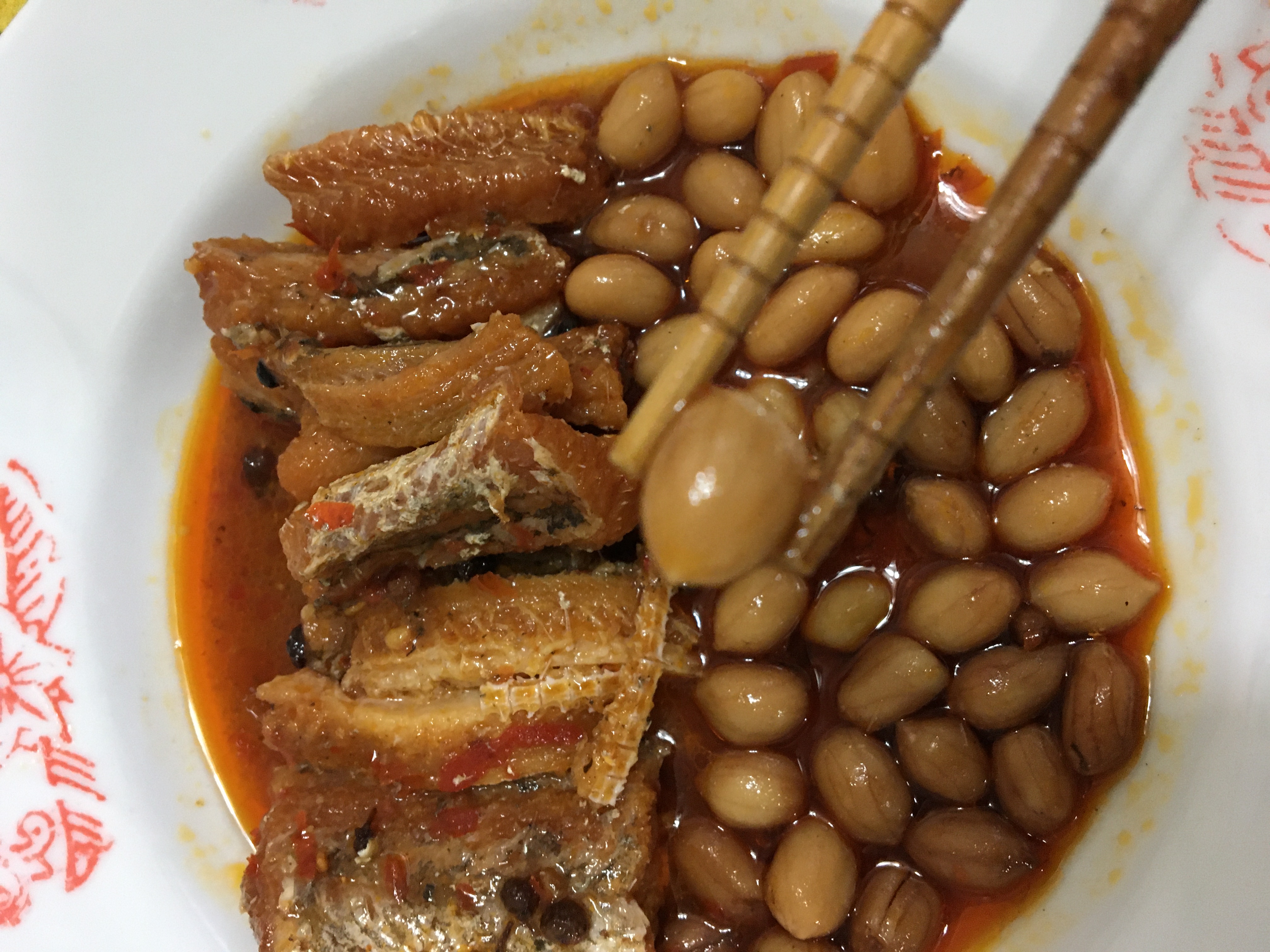 因為不太會吃辣,所以只敢夾上面沒有浸泡到湯汁的地方,令人意外的是口感沒有像我對鰻魚的印象,不是那種軟軟爛爛,還是有一點口感在的,花生吃起來也不錯,不會很軟還是有點脆度。喜歡吃辣的朋友表示吃起來沒有很辣,但是那個麻麻的感覺他很喜歡。
