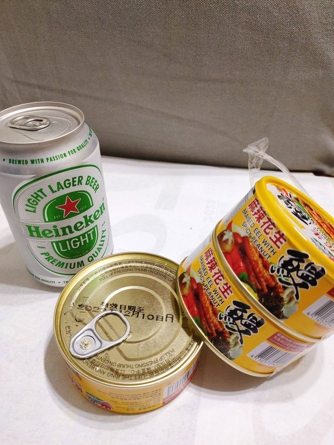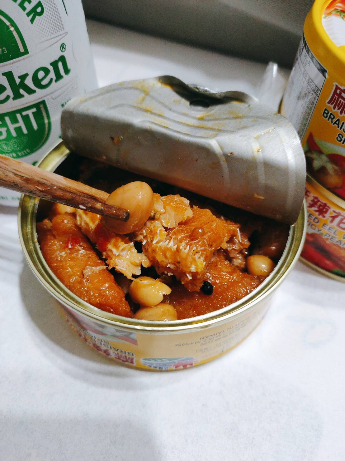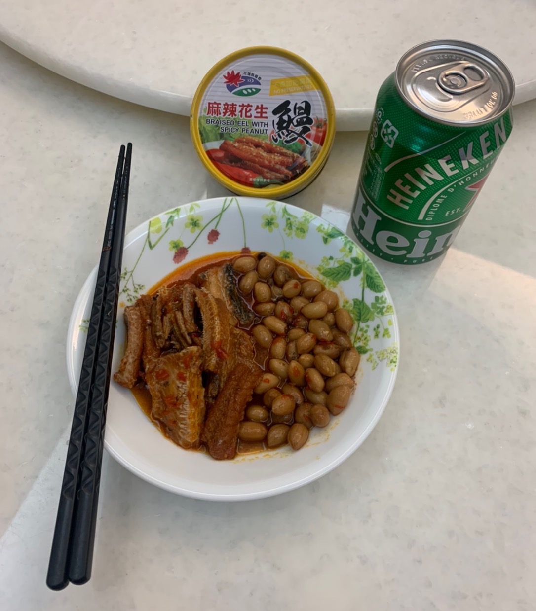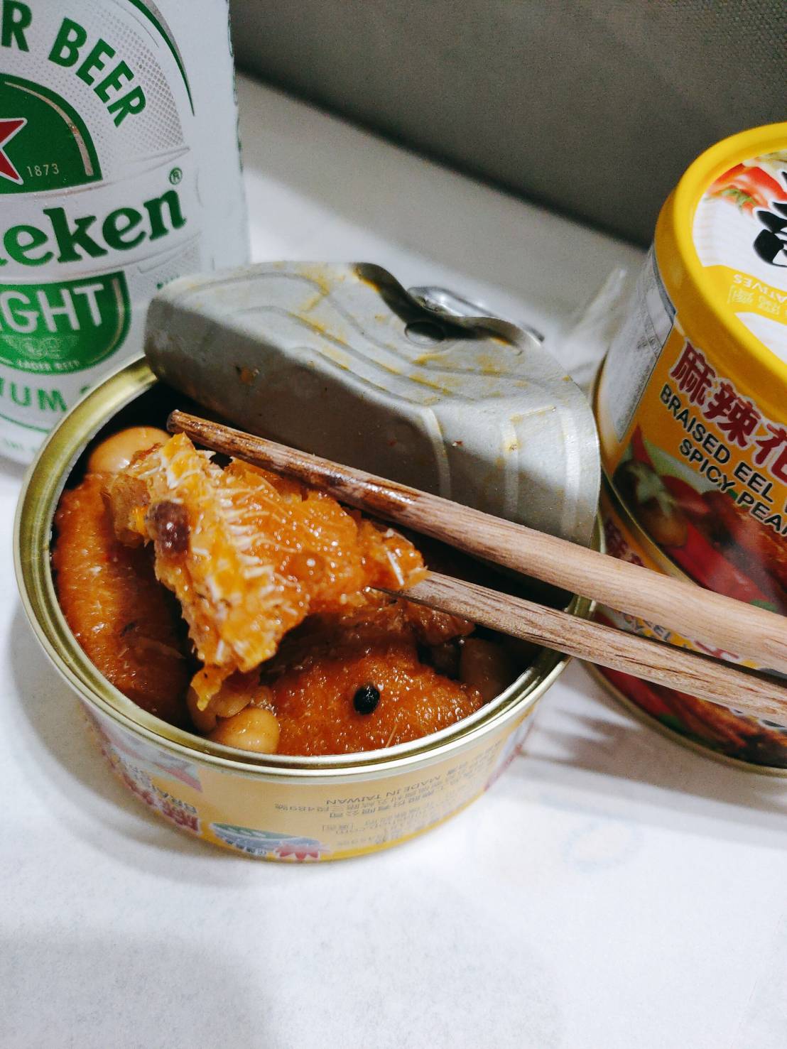 立冬後的午陽列列日頭, 在追劇費神後肚子不停咕嚕咕嚕的敲著肚皮, 翻翻櫃子拿了一罐麻辣花生鰻魚罐頭配冰箱最後一罐冰涼啤酒, 第一次吃鰻魚與花生的組合, 這兩味絕對是啤酒的麻吉, 軟酥的鰻魚配上微脆的的花生唇齒留香, 珠翠之珍筷子夾著夾著就空了