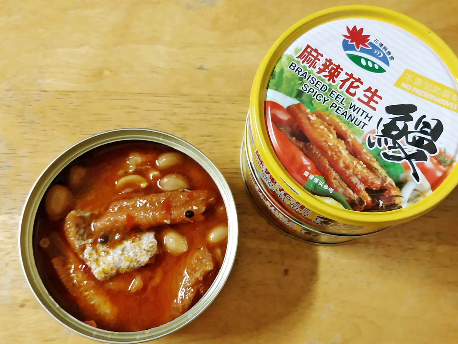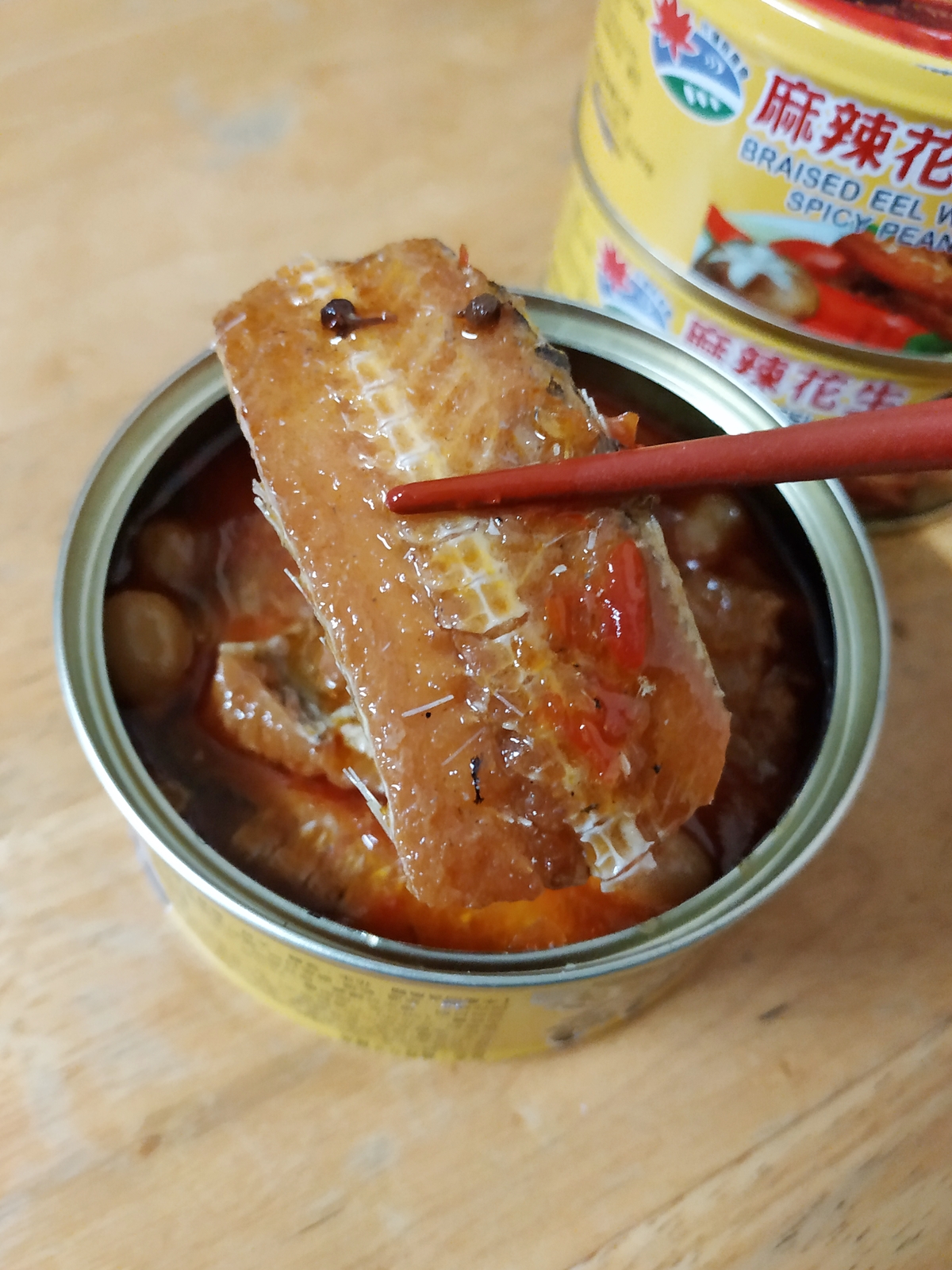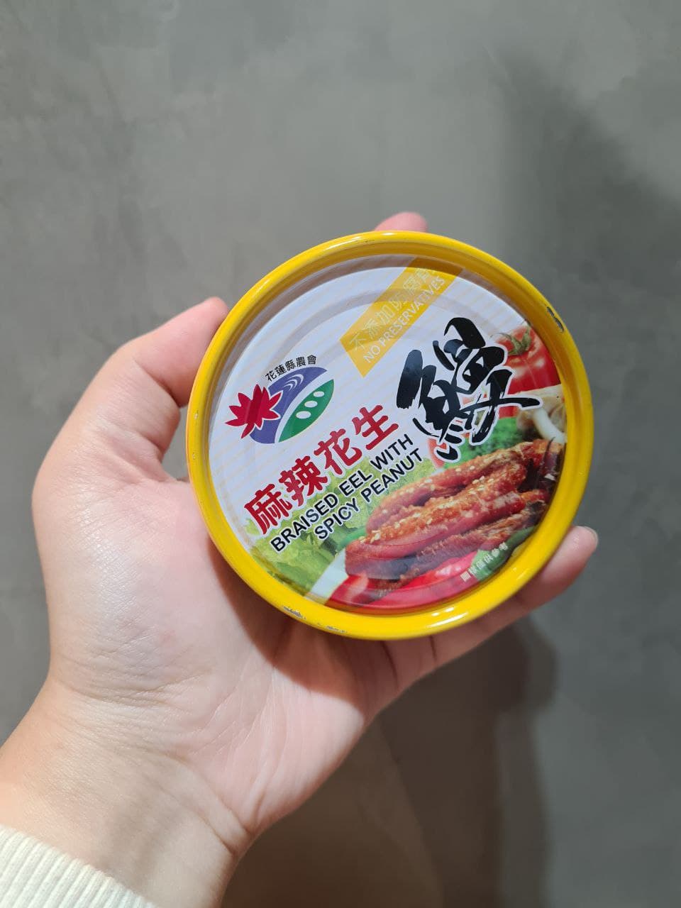 花蓮縣農會"麻辣花生鰻魚罐頭"一打開馬上就有鰻魚的鹹香味,還有花椒的香氣撲鼻而來。