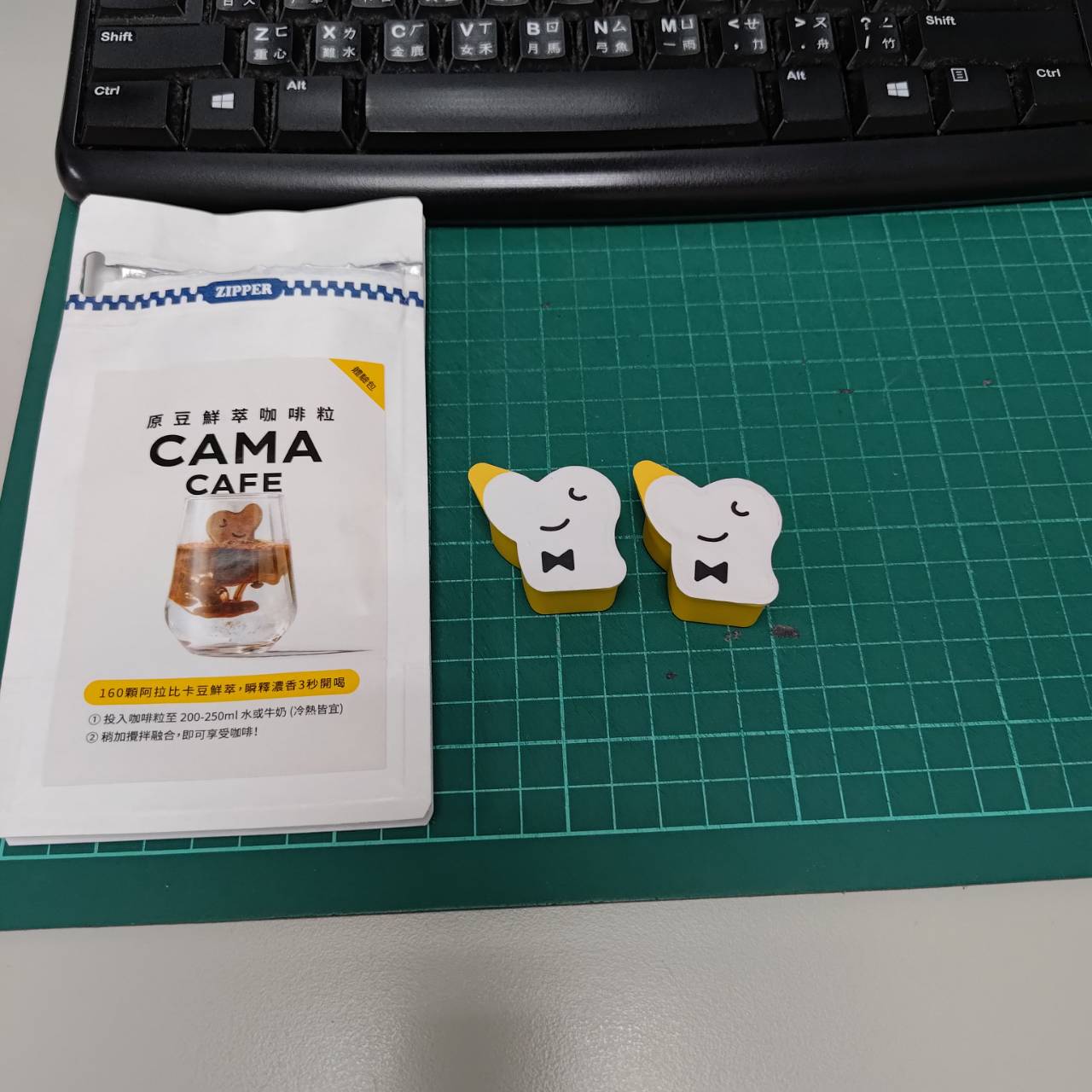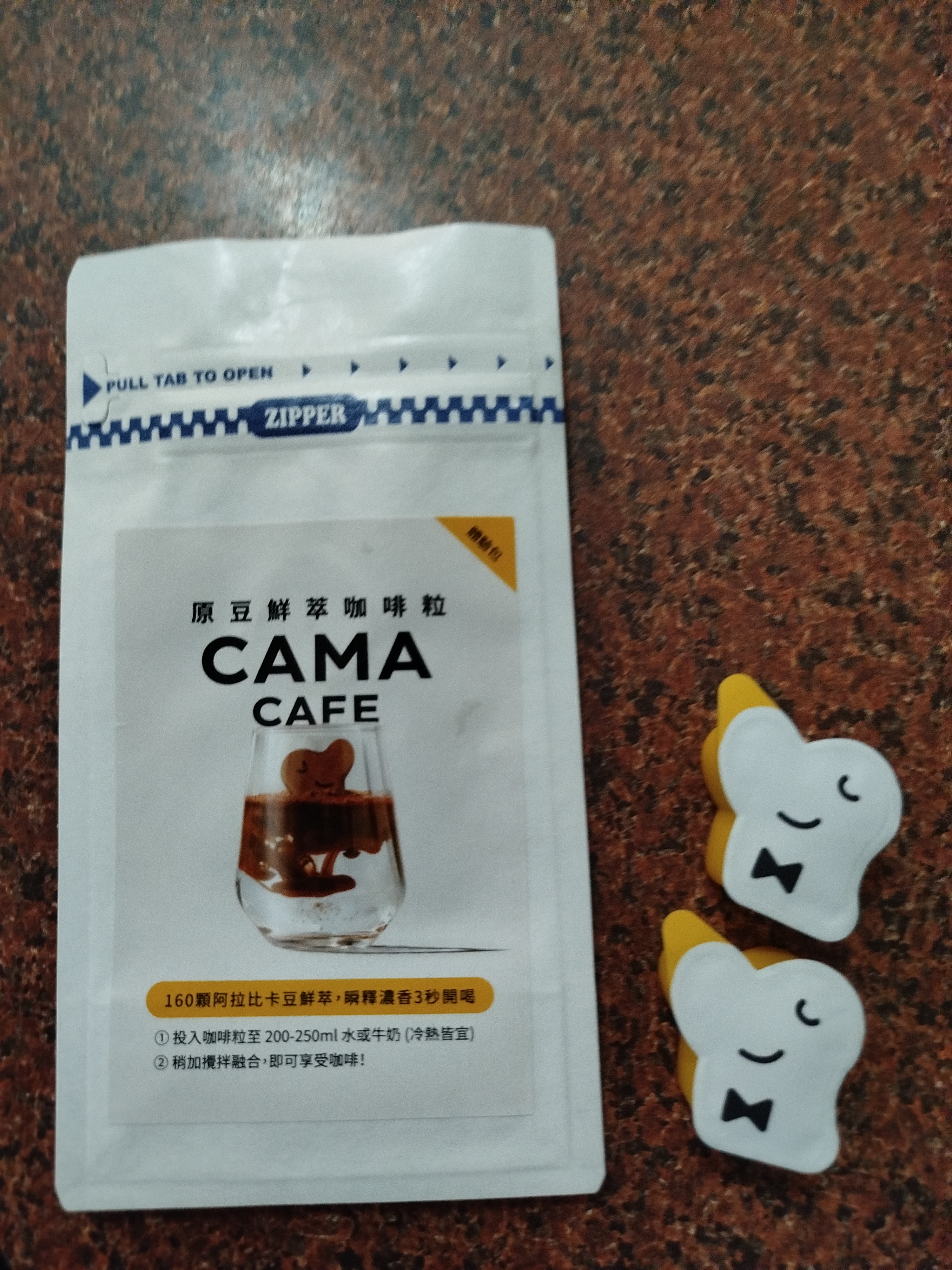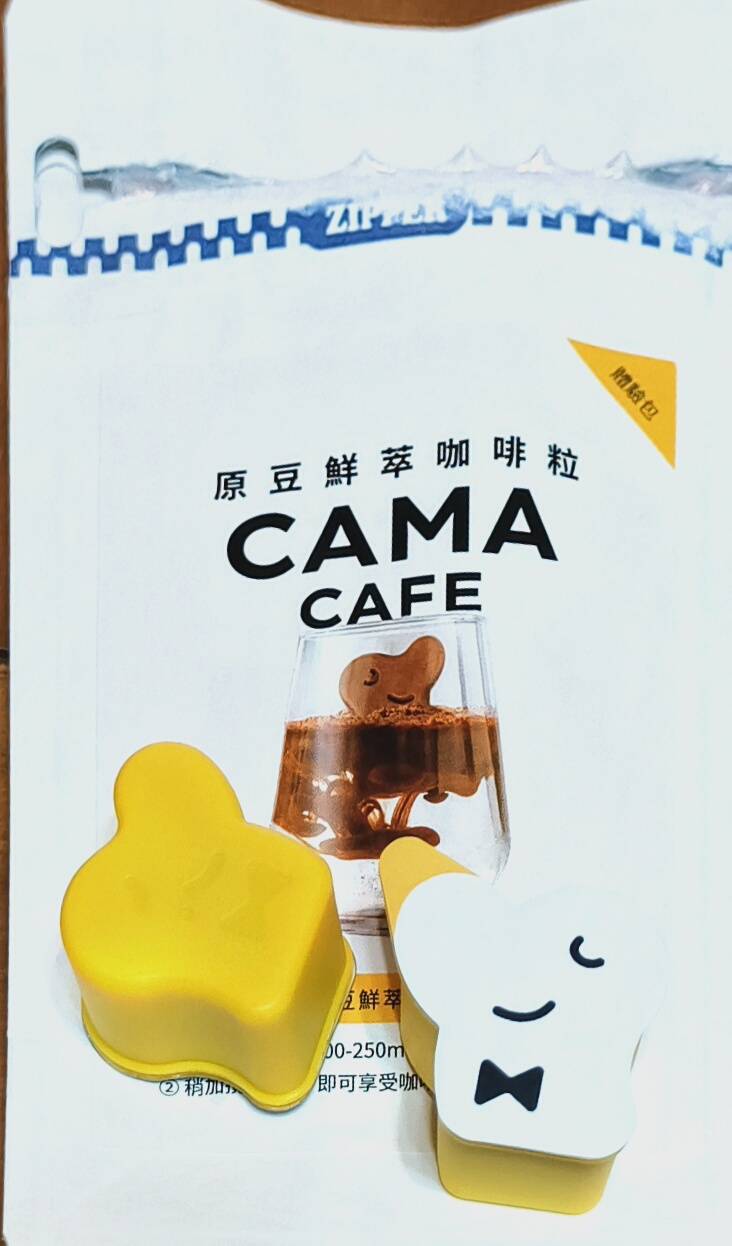 CAMA CAFE咖啡粒白色外包裝上寫有含100%阿拉比卡咖啡豆,白色外封夾鏈袋精美小巧攜帶方便,白色外封袋內有2顆CAMA CAFE咖啡粒,橘黃色盒塑膠盒中裝入可愛的CAMACAFE公仔咖啡粒(CAMACAFE公仔圖案非常Cute。尚未沒沖泡時,就已經聞到一陣陣的咖啡豆香味,放入馬克杯後咖啡粒像咖啡粉一樣瞬間化開,加入熱滾燙的白開水以及牛奶攪拌後,瞬間變成了咖啡顏色的拿鐵咖啡,這個時候聞到了濃濃的牛奶咖啡香味,喝起來濃醇香,清晨來上一杯熱騰騰的CAMA CAFE拿鐵咖啡,配上早餐三明治,是早餐的最佳選擇!