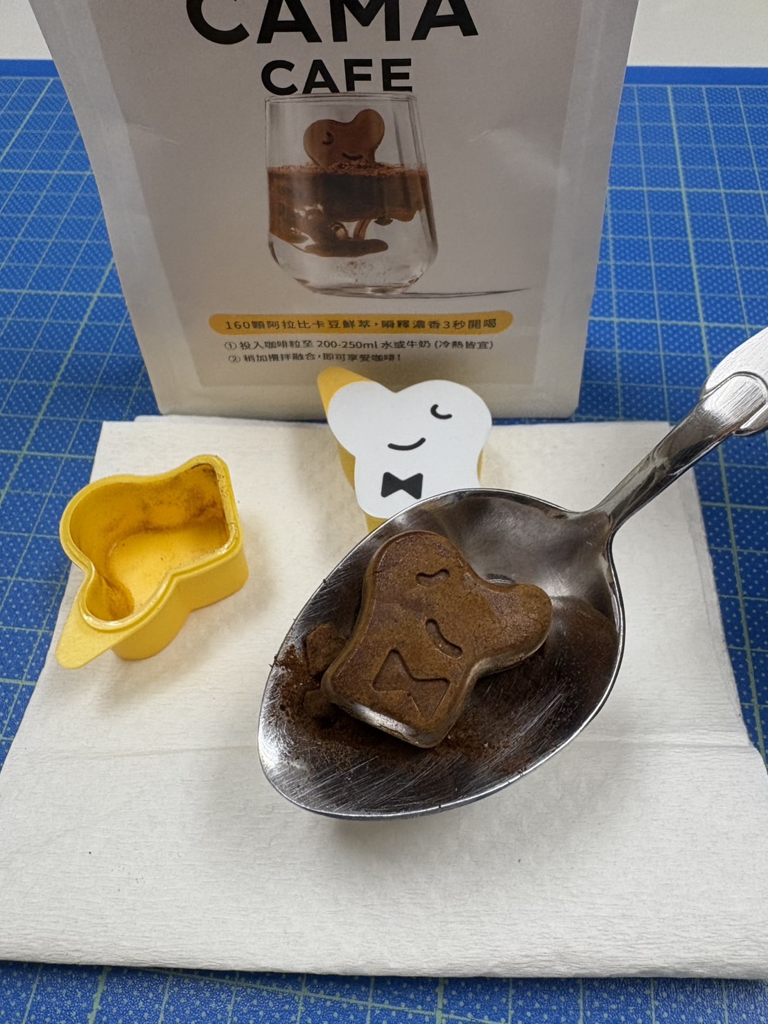 2.產品拆封時上面有點濕黏,咖啡塊上也沒有像網頁說明的人臉圖案,不知道是受潮而模糊了還是原本就沒人臉,拆包裝時有點失望...