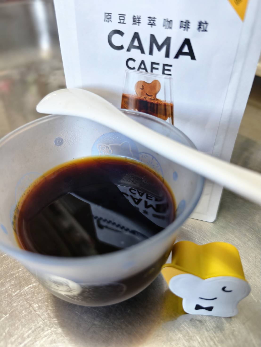 但是CAMA咖啡粒的造型是吉祥物Beano,使用起來是完全不一樣的體感,咖啡粒的塑膠外殼是Beano,放在杯子裡也會看到Beano正面,整體的操作過程都感到很療癒、也很方便,加水之後再把杯子搖一搖就融化了,真的3秒開喝!比手沖快又比即飲快速!