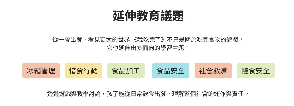 惜食桌遊《我吃完了!》是透過遊戲機制,隨時整理自己的「食物櫃」,體驗過多浪費成為廚餘,過少飢餓需到食物銀行領取食物資源,使得孩子在專注遊玩的過程中,能夠因為實際的互動與選擇,能夠有所感受,像是:輕微的「剝奪感」、「焦慮感」 等情緒。作為教學者的我們都可以觀察到。更因為這些互動與選擇所產生的情緒,能夠讓孩子可以從情境腳色的第一視角開始進行思考!
