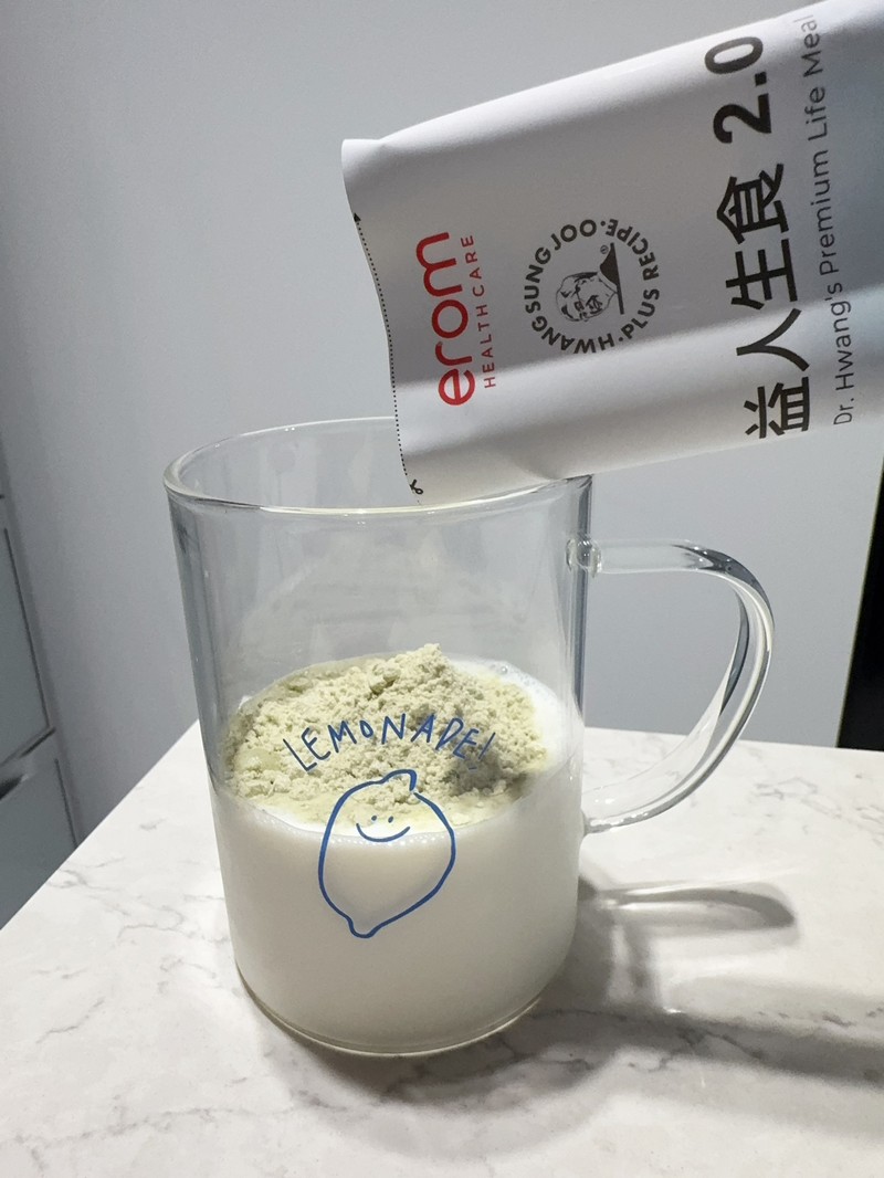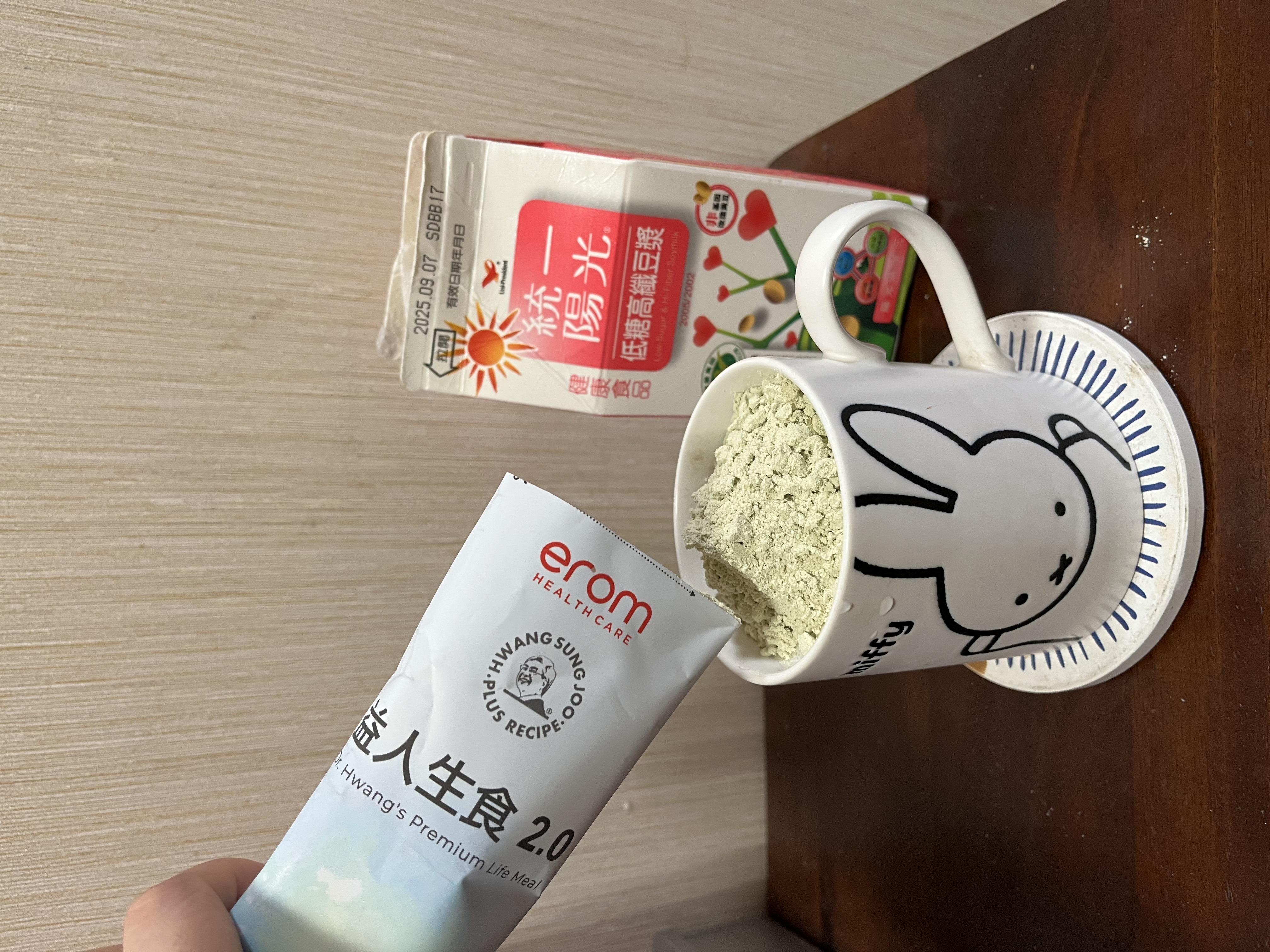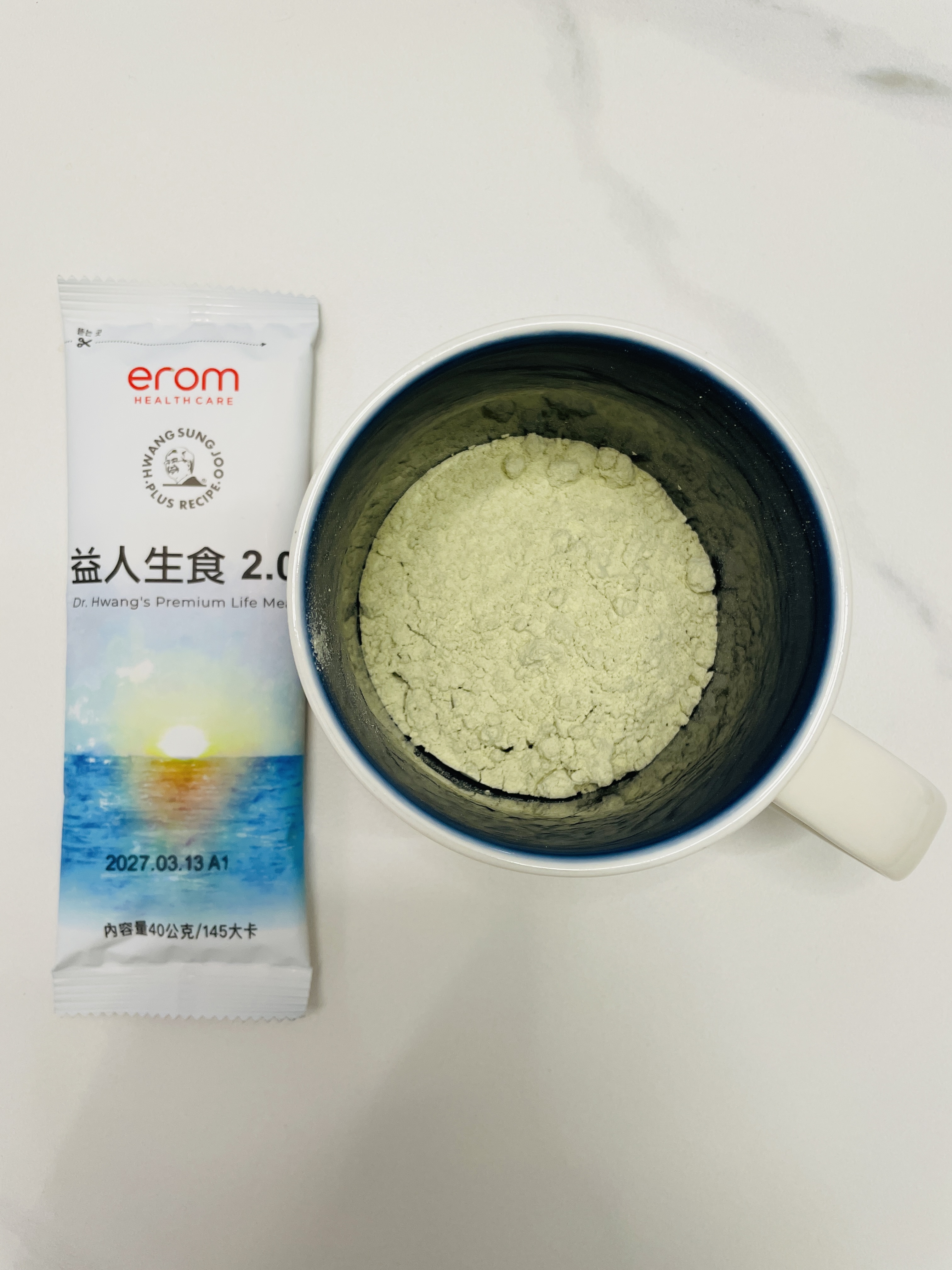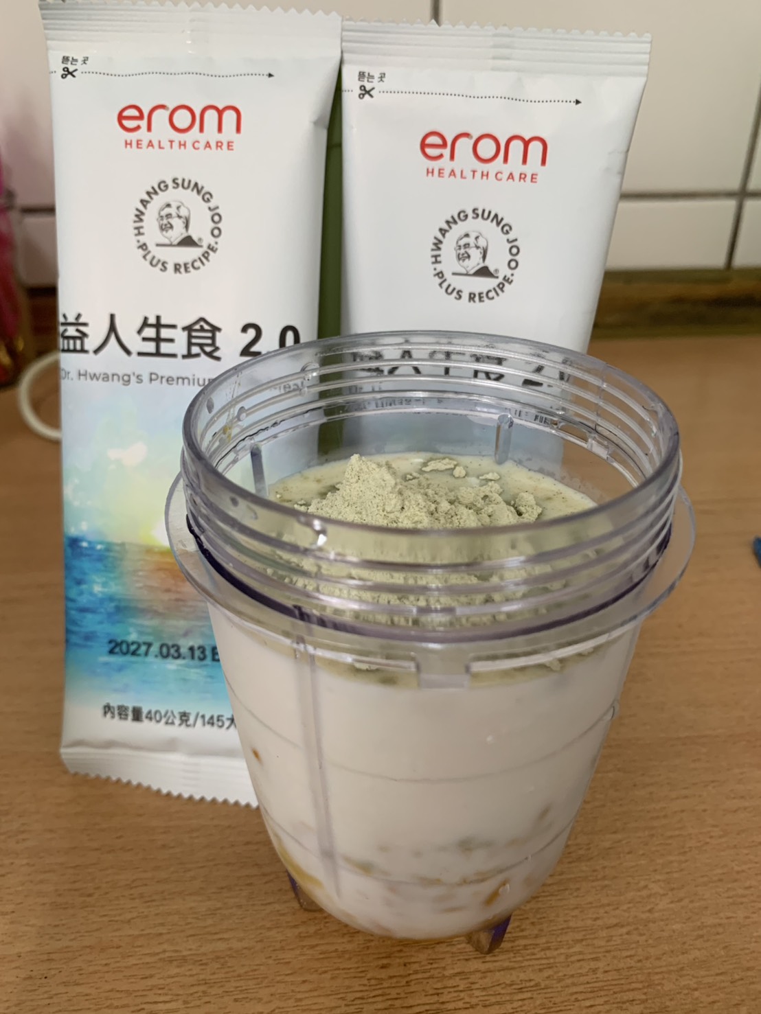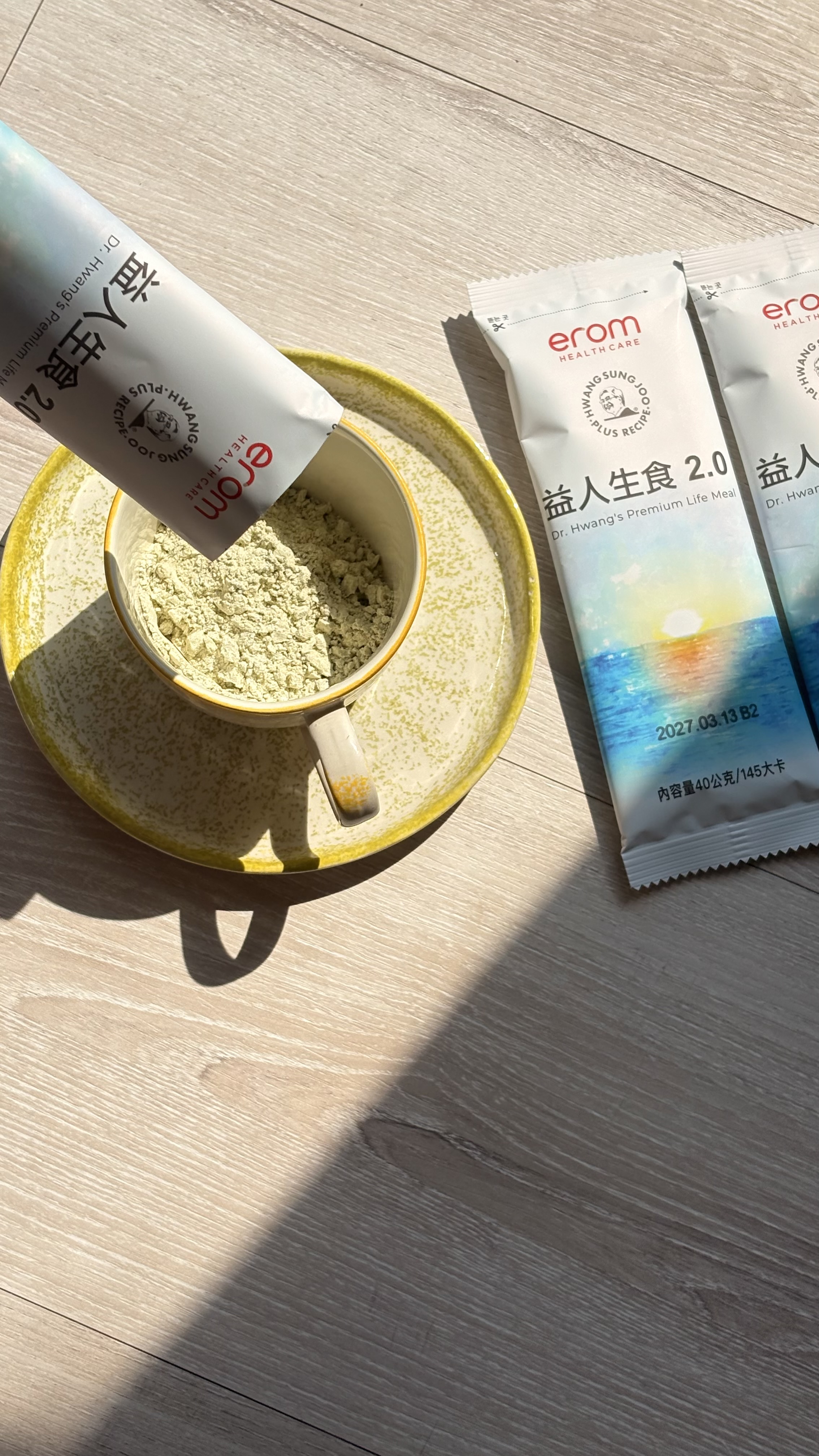 身為媽媽,早餐對我來說一定要有熱熱的主食,像是包子、饅頭加蛋,再配上一杯豆漿,才有飽足感。不過這樣的組合,常常蔬果攝取就比較不足。這次體驗 erom 益人生食 2.0,我就直接把它加入豆漿裡一起喝,結果非常搭,口感溫和滑順,像豆漿加了淡淡抹茶香,沒有可怕的菜味,小孩也能接受(還很喜歡)。