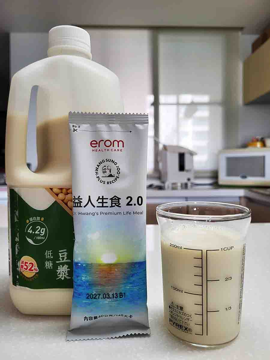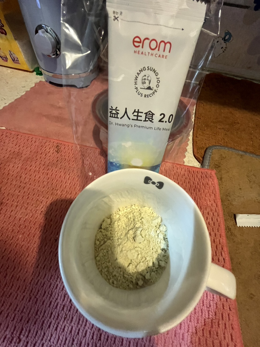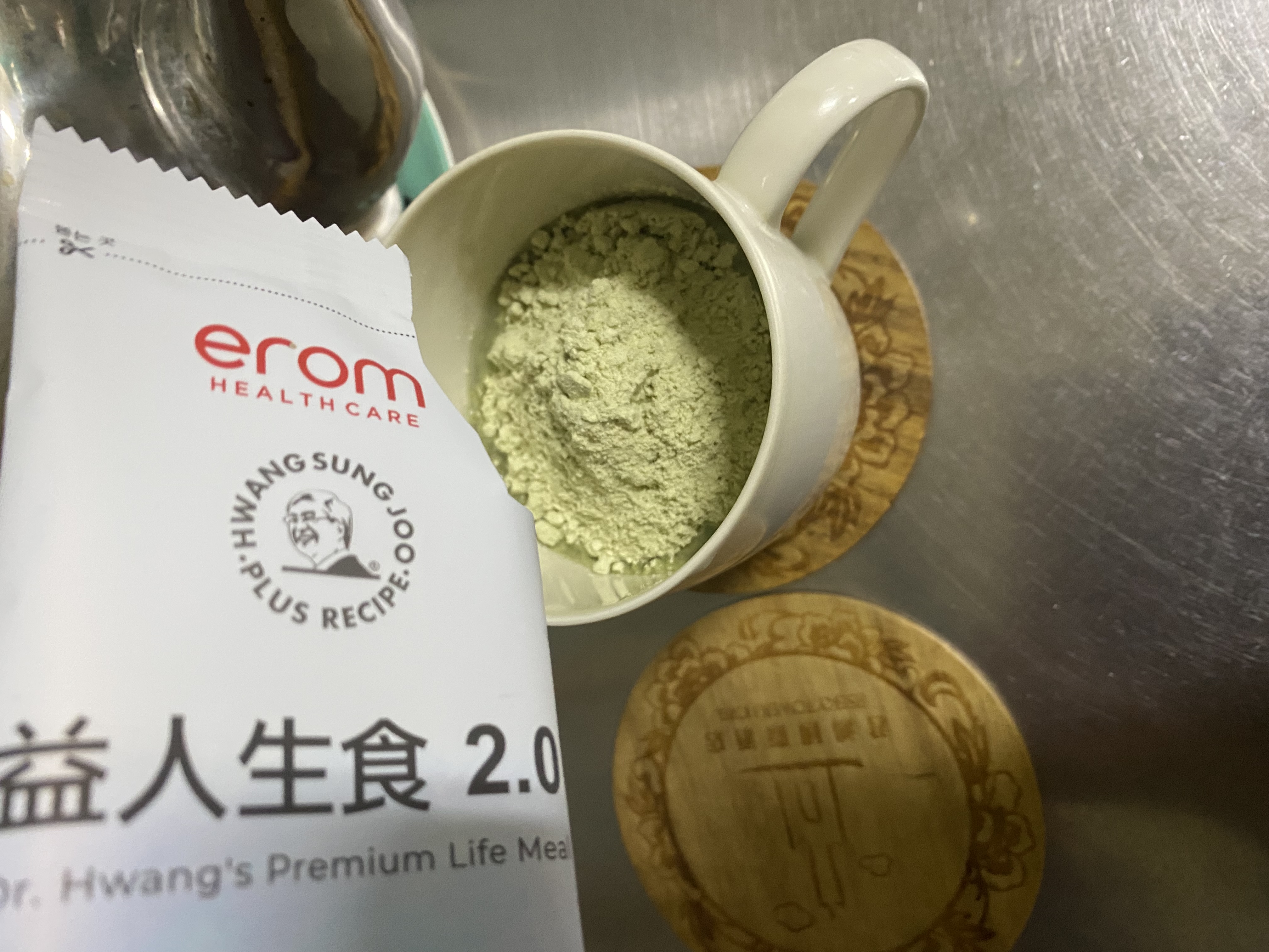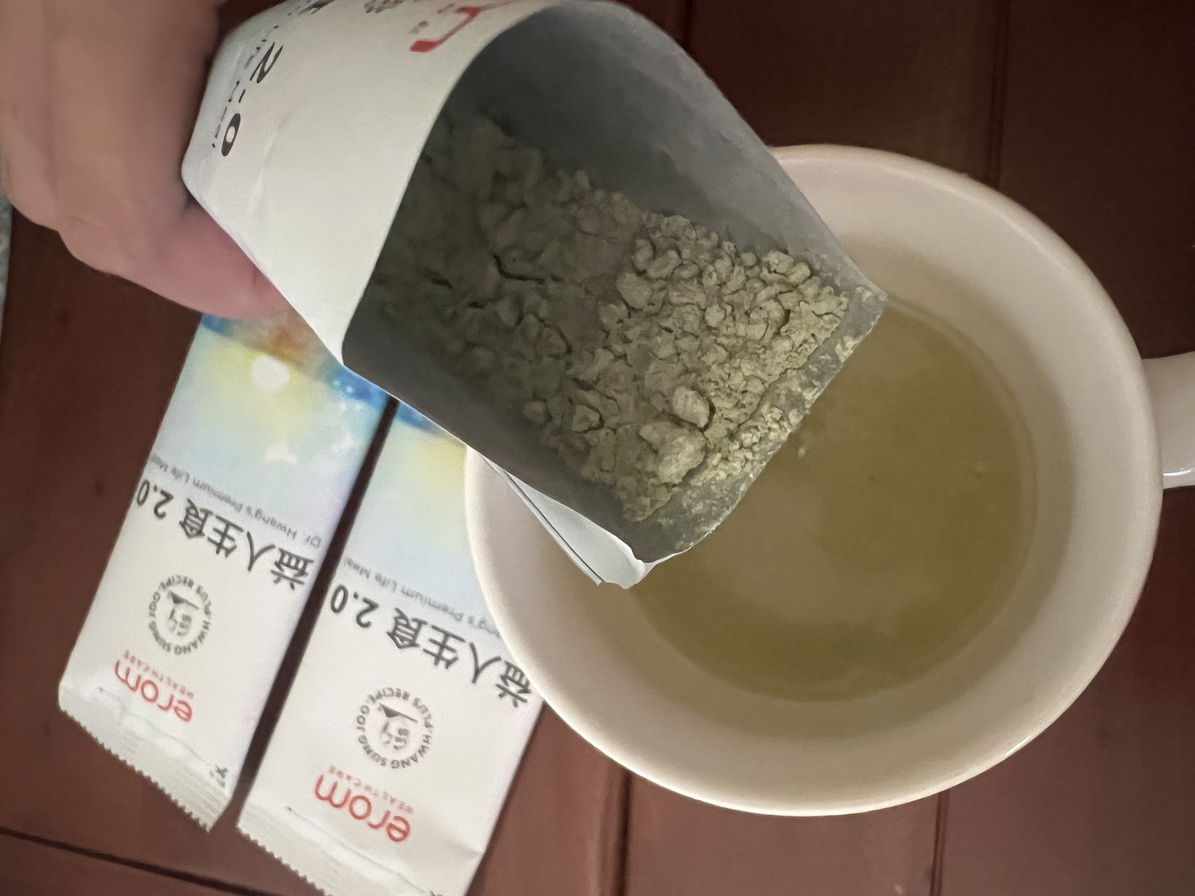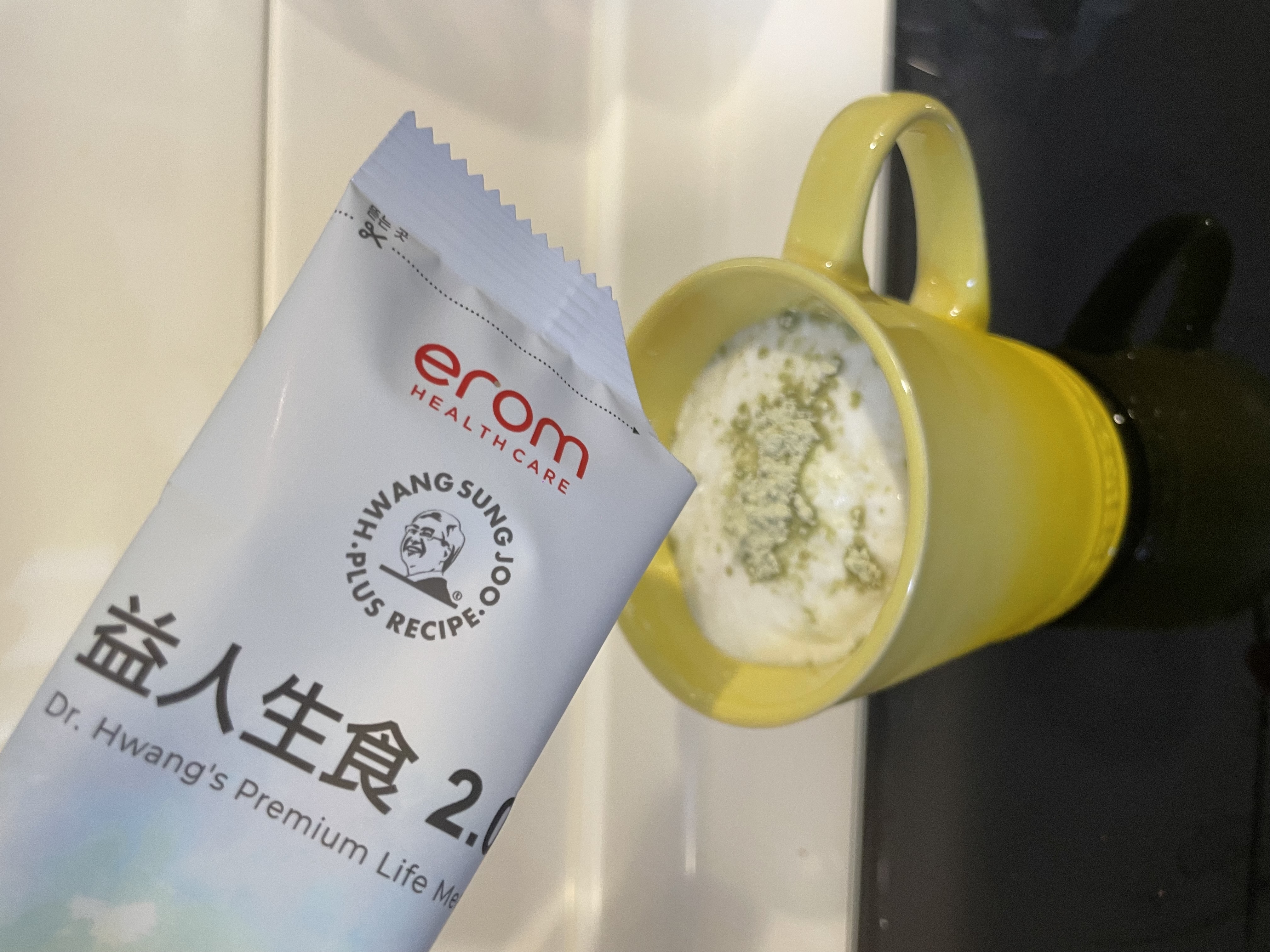 身為媽媽,早餐對我來說一定要有熱熱的主食,像是包子、饅頭加蛋,再配上一杯豆漿,才有飽足感。不過這樣的組合,常常蔬果攝取就比較不足。這次體驗 erom 益人生食 2.0,我就直接把它加入豆漿裡一起喝,結果非常搭,口感溫和滑順,像豆漿加了淡淡抹茶香,沒有可怕的菜味,小孩也能接受(還很喜歡)。