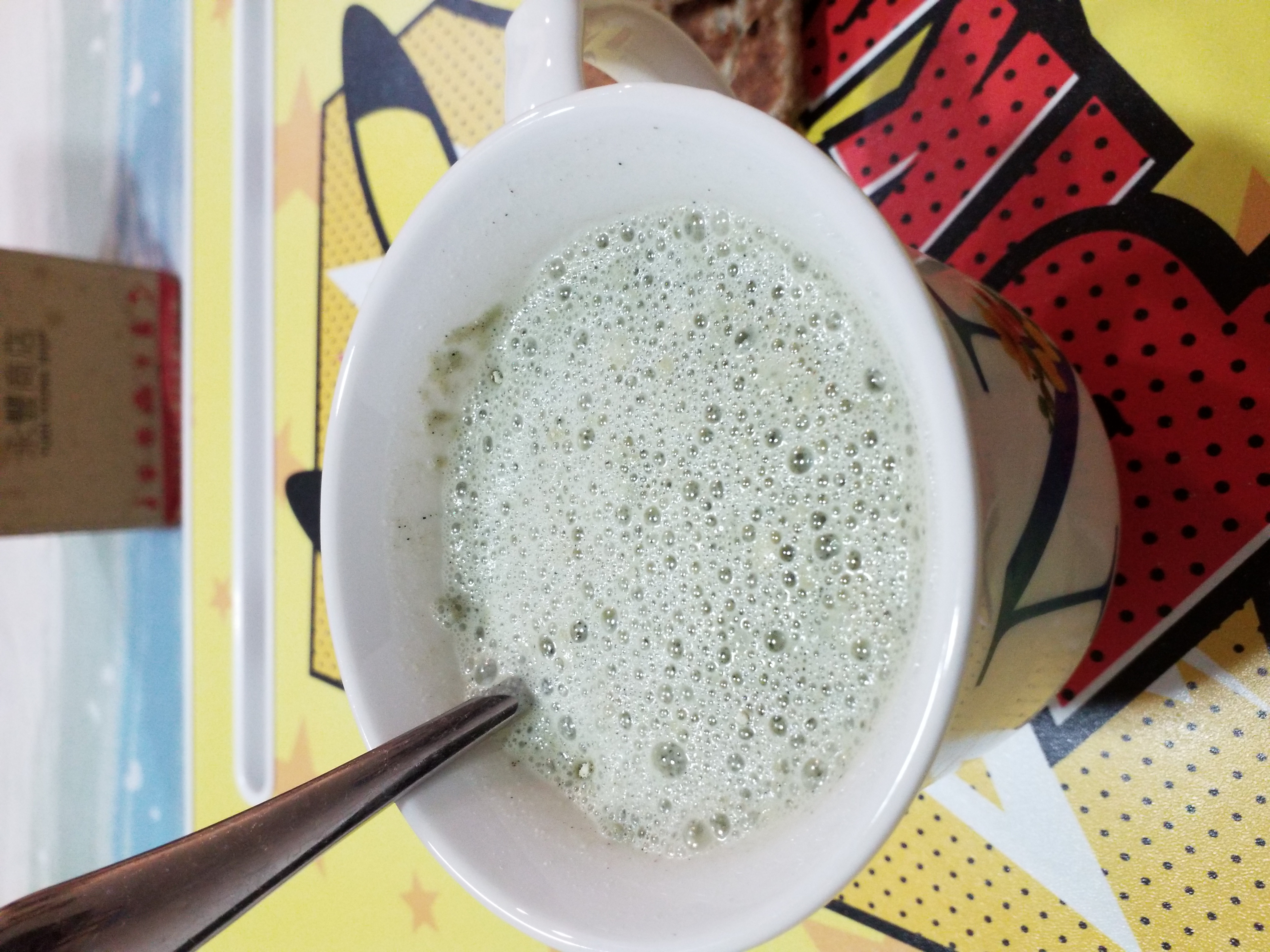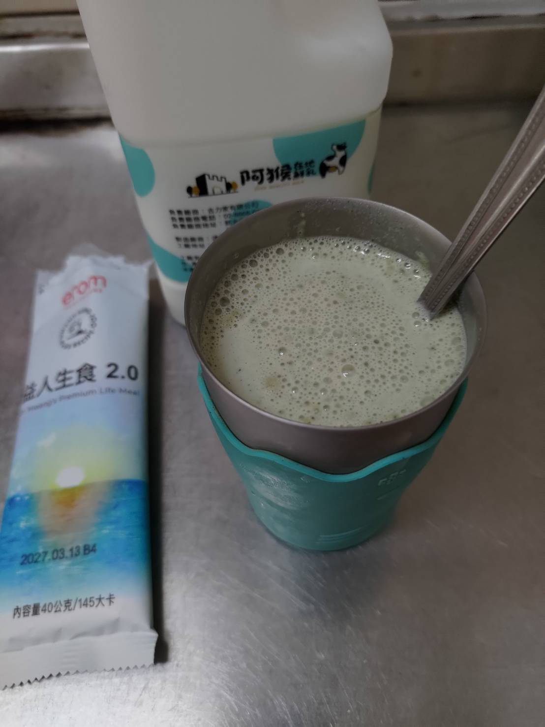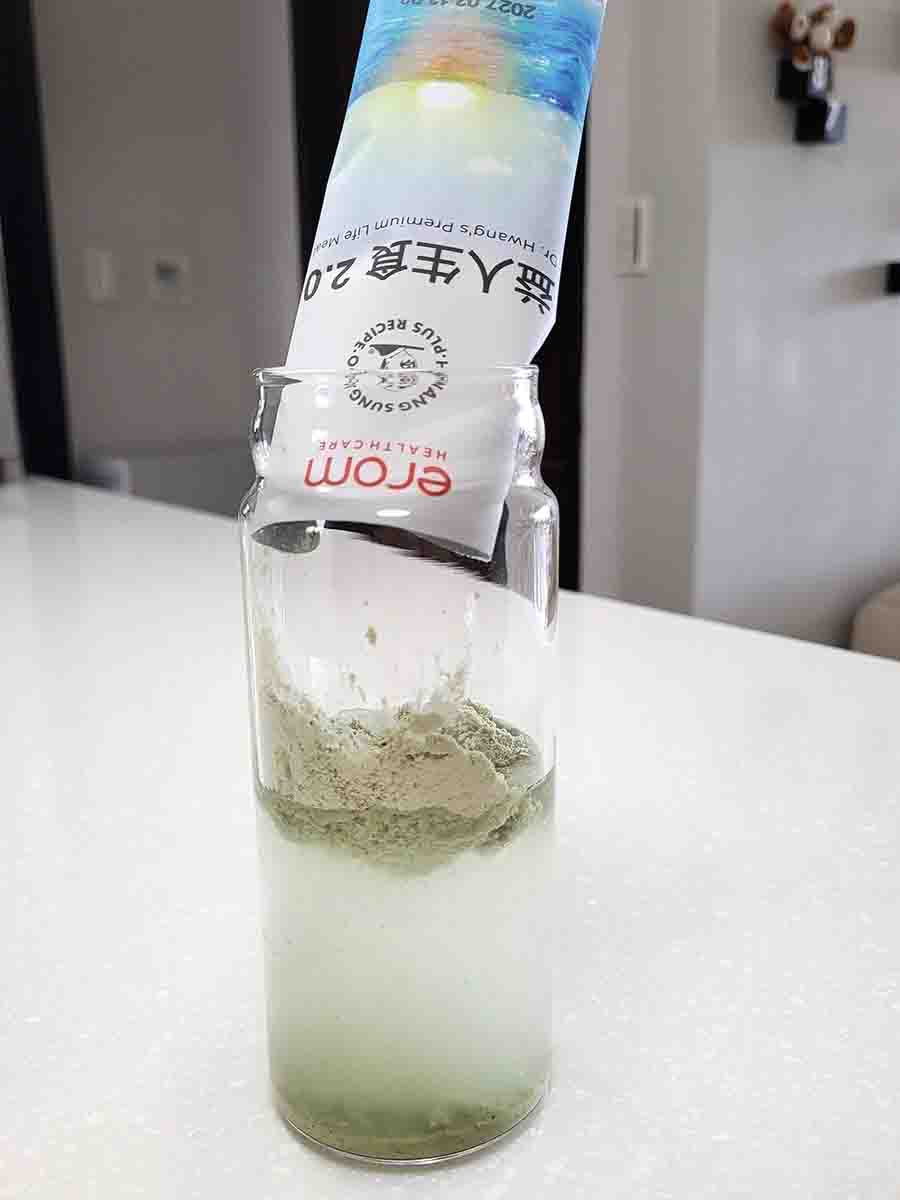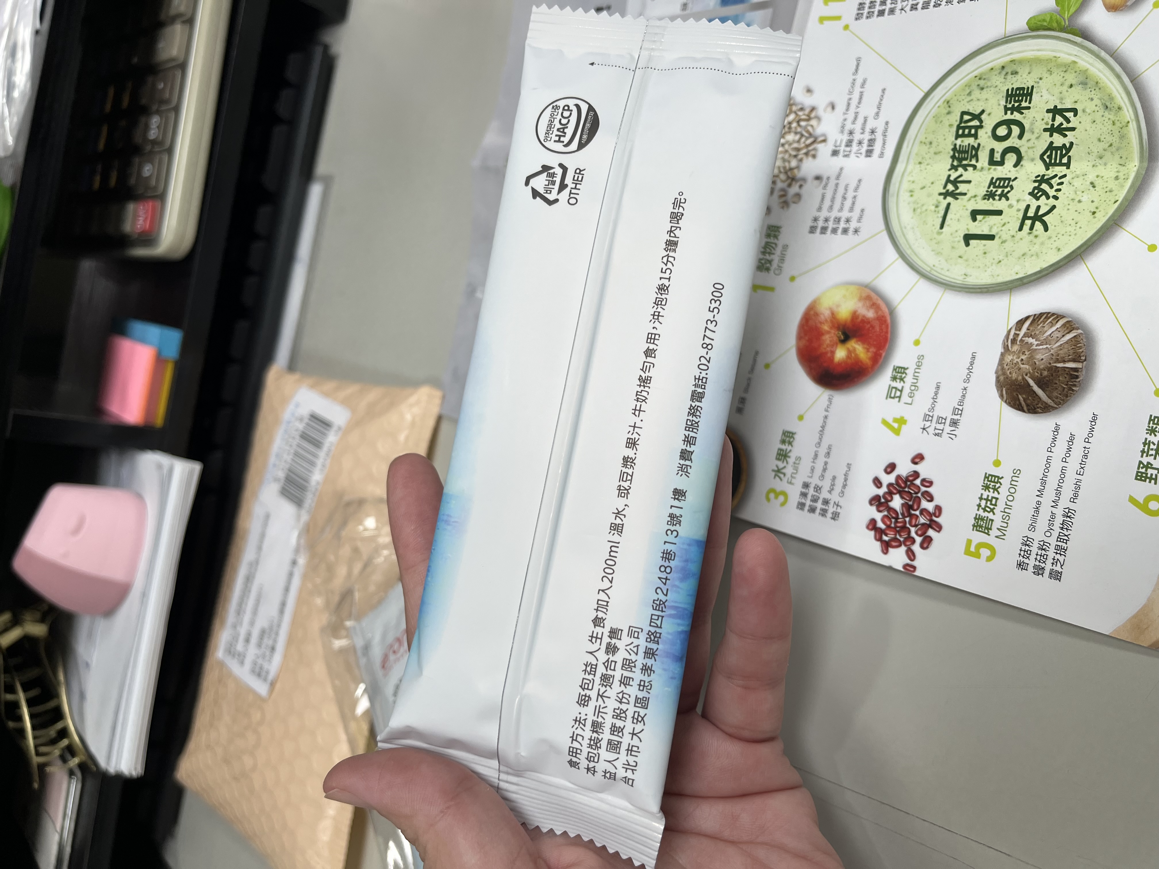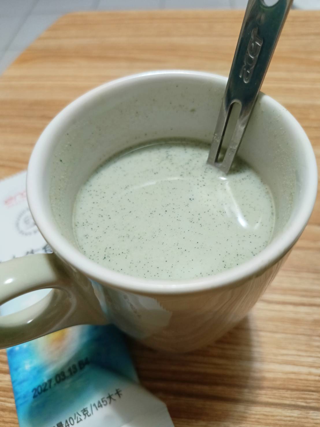 63歲 臺中市沖泡過程:一包粉末倒進杯子裡,加上兩百毫升左右的溫水,搖一搖就能喝。粉末是帶點綠色的,看起來像穀粉。味道有一點青草香,加了豆漿或牛奶更順口,我自己最常用無糖豆漿,喝起來比較滑順,也比較有飽足感。