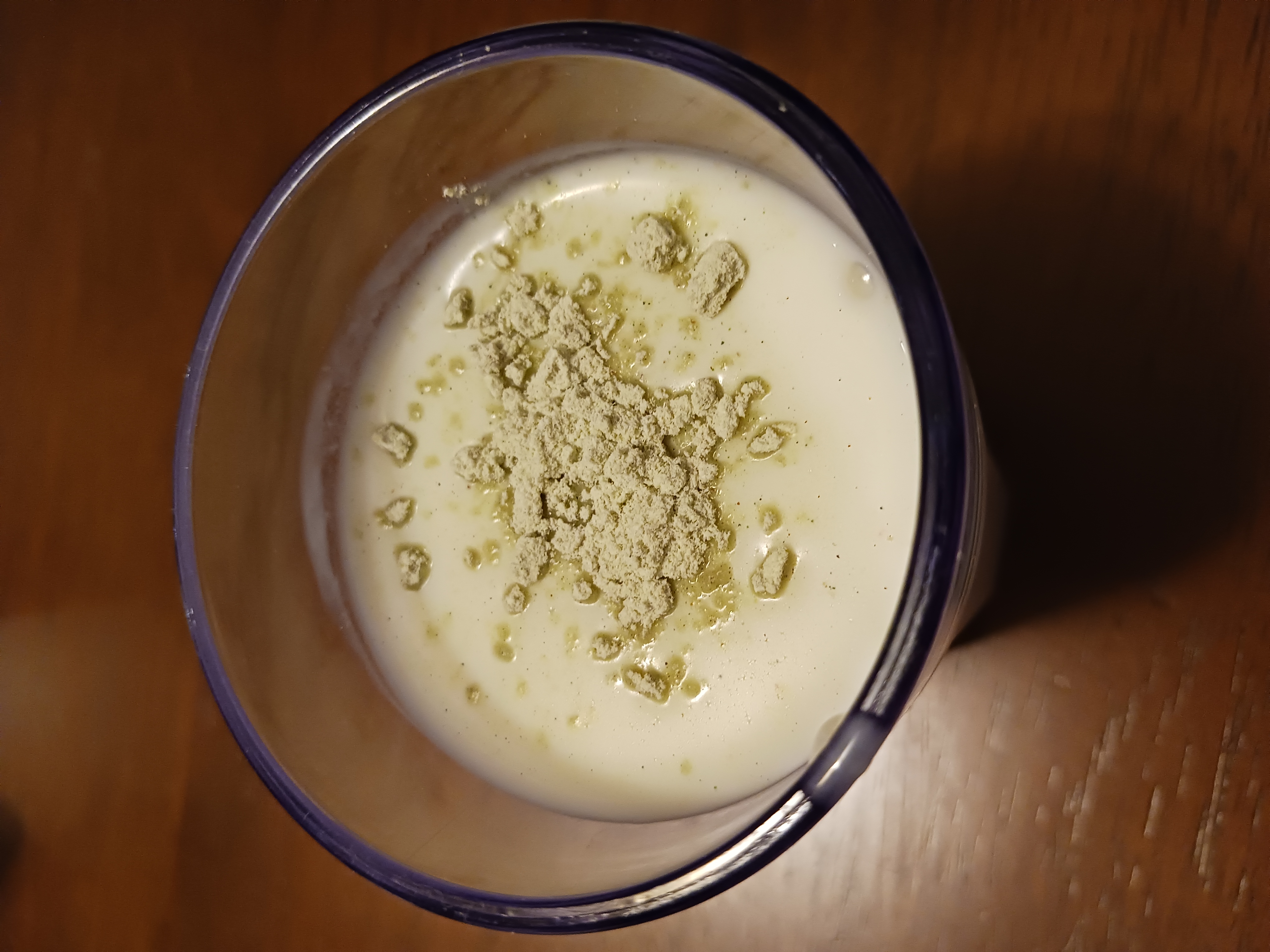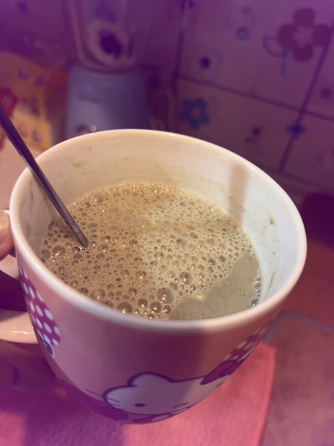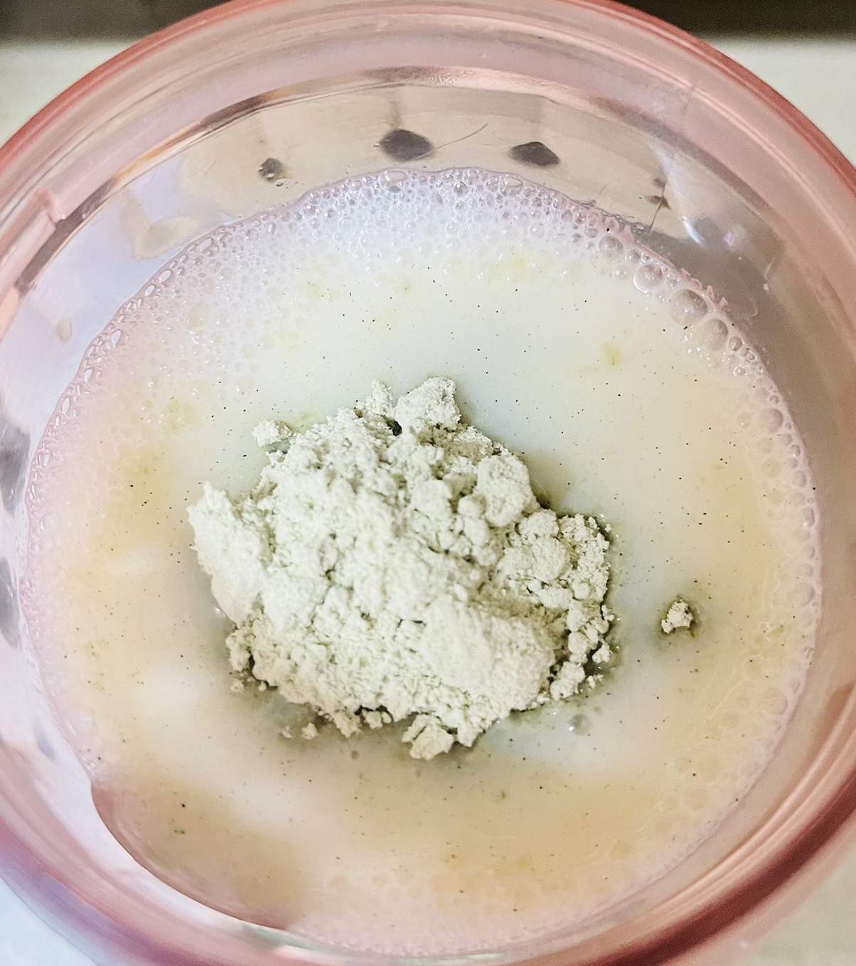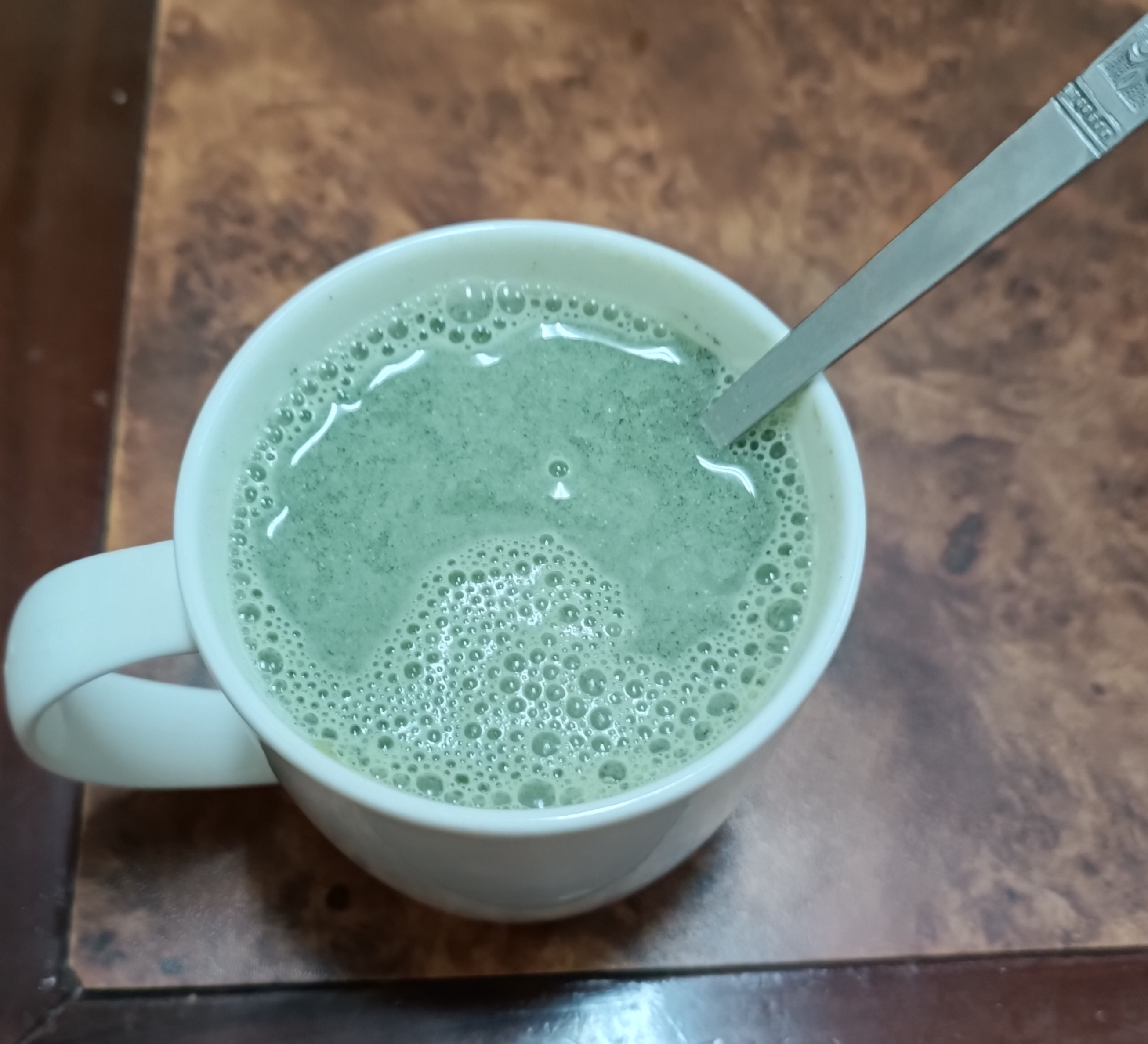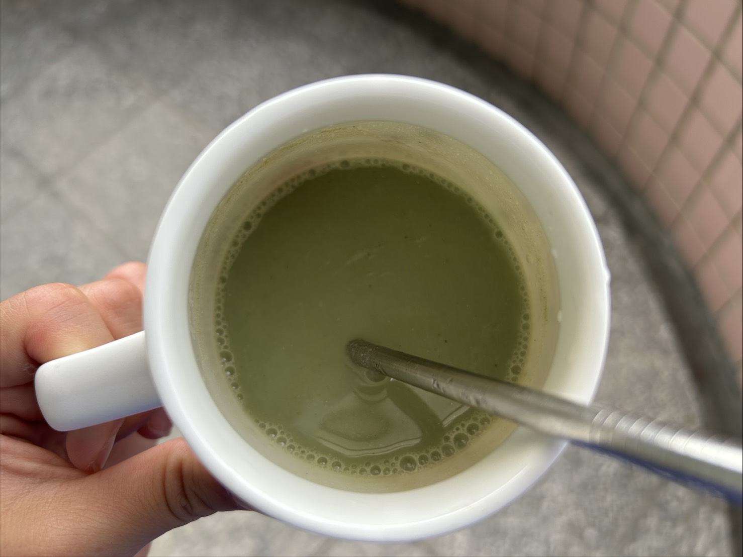 63歲 臺中市沖泡過程:一包粉末倒進杯子裡,加上兩百毫升左右的溫水,搖一搖就能喝。粉末是帶點綠色的,看起來像穀粉。味道有一點青草香,加了豆漿或牛奶更順口,我自己最常用無糖豆漿,喝起來比較滑順,也比較有飽足感。