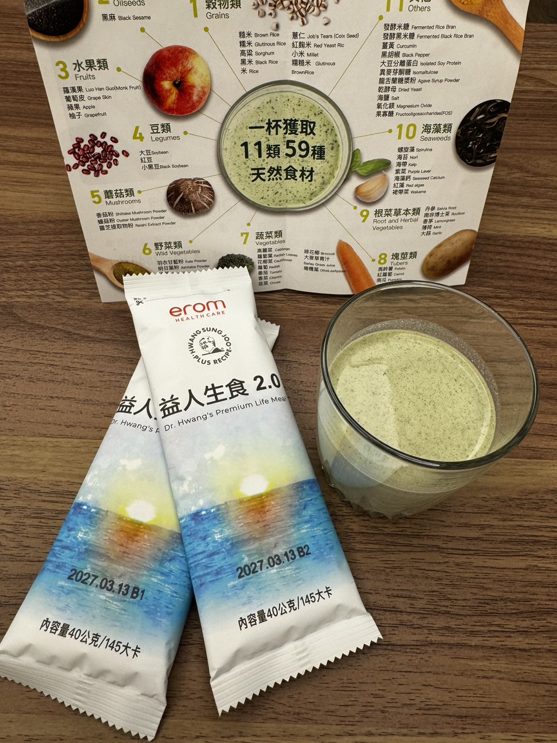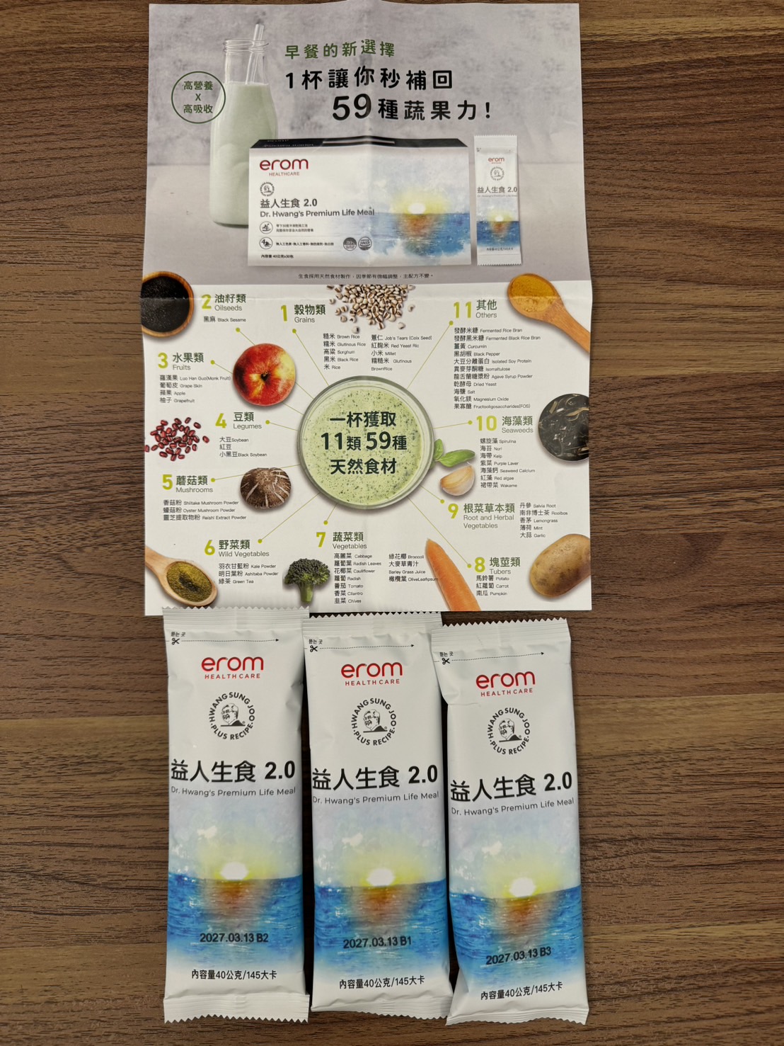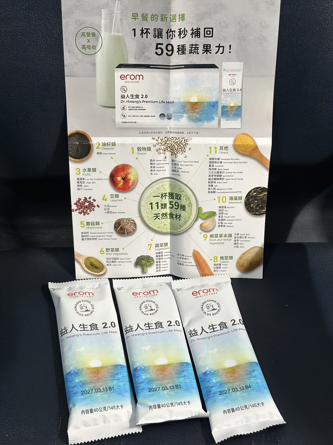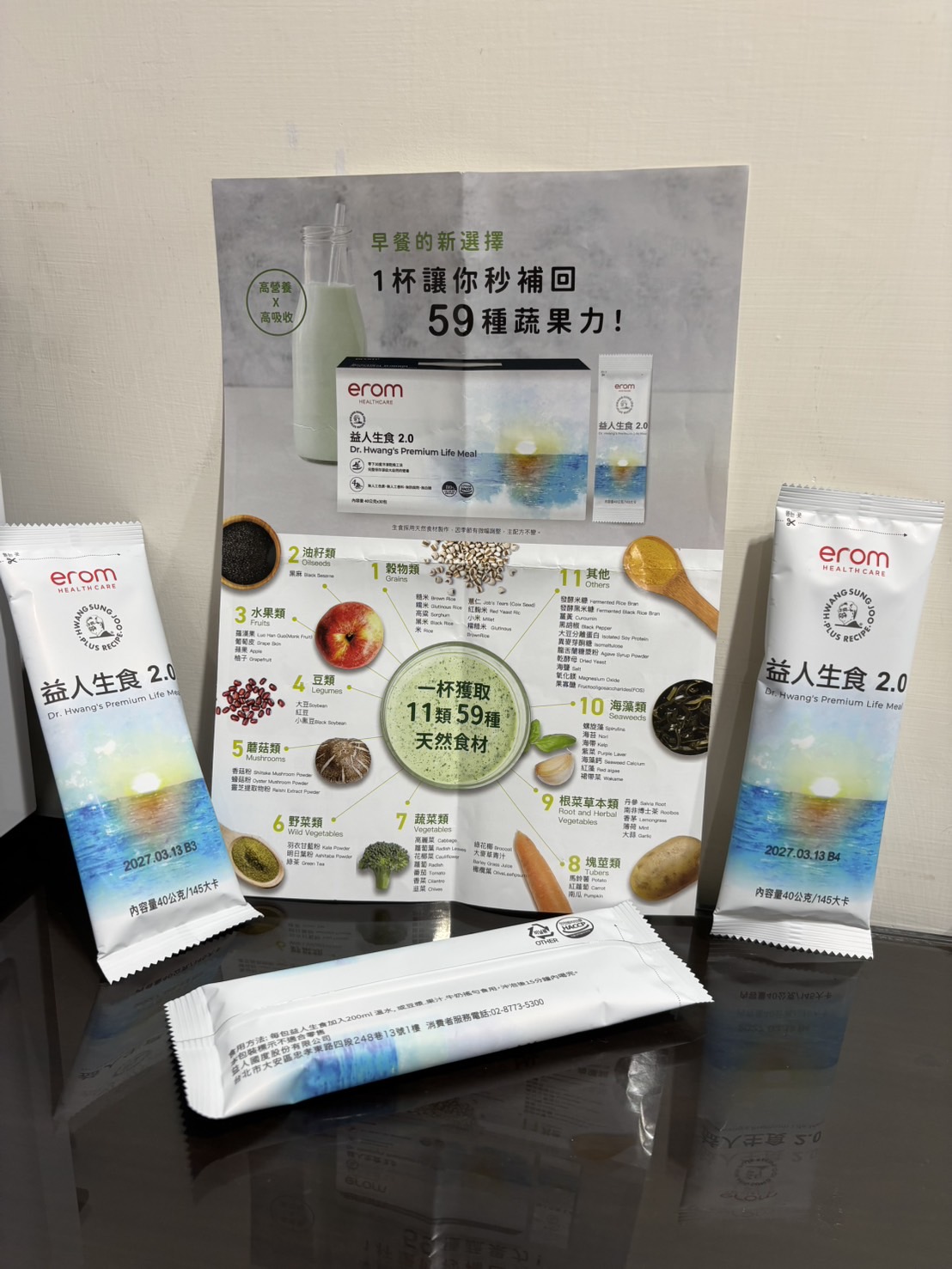 Erom益人生食2.0給我帶來的感受相當驚喜!只要一分鐘,就能輕鬆沖泡完成,卻能補充多達59種蔬果與天然食材的營養,完全符合現代人忙碌生活卻又想兼顧健康的需求。每包僅145大卡,卻富含穀物、堅果、蔬菜、海藻、豆類等十一大類食材,讓我在早餐或加班時都能快速獲得均衡能量。口感自然清爽,不會過甜或有人工添加的負擔,搭配牛奶或豆漿更是美味。它不僅方便,更讓我每天補充到平常難以攝取的營養,對腸胃與體力的調整也很有幫助。對於想要簡單又全面照顧健康的人來說,益人生食2.0絕對是最佳的營養補充方案。