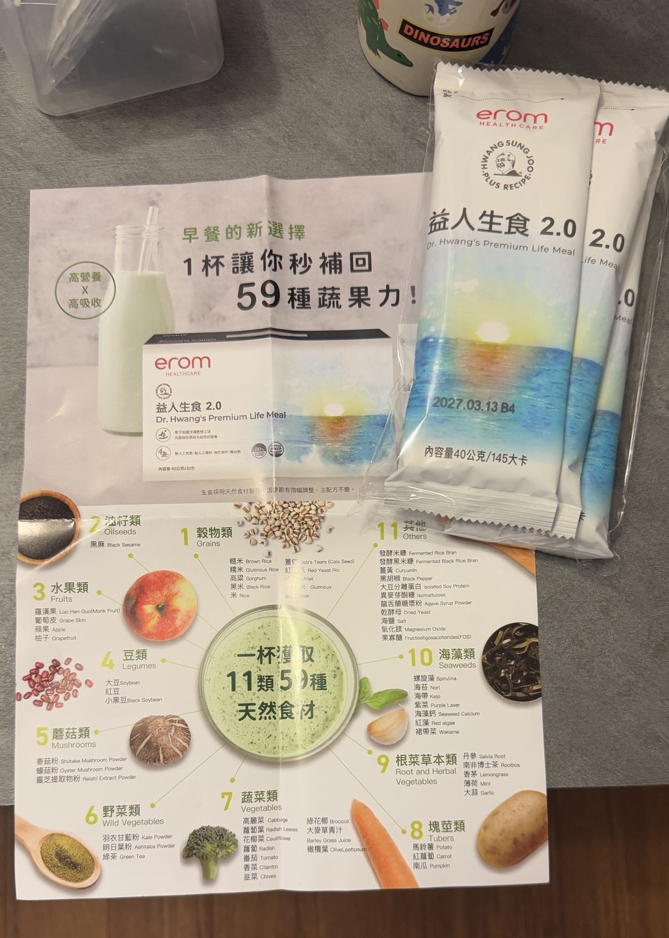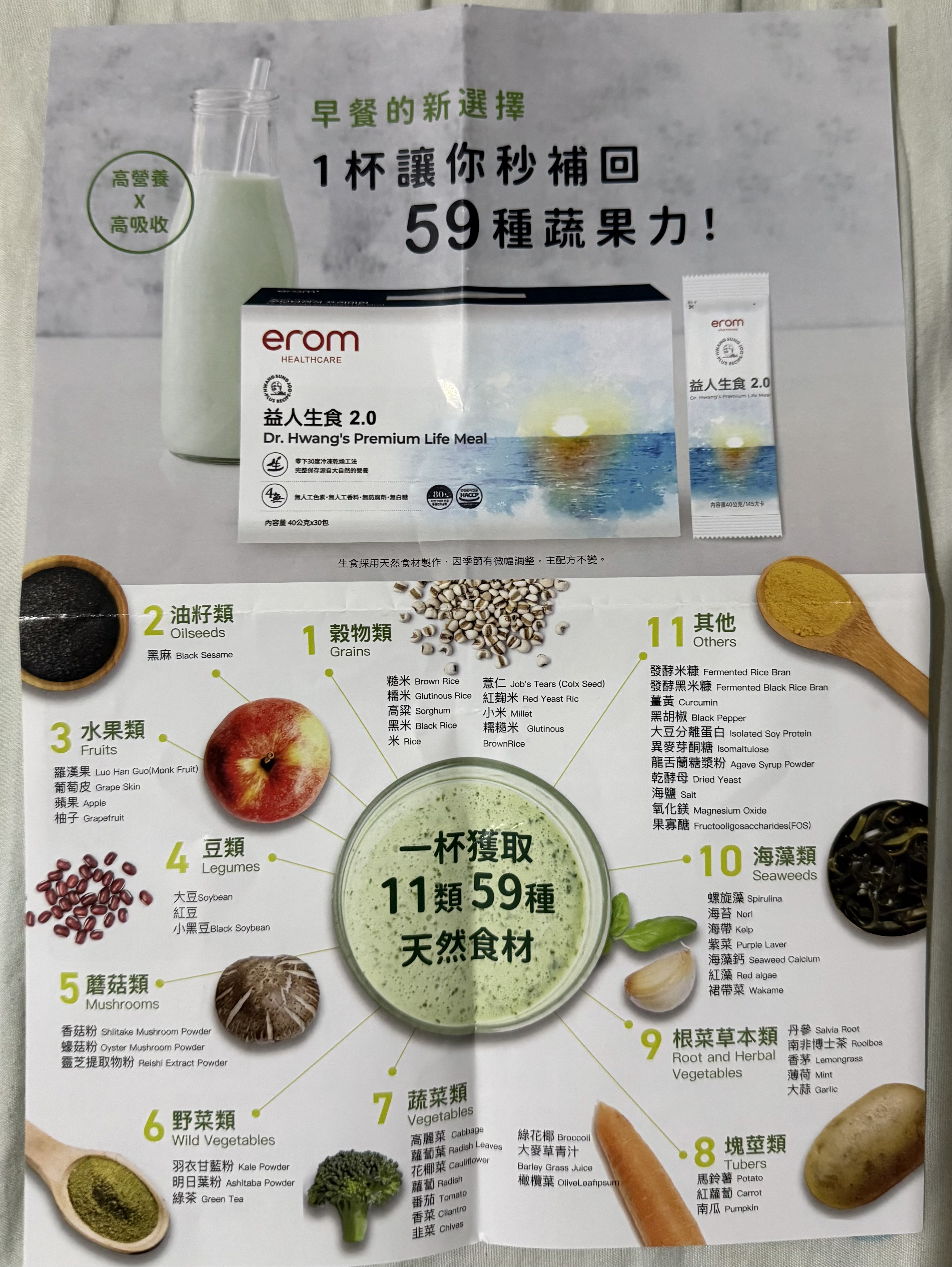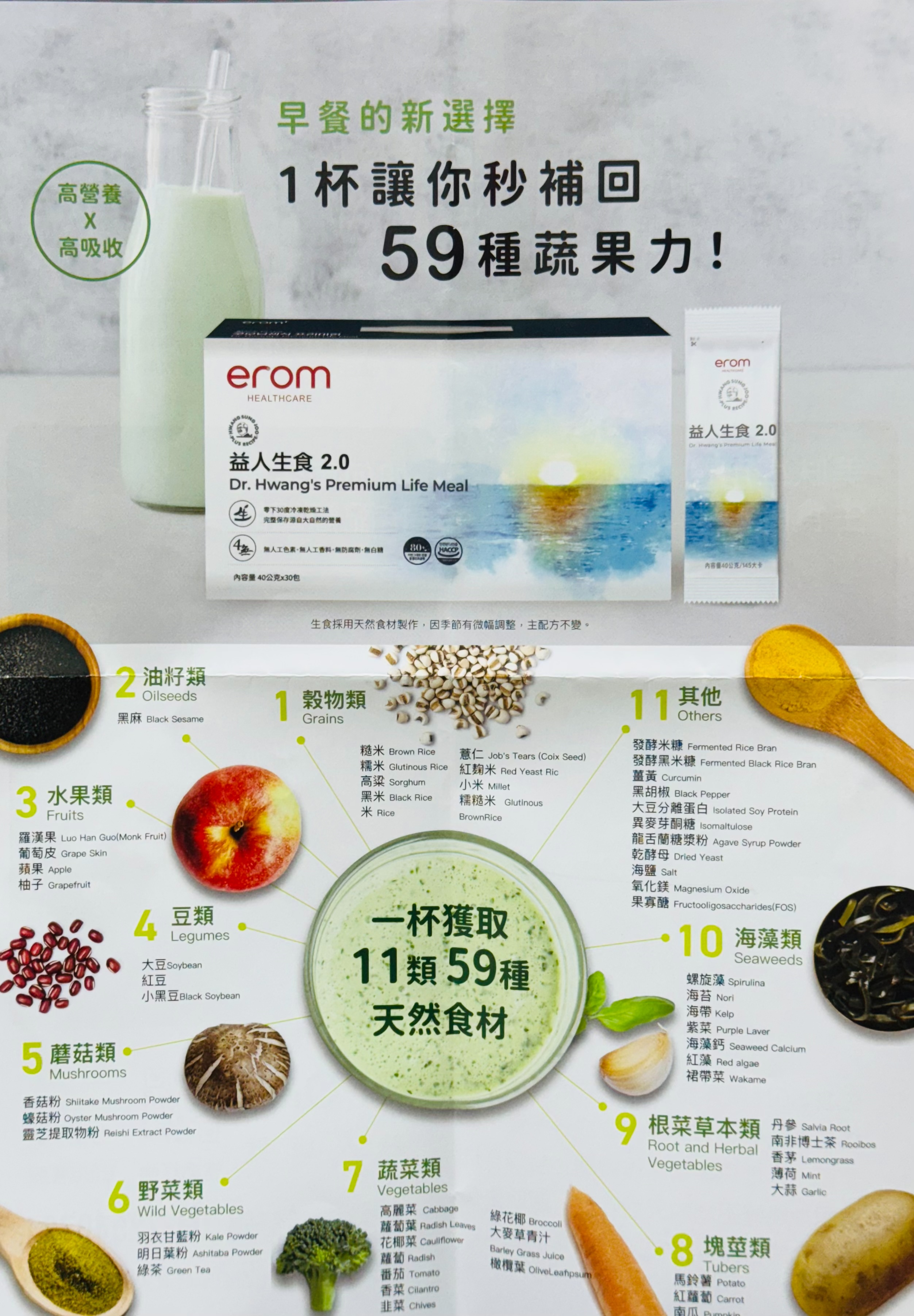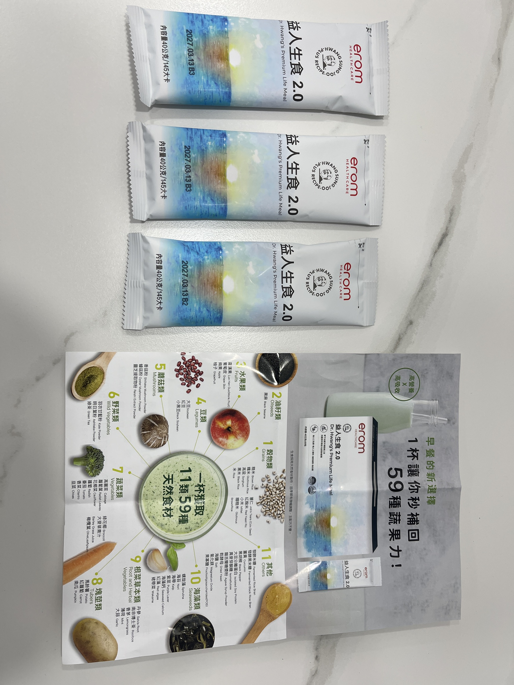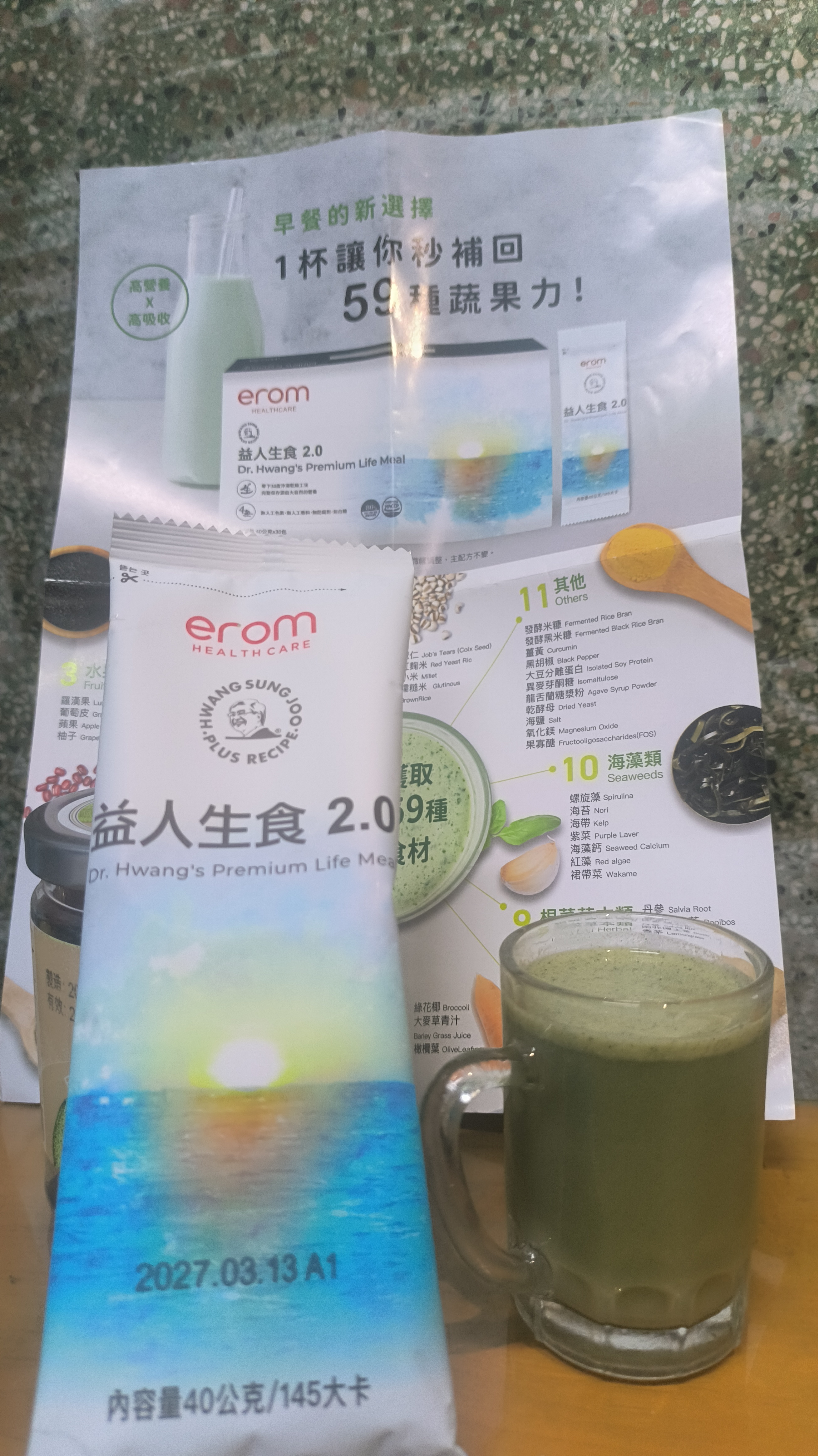 Erom益人生食2.0給我帶來的感受相當驚喜!只要一分鐘,就能輕鬆沖泡完成,卻能補充多達59種蔬果與天然食材的營養,完全符合現代人忙碌生活卻又想兼顧健康的需求。每包僅145大卡,卻富含穀物、堅果、蔬菜、海藻、豆類等十一大類食材,讓我在早餐或加班時都能快速獲得均衡能量。口感自然清爽,不會過甜或有人工添加的負擔,搭配牛奶或豆漿更是美味。它不僅方便,更讓我每天補充到平常難以攝取的營養,對腸胃與體力的調整也很有幫助。對於想要簡單又全面照顧健康的人來說,益人生食2.0絕對是最佳的營養補充方案。