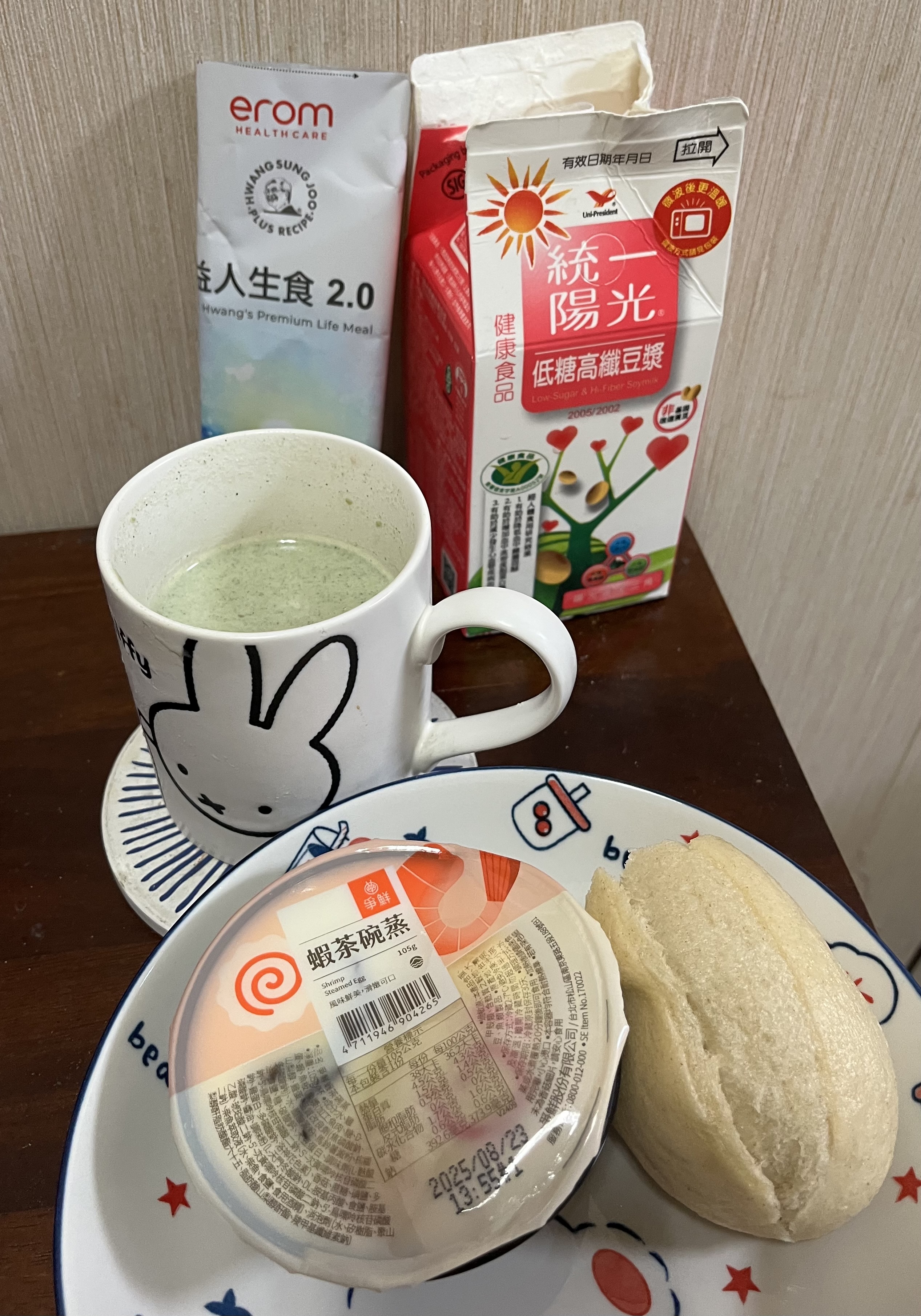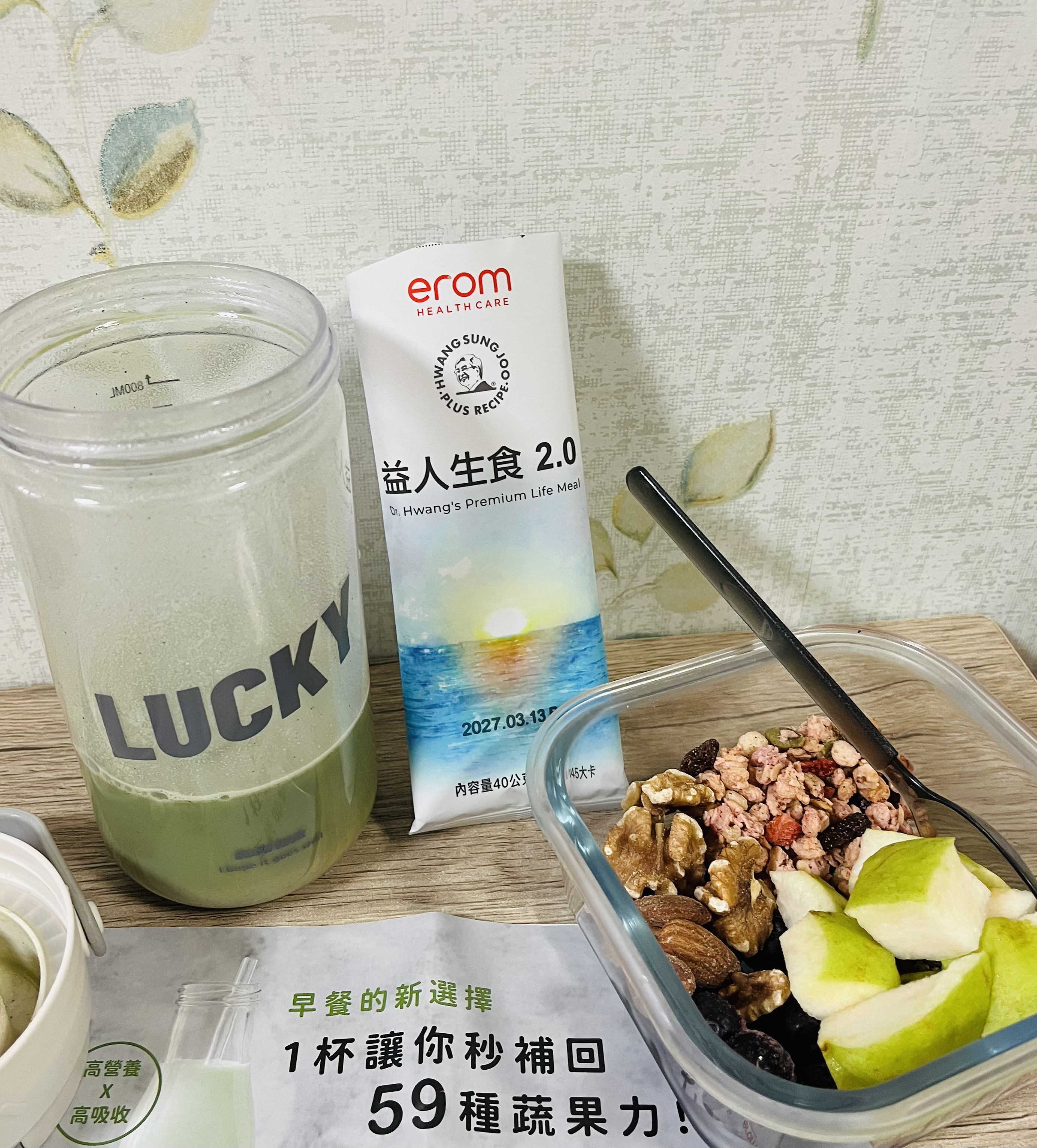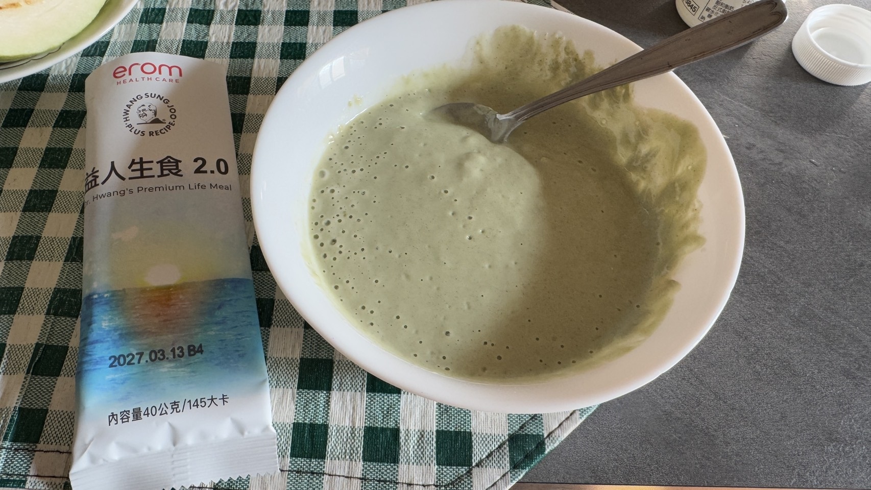 口感比我預期的好很多,不會有青汁那種菜味,而是很溫和、滑順,帶有淡淡的清香,有點像豆漿又帶點抹茶味,喝起來舒服自然。搭配家裡的麥片、堅果和水果(今天切了芭樂)一起吃,飽足感剛剛好,也比只喝飲品更豐盛。