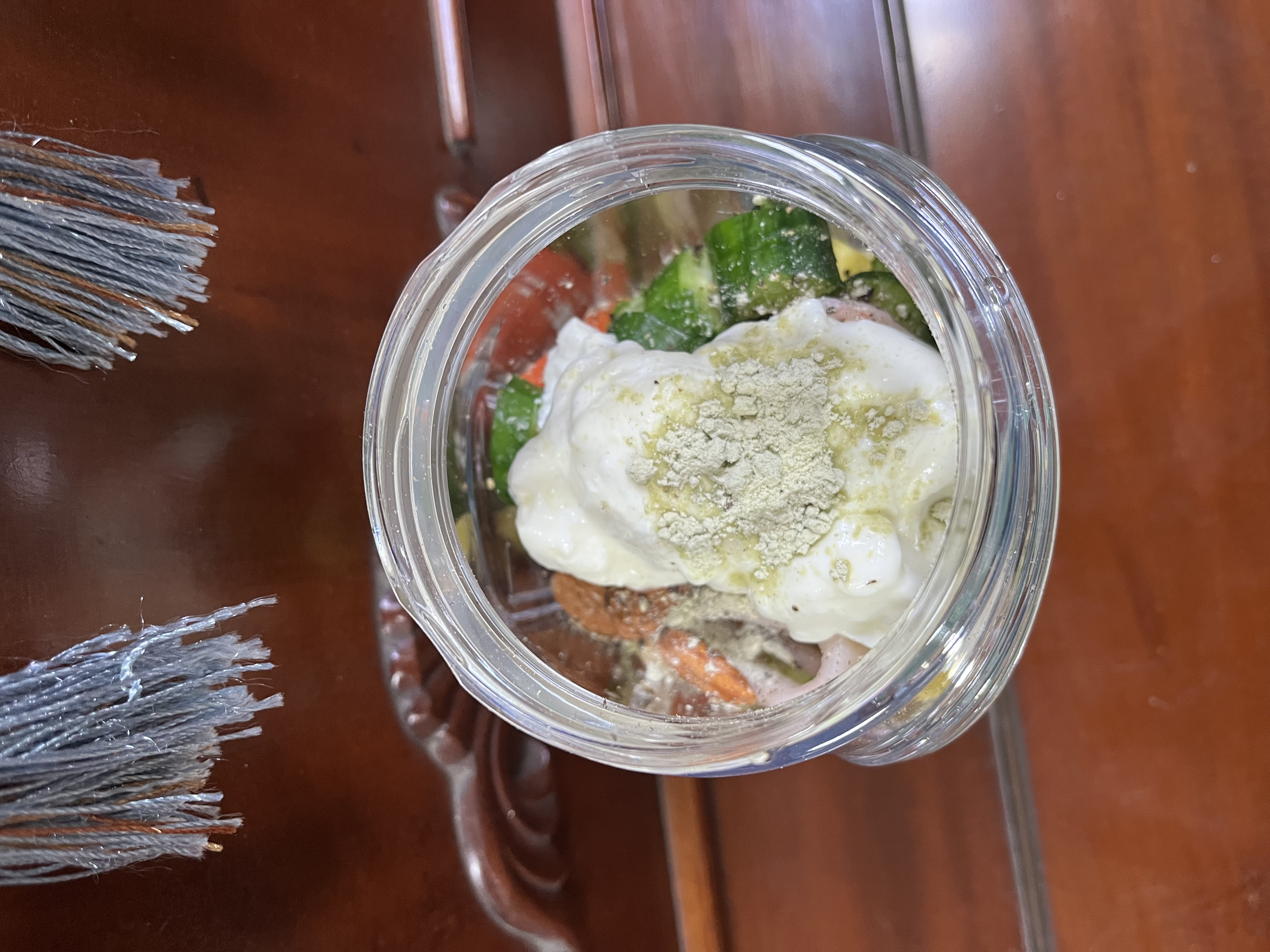 我平常有吃益生菌,但還是會便秘,加上挑食,蔬果攝取真的不太夠。這次把益人生食加進午餐搖搖沙拉(生菜、小黃瓜、海鮮、堅果+希臘優格)裡,風味更清爽,油醋醬也不用放太多,口味超搭無違和感!剩下的粉我直接加進牛奶裡變成綠拿鐵,一樣好入口,還多了一點層次。