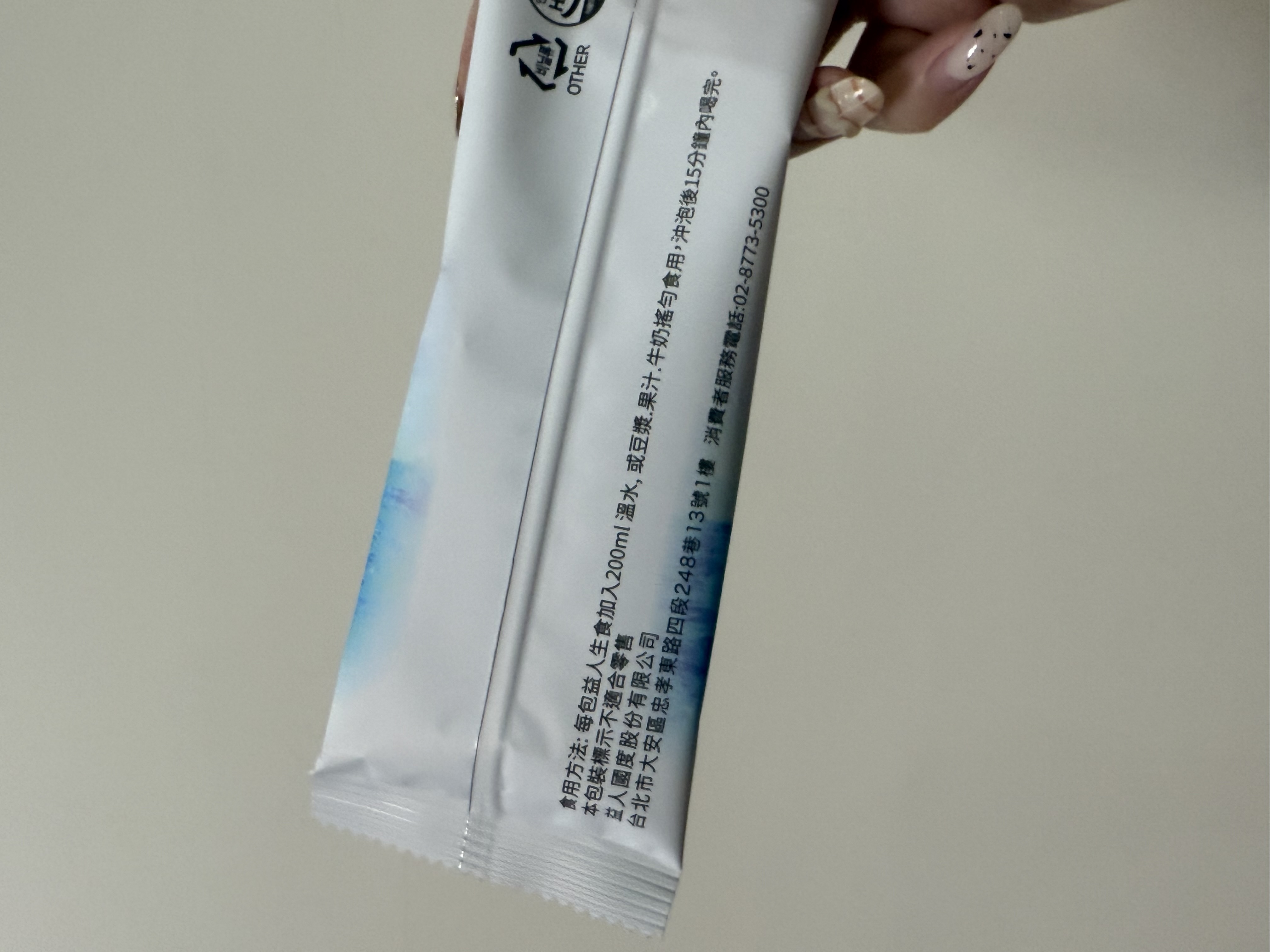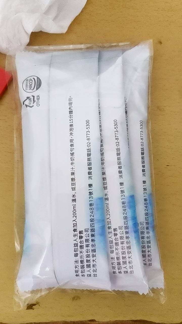 40歲 臺北市外包裝設計上,顏色是很貼近柔和感,讓消費者很容易親近,看到這小包裝產品,一天心情就很棒。身為我上班族,這一包一包的設計,外出攜帶很方便,不會占空間,而且使用上不怕受潮,保存相對簡單。雖然是小小一包,但喝完後是有飽足感的,也補充了一天身體所需的營養。喝了三包後,非常推薦給大小朋友的,替我的日常生活中提供另一種營養品選擇喔~