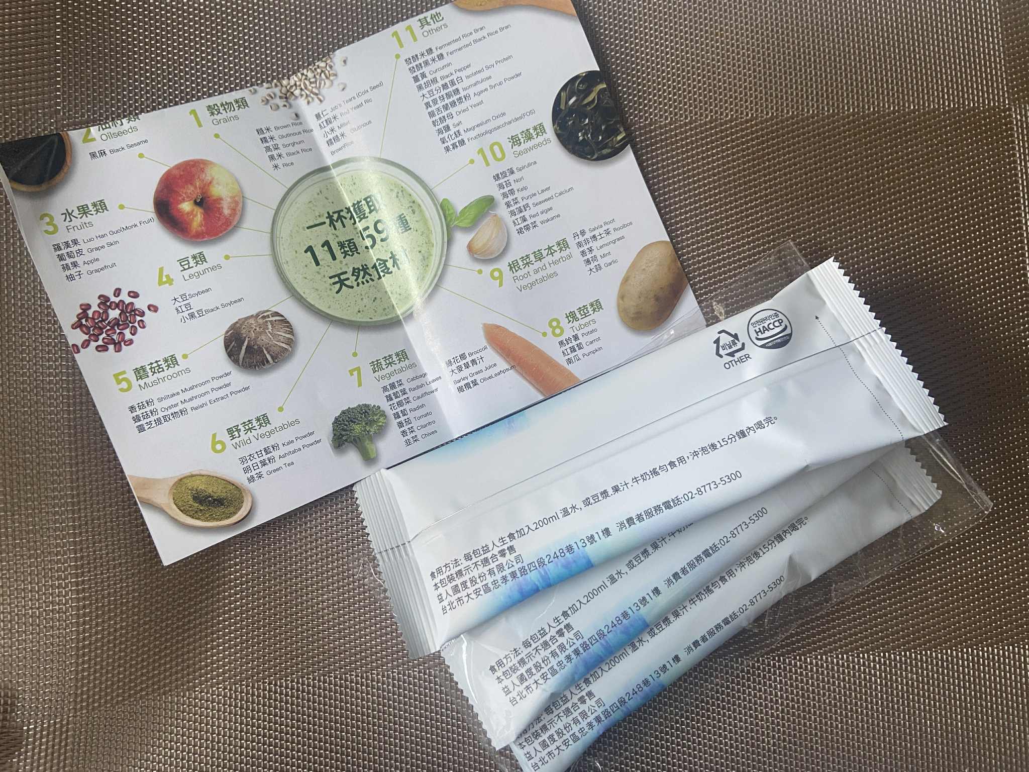 29歲 臺南市拿到試用體用包後,超乎意料的大包,很有分量。因為體驗包沒有附成分展開跟營養標示,所以自己另外找了資料查看成分,成分展開真的每一樣都看得懂(糙米、大麥草、糯米、高粱、黑米、馬鈴薯、大豆、胡蘿蔔、羽衣甘藍、南瓜、米、明日葉葉、薏仁、大豆、紅藻、紅豆、小黑豆、小米、螺旋藻、海鹽、米糠、黑芝麻、高麗菜、黑米糠、果寡醣、蘿蔔葉、花椰菜、蘿蔔、香菇、薑黃、綠茶、花椰菜花、葡萄皮、蘋果、橄欖葉、大蒜、丹參、黑胡椒、糯糙米、韭菜、大麥草青汁、氧化鎂、南非博士茶、香茅、薄荷、香菜、蕃茄、羅漢果、柚子、蠔菇、靈芝、海苔、裙帶菜、海帶、紫菜),可以安心的吃!