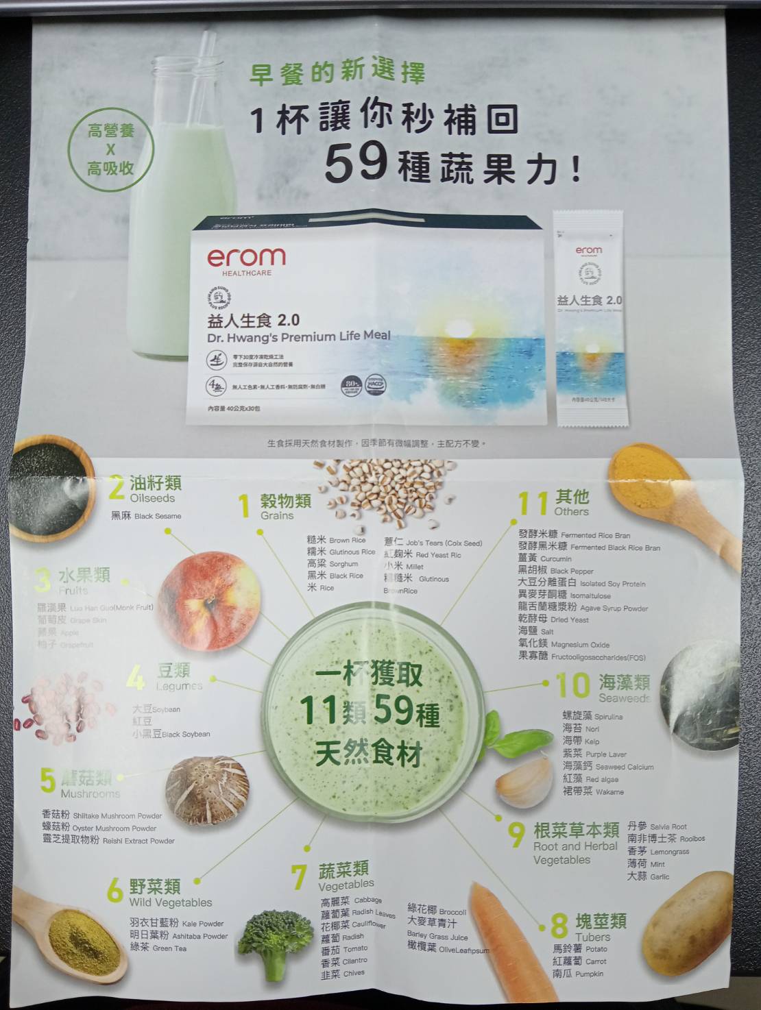 只要簡單的用200ml的溫水,或是牛奶豆漿沖泡一包40g的erom益人生食粉,就可以攝取11類59種的天然食材,一般情況下一個月都不一定能攝取到這麼多種食物,而這一包就含有這麼多種天然食材,隨時取用也便利~