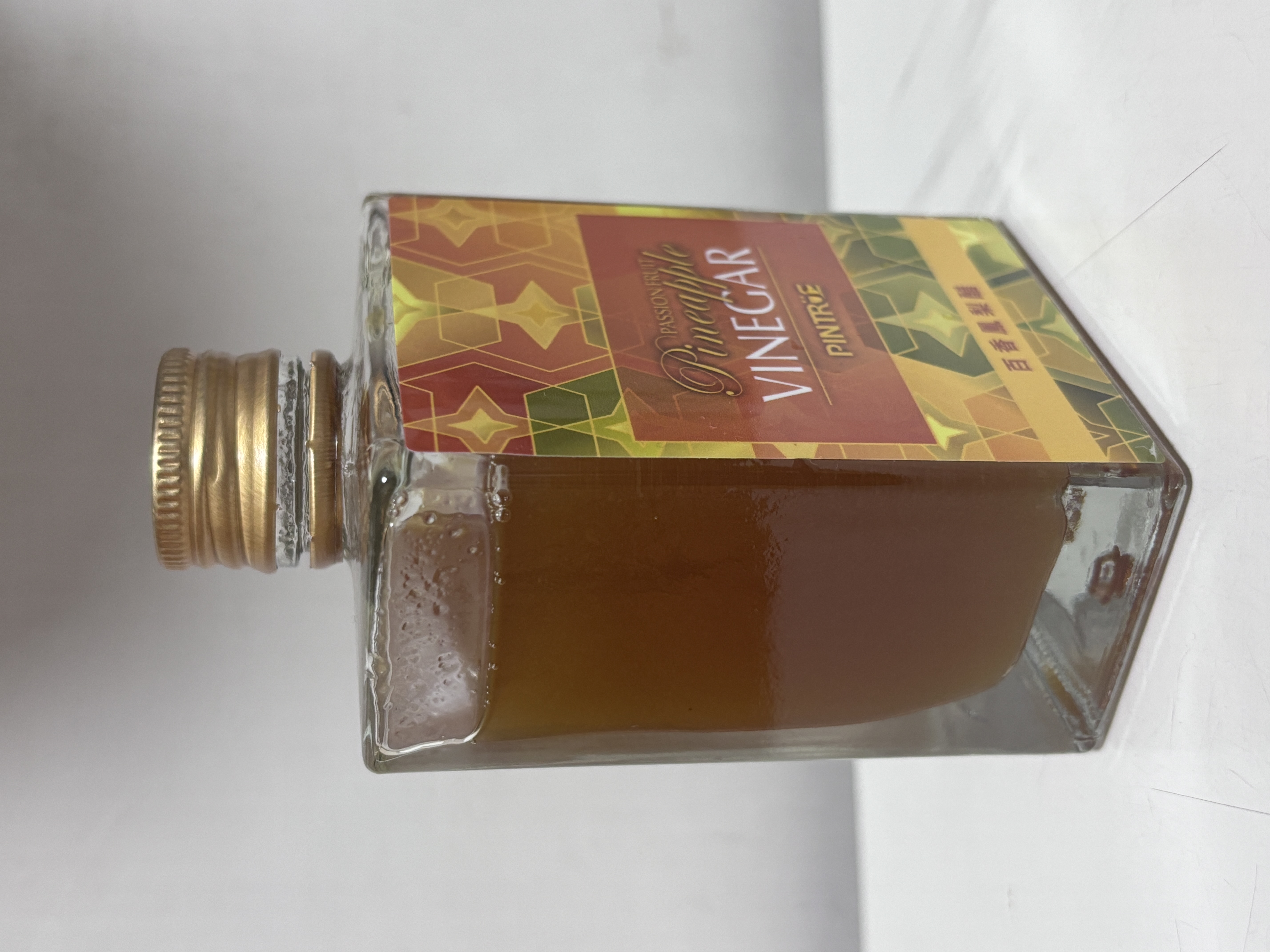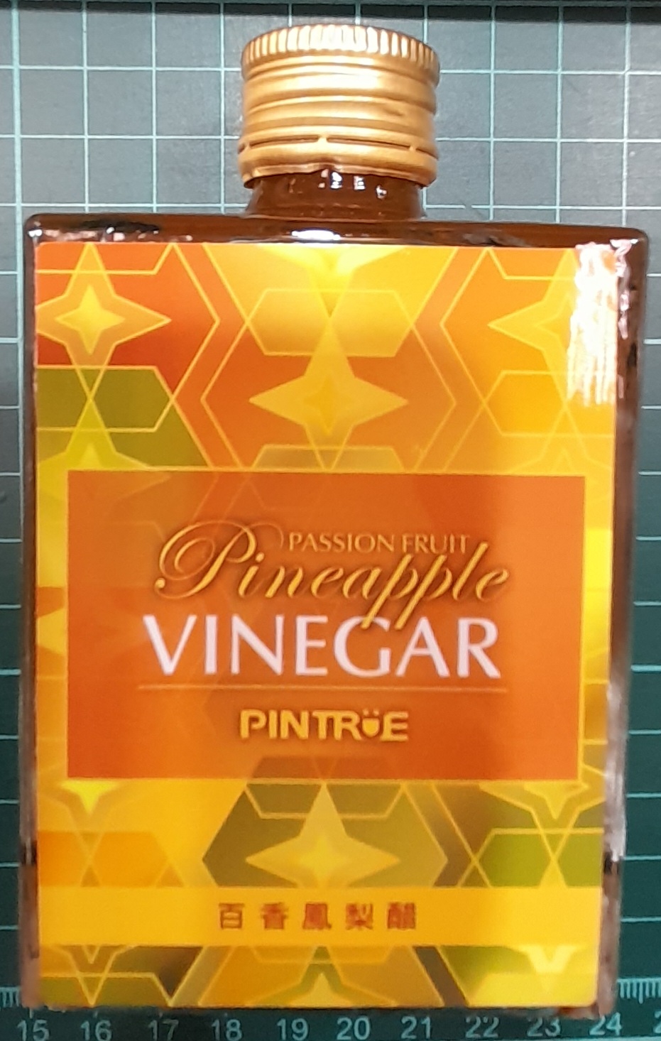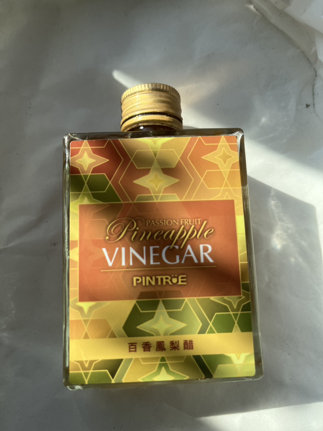 這款百香鳳梨醋的紙盒包裝與瓶身設計十分好看,幾何圖案搭配方形瓶子,看起來像是高級的迷你酒款,在外觀上也具有不錯的辨識度。不過在開瓶時十分費力,由於瓶蓋的下層固定不夠穩固,導致旋轉瓶蓋時上下層會ㄧ起轉動,並伴隨液體滲出,最後是借助橡皮筋固定下層才能順利打開。
