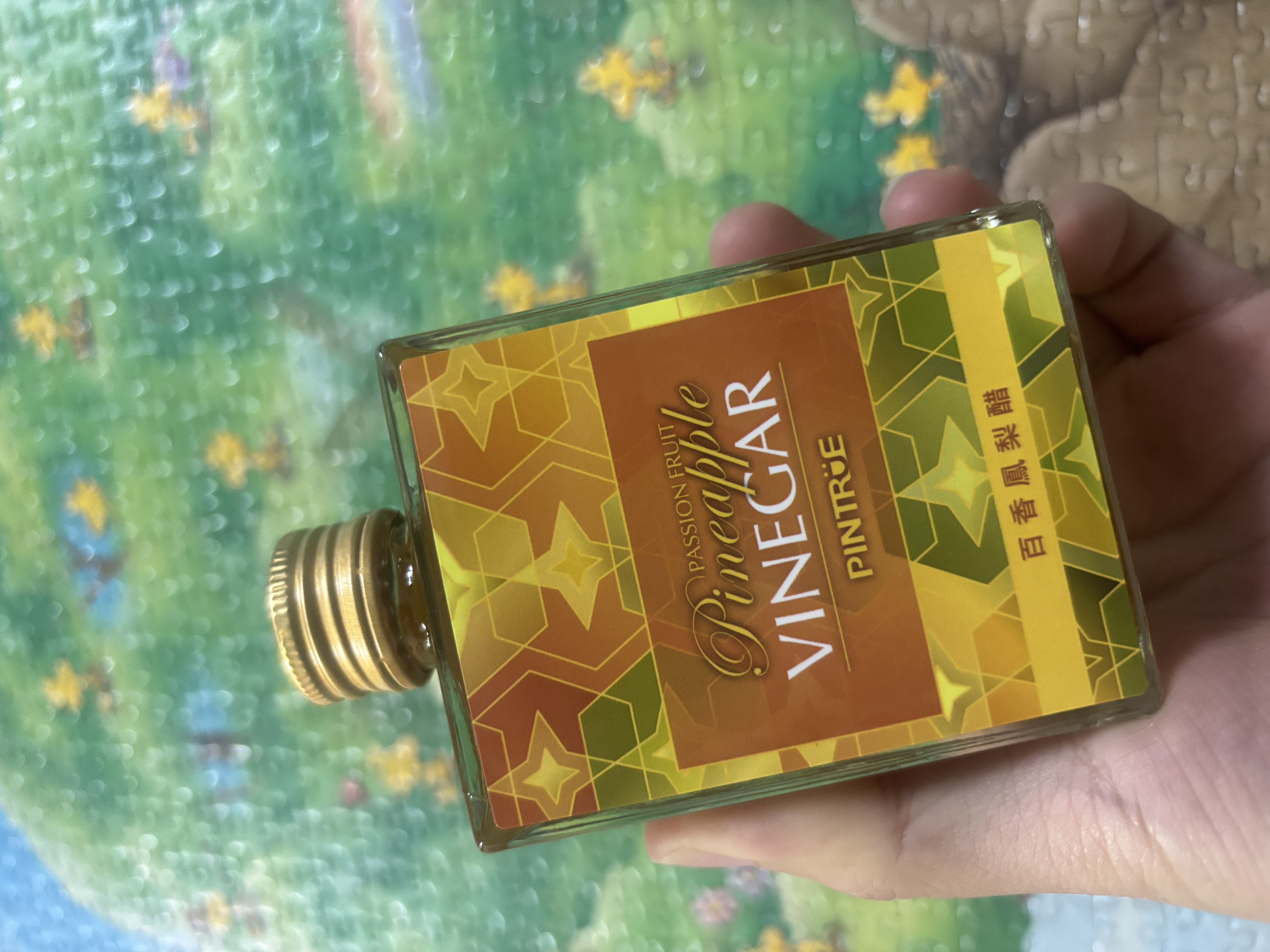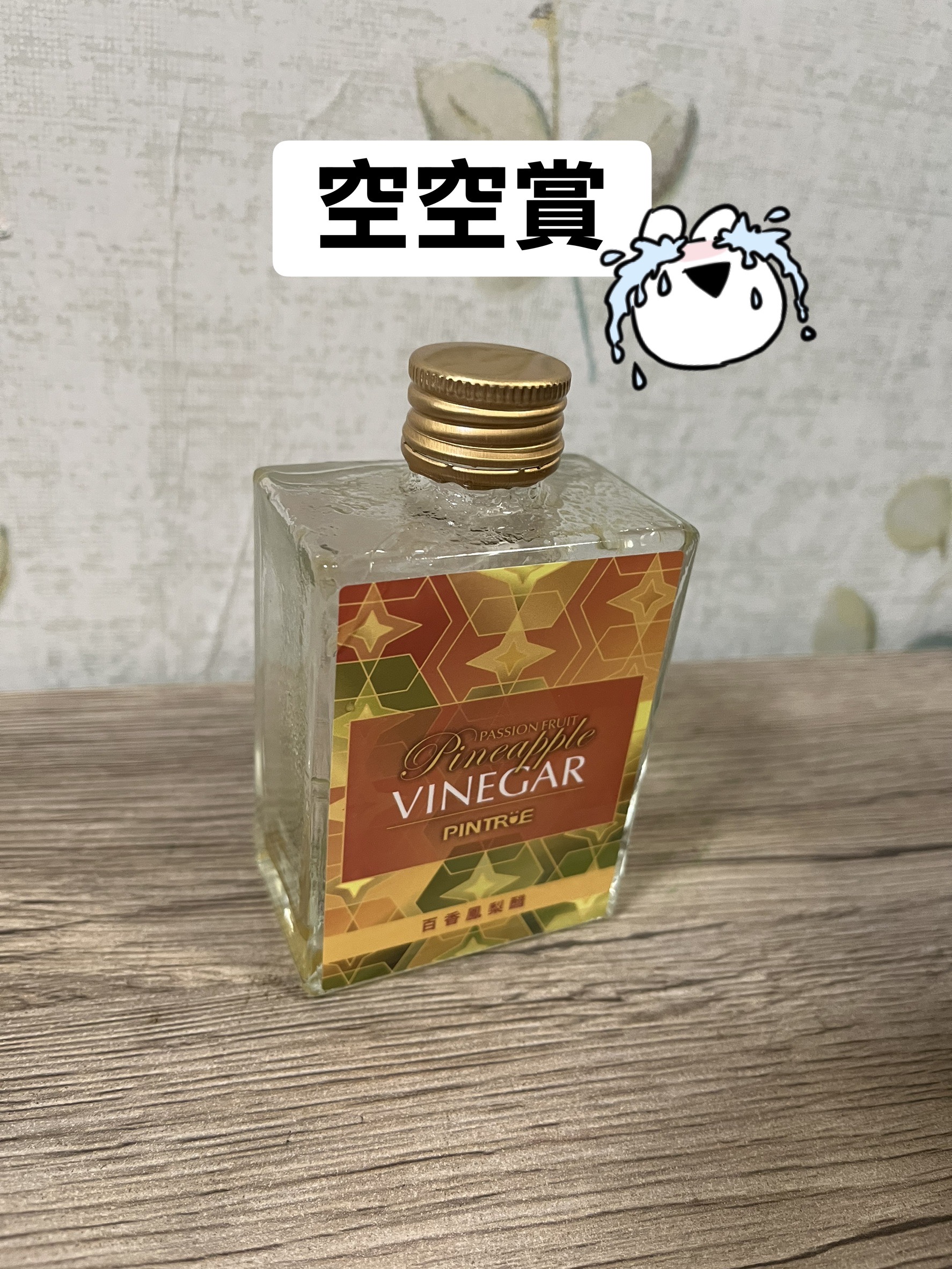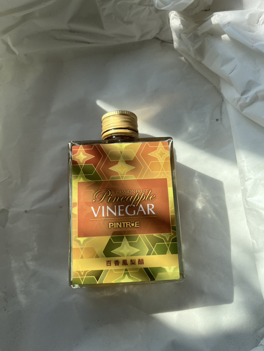 這款百香鳳梨醋的紙盒包裝與瓶身設計十分好看,幾何圖案搭配方形瓶子,看起來像是高級的迷你酒款,在外觀上也具有不錯的辨識度。不過在開瓶時十分費力,由於瓶蓋的下層固定不夠穩固,導致旋轉瓶蓋時上下層會ㄧ起轉動,並伴隨液體滲出,最後是借助橡皮筋固定下層才能順利打開。
