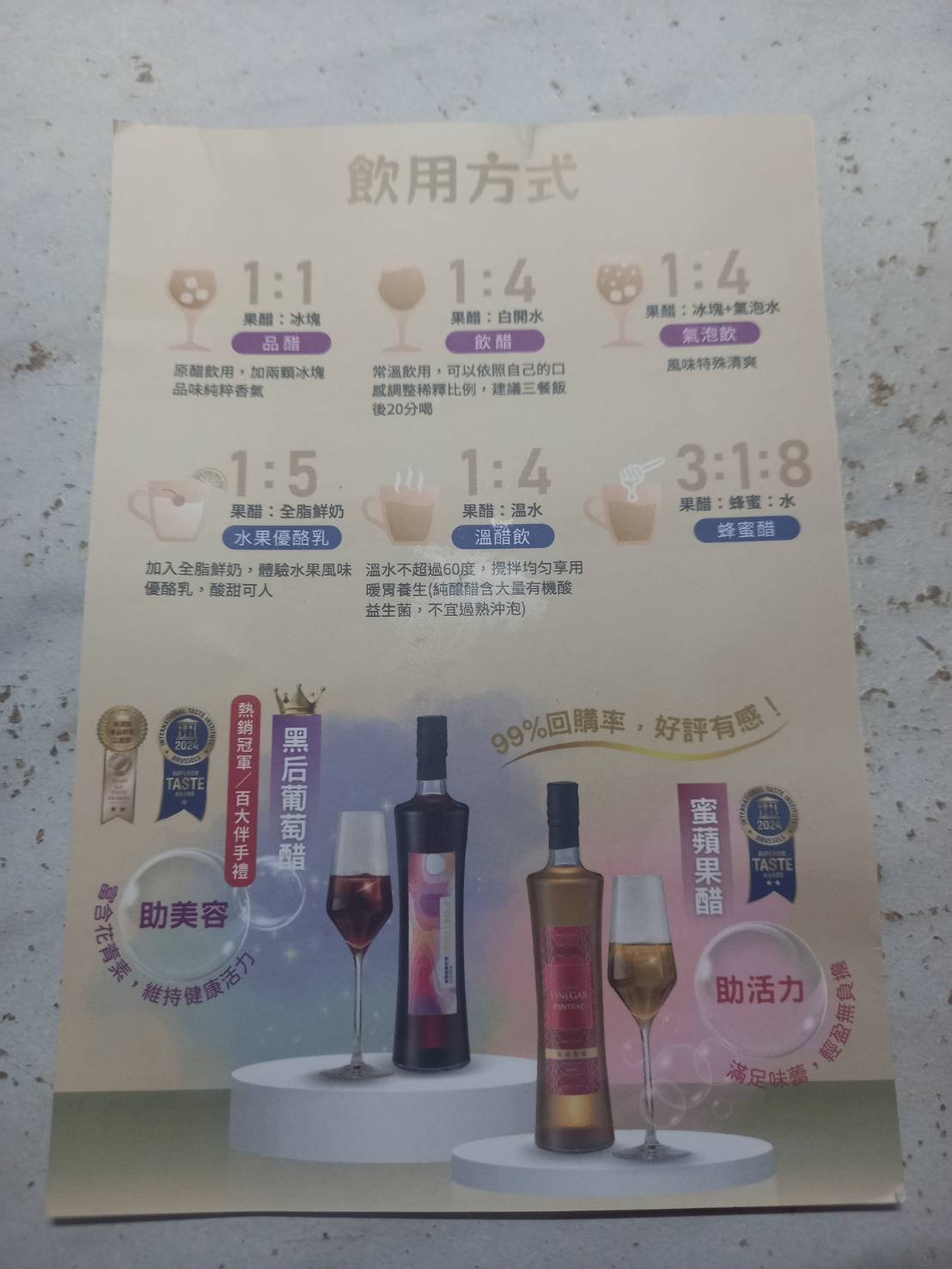 33歲 臺北市飲用說明提供了多元方式可供選擇體驗,我有小抿一口原味醋,不是酸到發抖,而是真的能體會到鳳梨與百香果的味道,再來搭配了氣泡水,反而一剛開始的驚喜感被稀釋掉,於是續加了蜂蜜調配到蜂蜜醋的比例,可能是蜂蜜自身的有機酸與果醋的酸帶來層次的碰撞,這個是擄獲我們家大小朋友的最佳搭配。