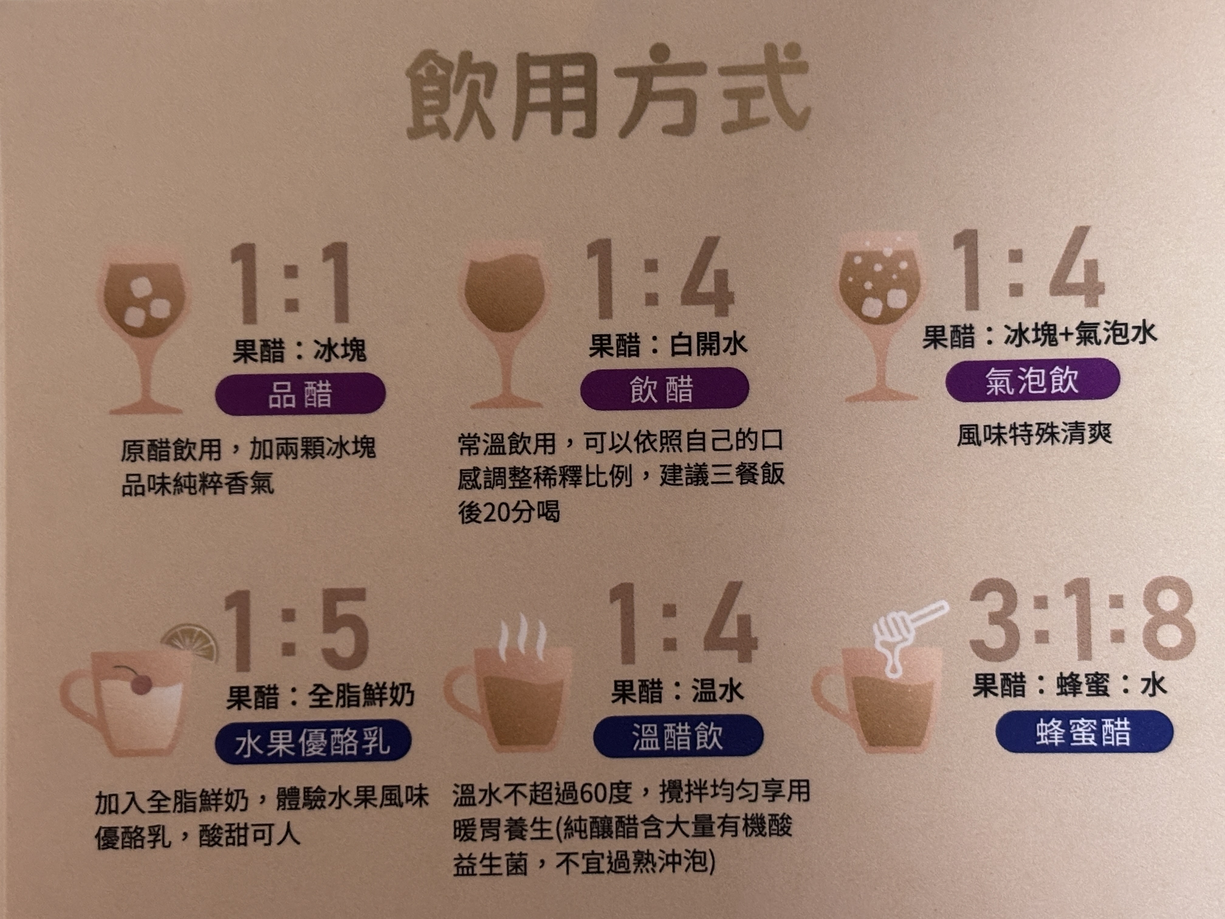 稀釋飲用,1:4的比例對重口味的人來說會較為清淡,顏色呈現微黃色,可依照個人喜好多添加一些原醋增加風味。
